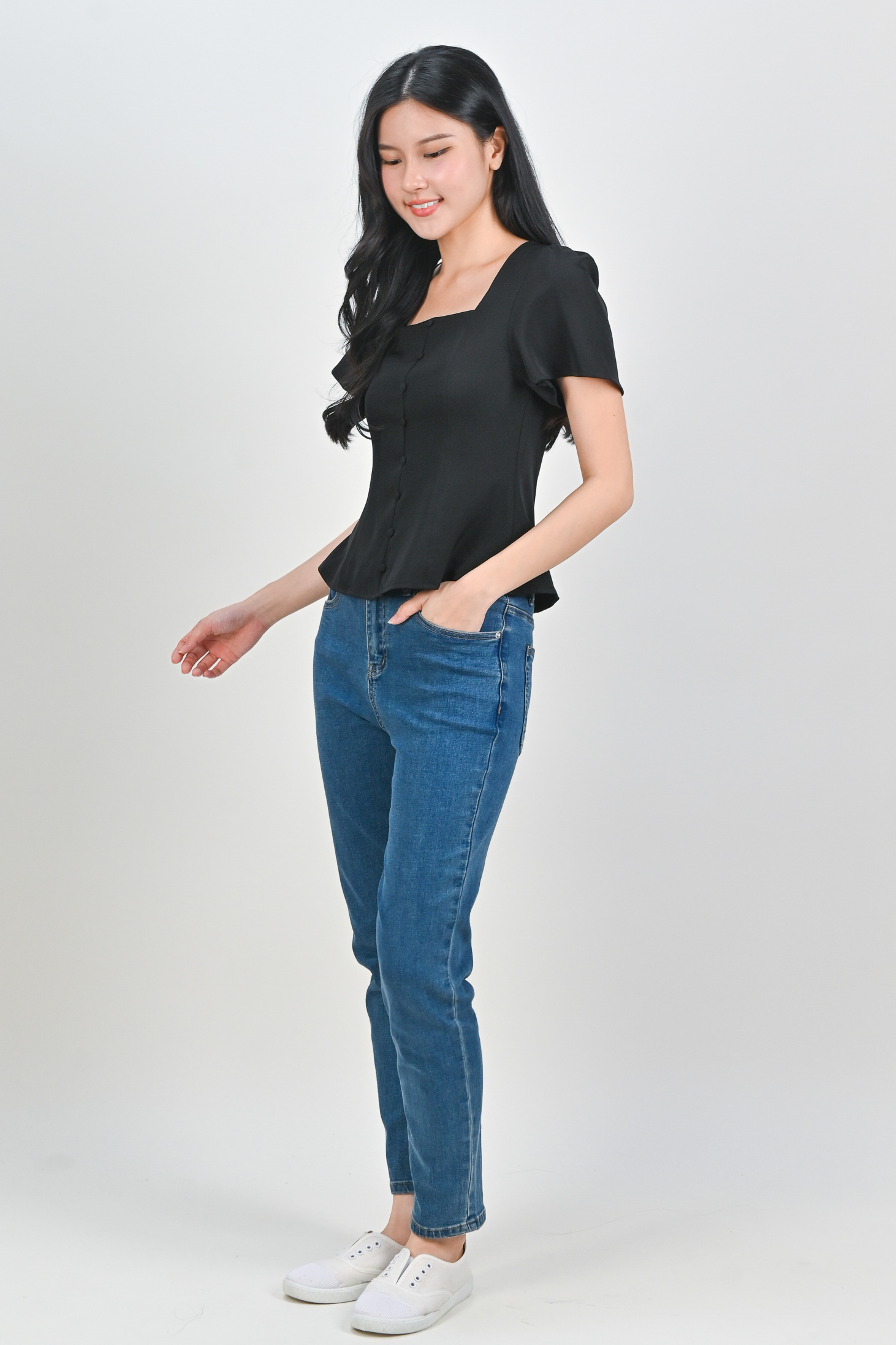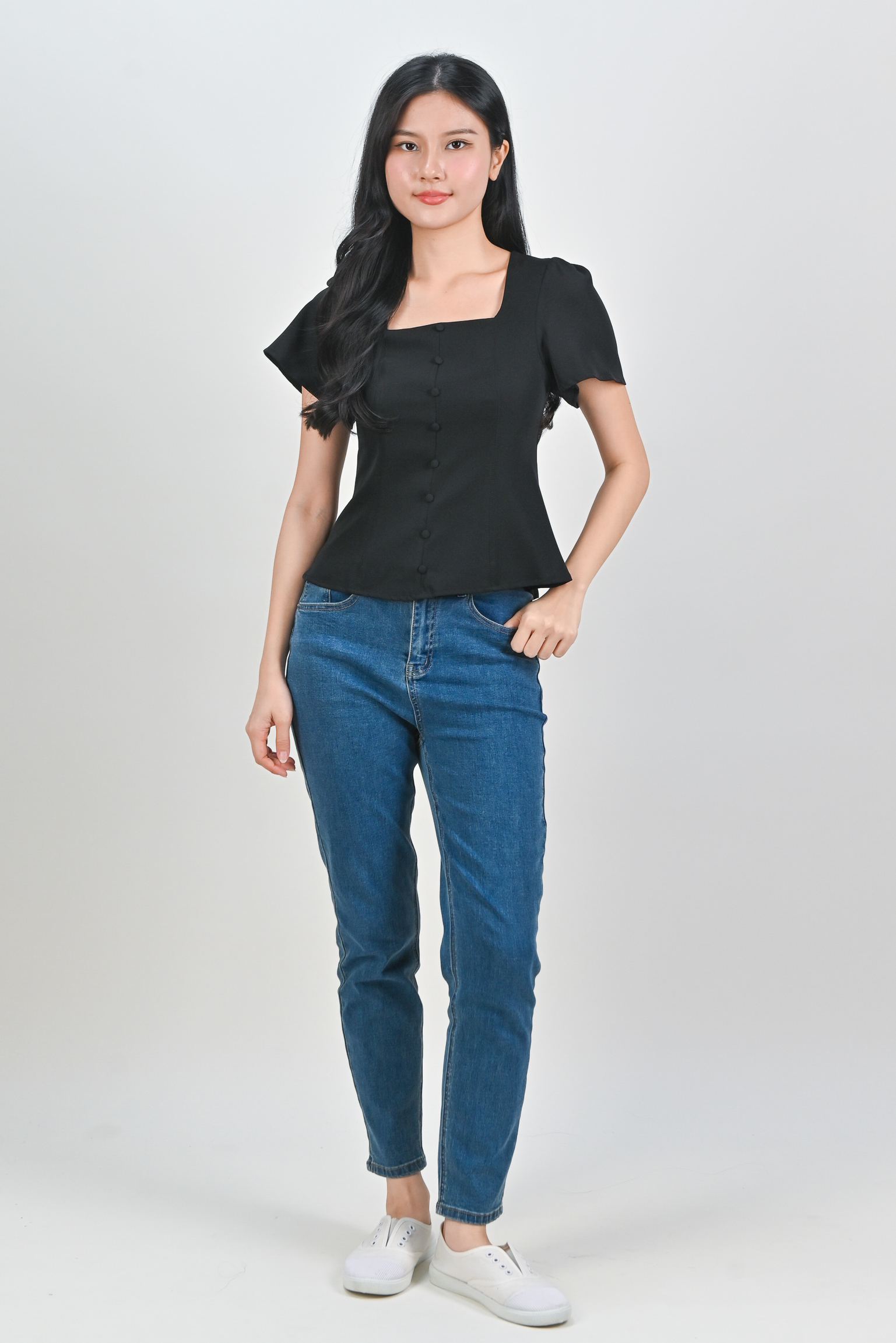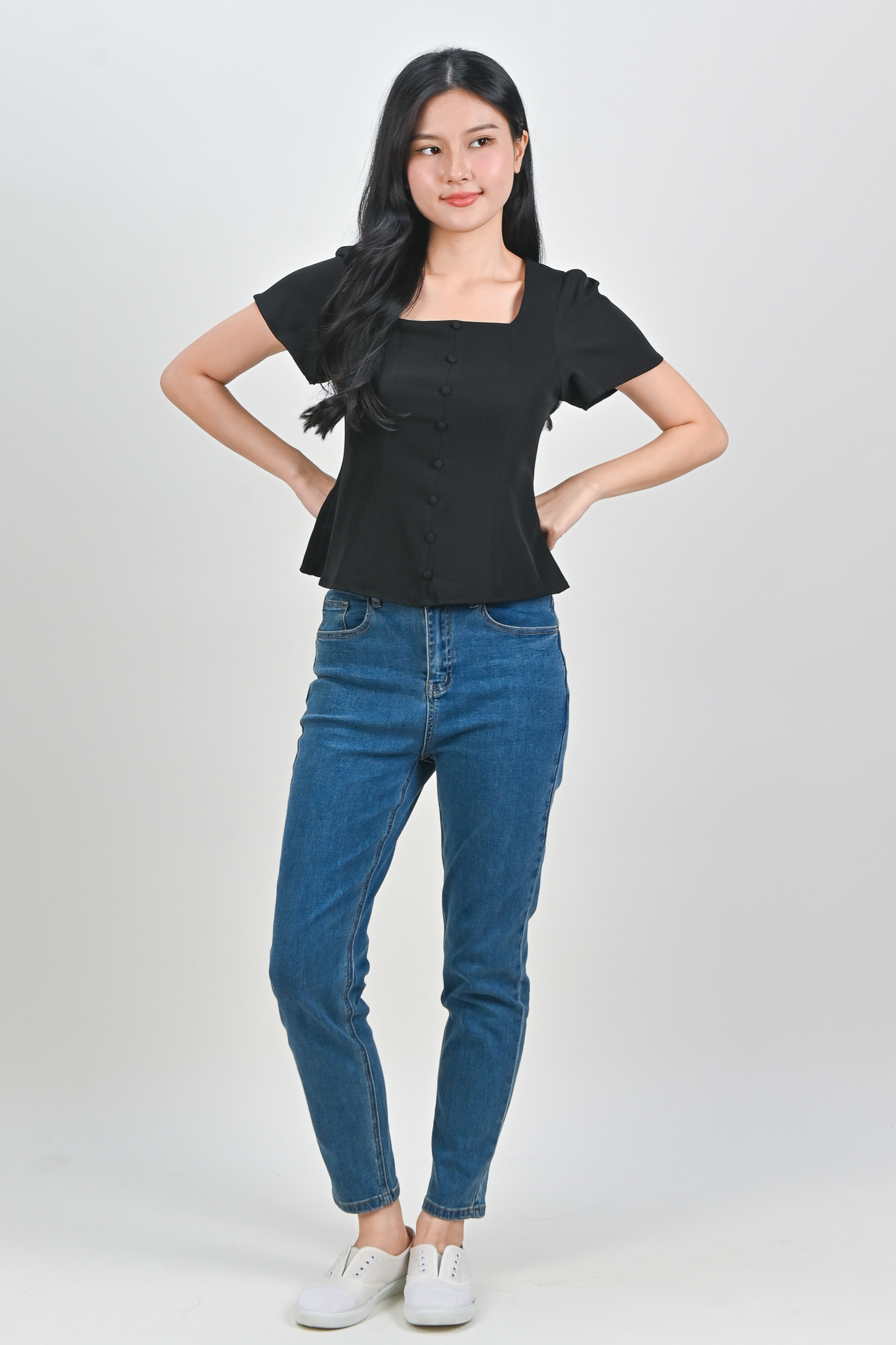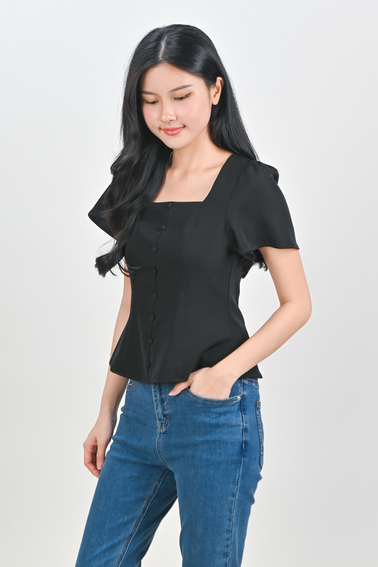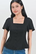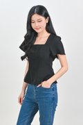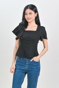 ADALYA SLEEVED SQUARE-NECK PEPLUM TOP IN BLACK