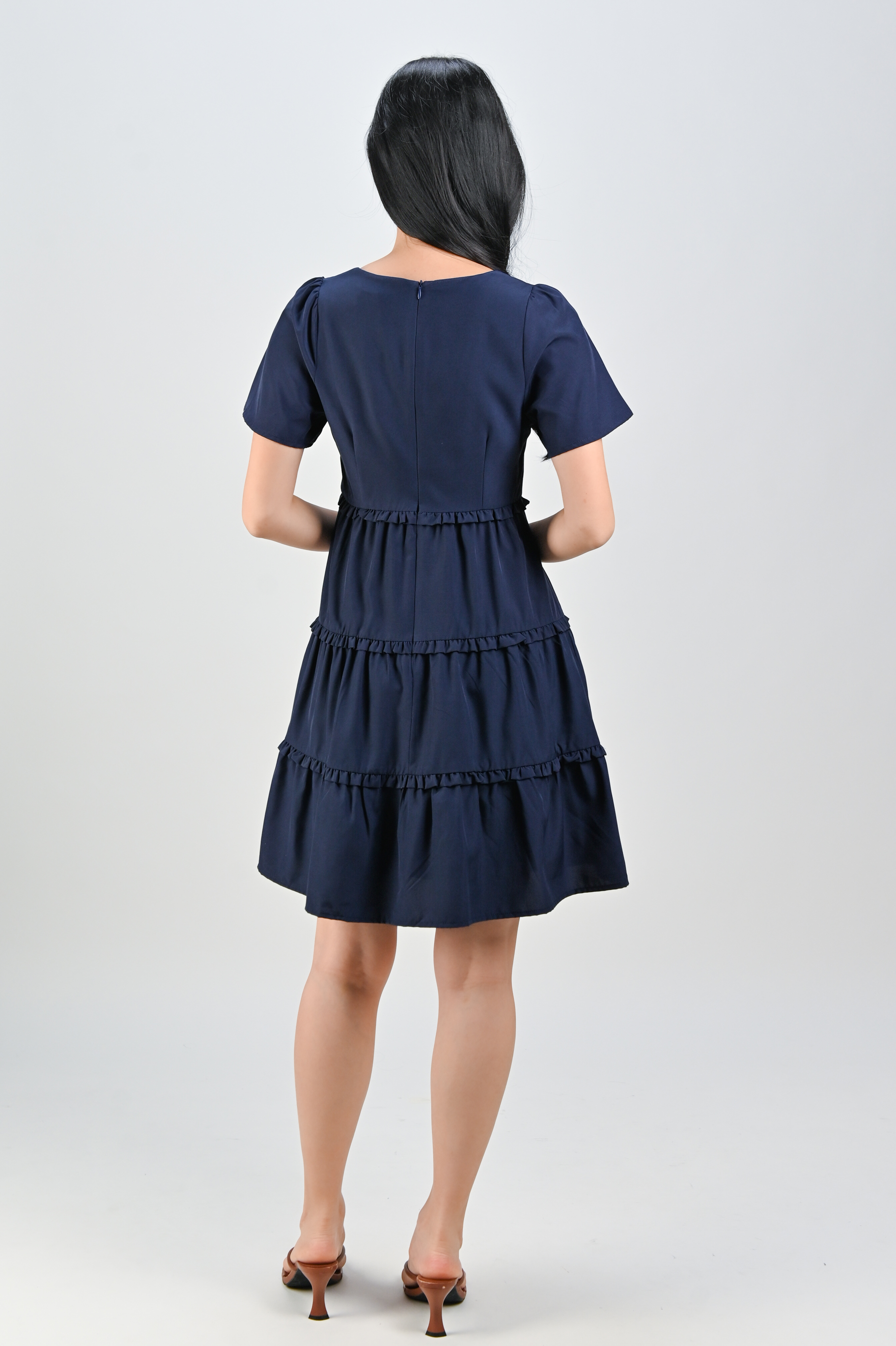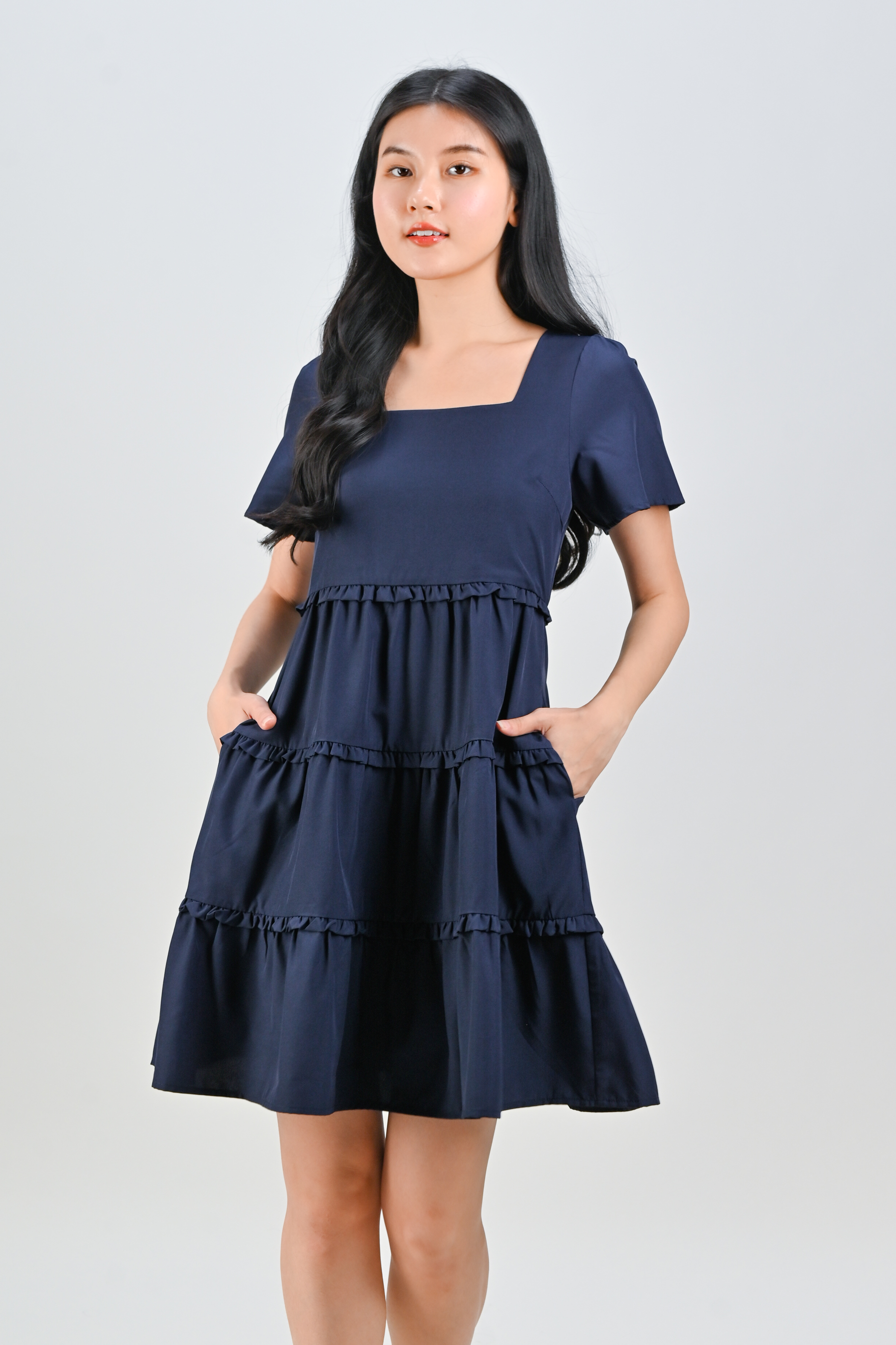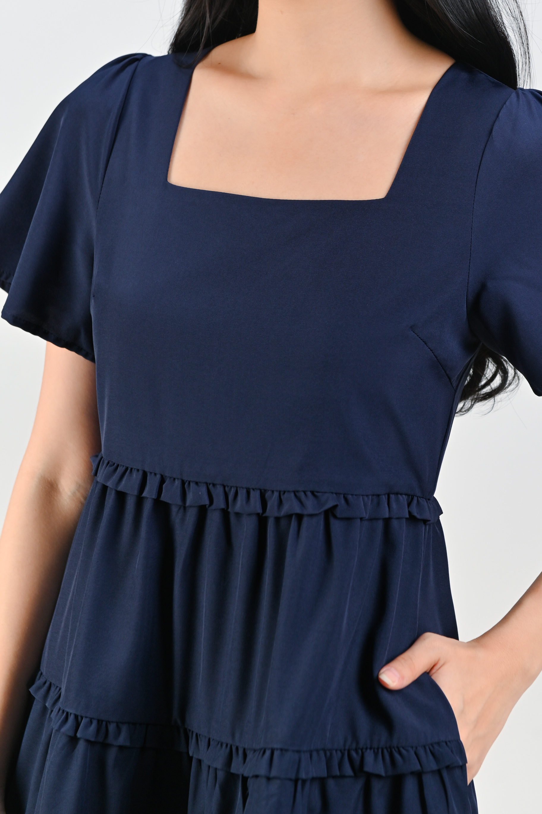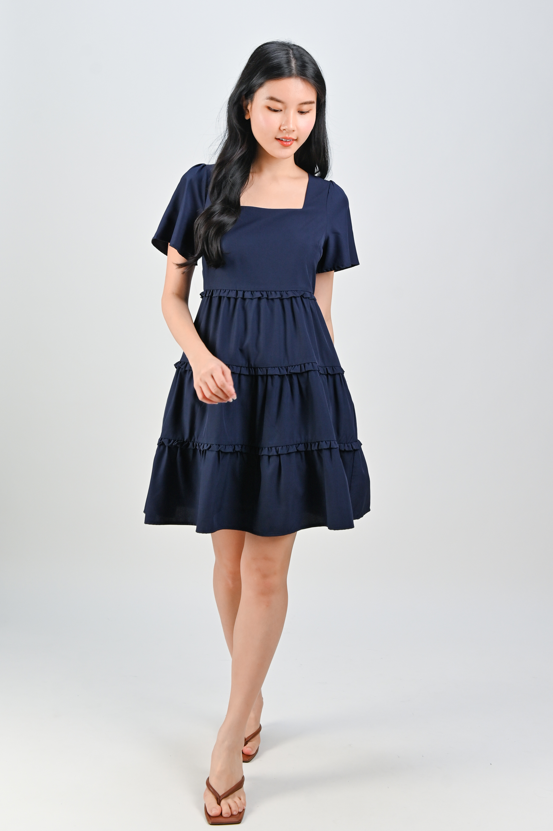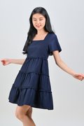 ALTANE SQUARE-NECK FRILL DRESS IN NAVY