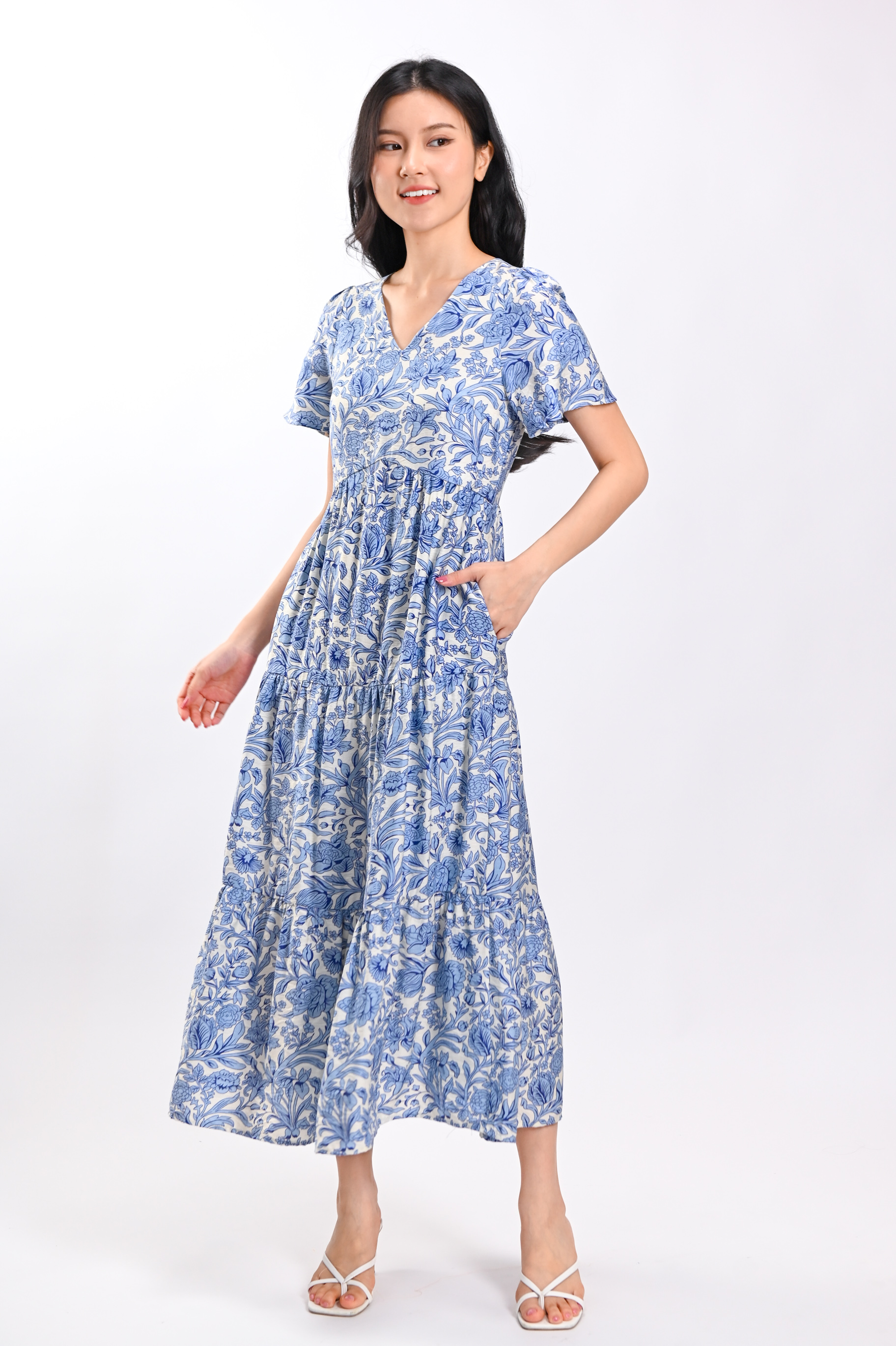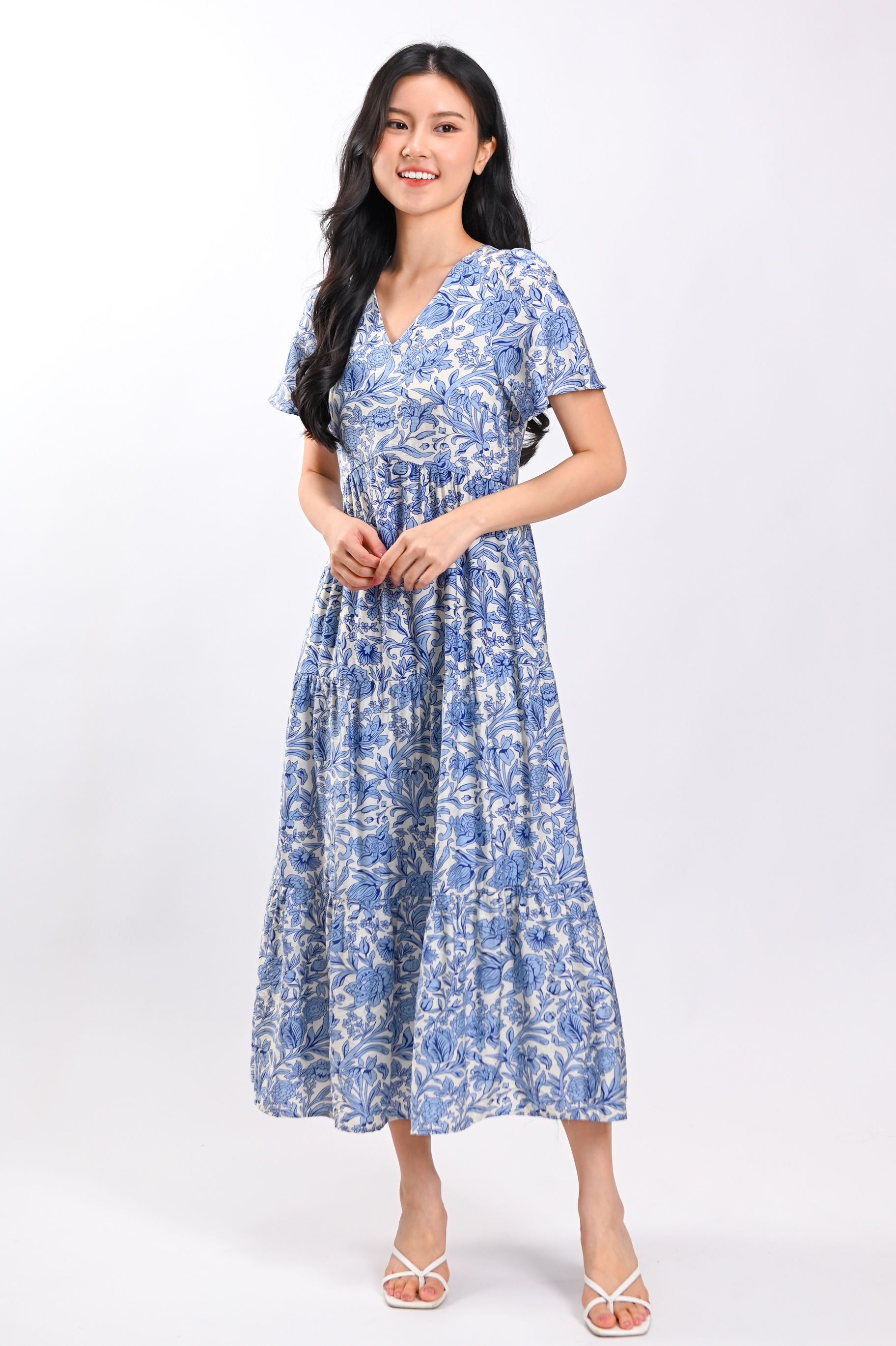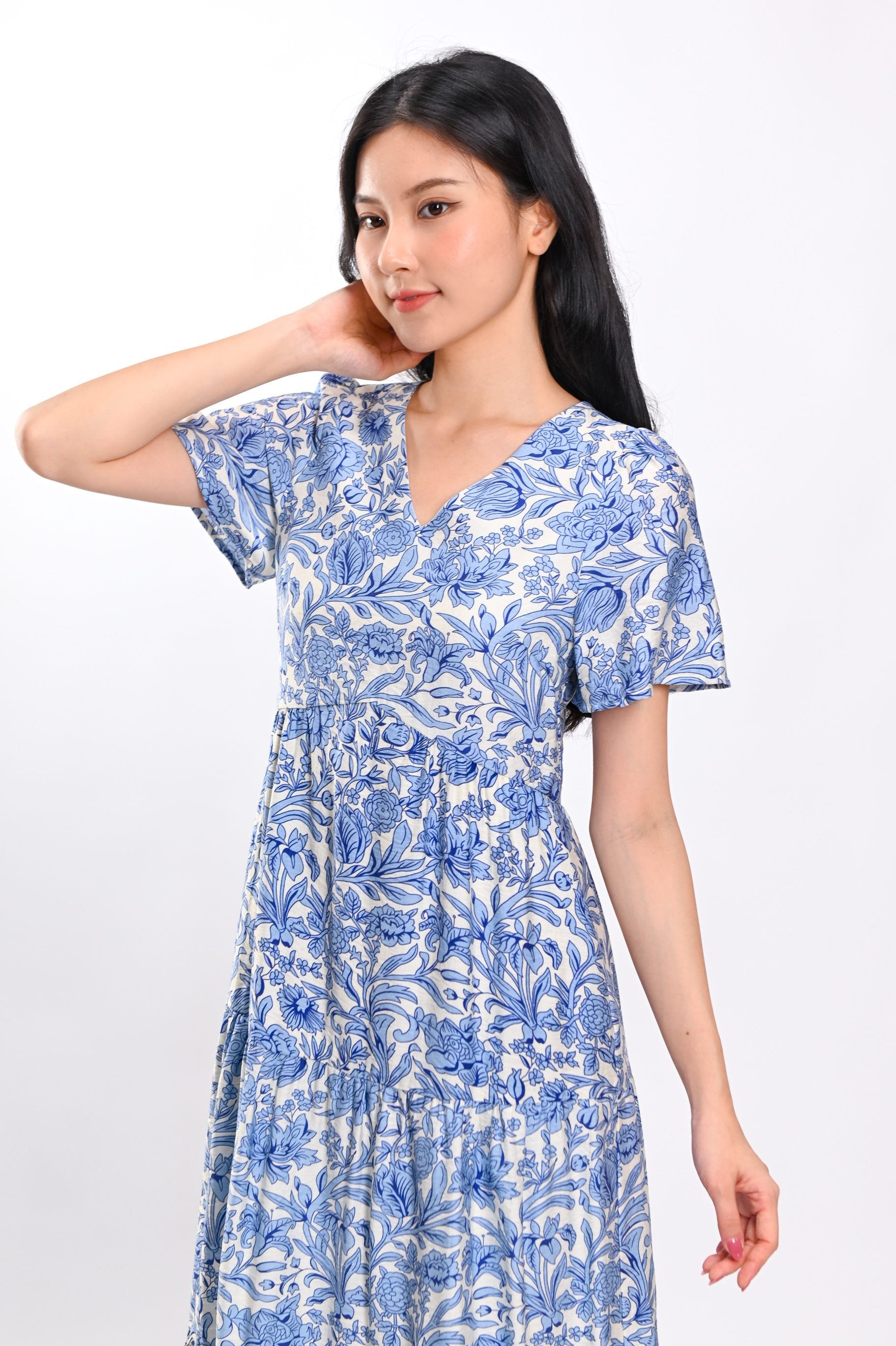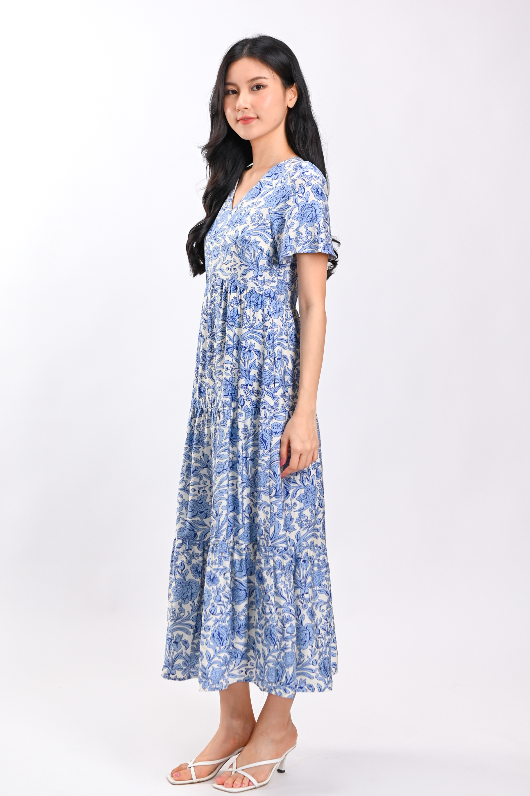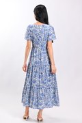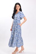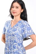 AMARISSE V-NECK SLEEVED MIDI DRESS IN BLUE ABSTRACT