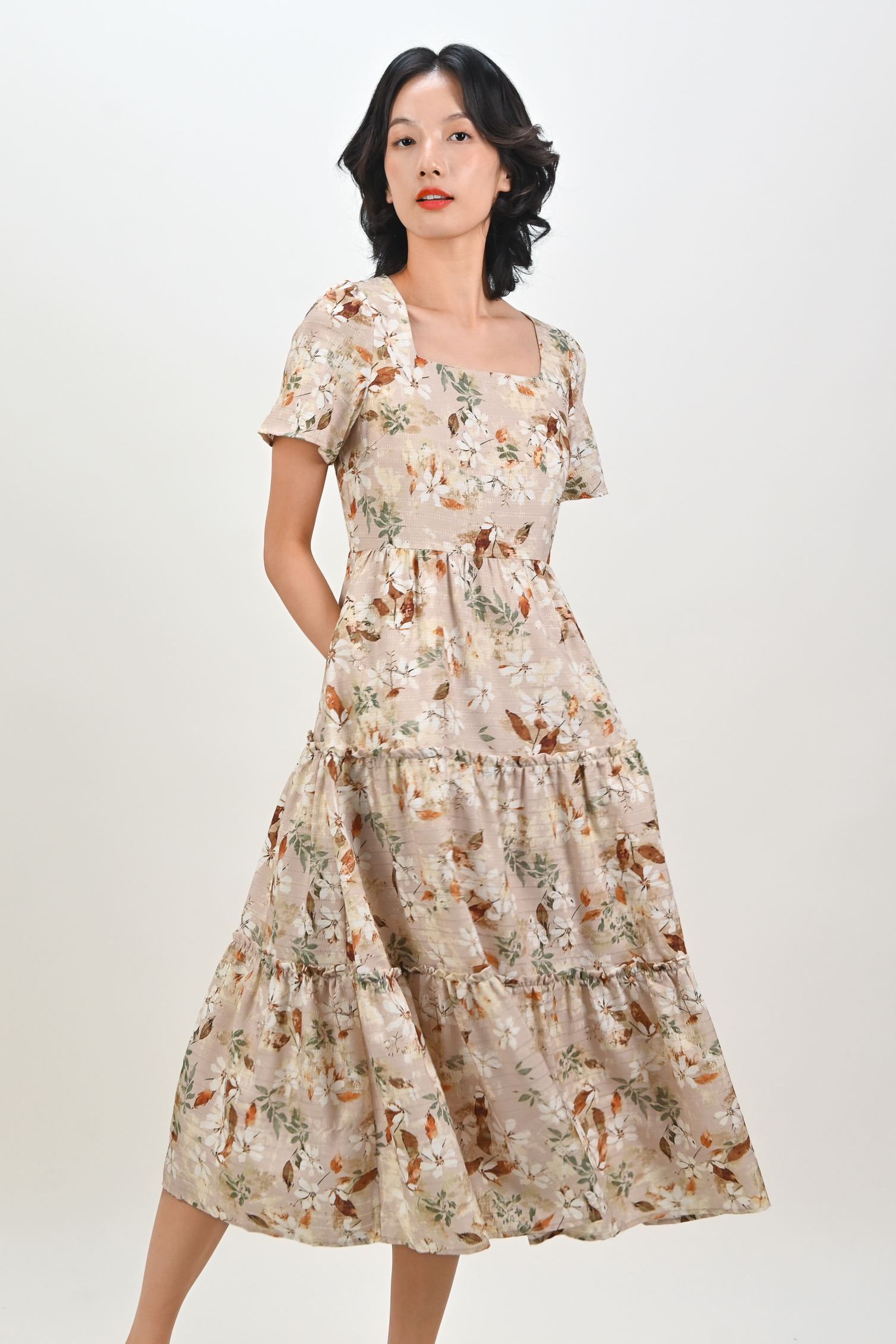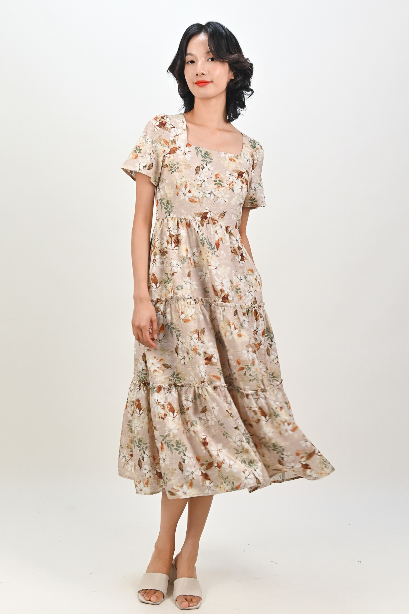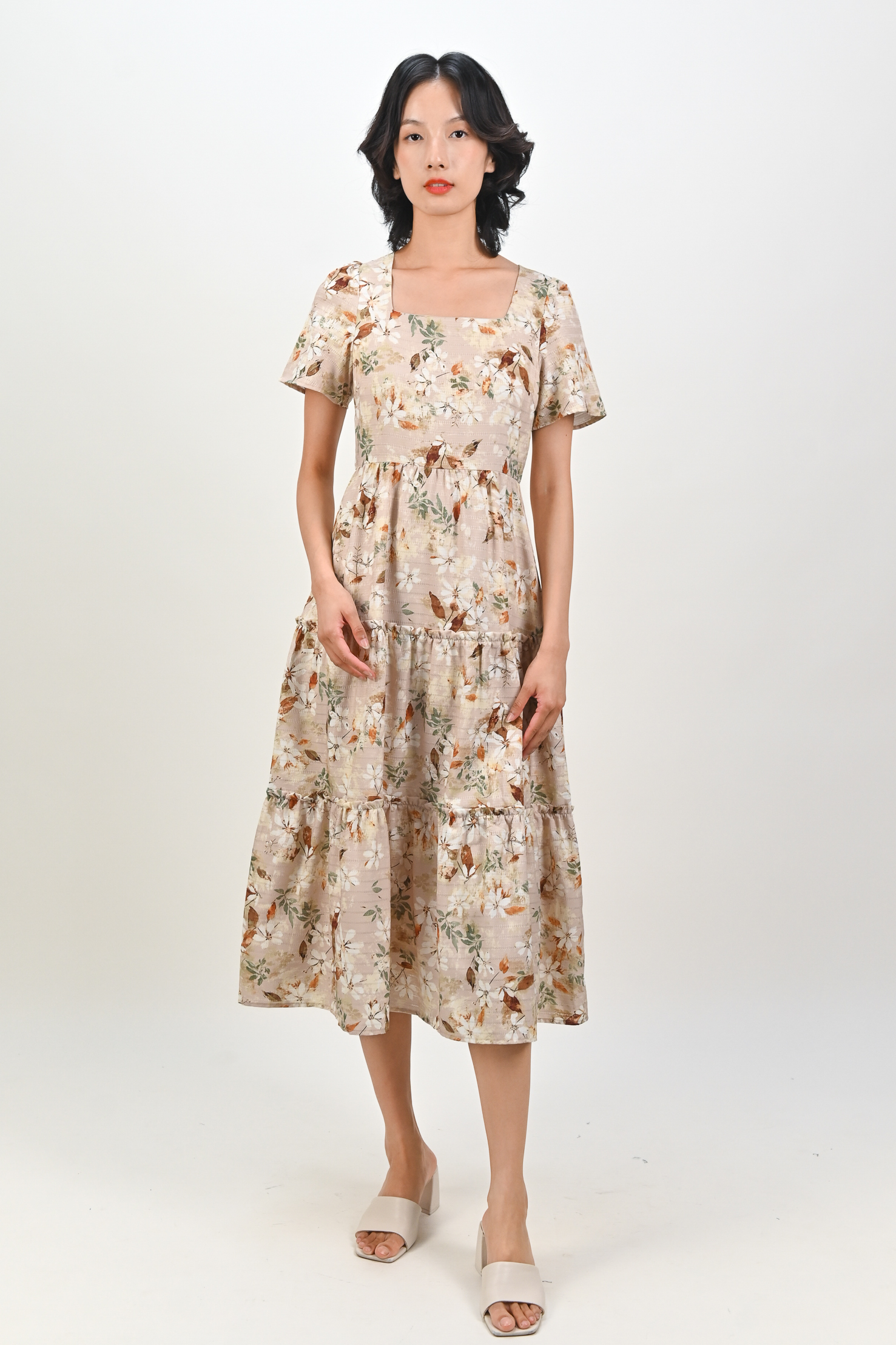 Actual stocks may varyYour everyday sleeved tiered midi 🌿 A reliable wardrobe staple in pretty eyelet florals.