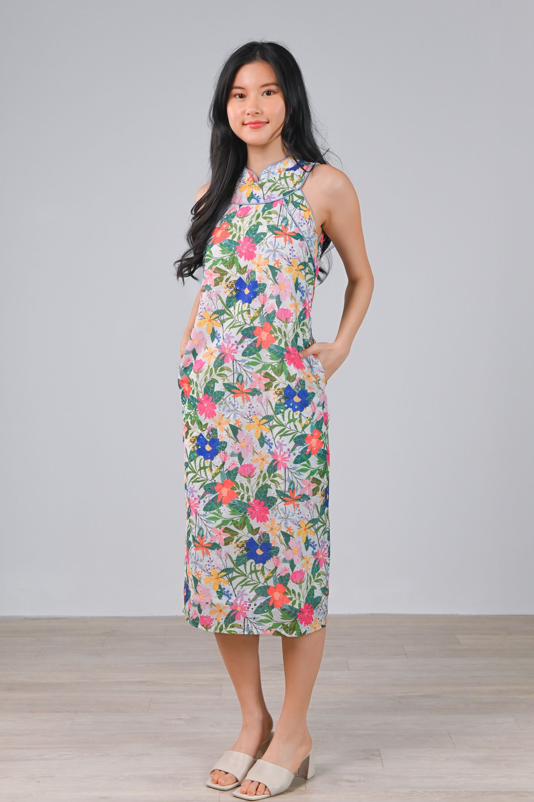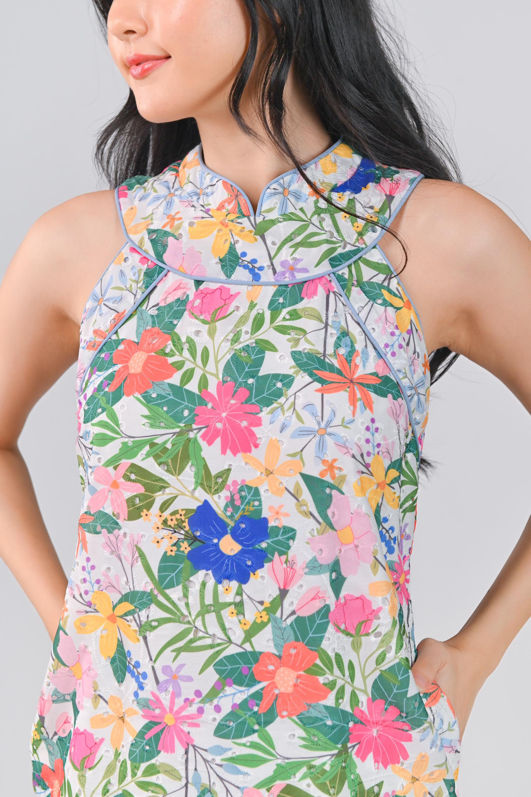 Actual stocks may varyVibrant, happy, and ready to sparkle – ourAmmiee Floral Eyelet Sleeveless Cheongsam brings joy wherever you go! ✨🌸