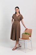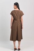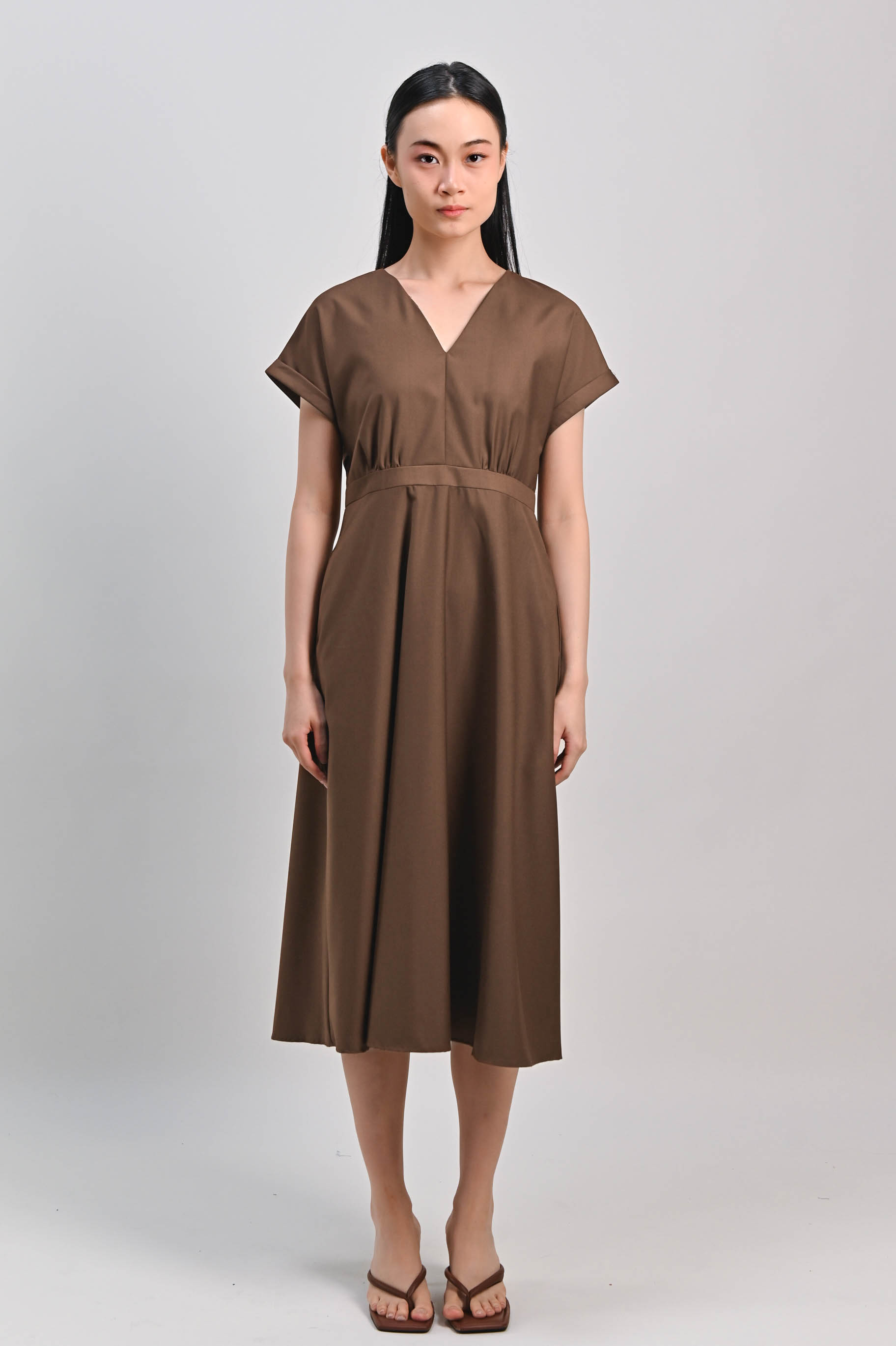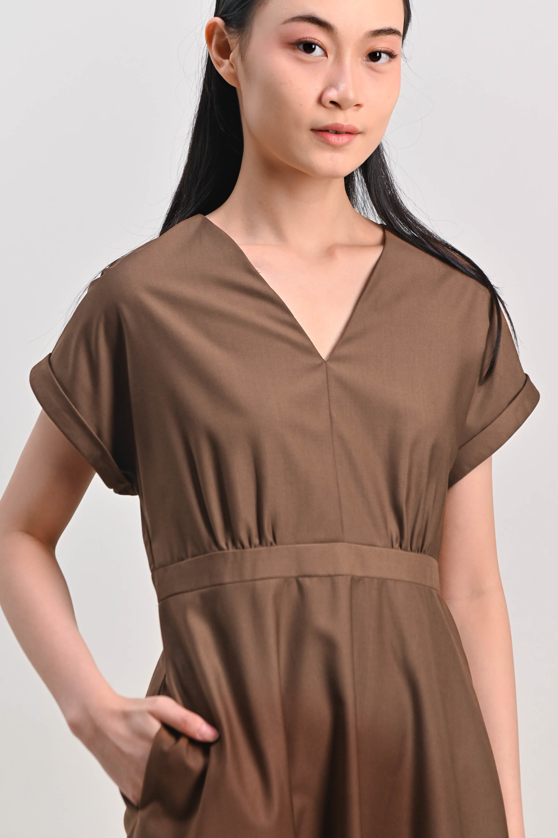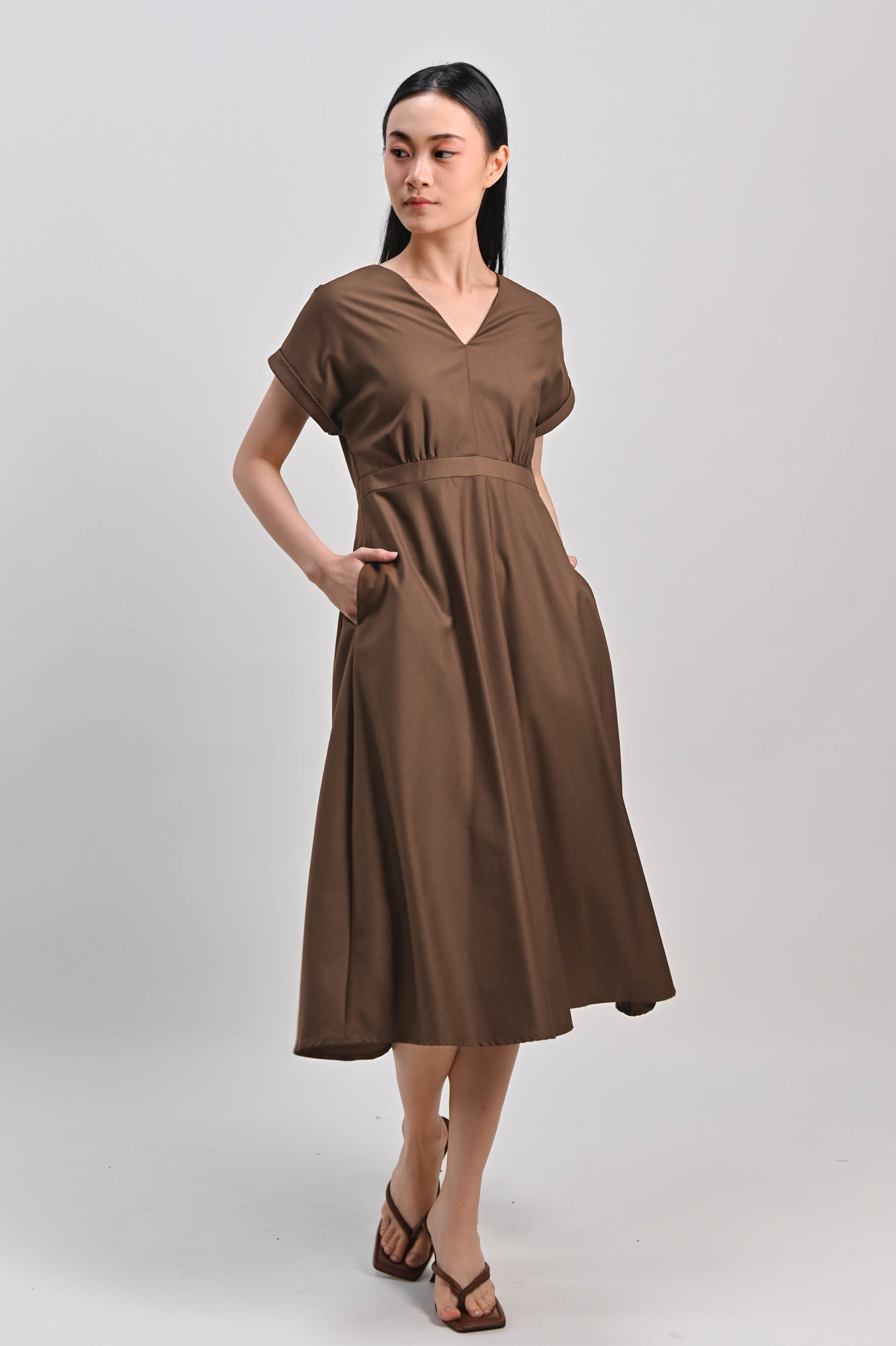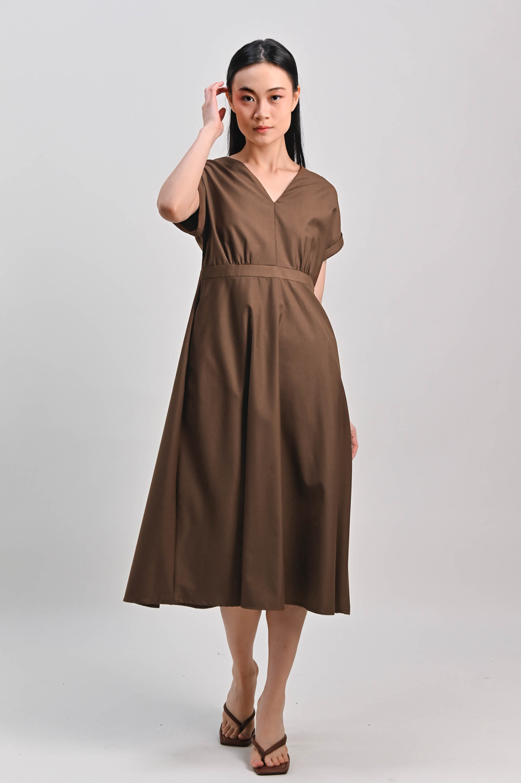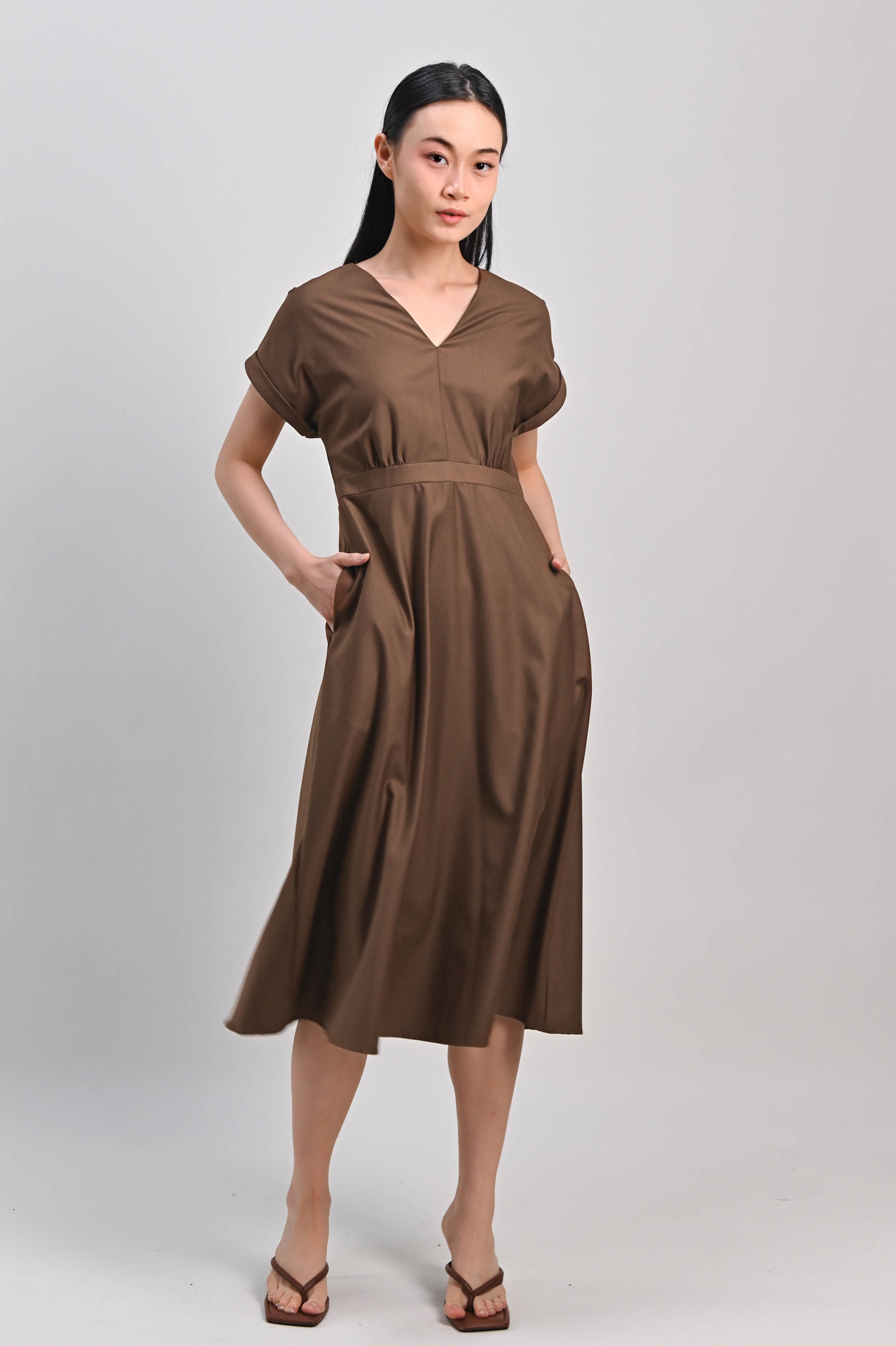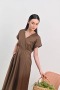 AVALON V-NECK SLEEVED MIDI DRESS IN COCOA