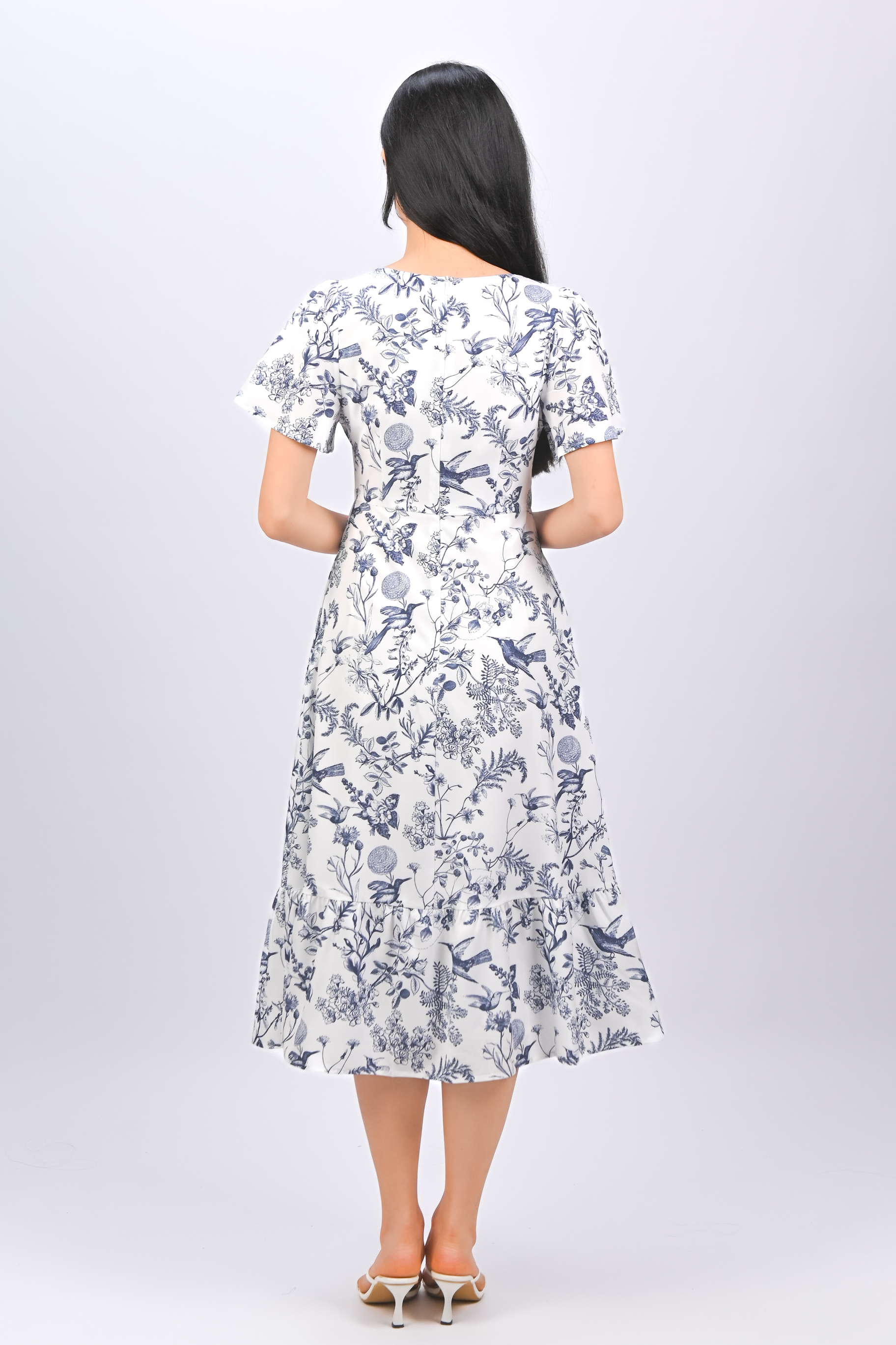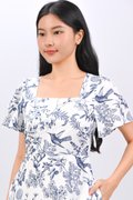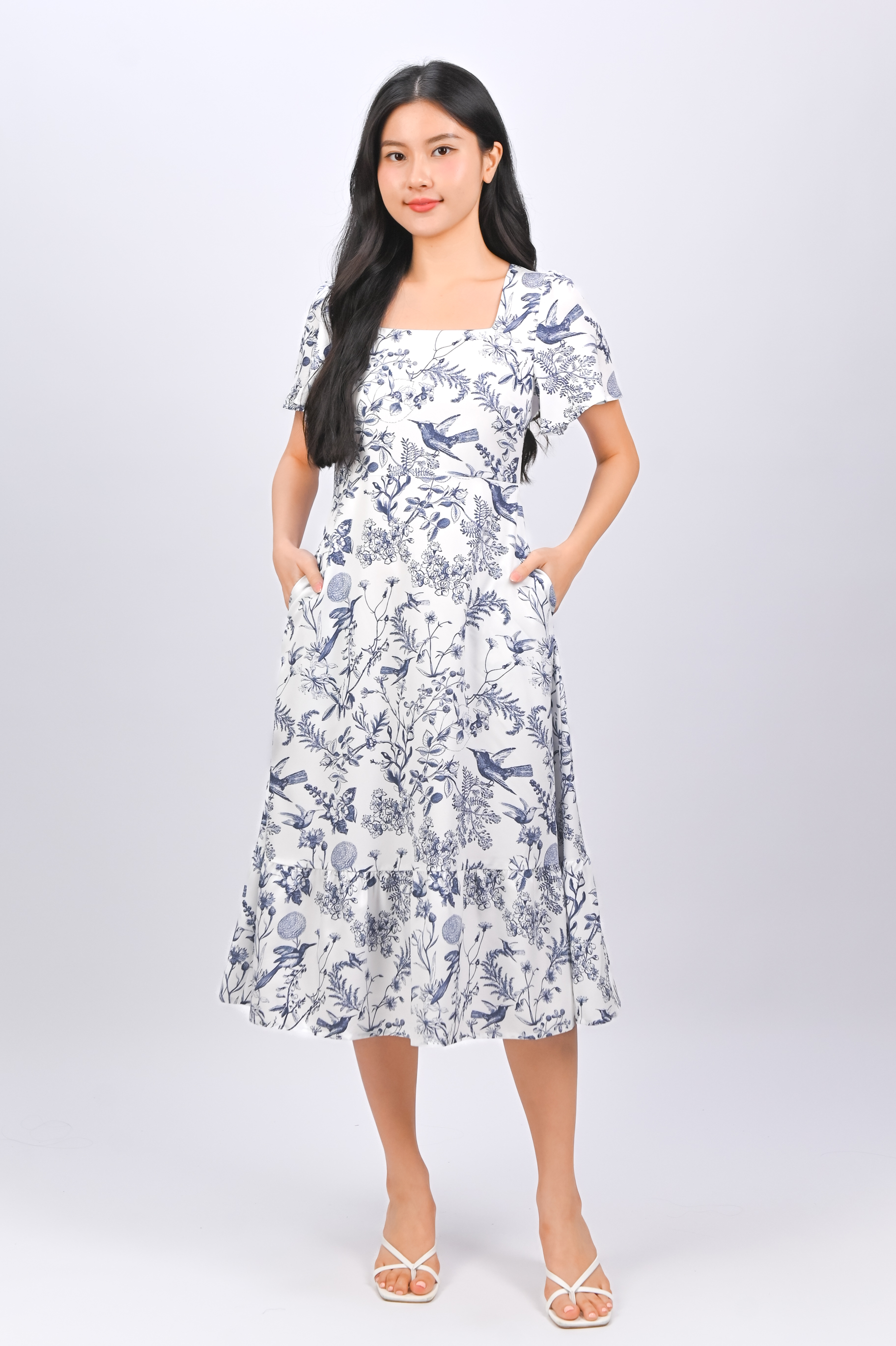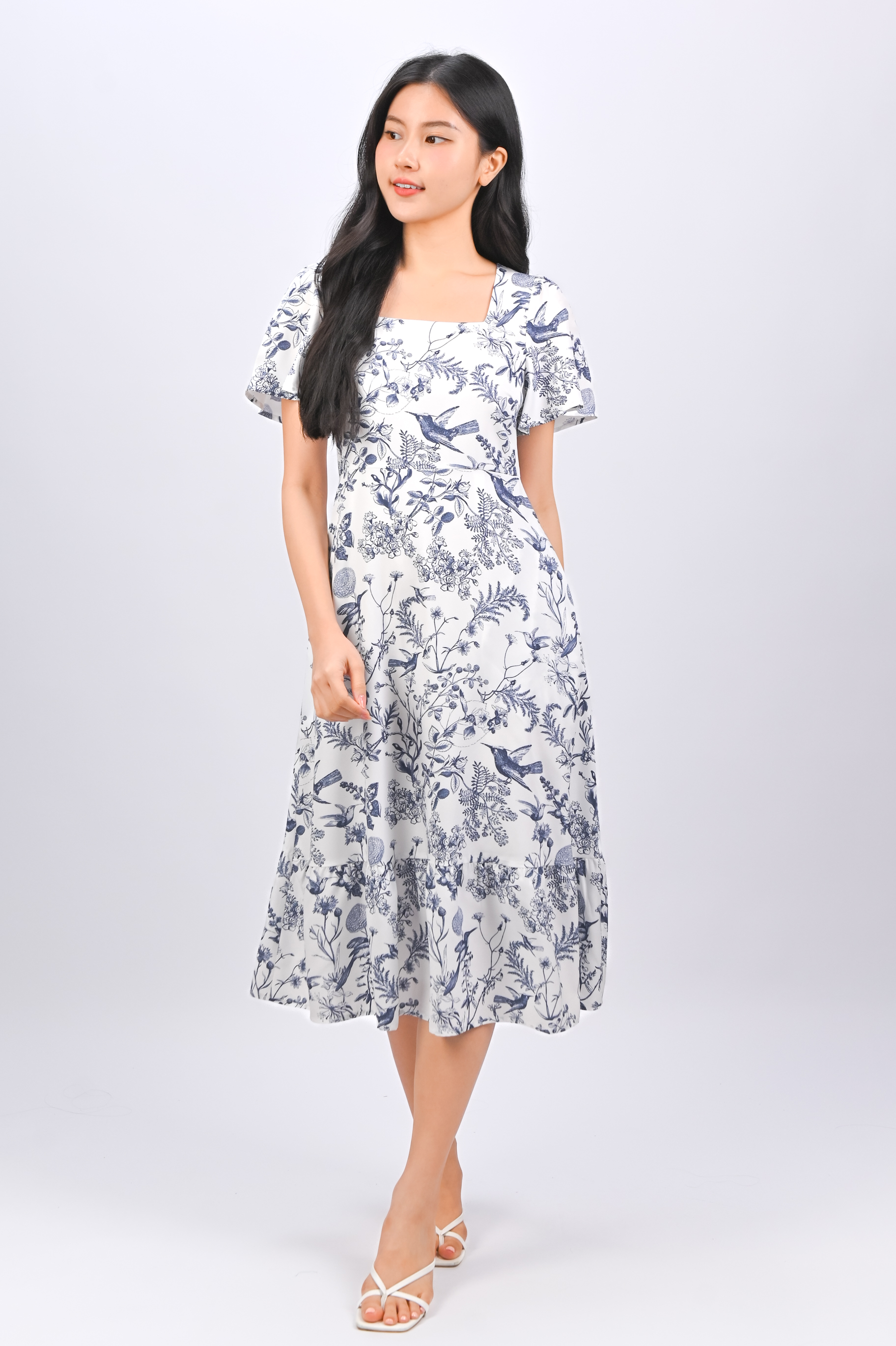 *BACKORDER* NAVY HUMMINGBIRD SQUARE-NECK SLEEVED MIDI DRESS