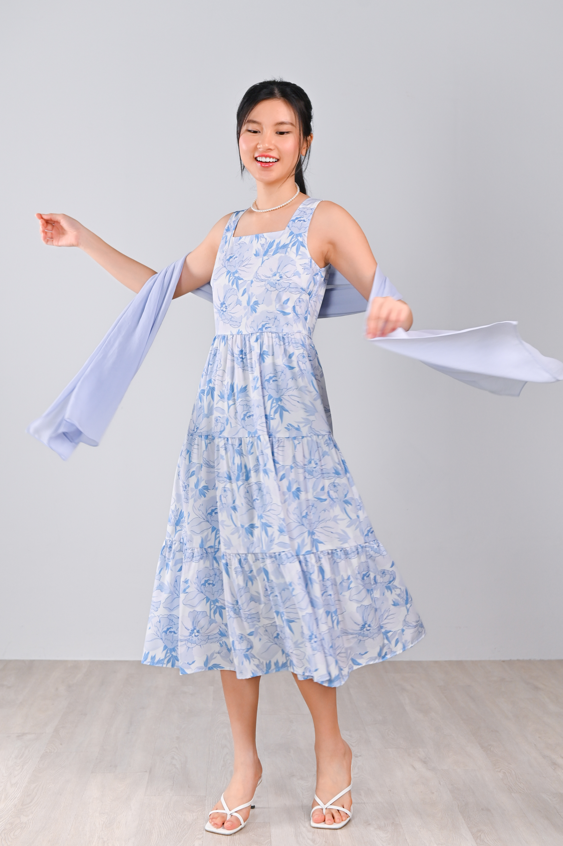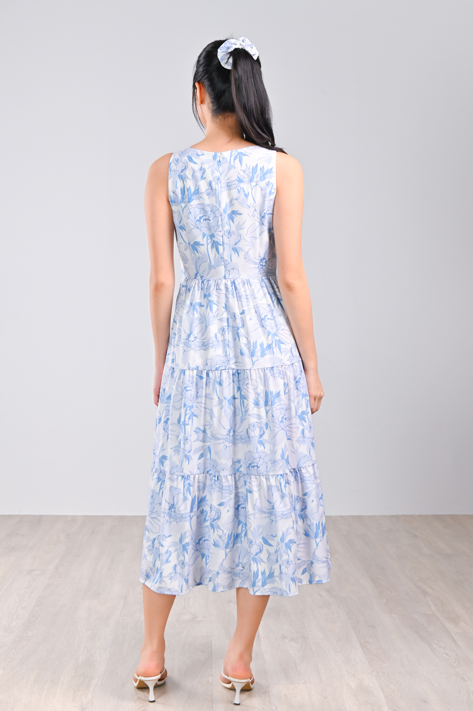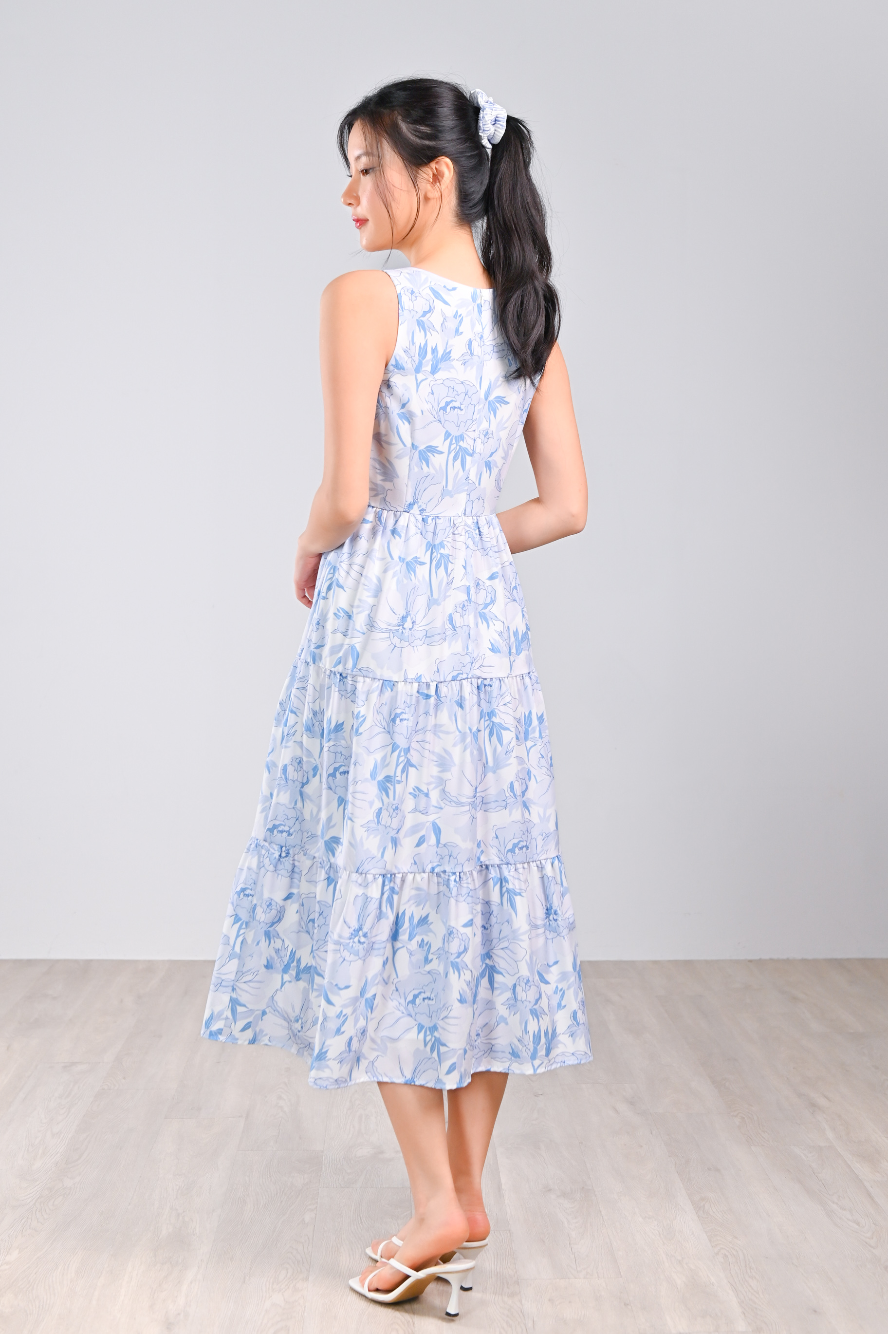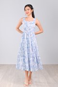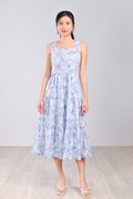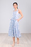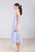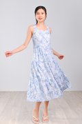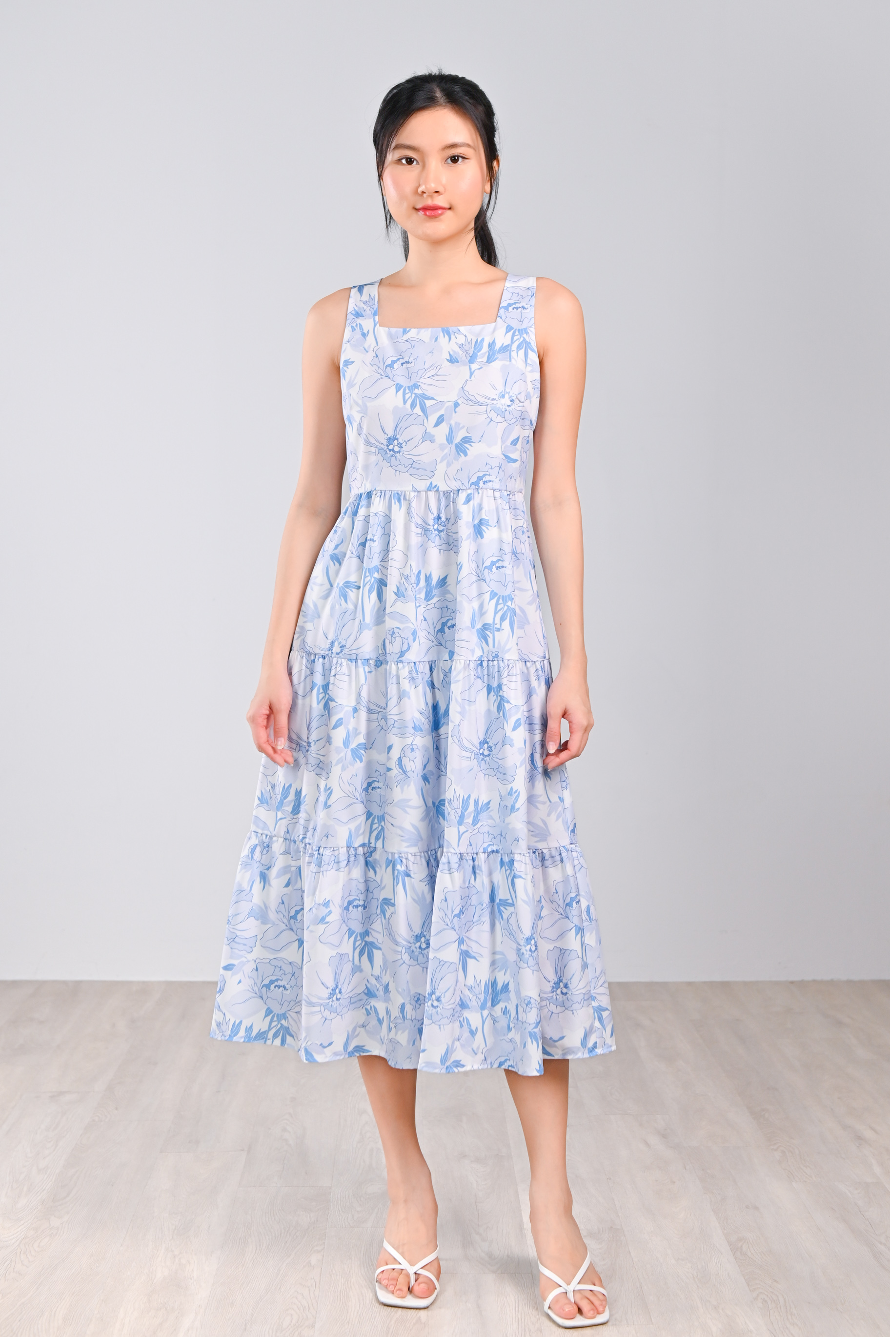 BLUE BOTANICAL SQUARE-NECK TIERED DRESS