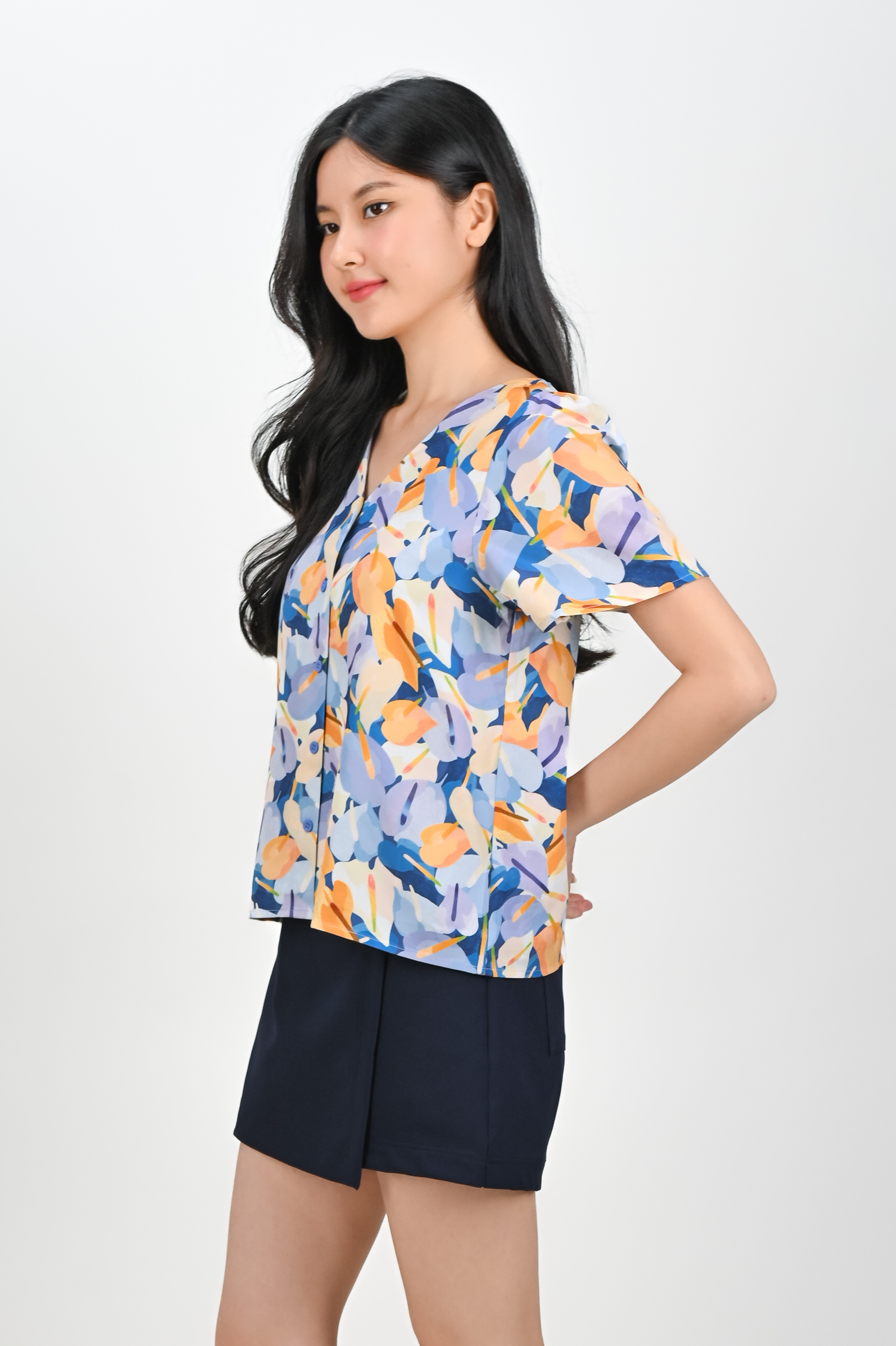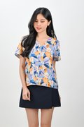 BLUE LACELEAF SLEEVED BUTTON TOP