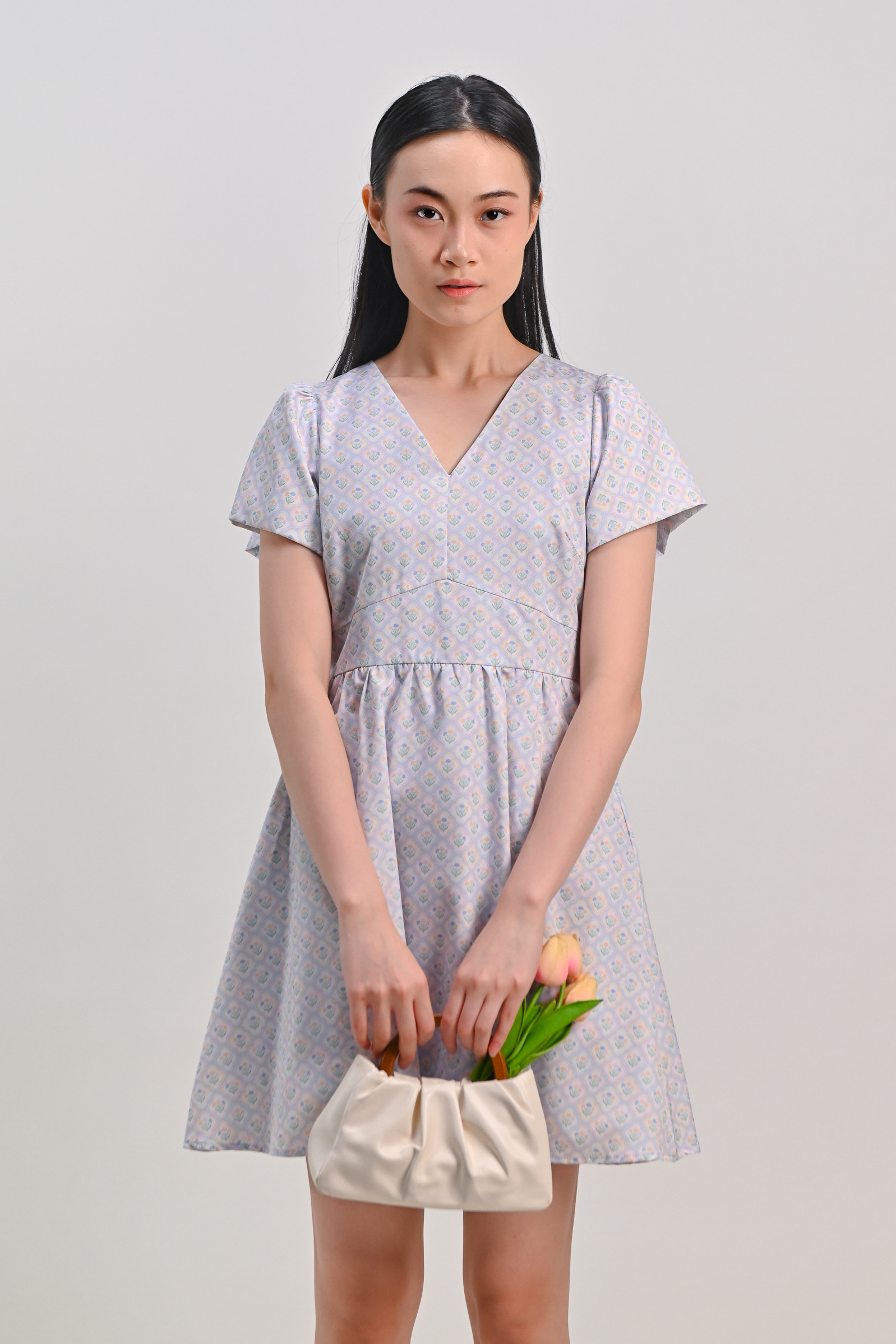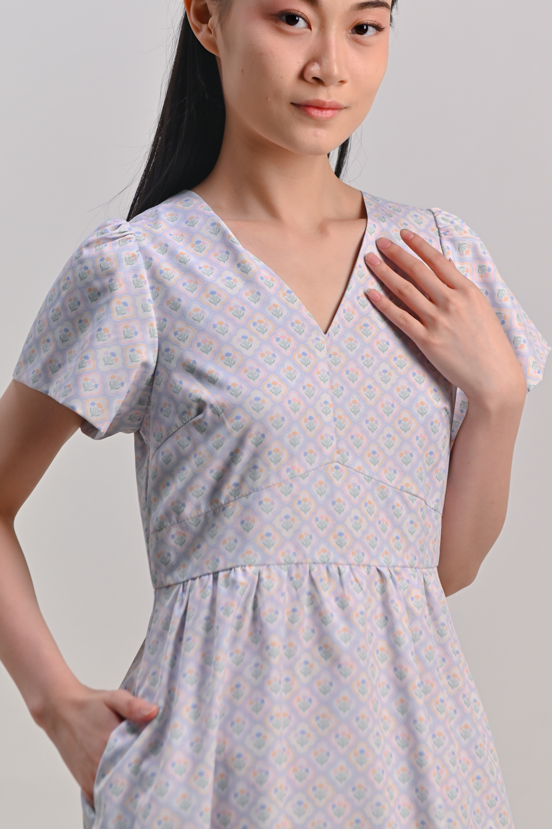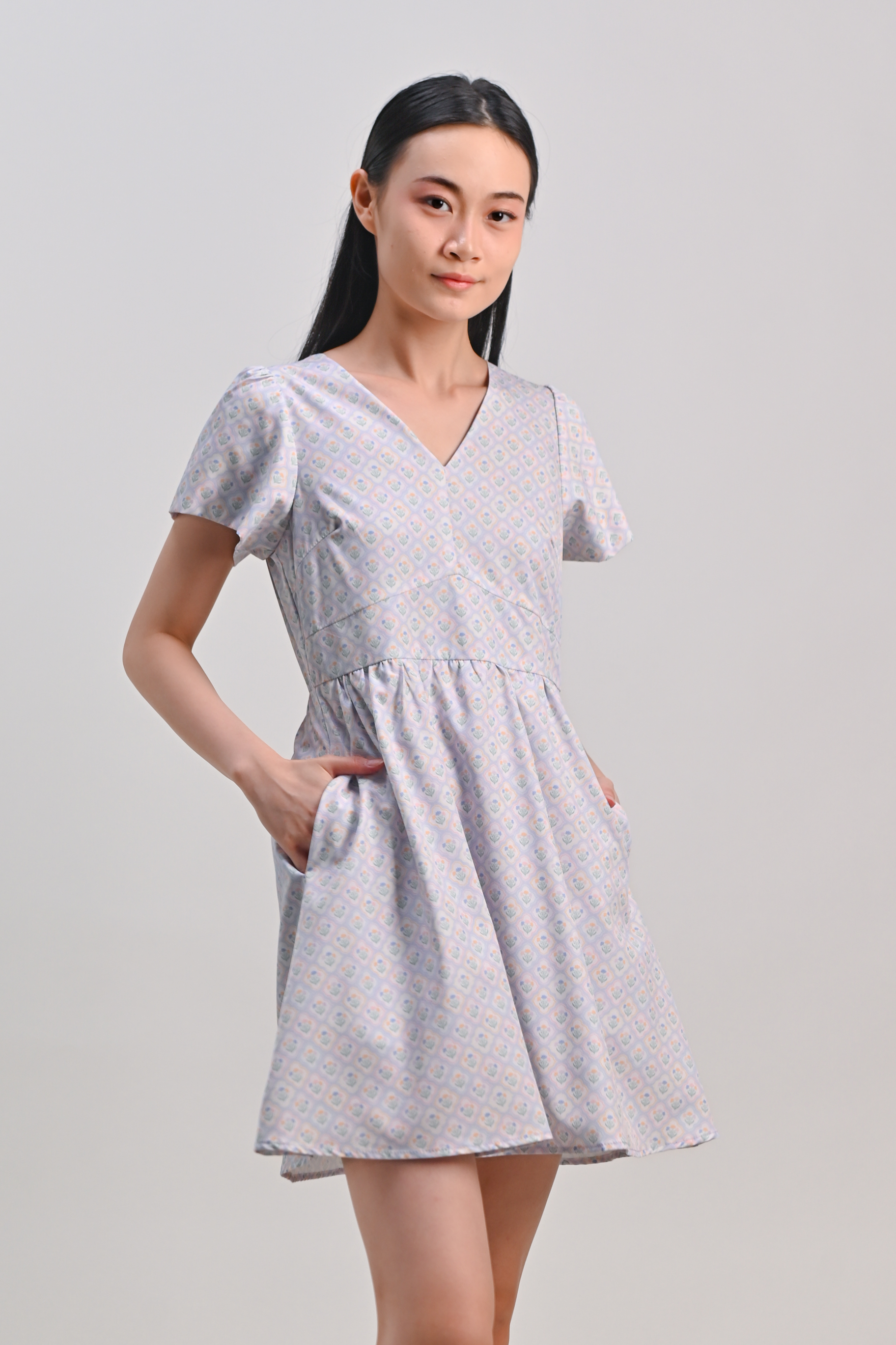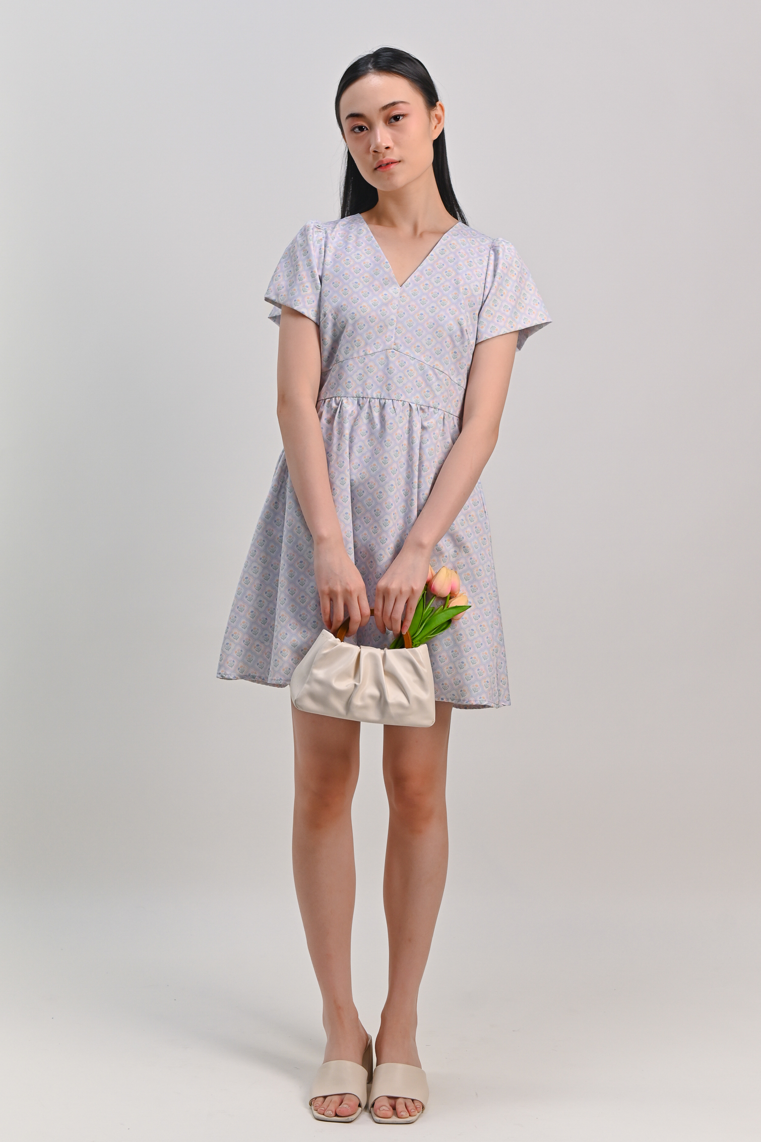 BLUE PASTEL BOUQUET V-NECK SLEEVED DRESS-ROMPER