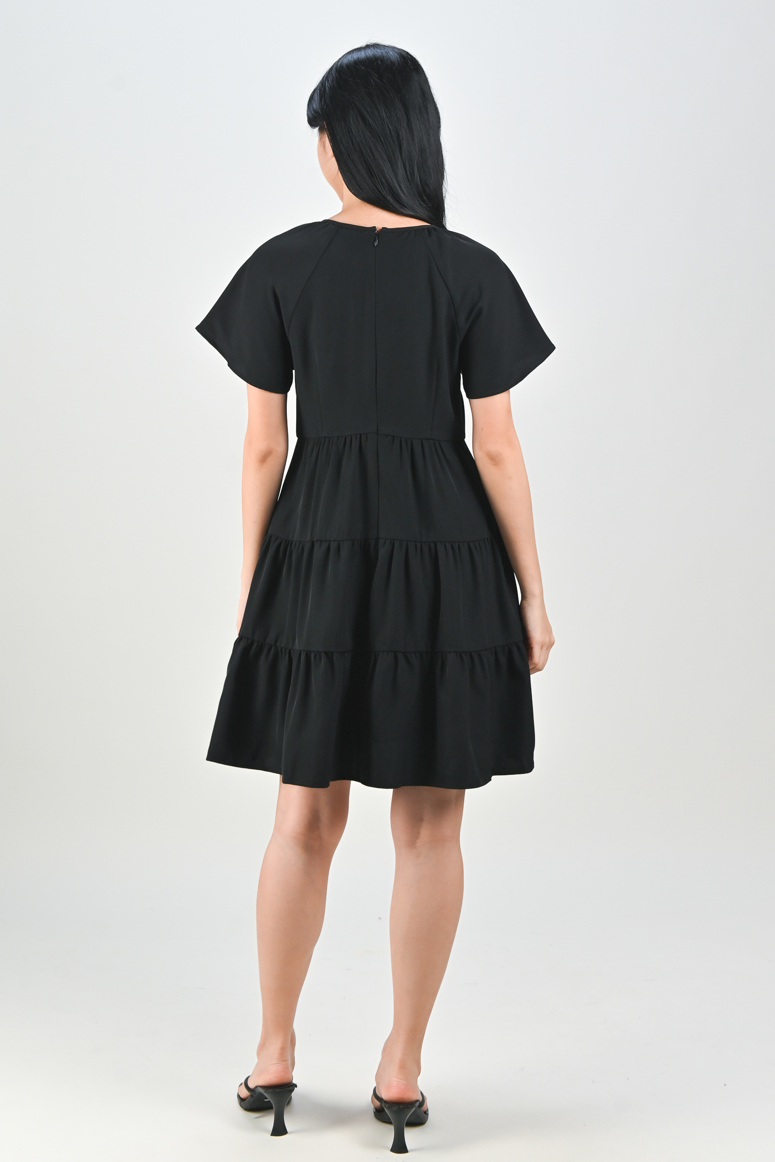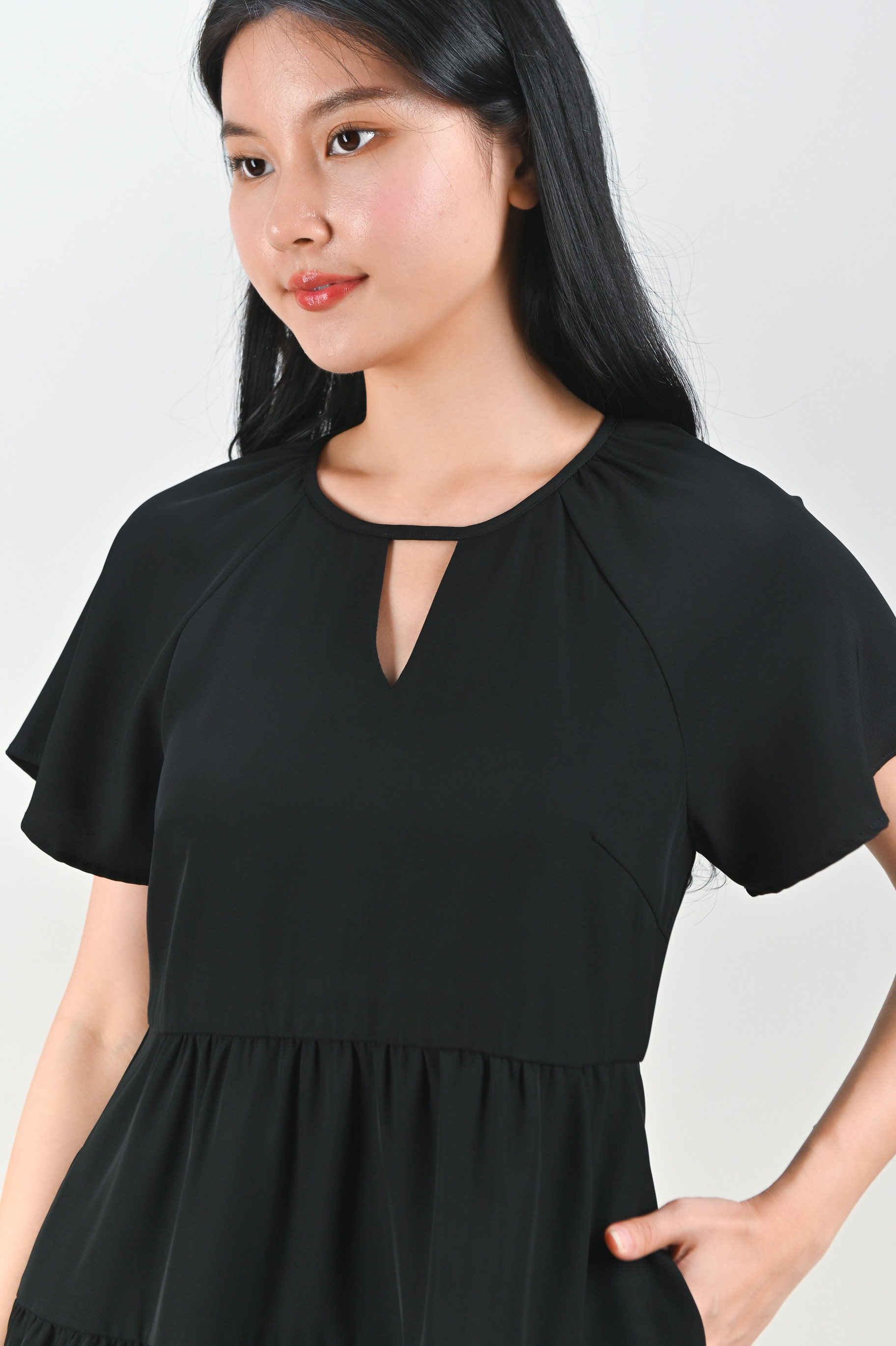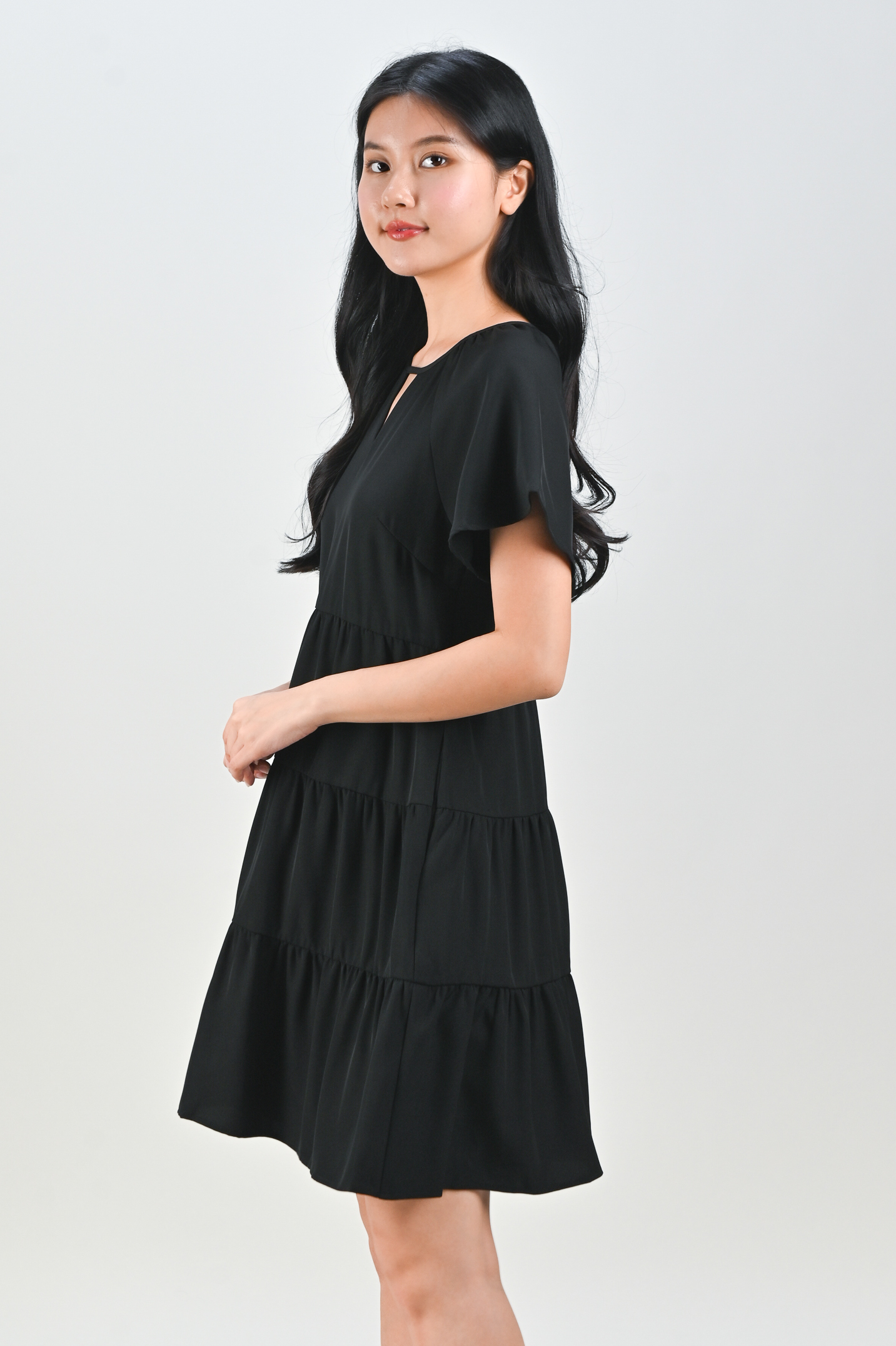 BONNA SLEEVED KEYHOLE TIERED DRESS IN BLACK