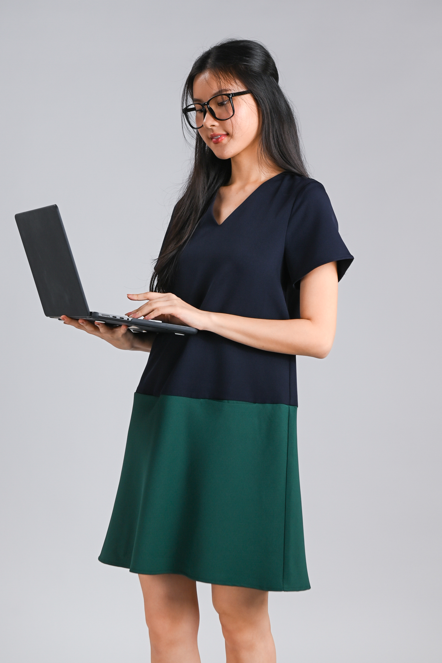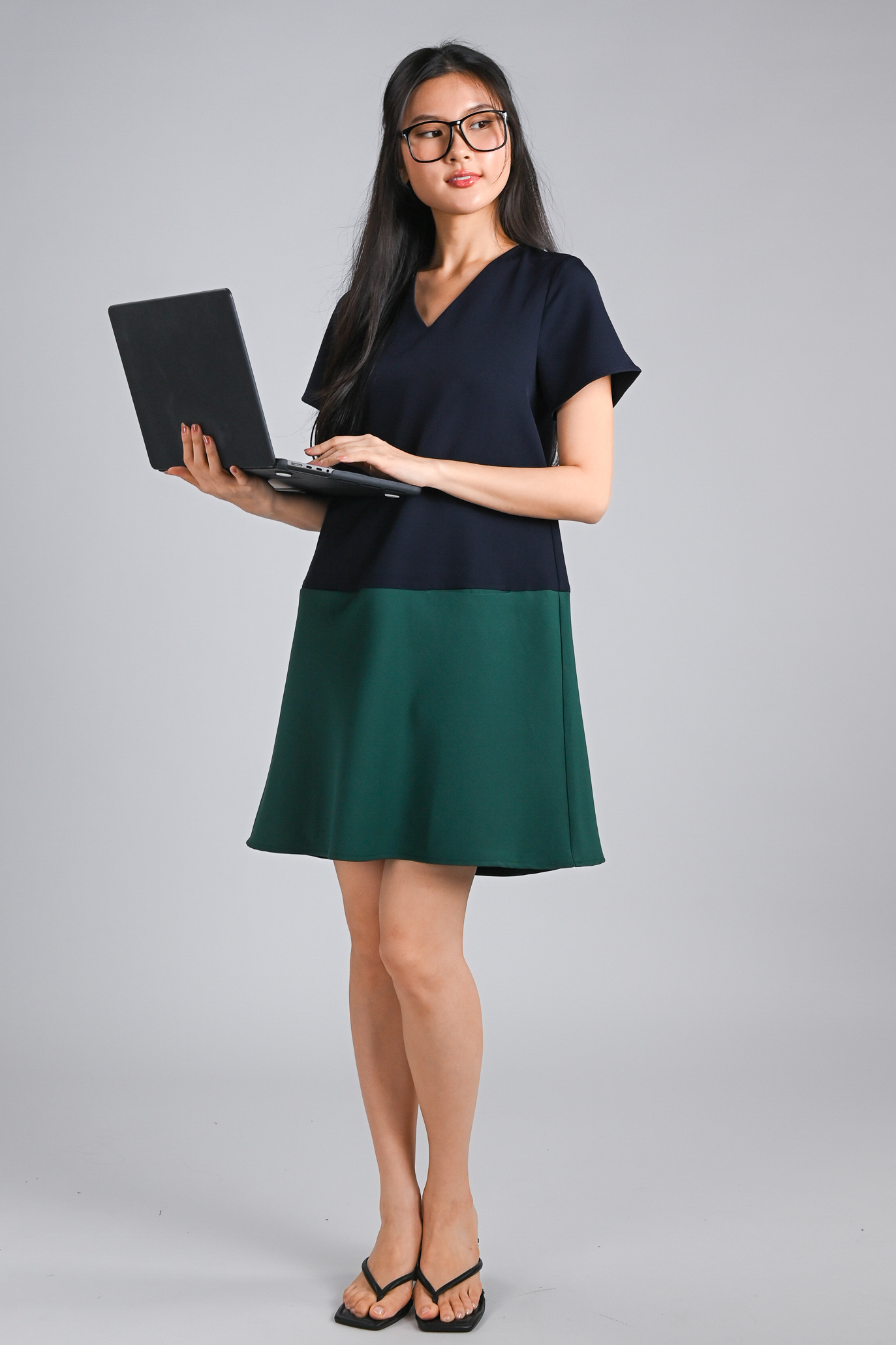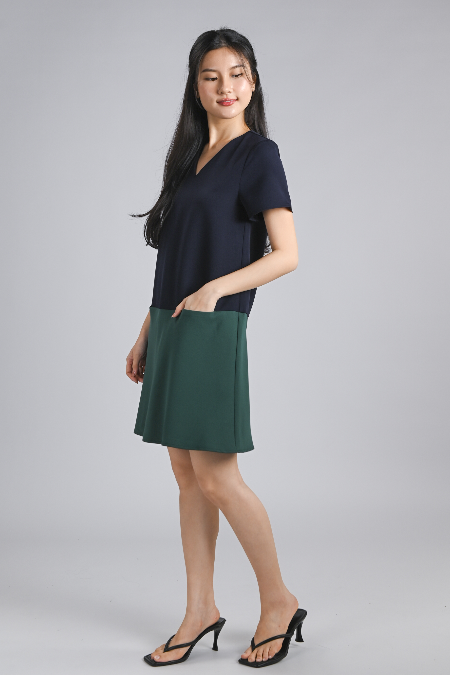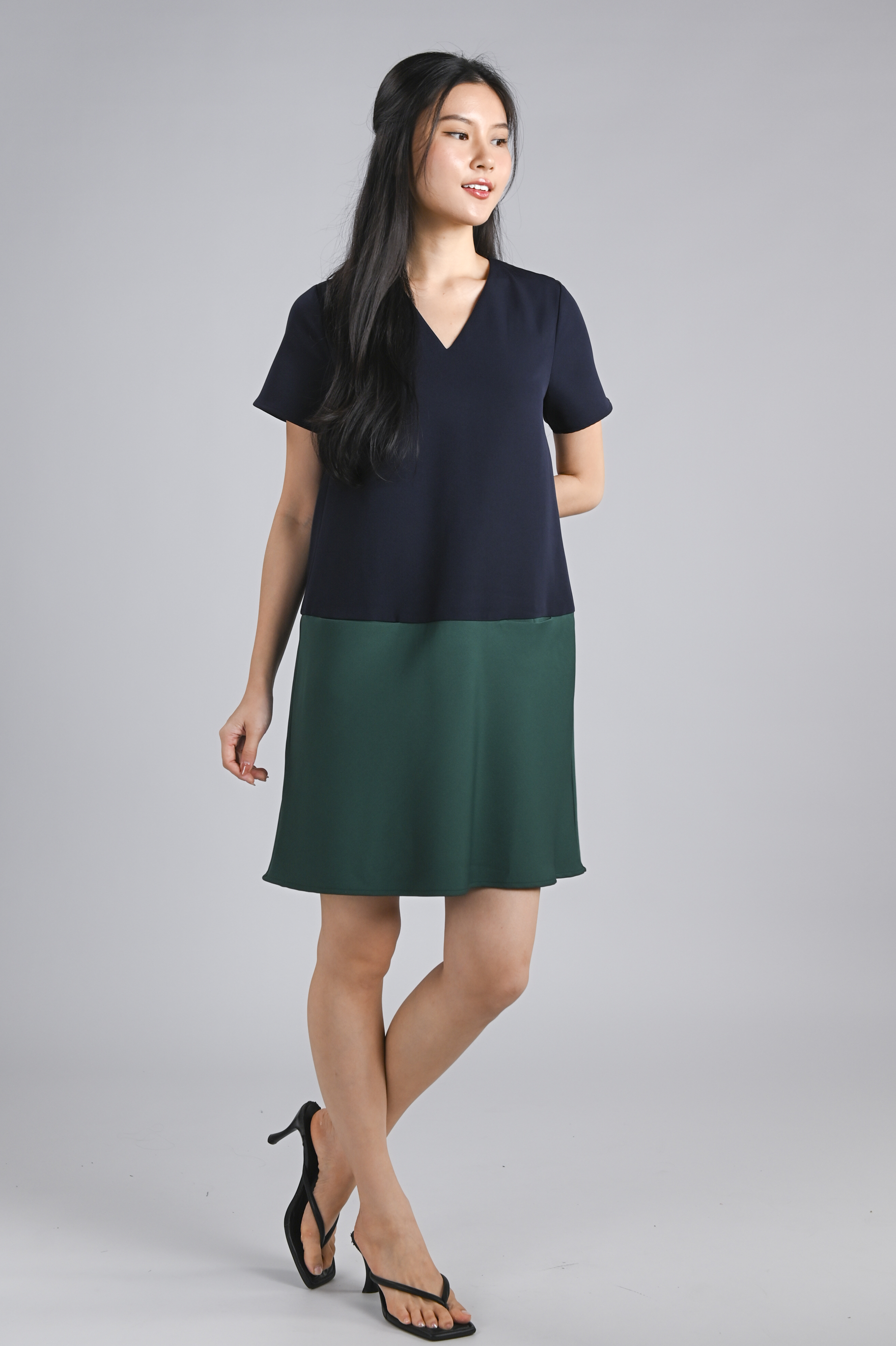 BRIGHTON SLEEVED SHIFT DRESS IN NAVY+GREEN