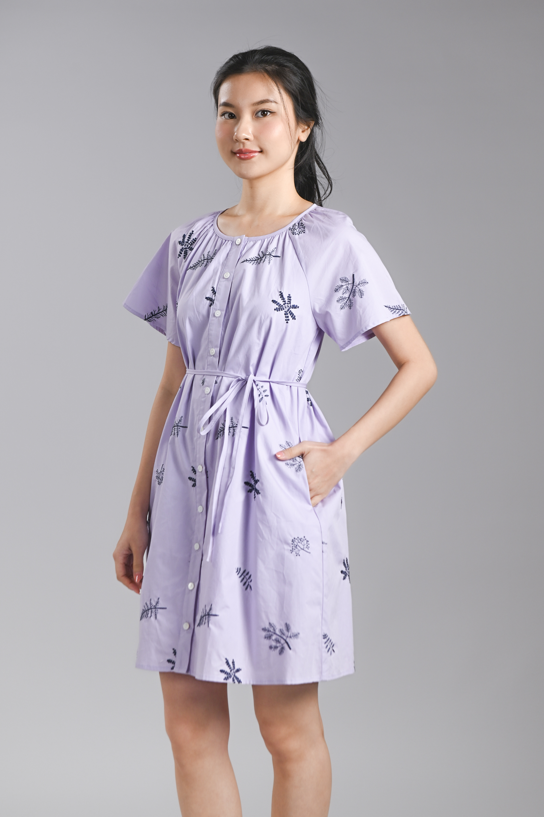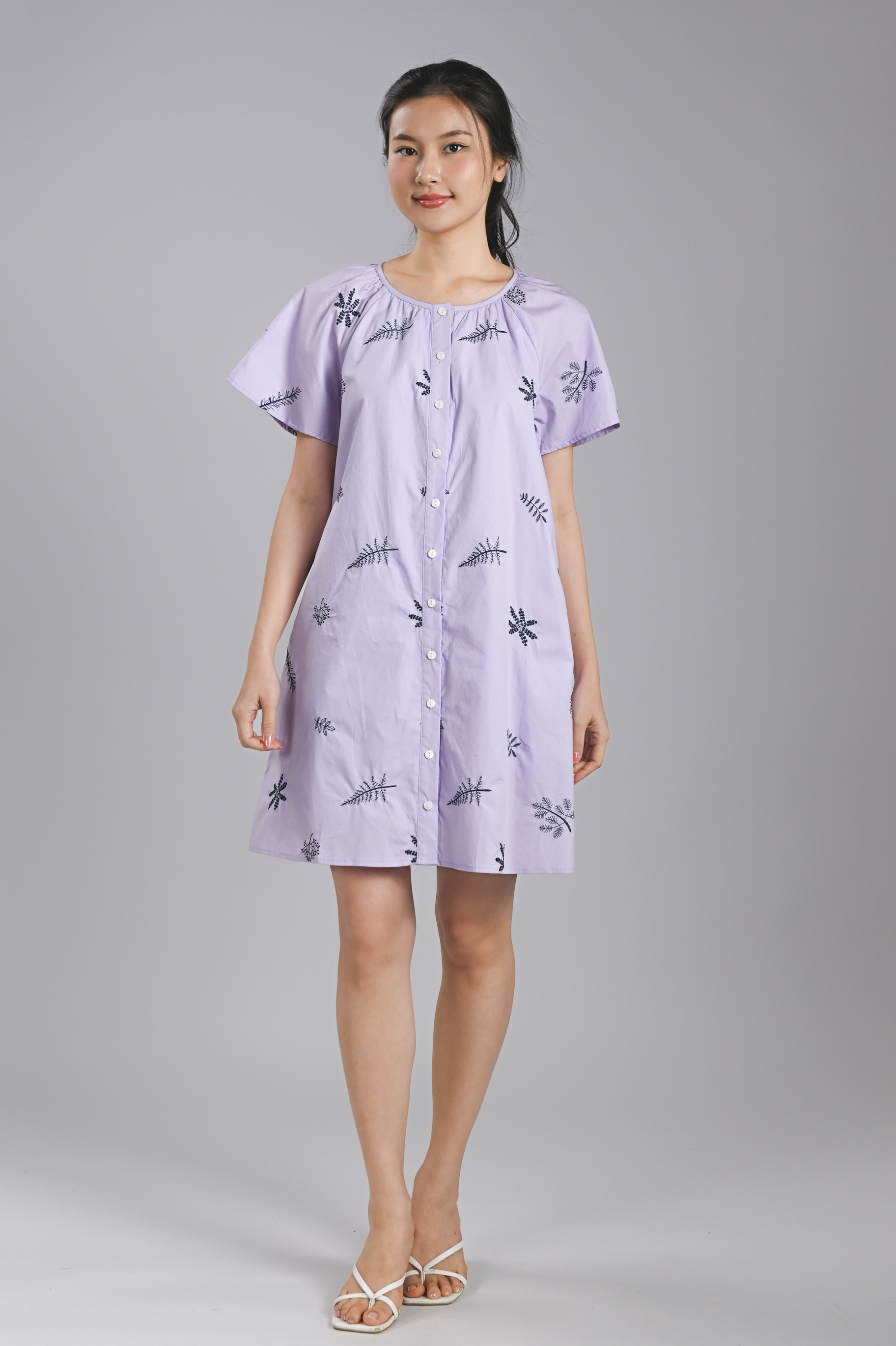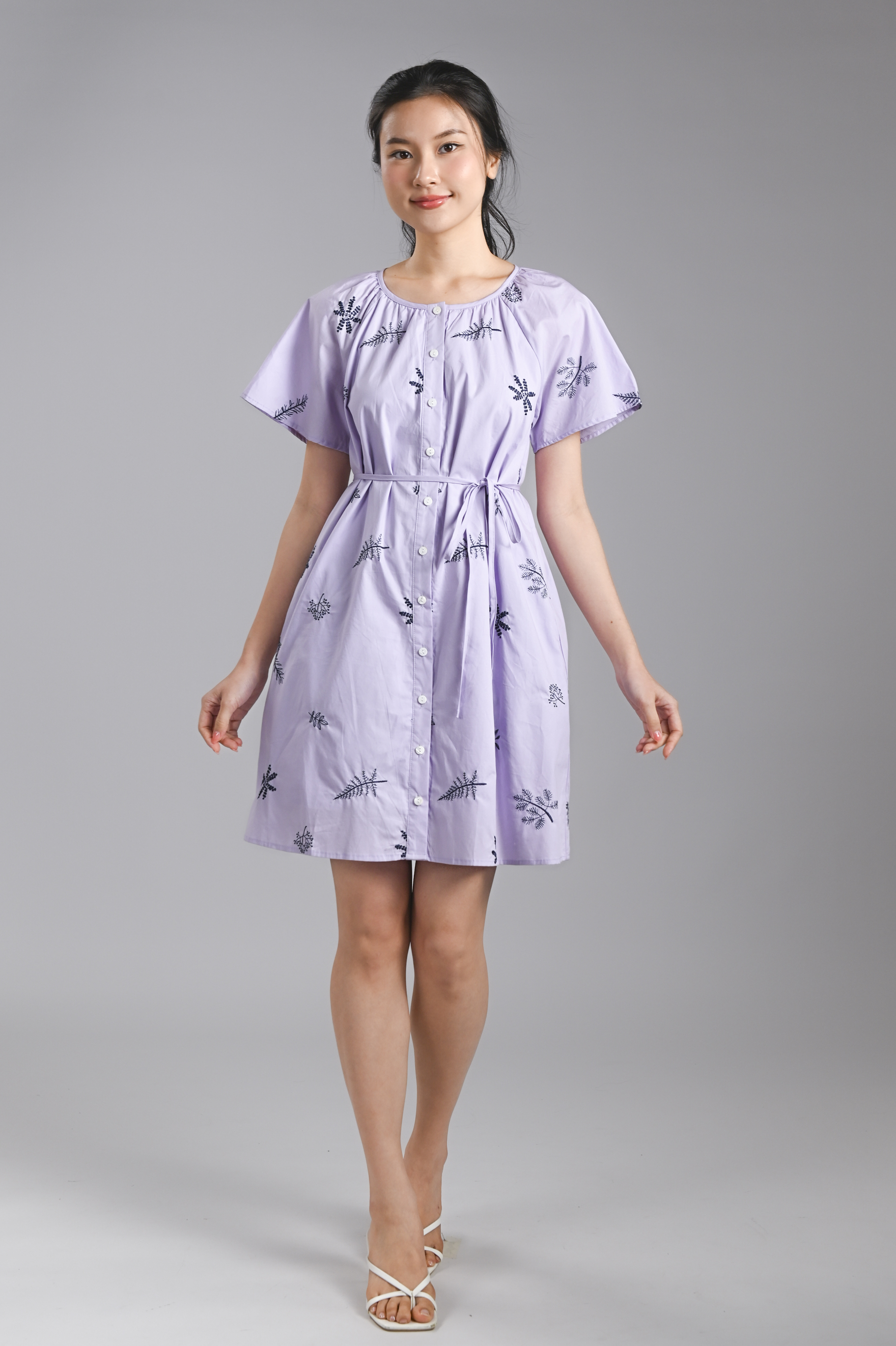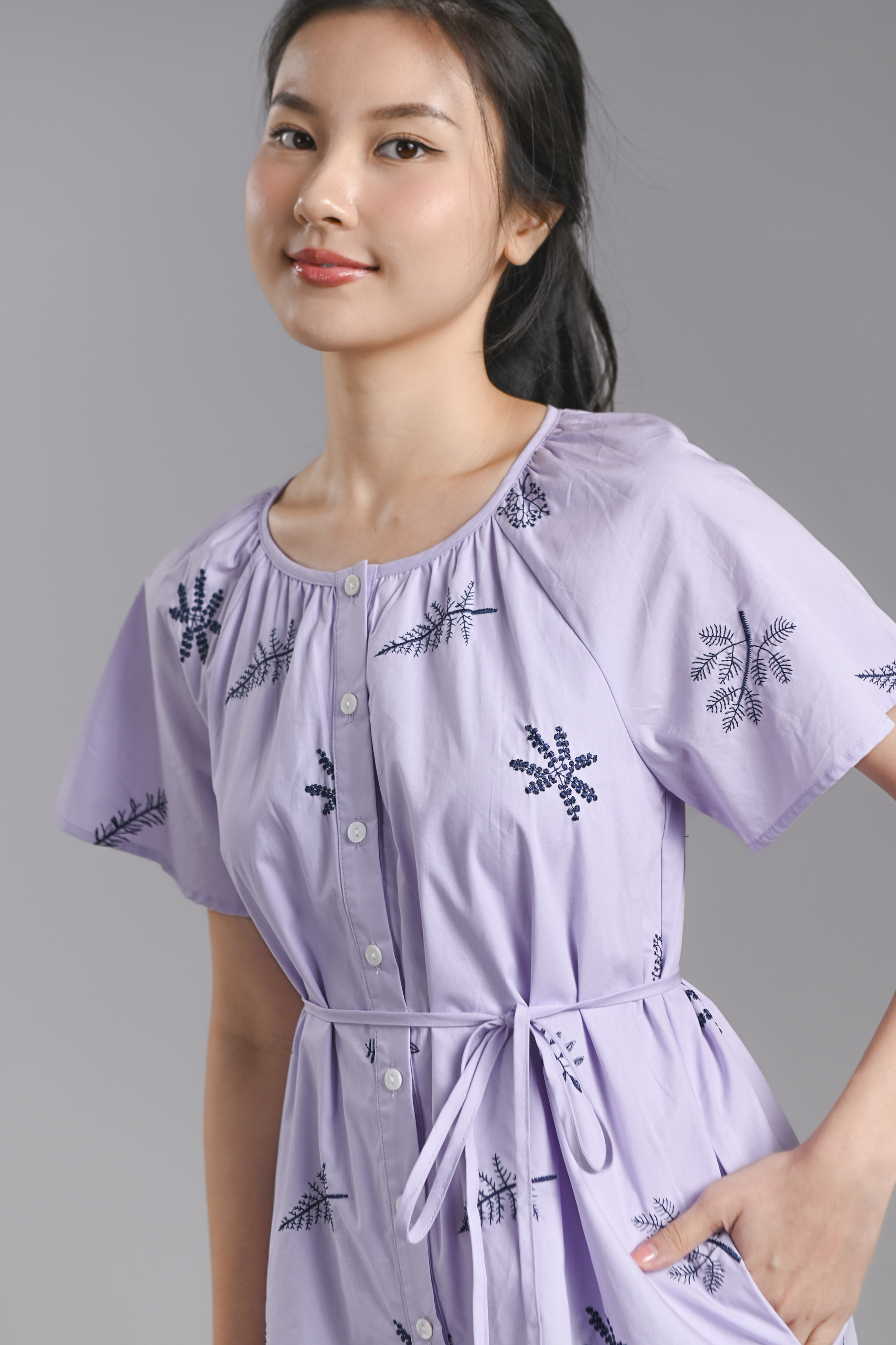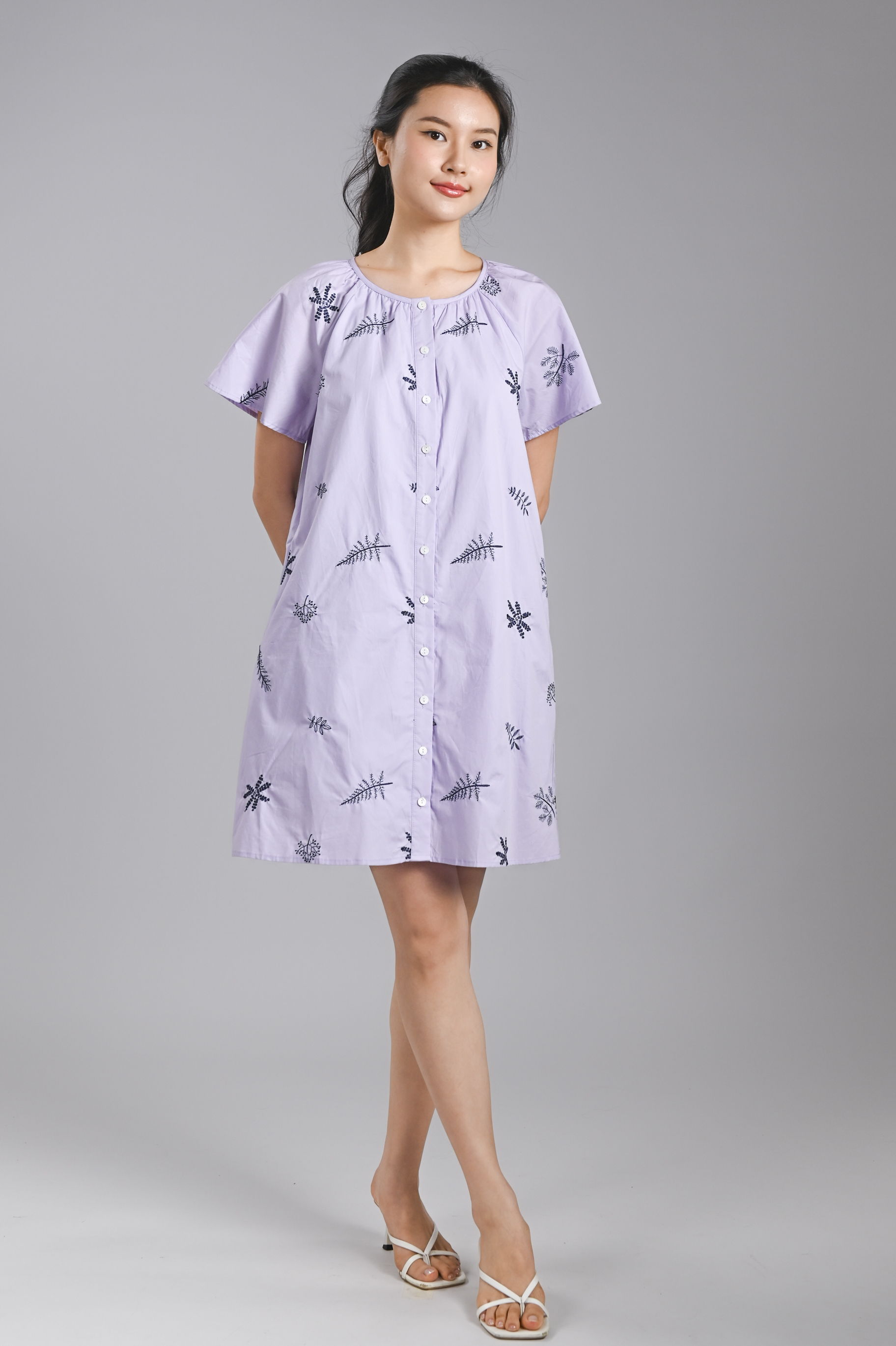 BRYELLE EMB. SLEEVED BUTTON DRESS IN LILAC