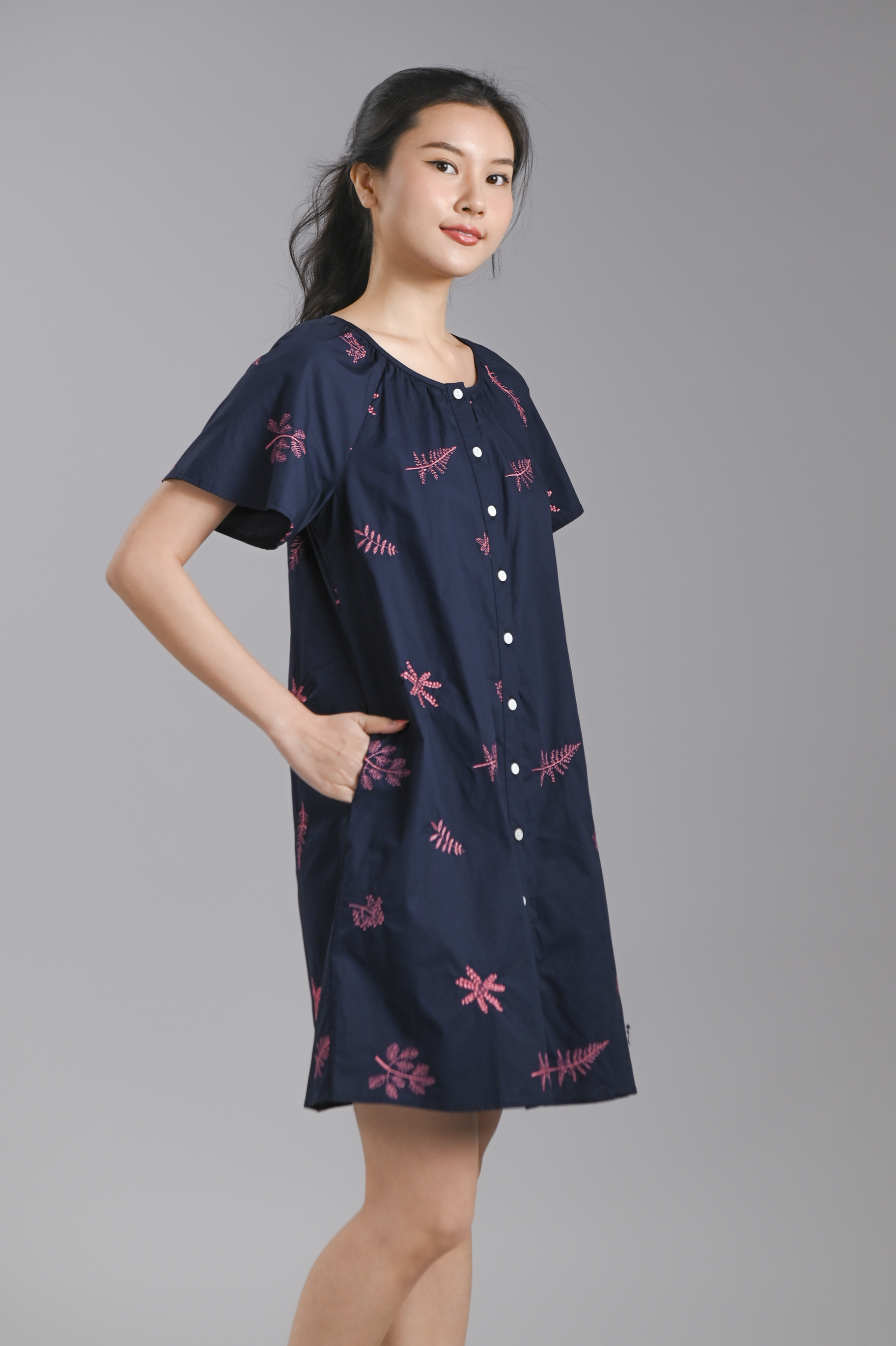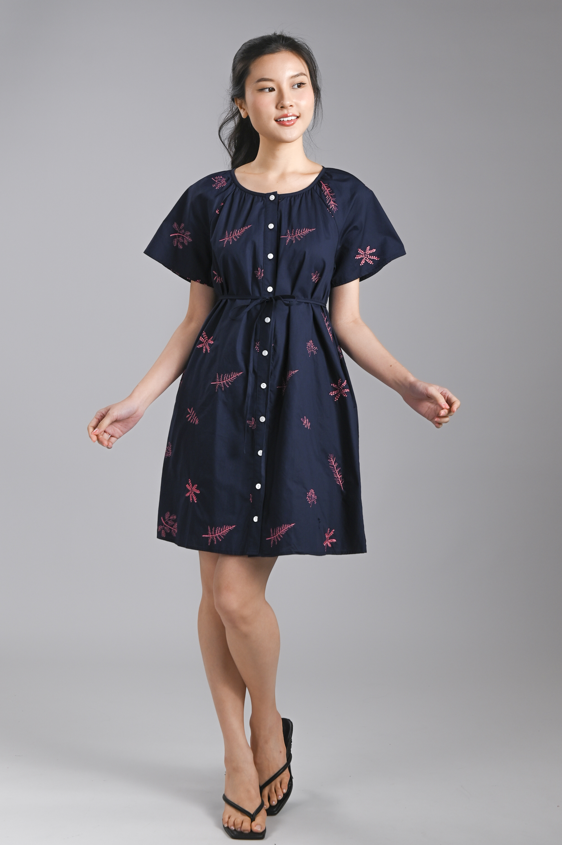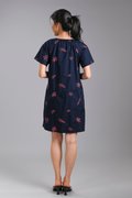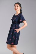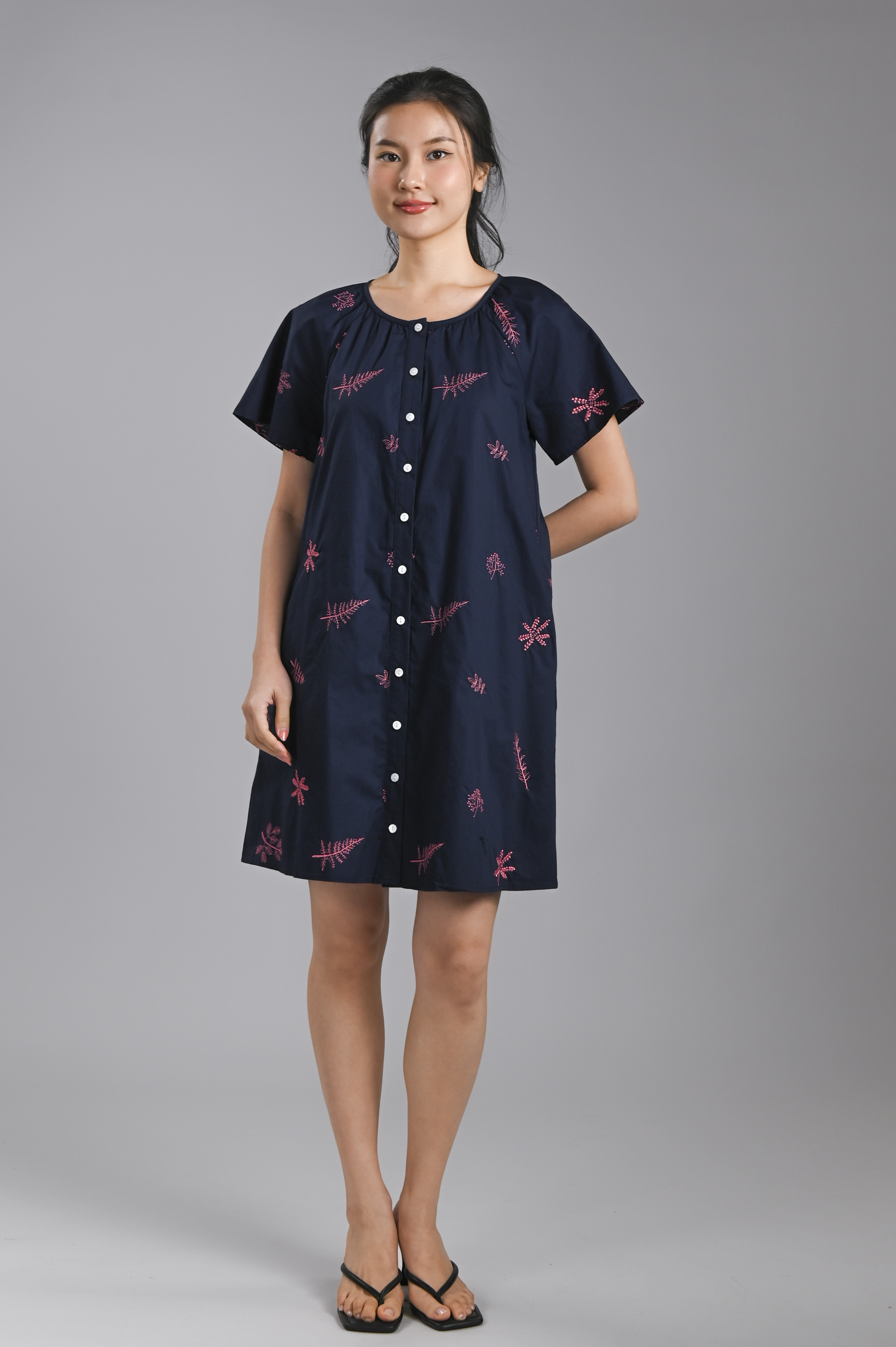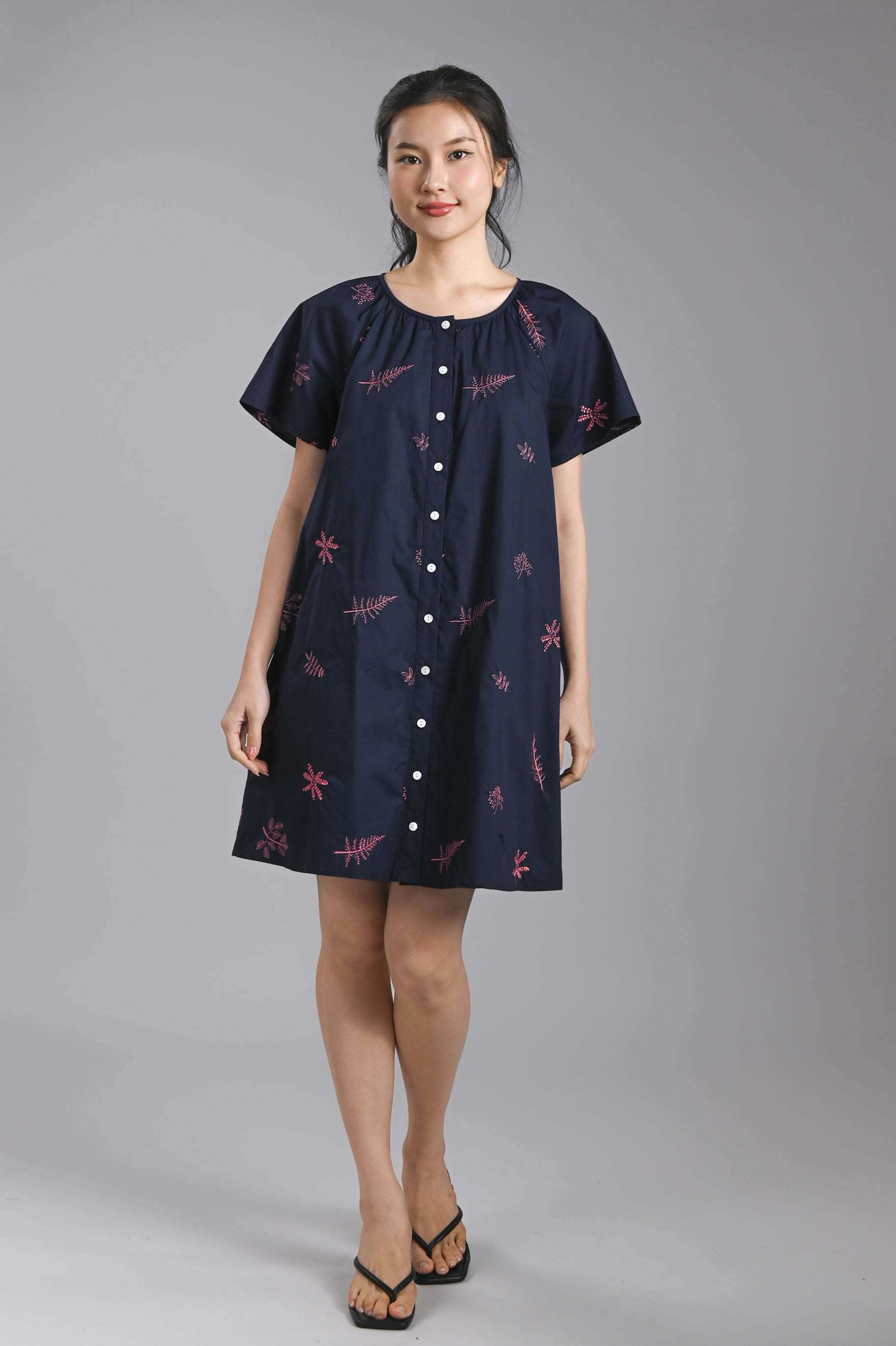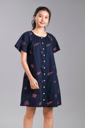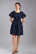 BRYELLE EMB. SLEEVED BUTTON DRESS IN NAVY