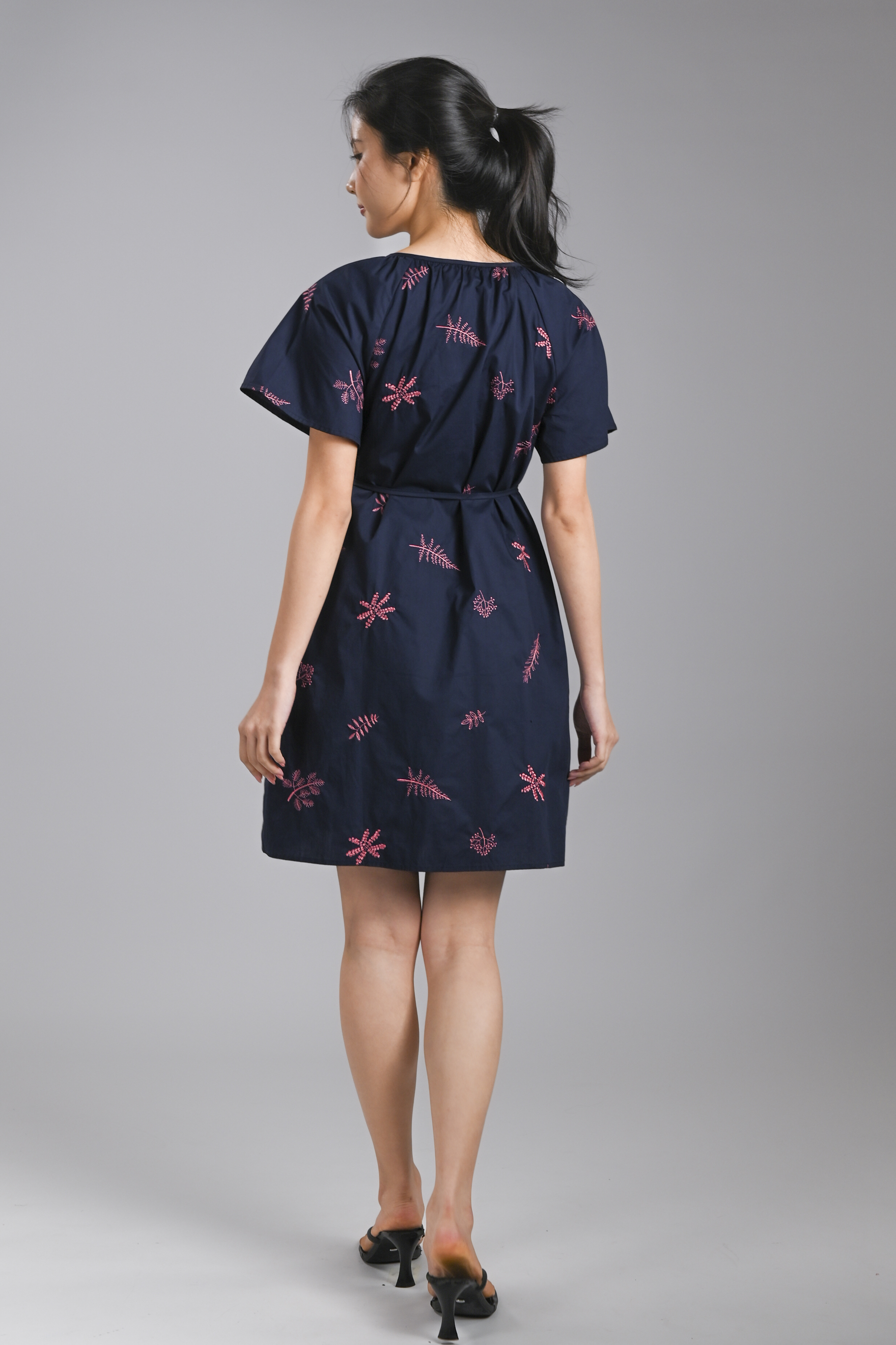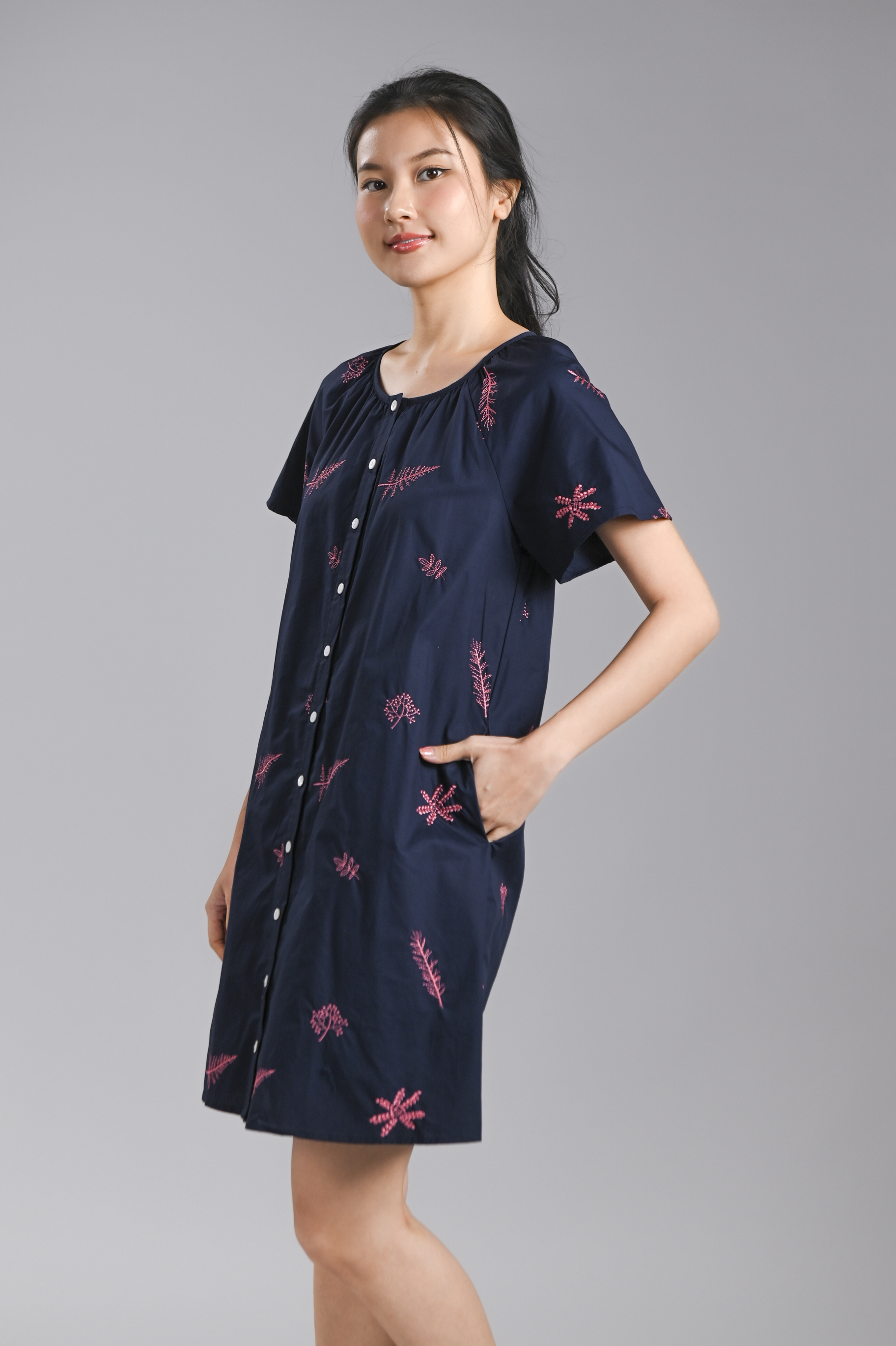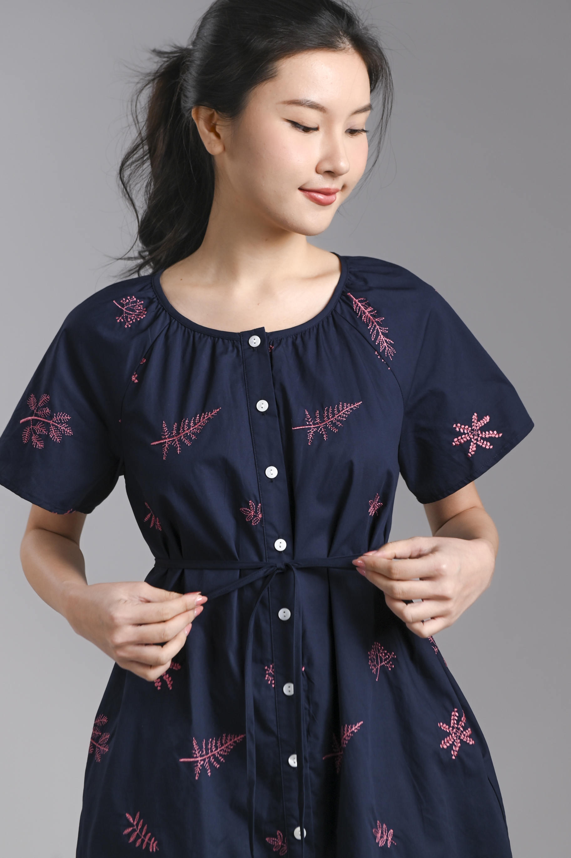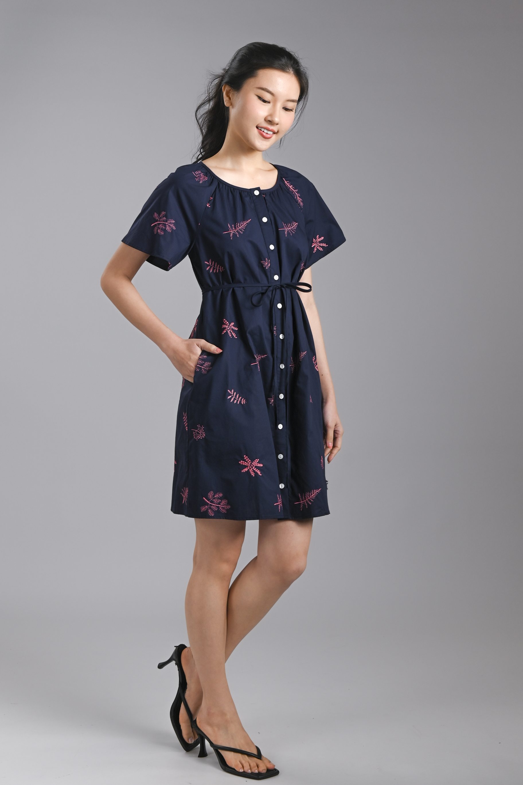 BRYELLE EMB. SLEEVED BUTTON DRESS IN NAVY