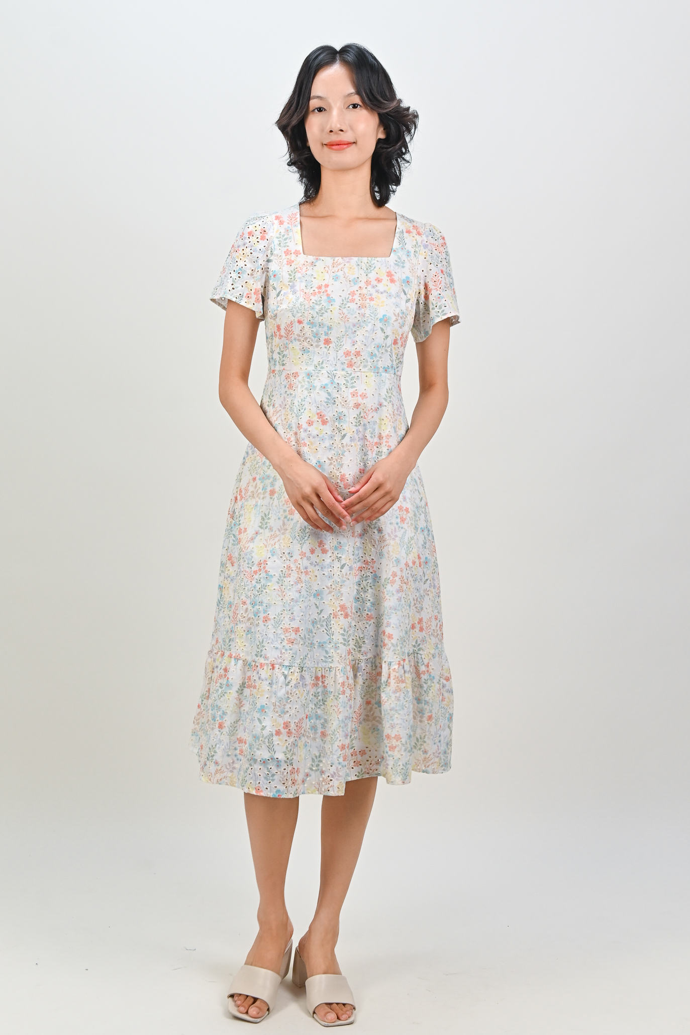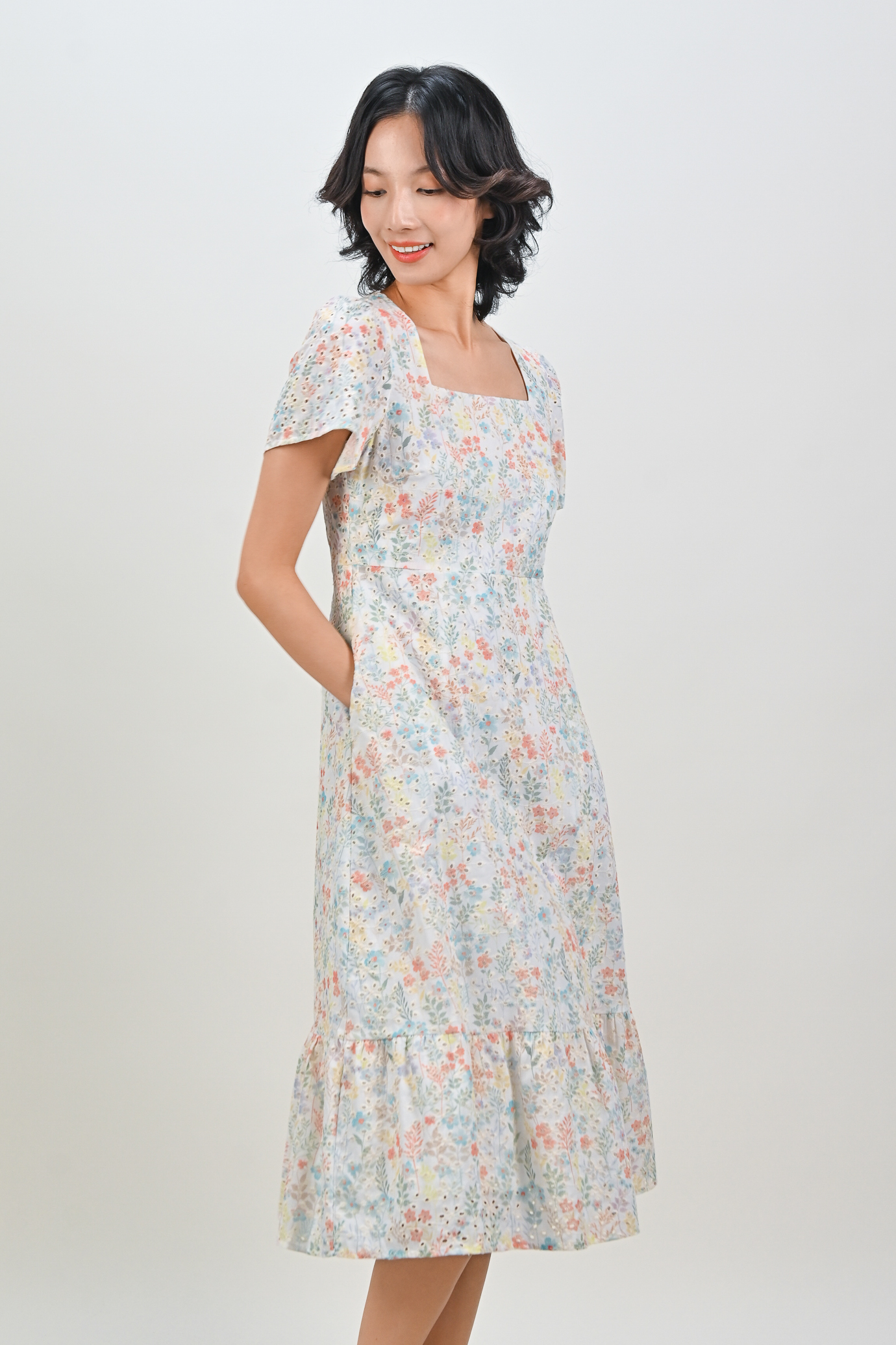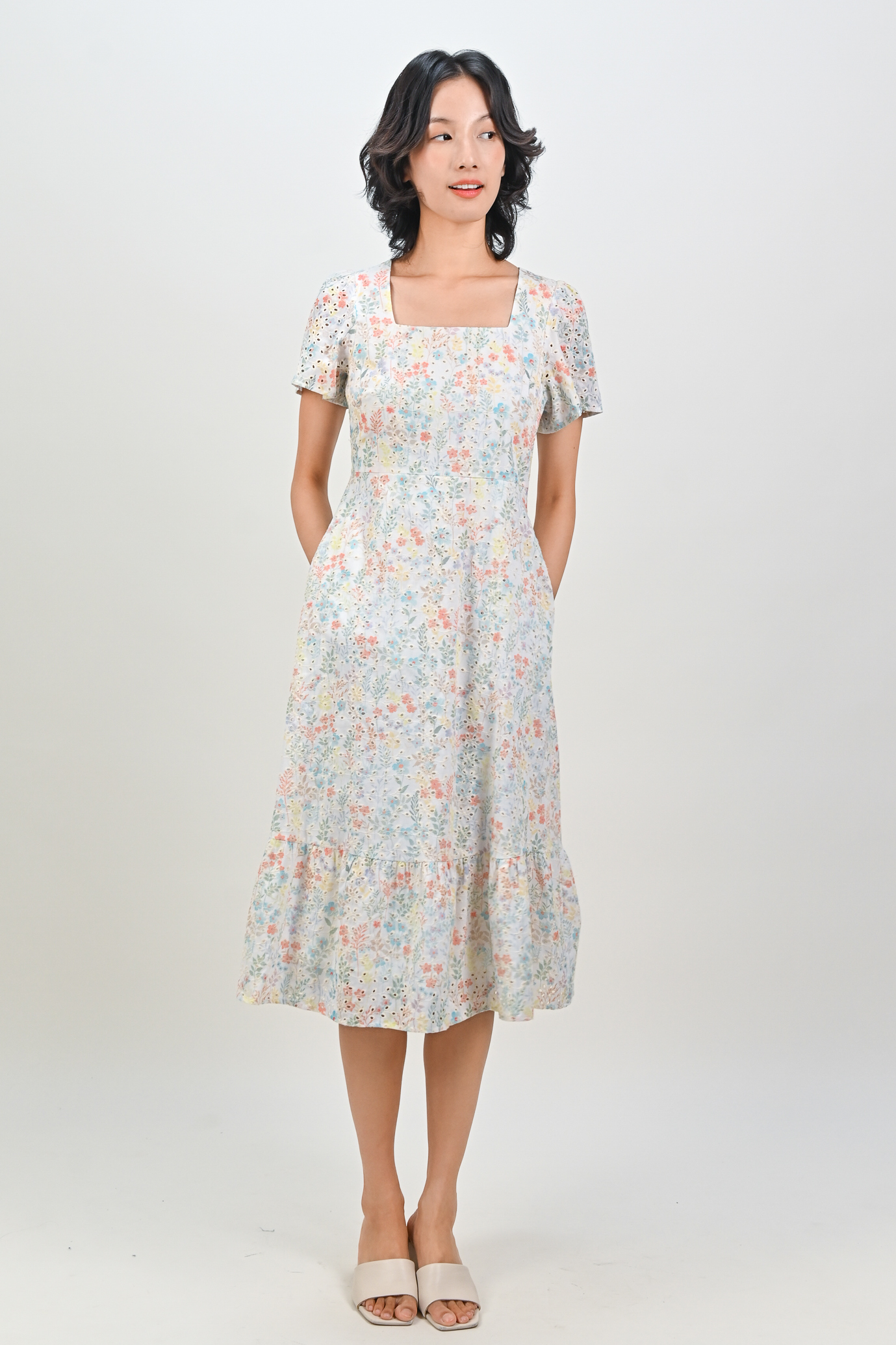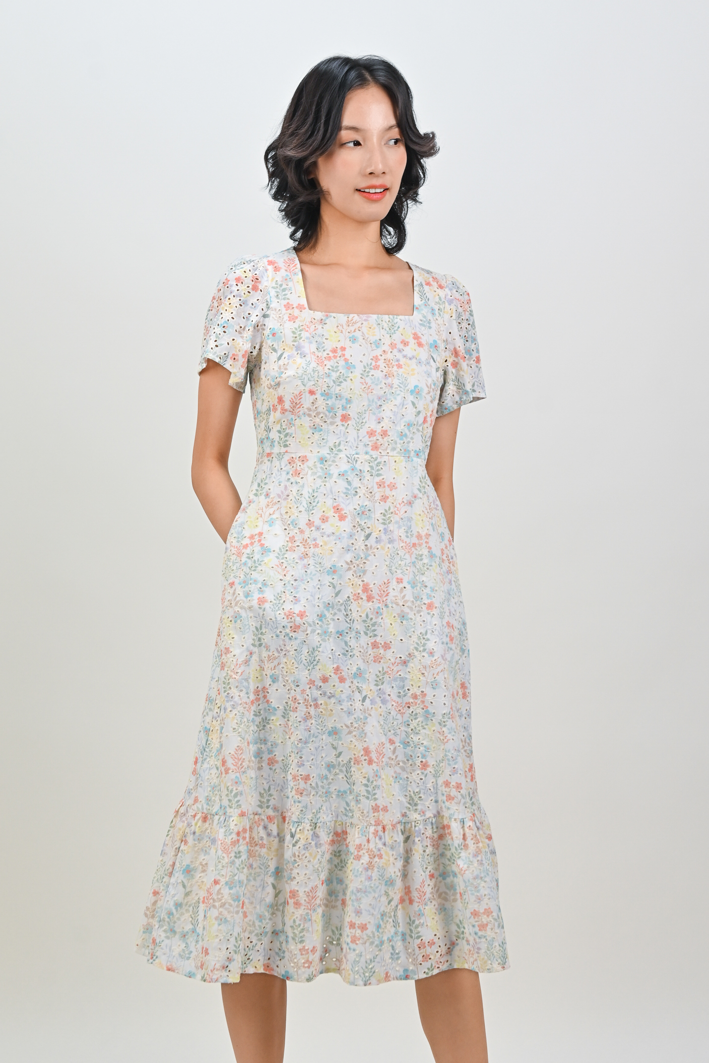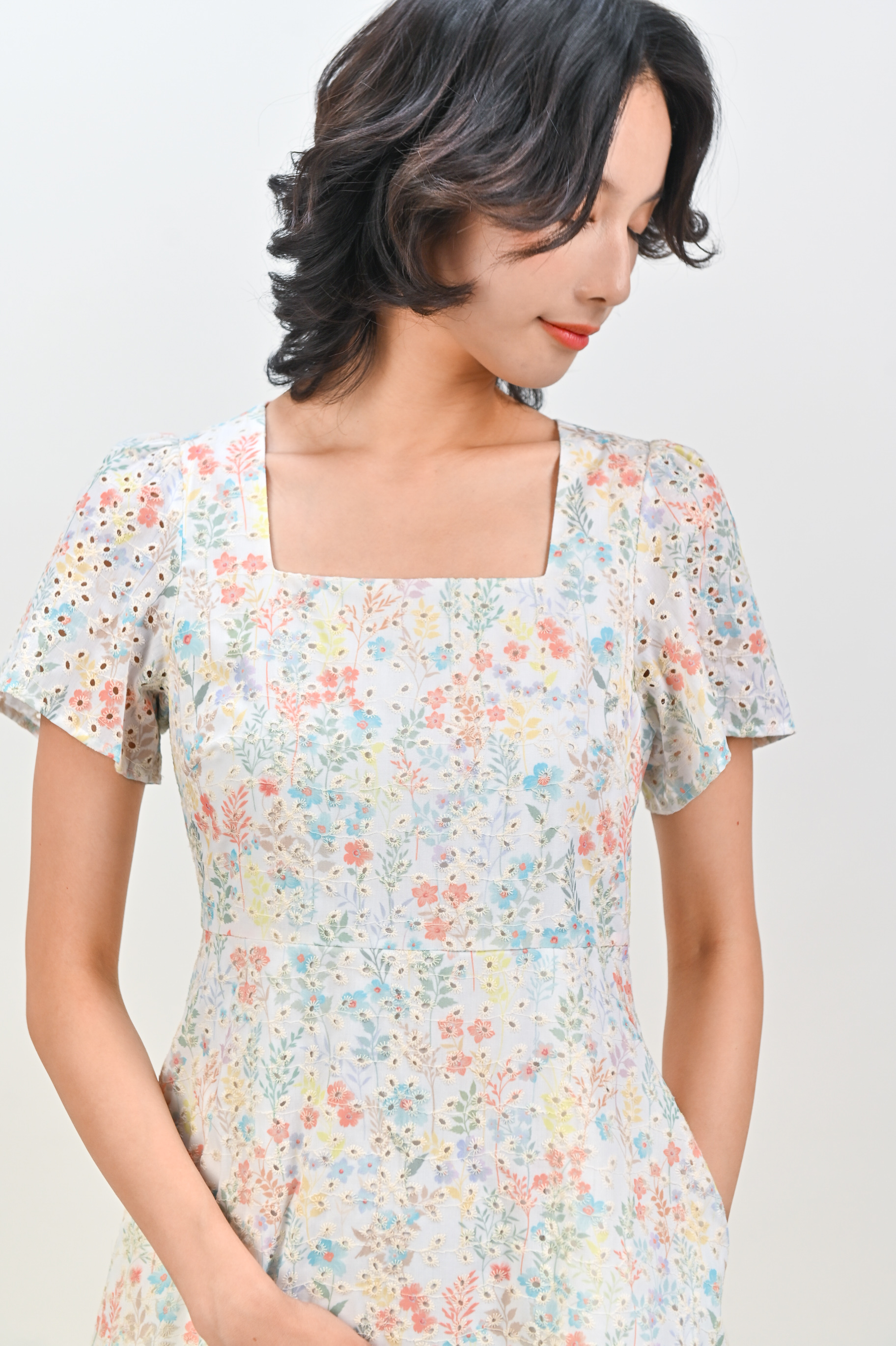 CAELYN EYELET FLORAL SQUARE-NECK SLEEVED DRESS