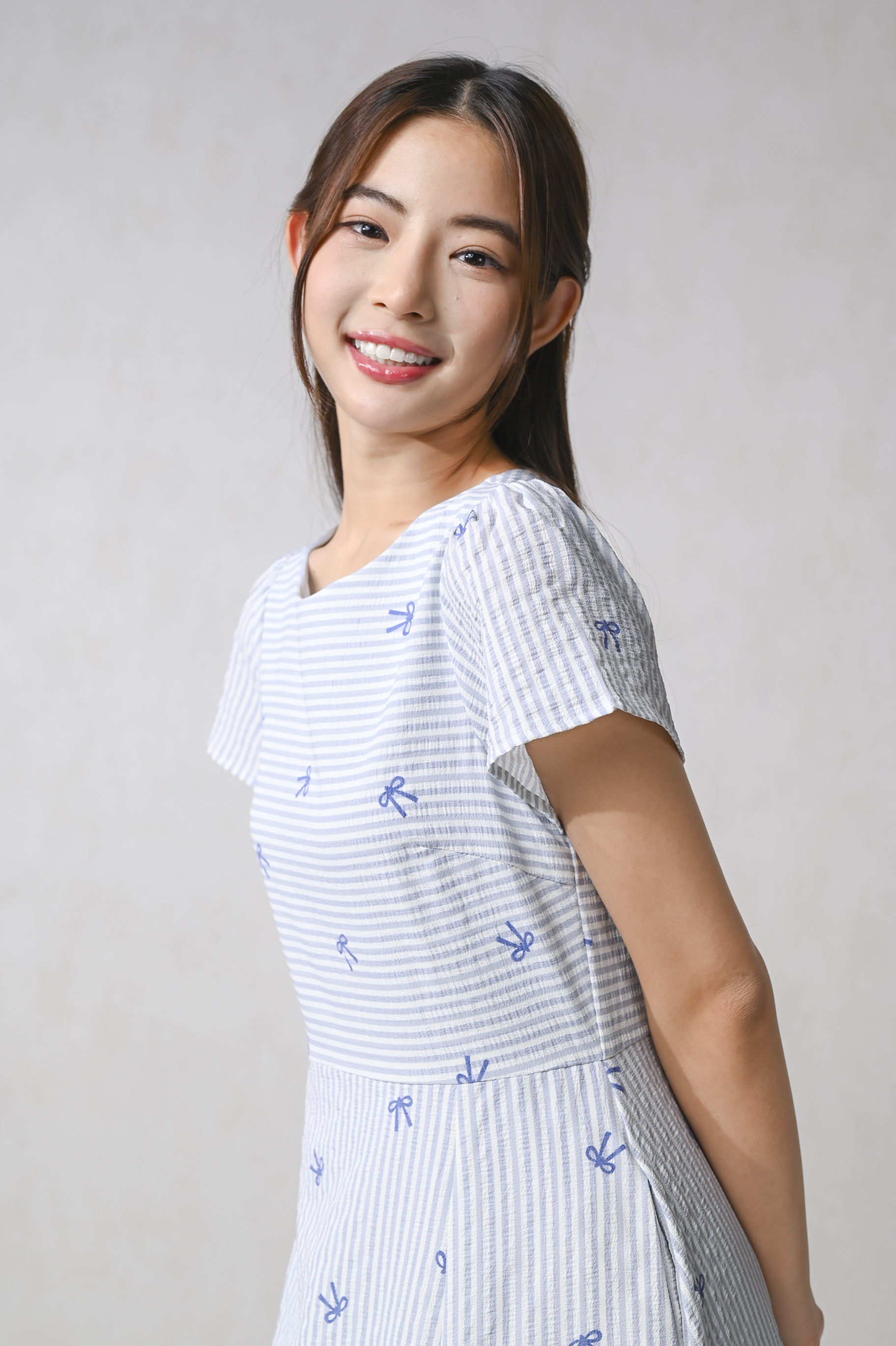 Actual stocks may varySoft stripes, mini bows, and pure sunshine energy 🎀 Our Calla Ribbon Stripe Dress makes every day feel a little brighter 💛🩵