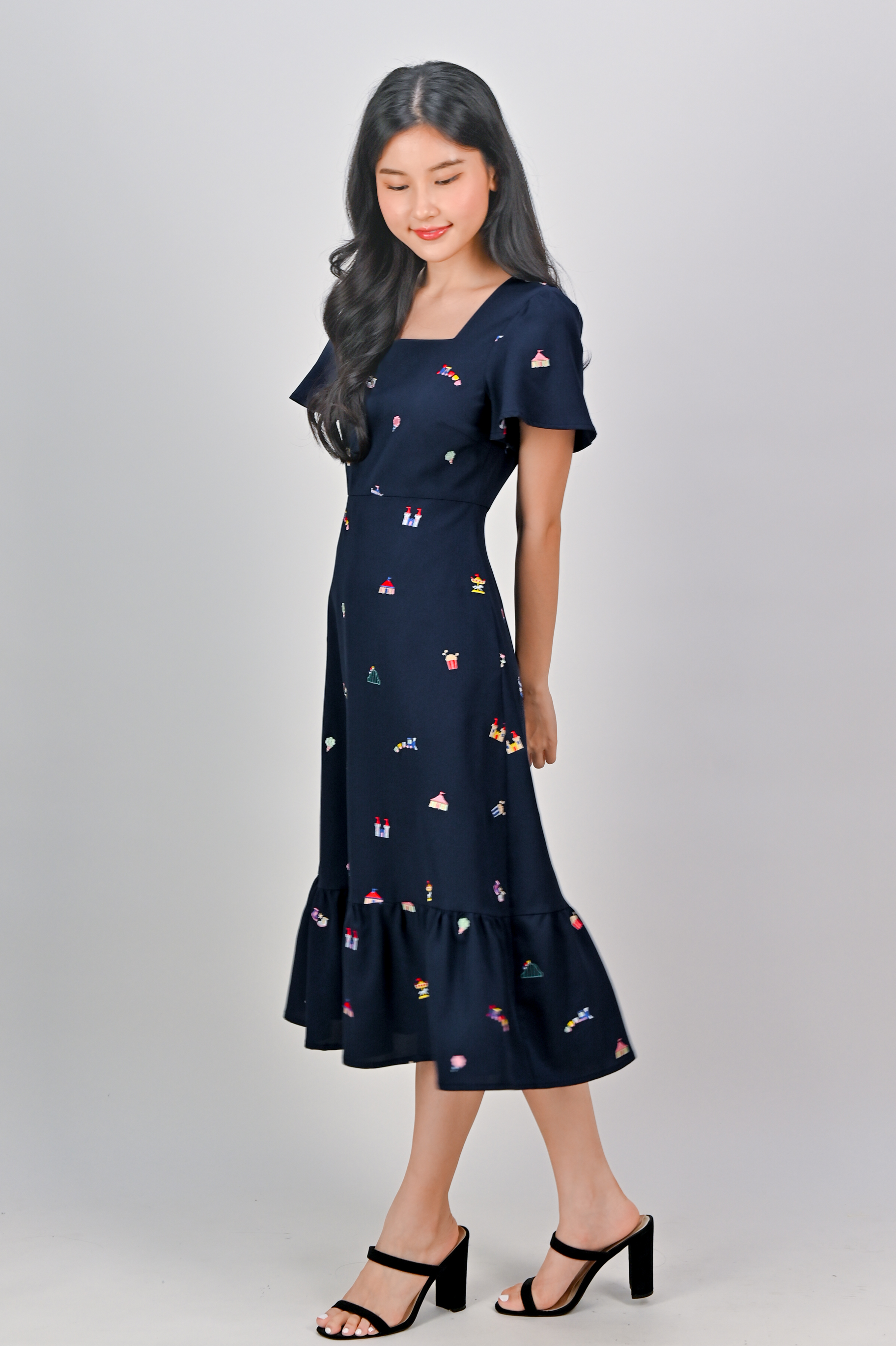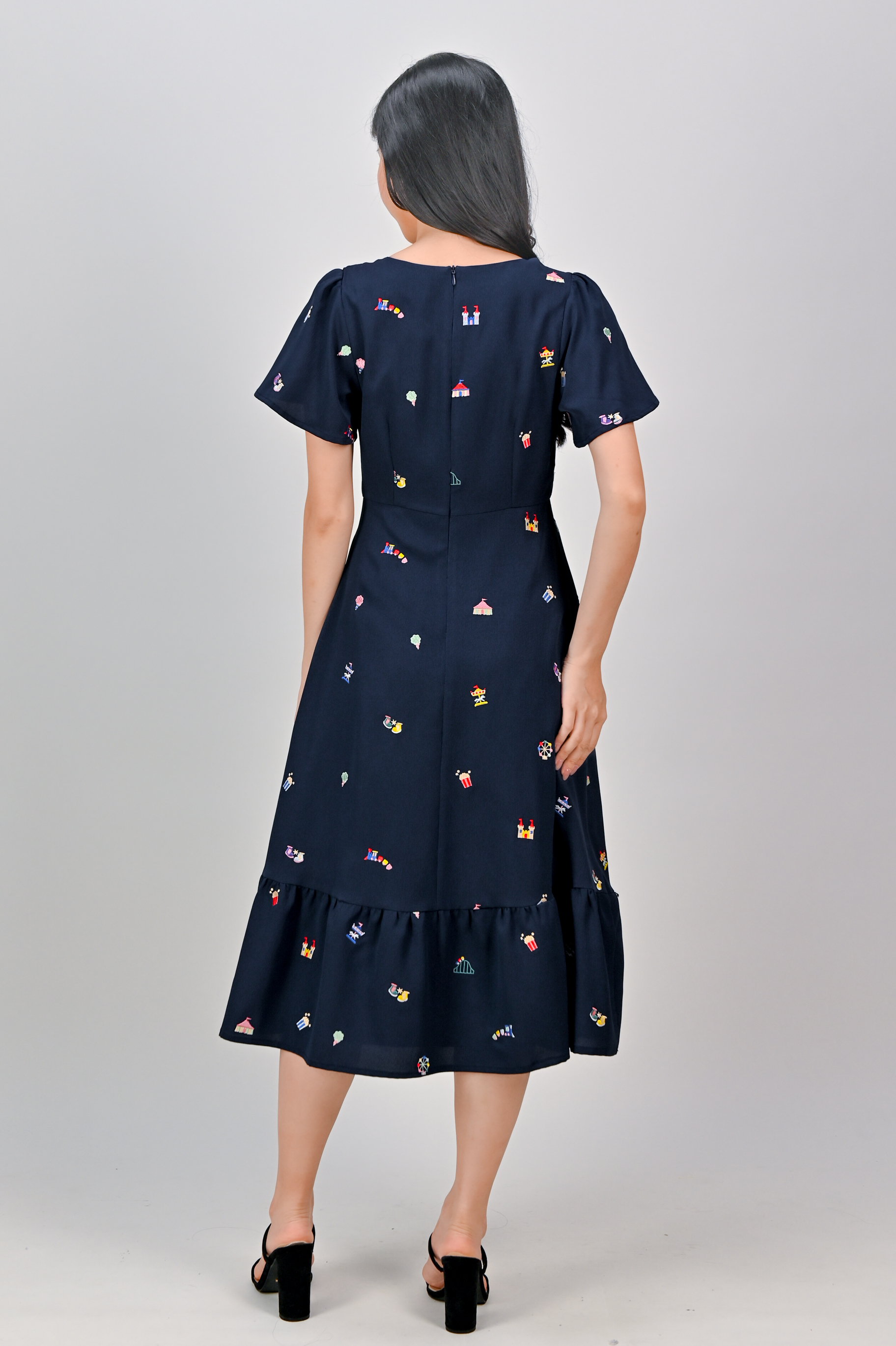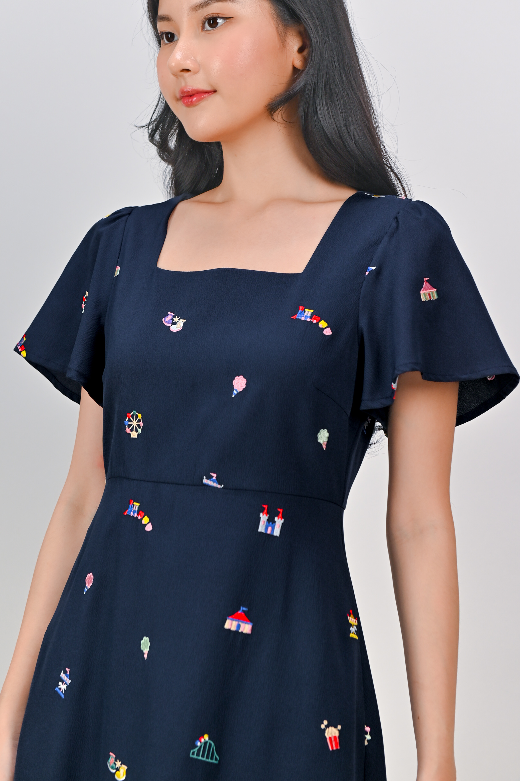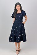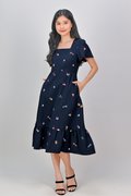 CARNIVAL NAVY EMB. SQUARE-NECK SLEEVED DRESS