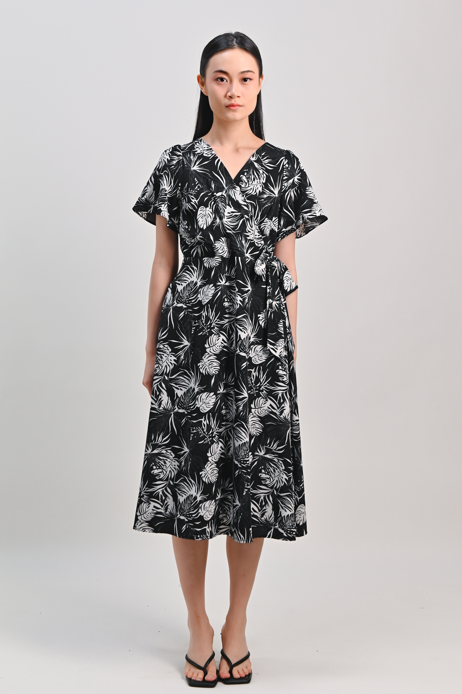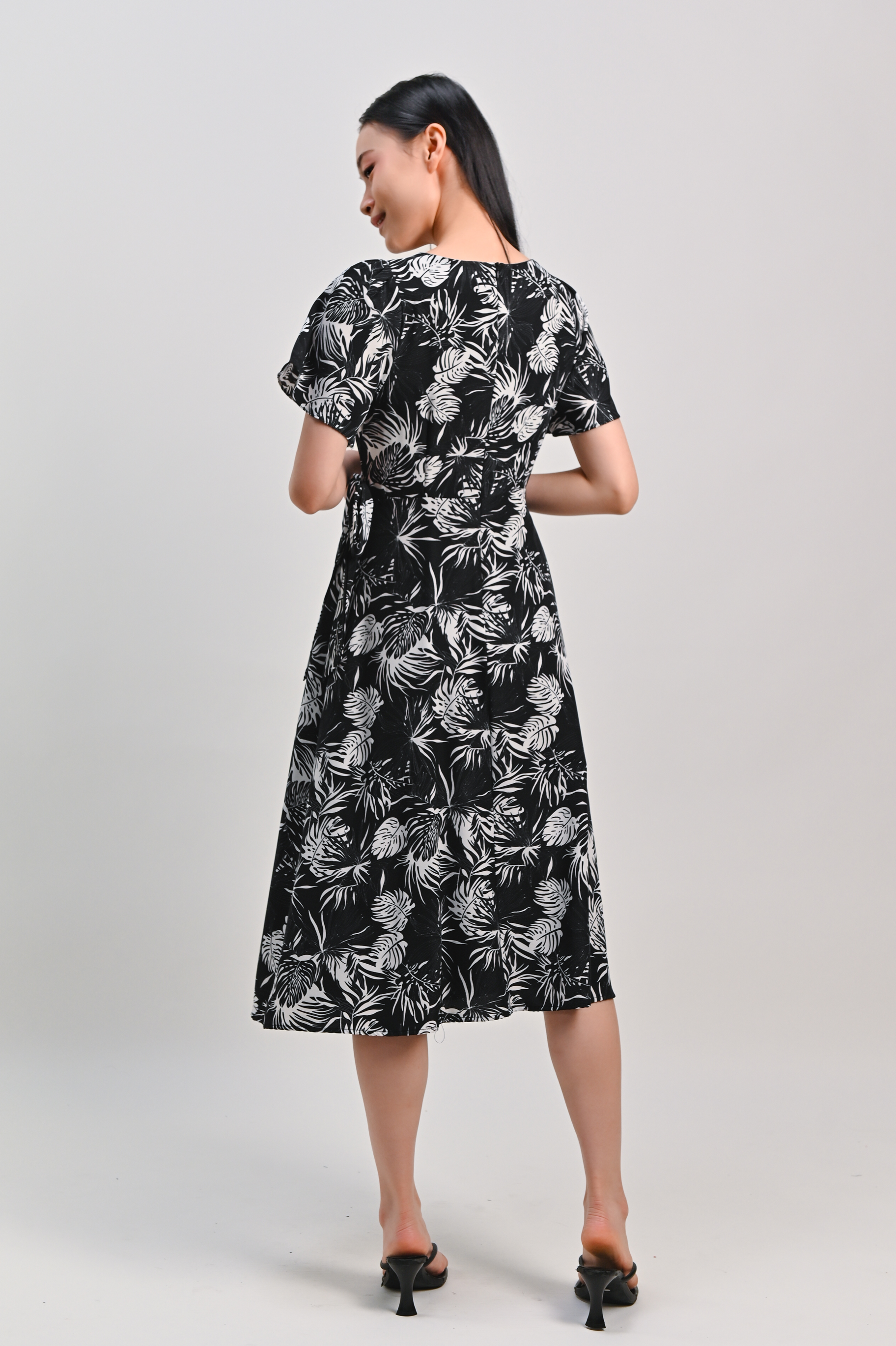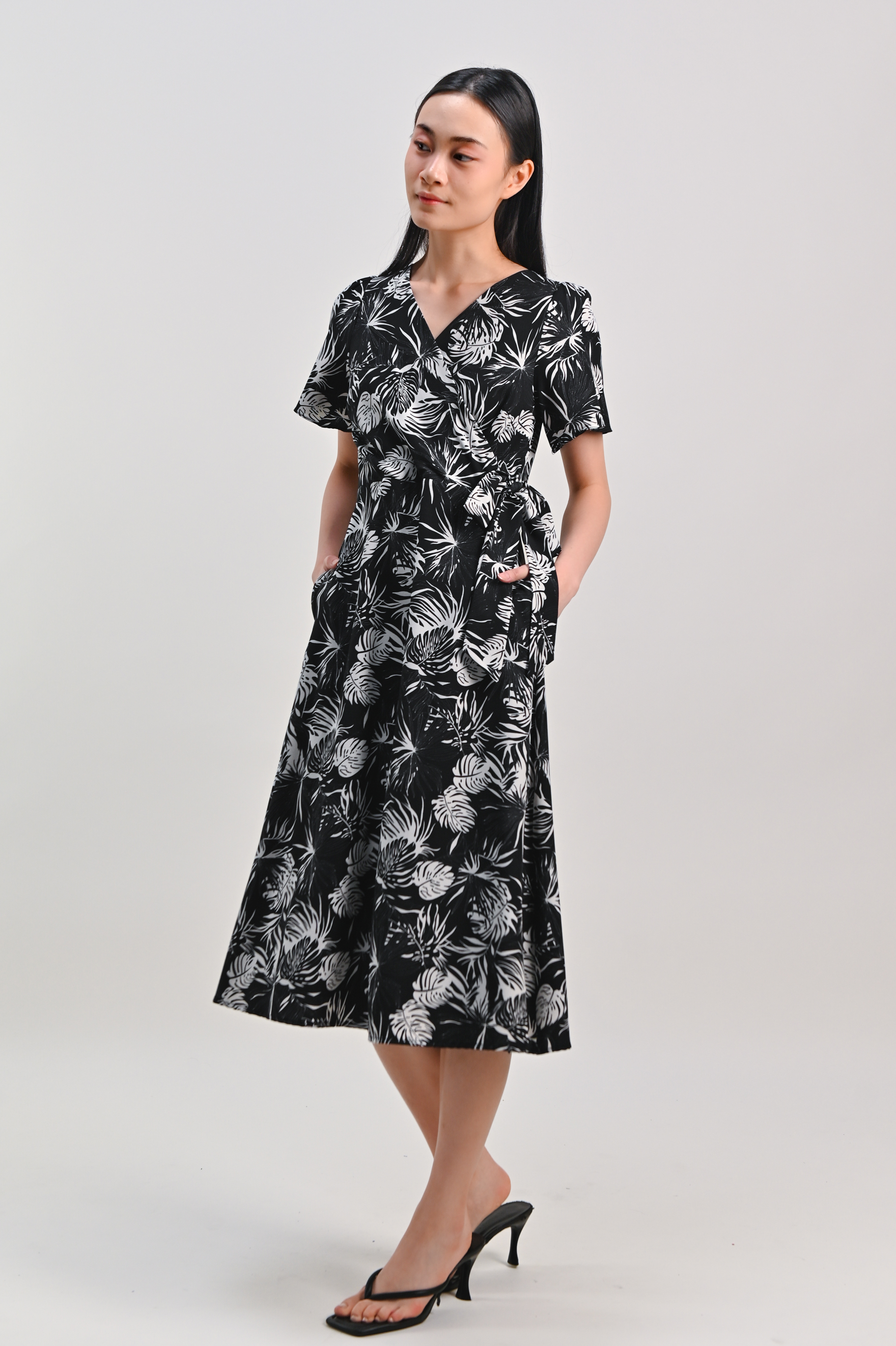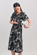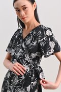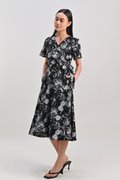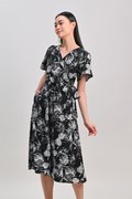 CHARLIZE SLEEVED TIE-SASH DRESS IN BLACK FOLIAGE
