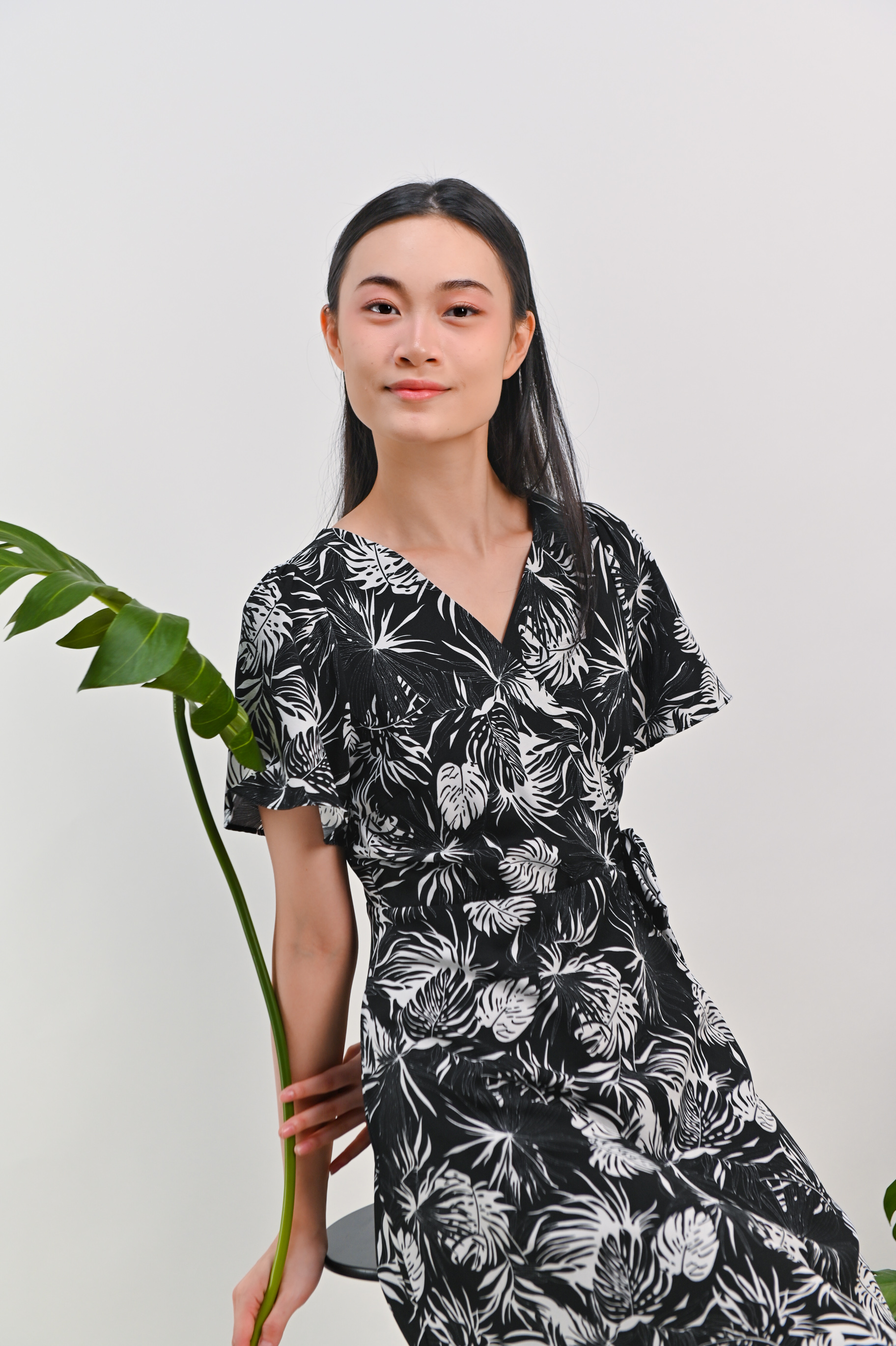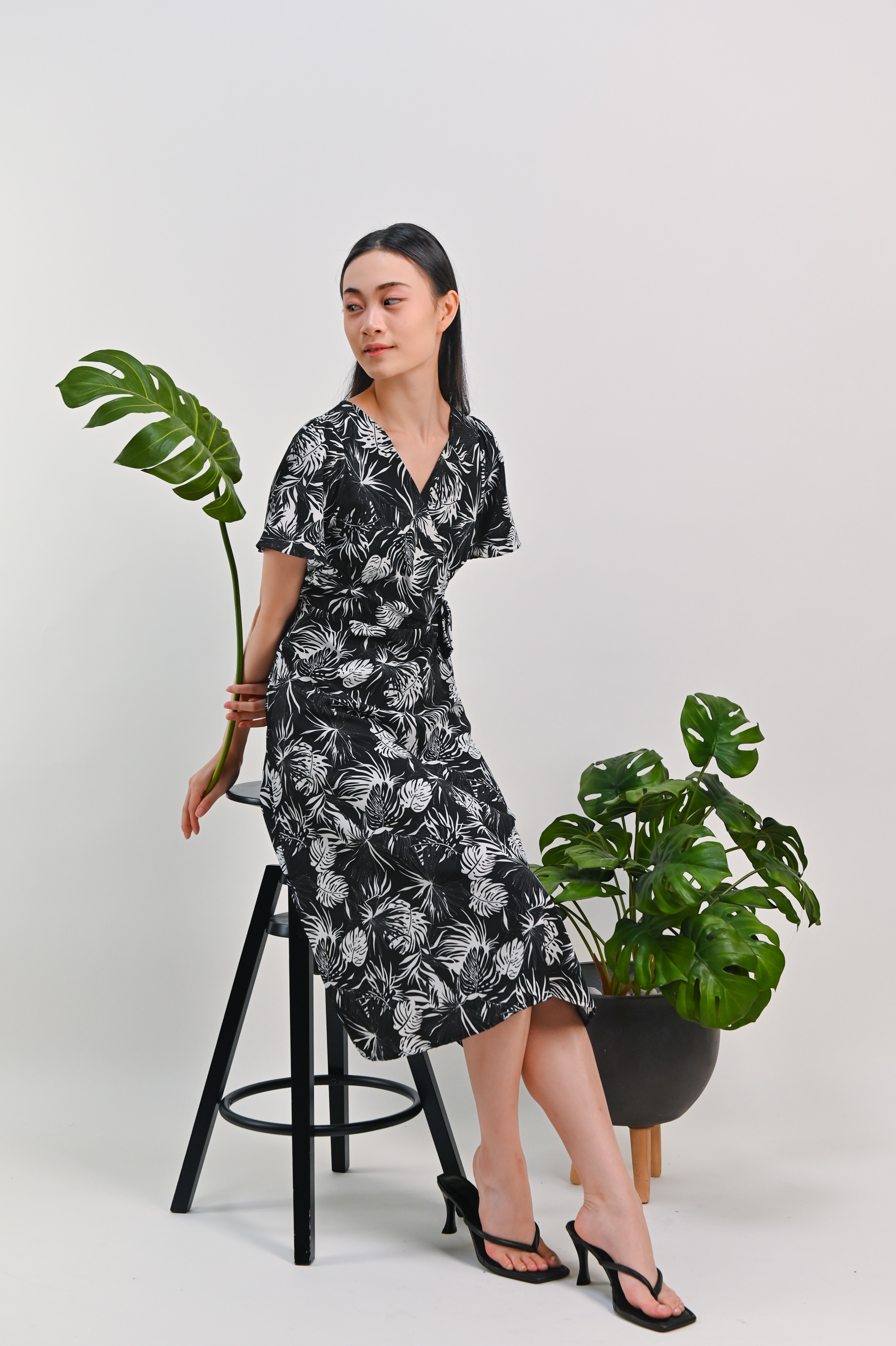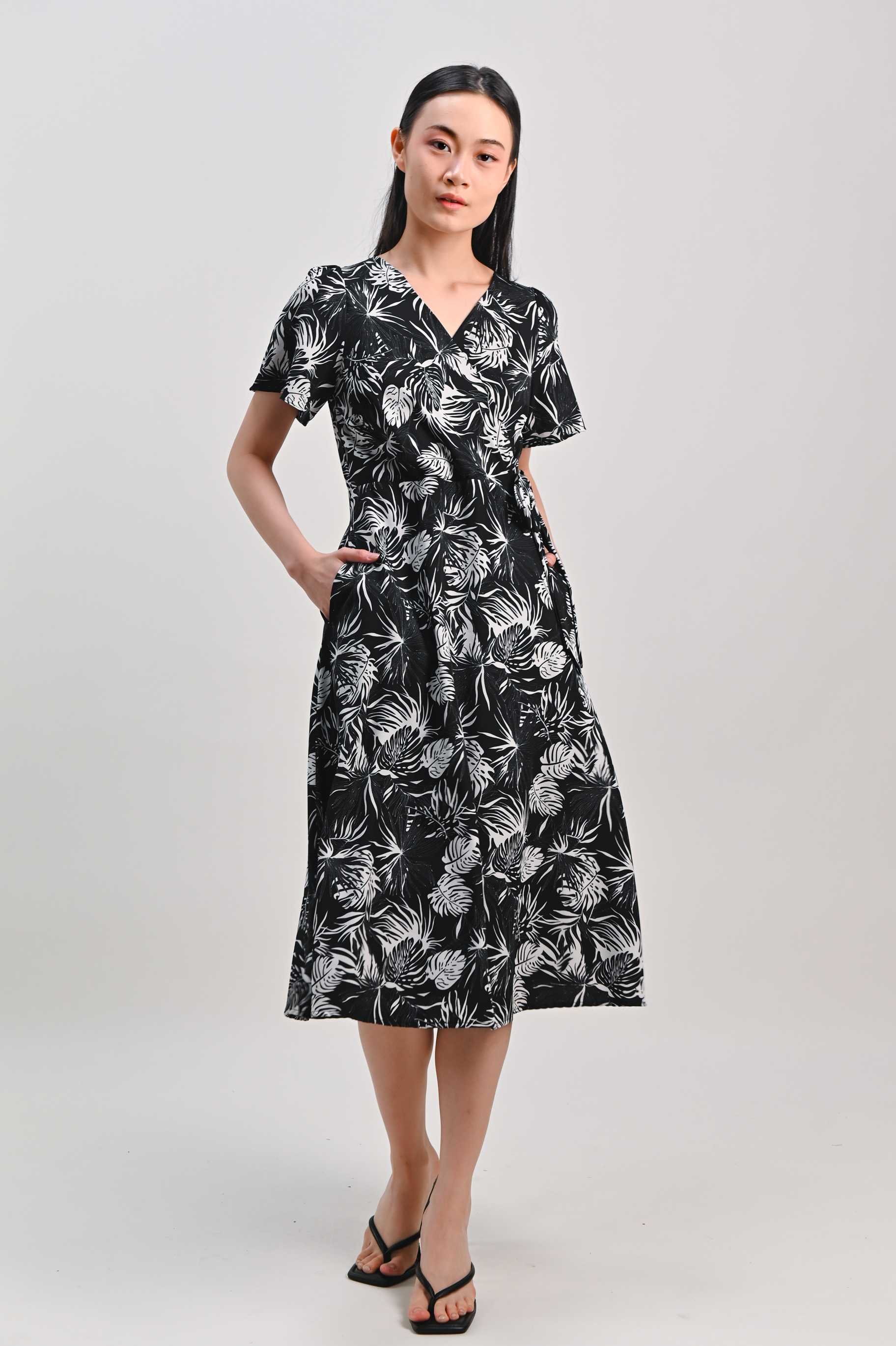 CHARLIZE SLEEVED TIE-SASH DRESS IN BLACK FOLIAGE