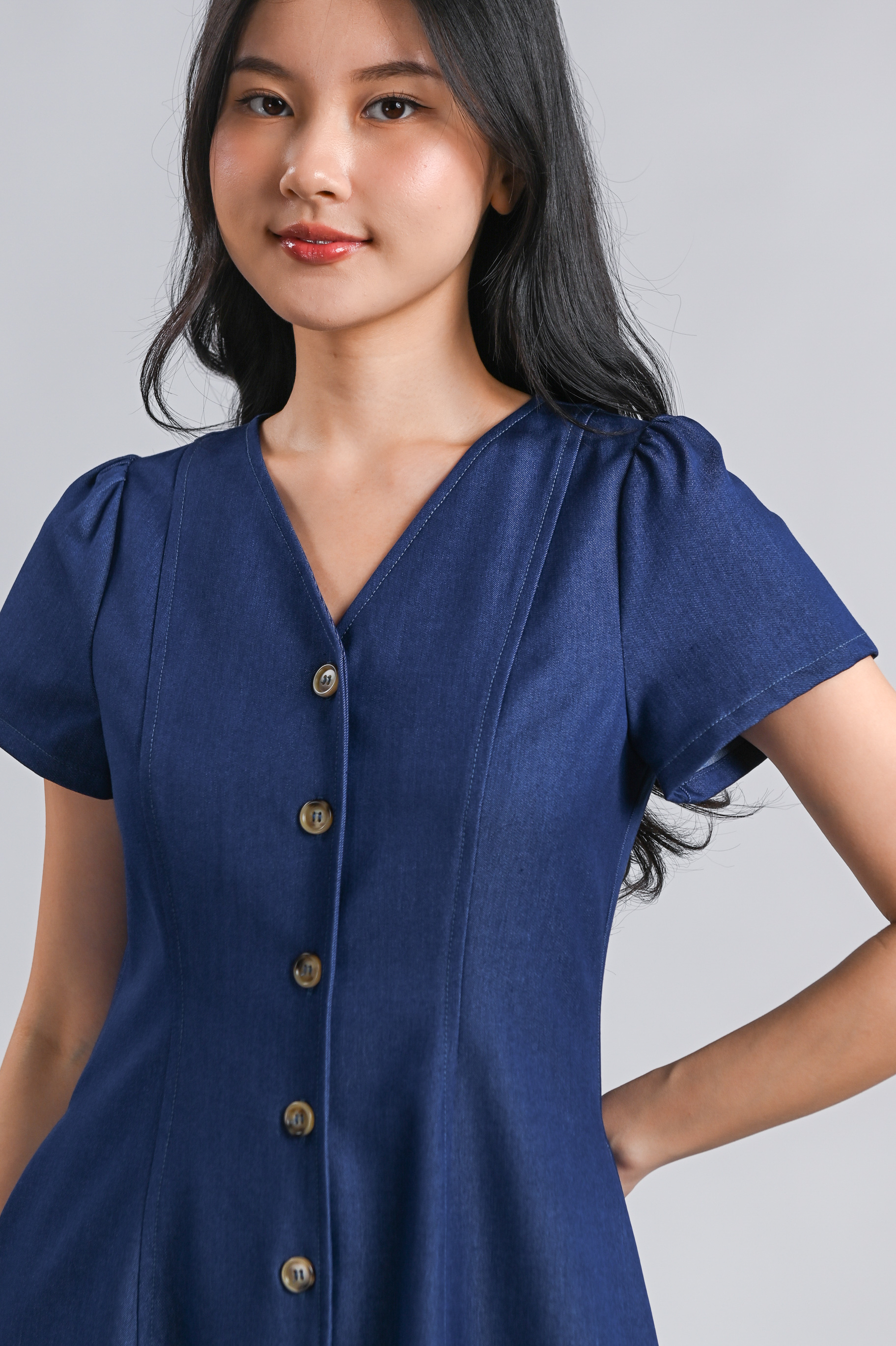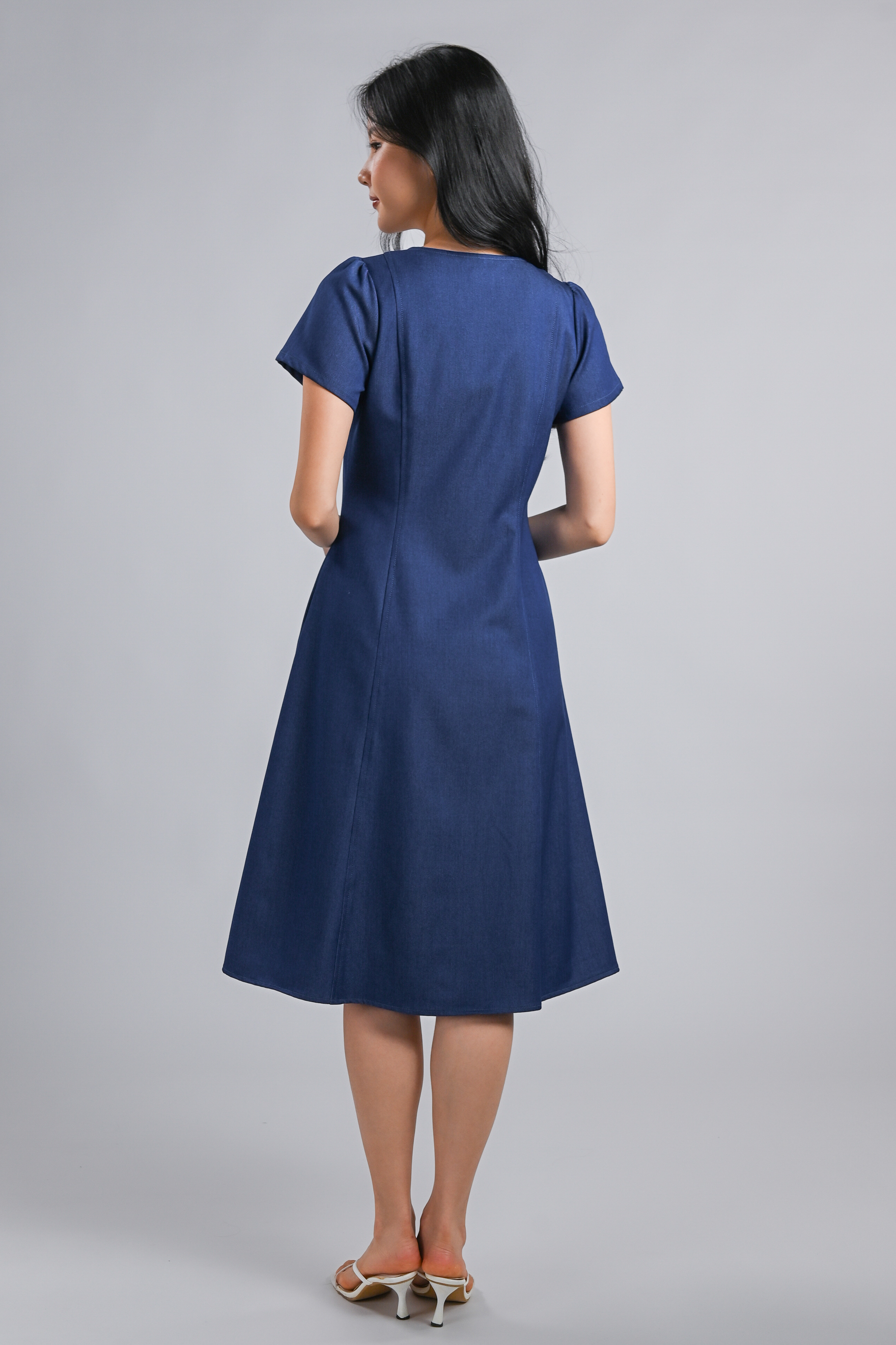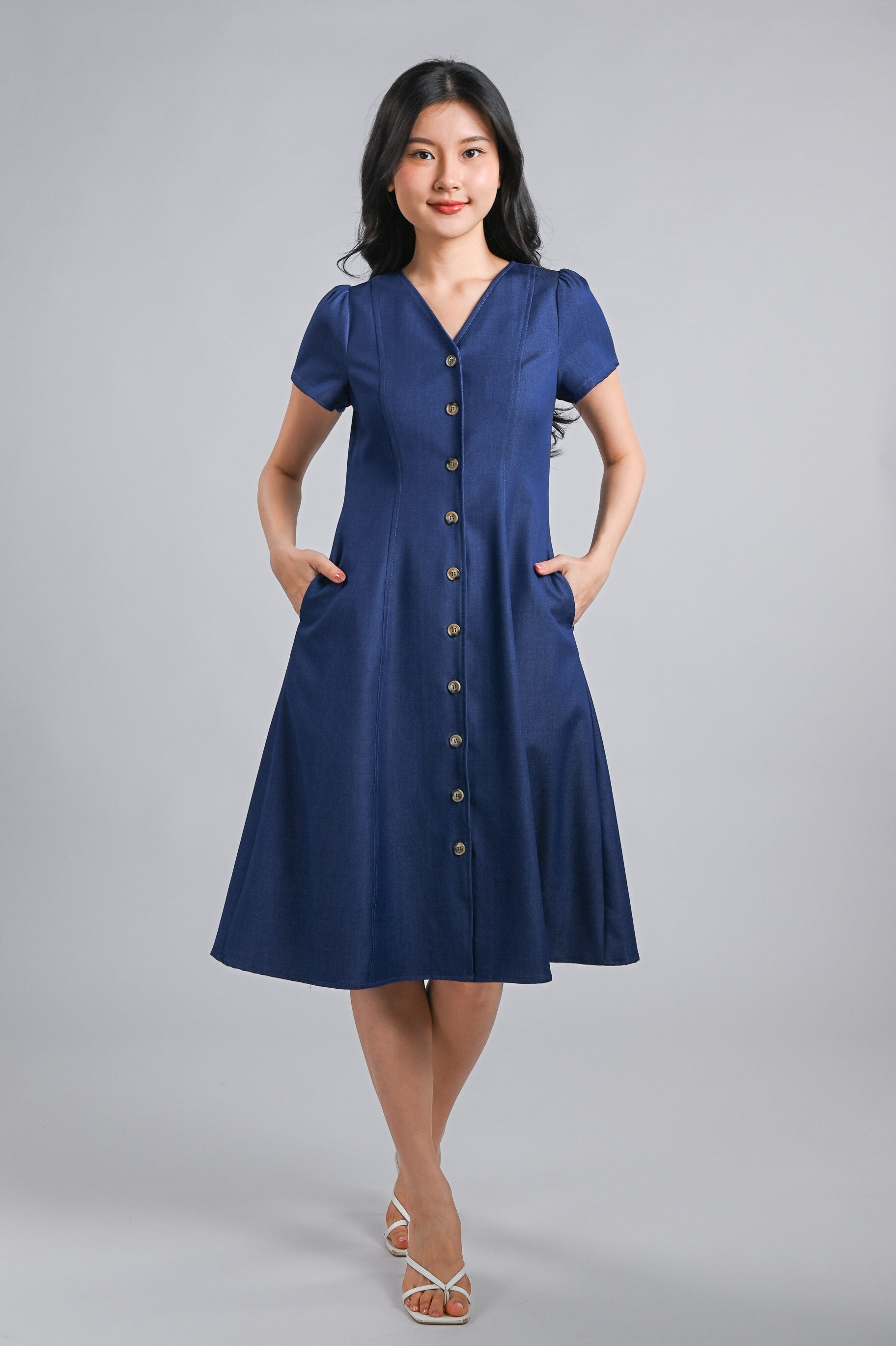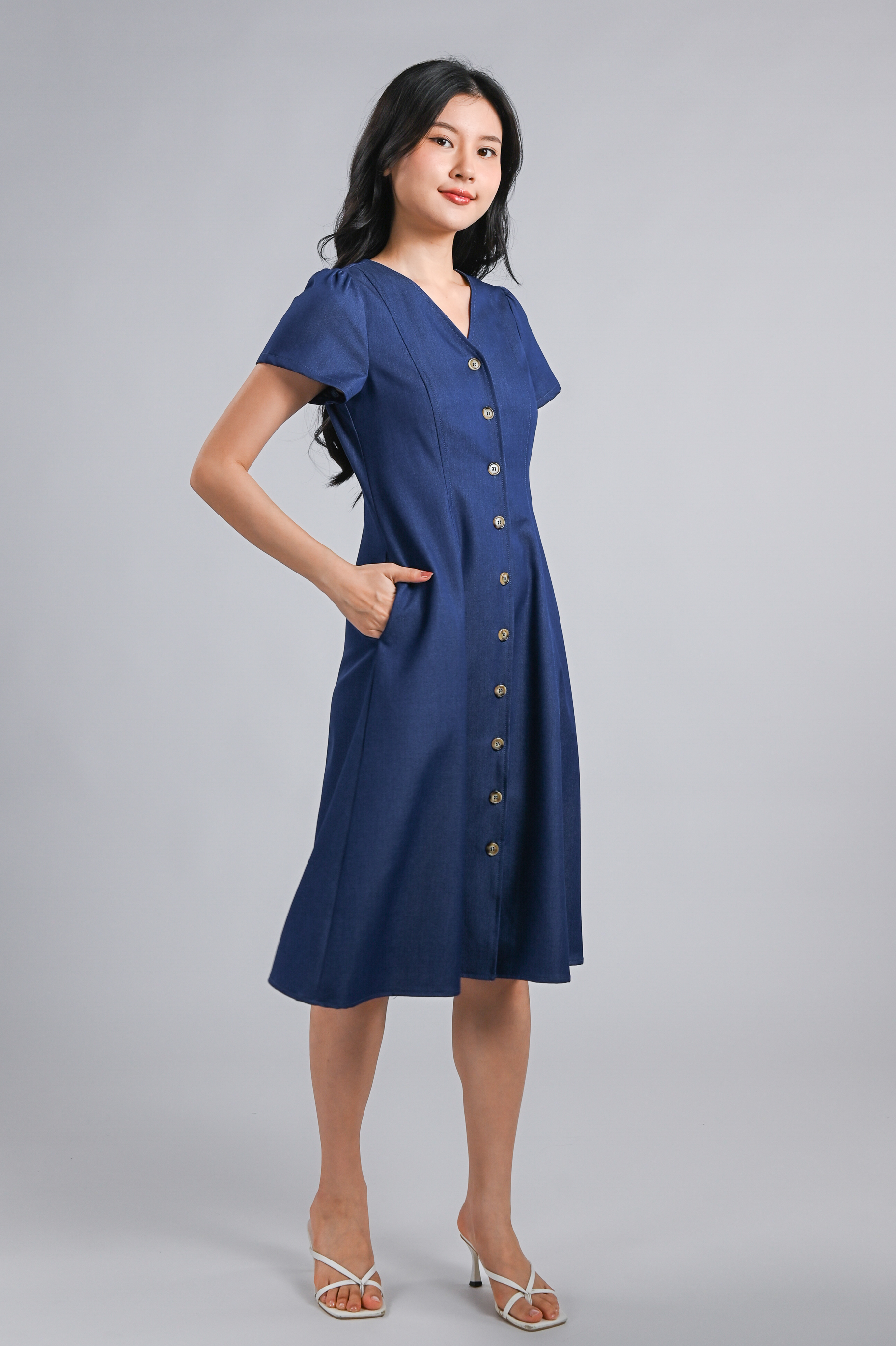 CLARISSA DENIM SLEEVED BUTTON-DOWN MIDI DRESS