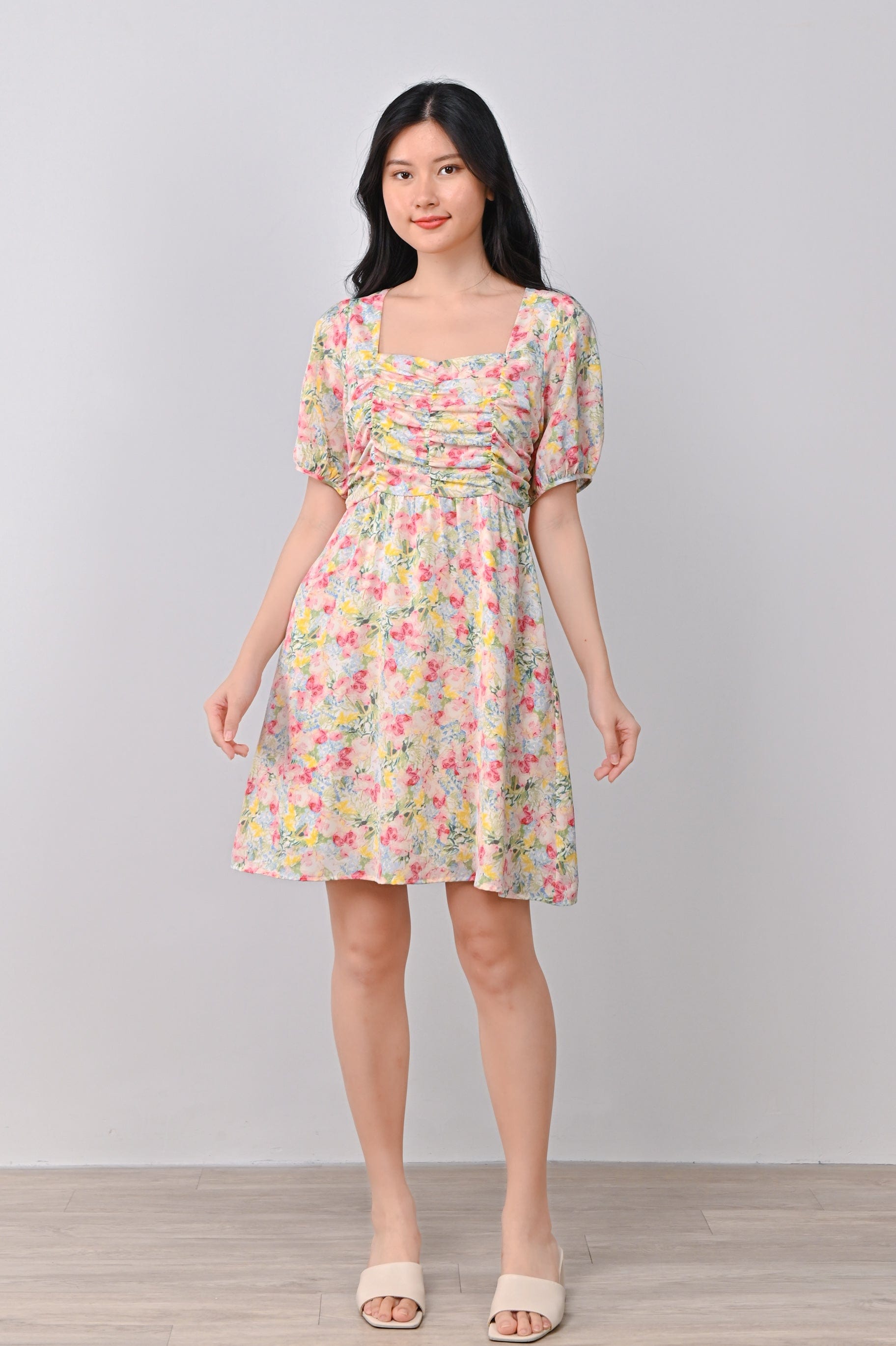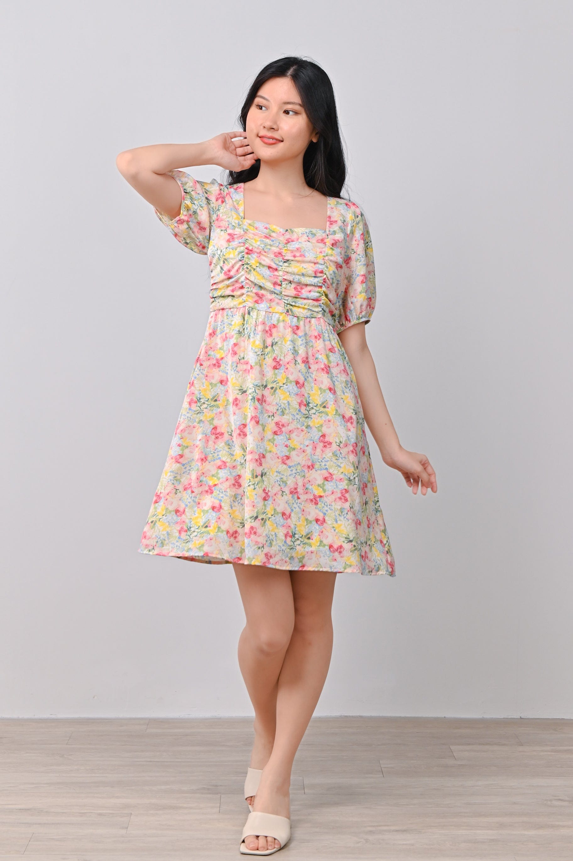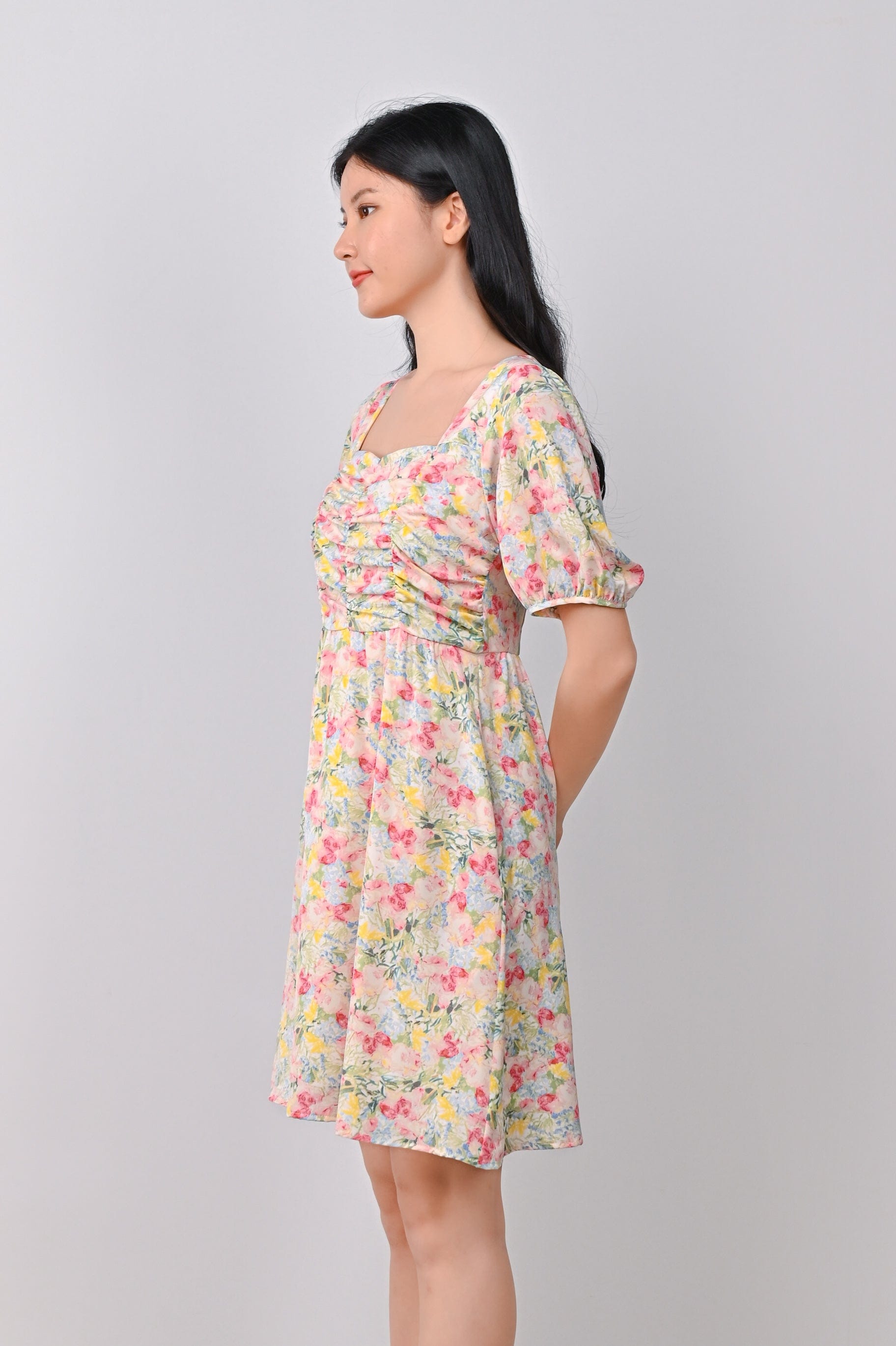 HEIDI FLORAL RUCHED DRESS IN PINK