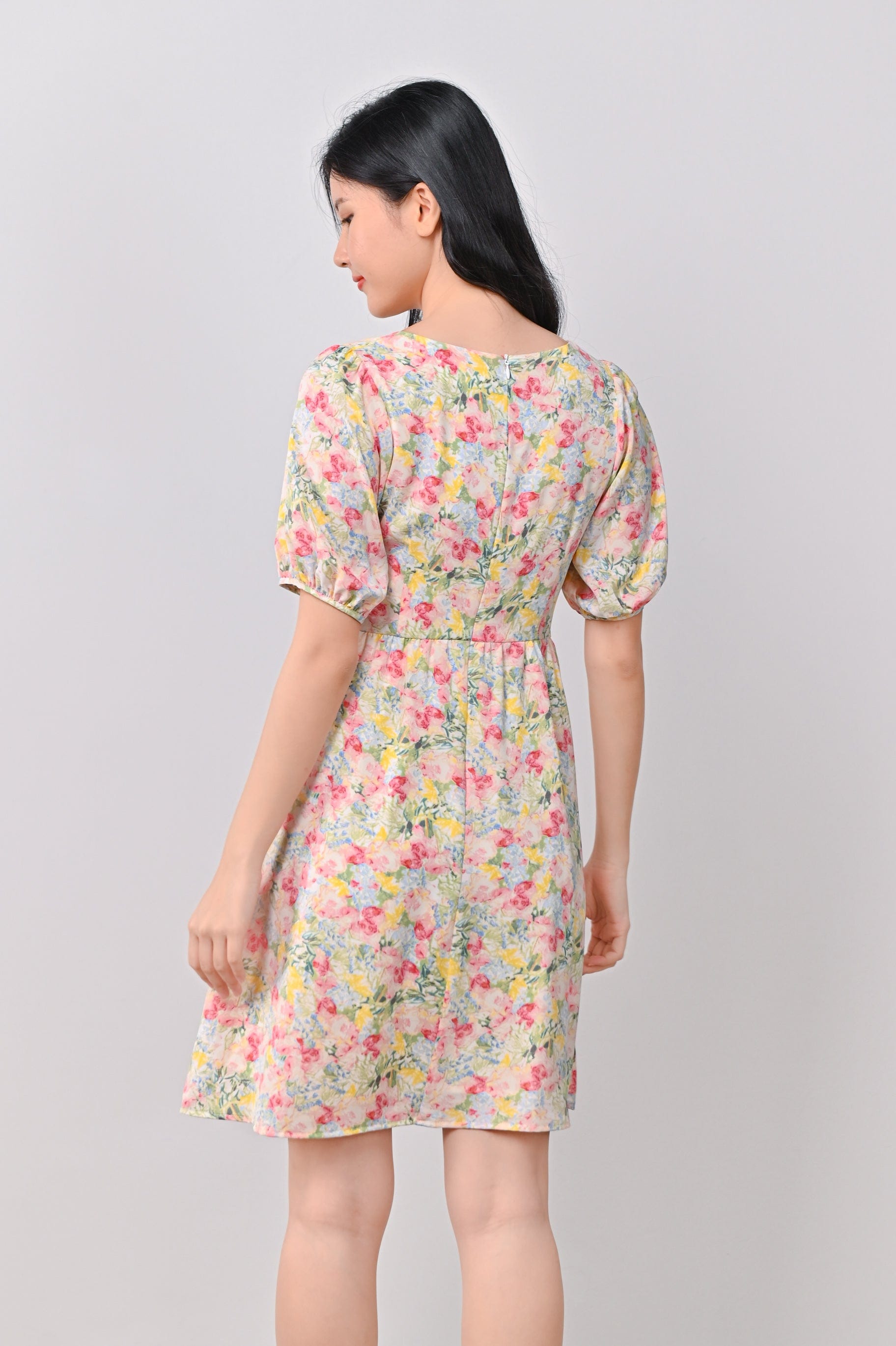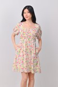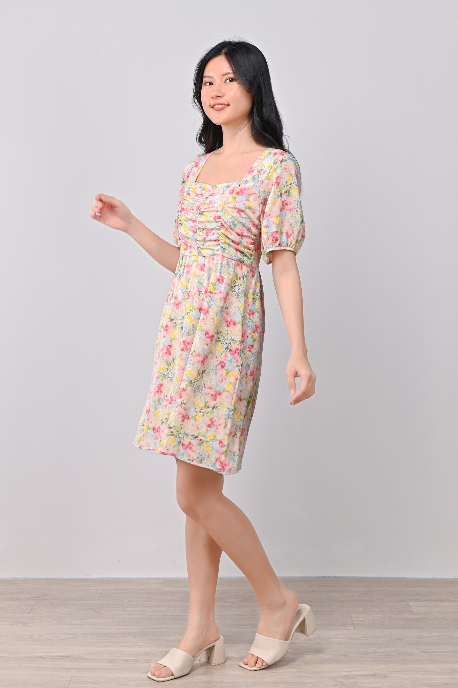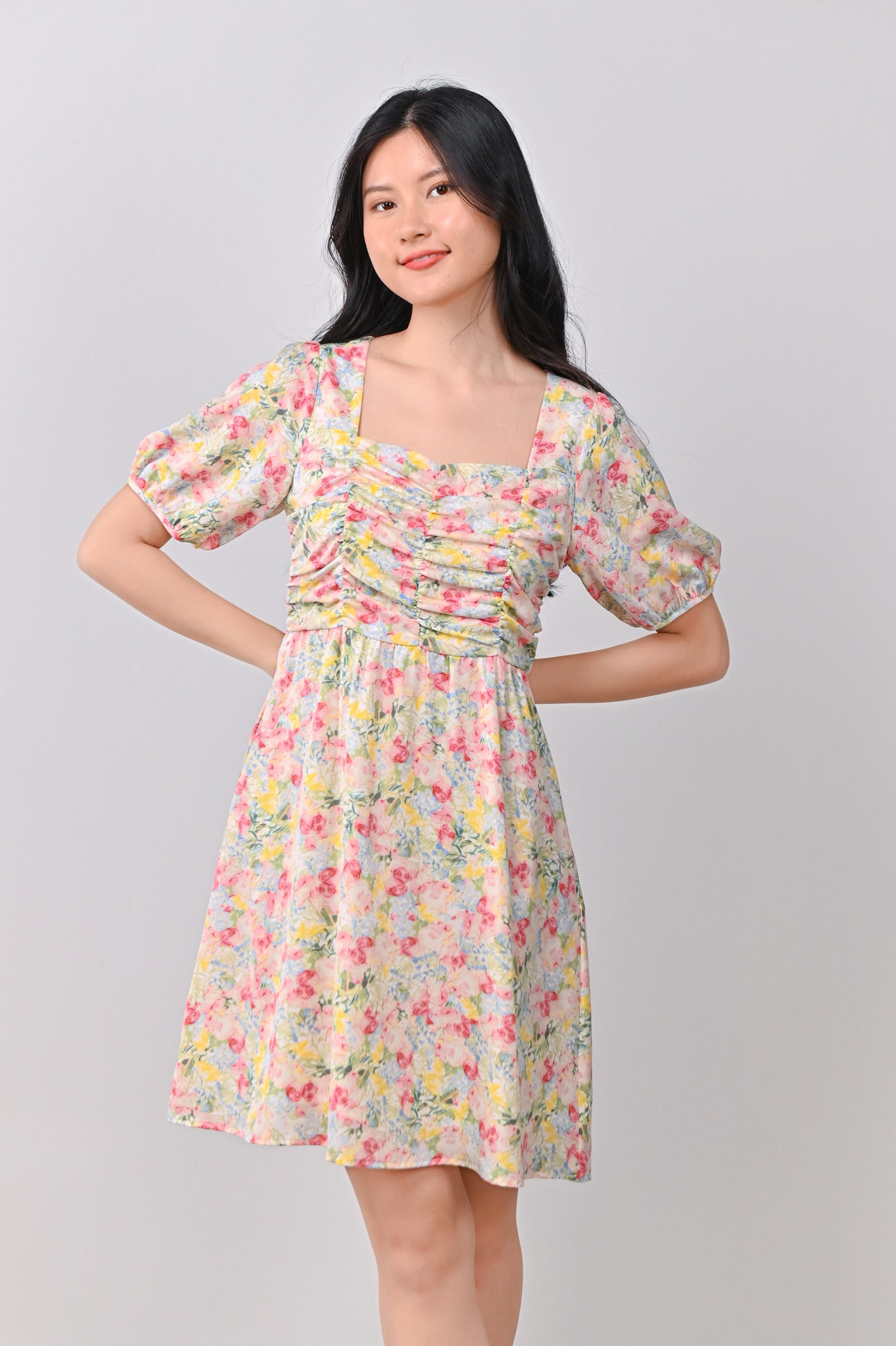 HEIDI FLORAL RUCHED DRESS IN PINK