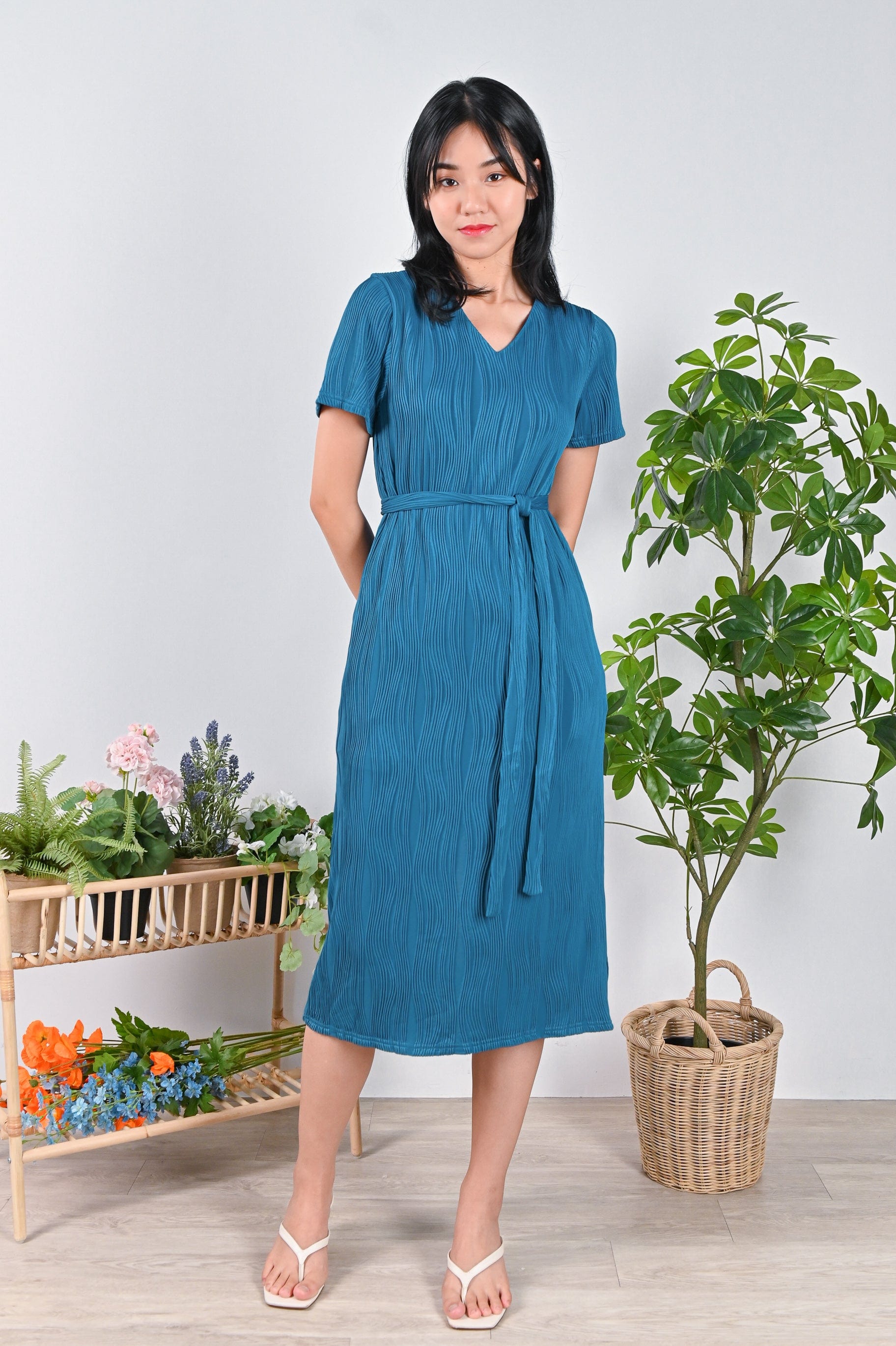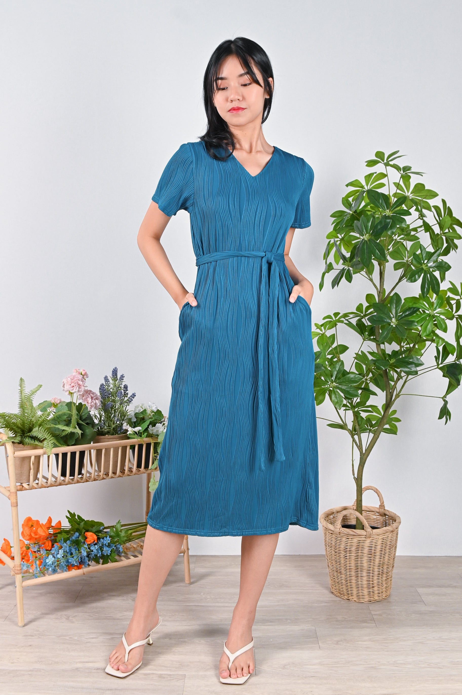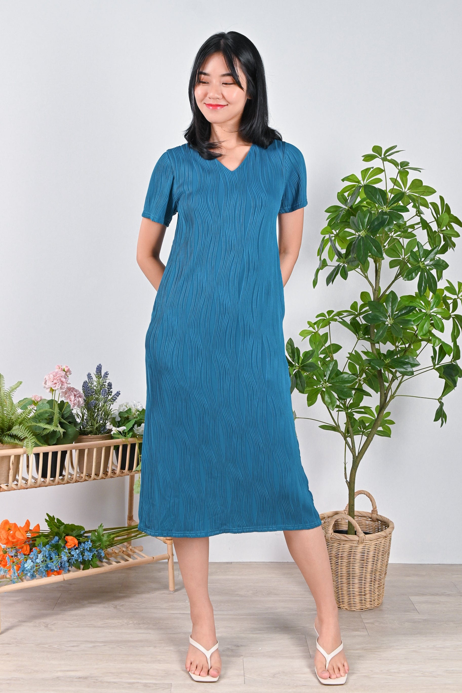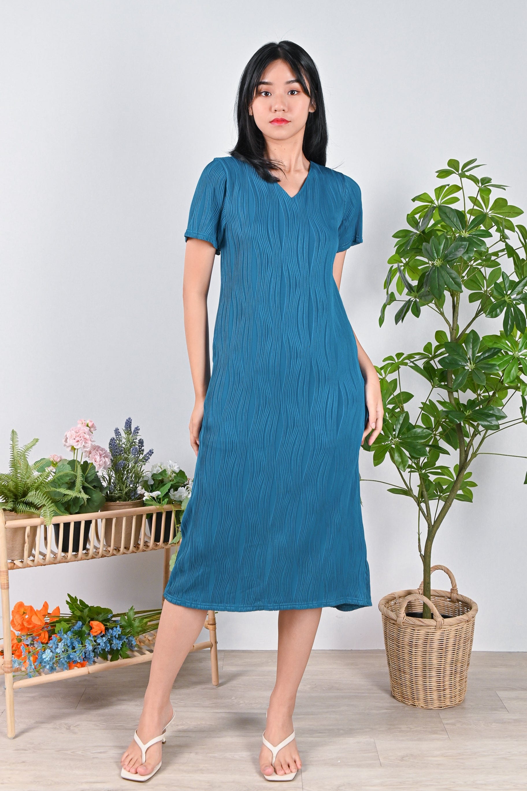 LOJA CURVED LINES SLEEVED DRESS IN TURQUOISE