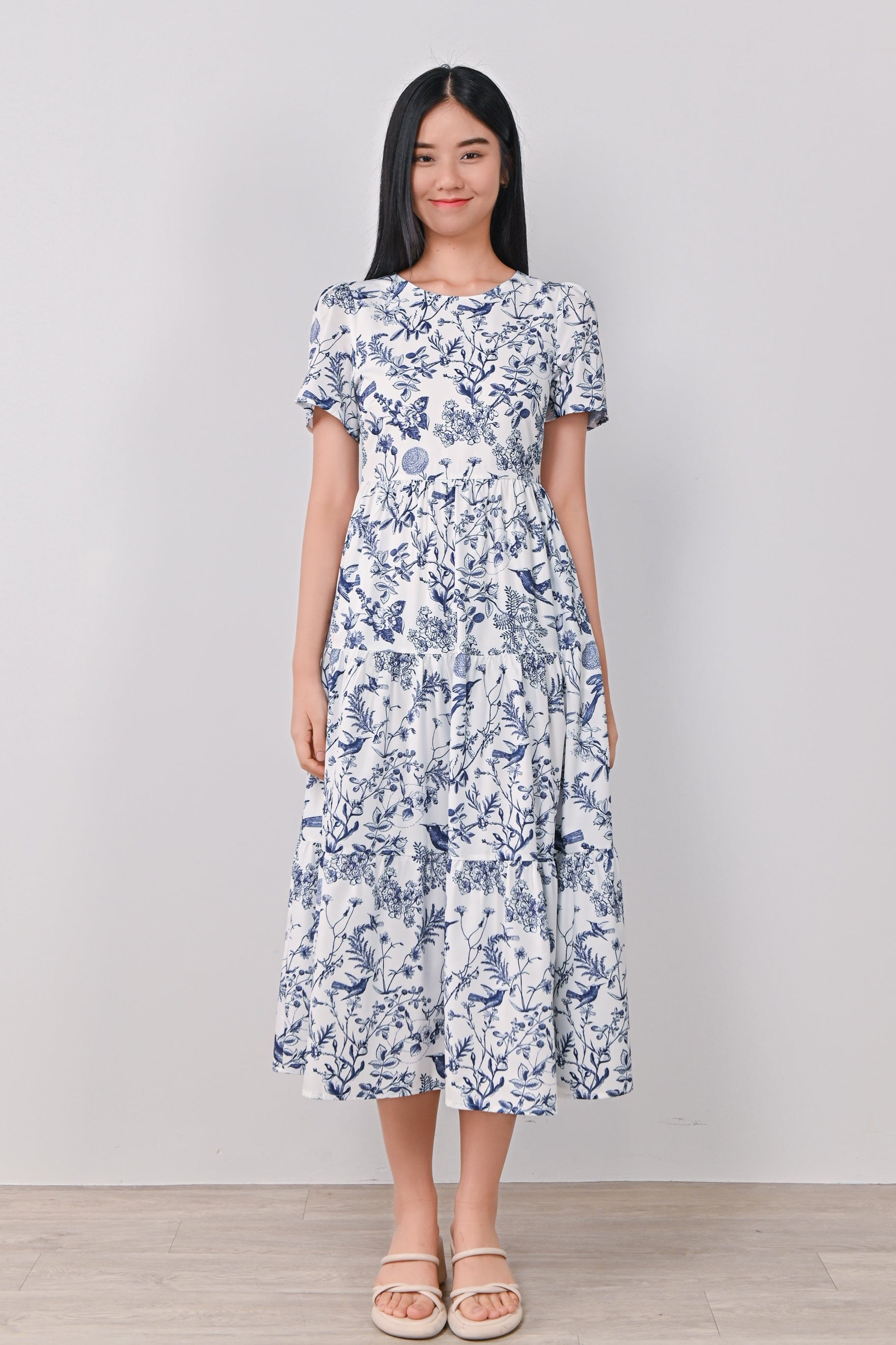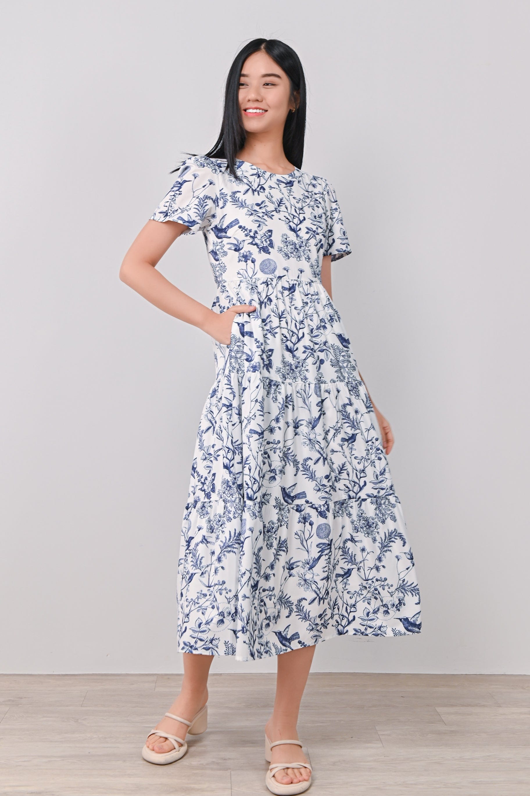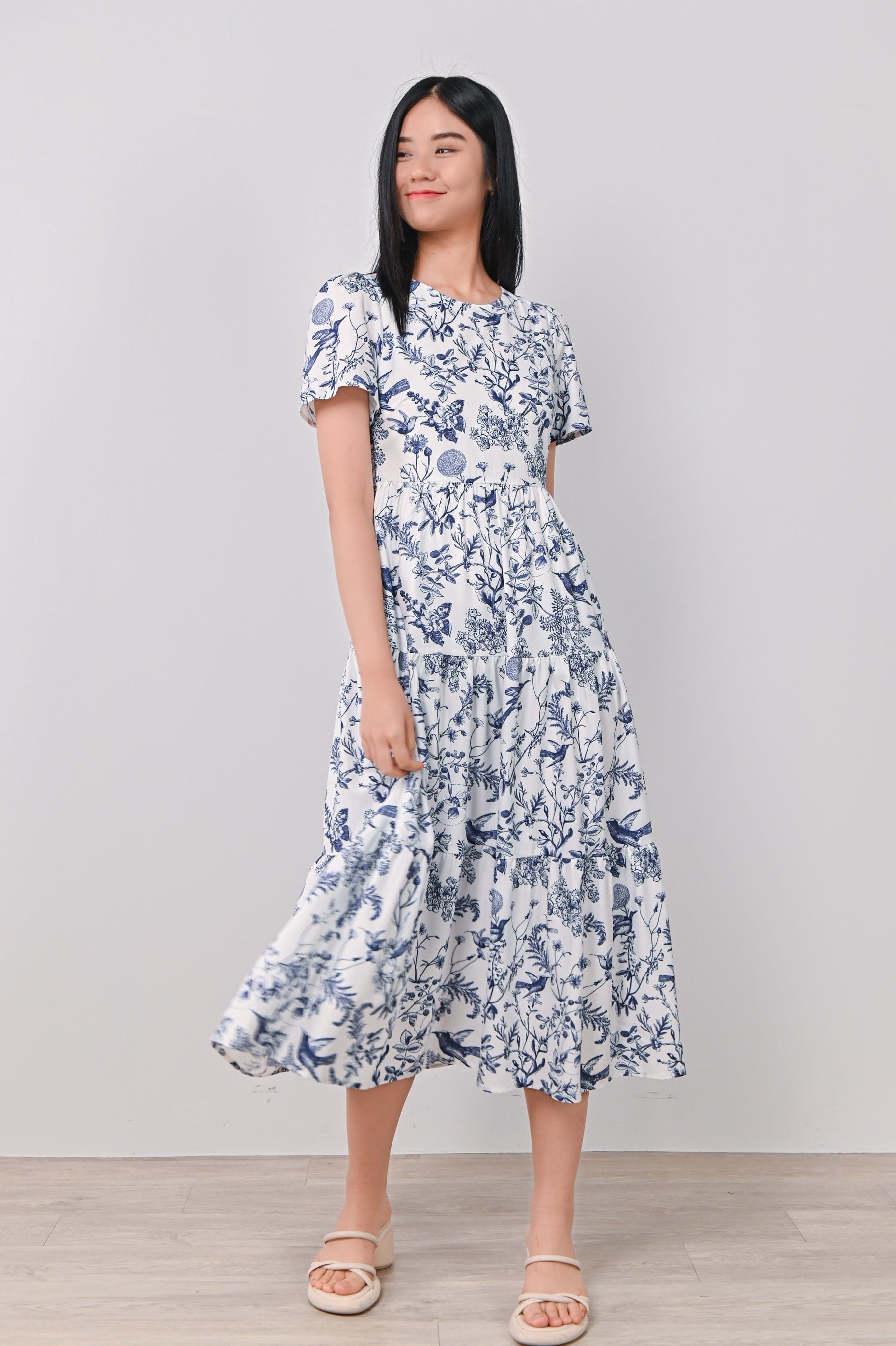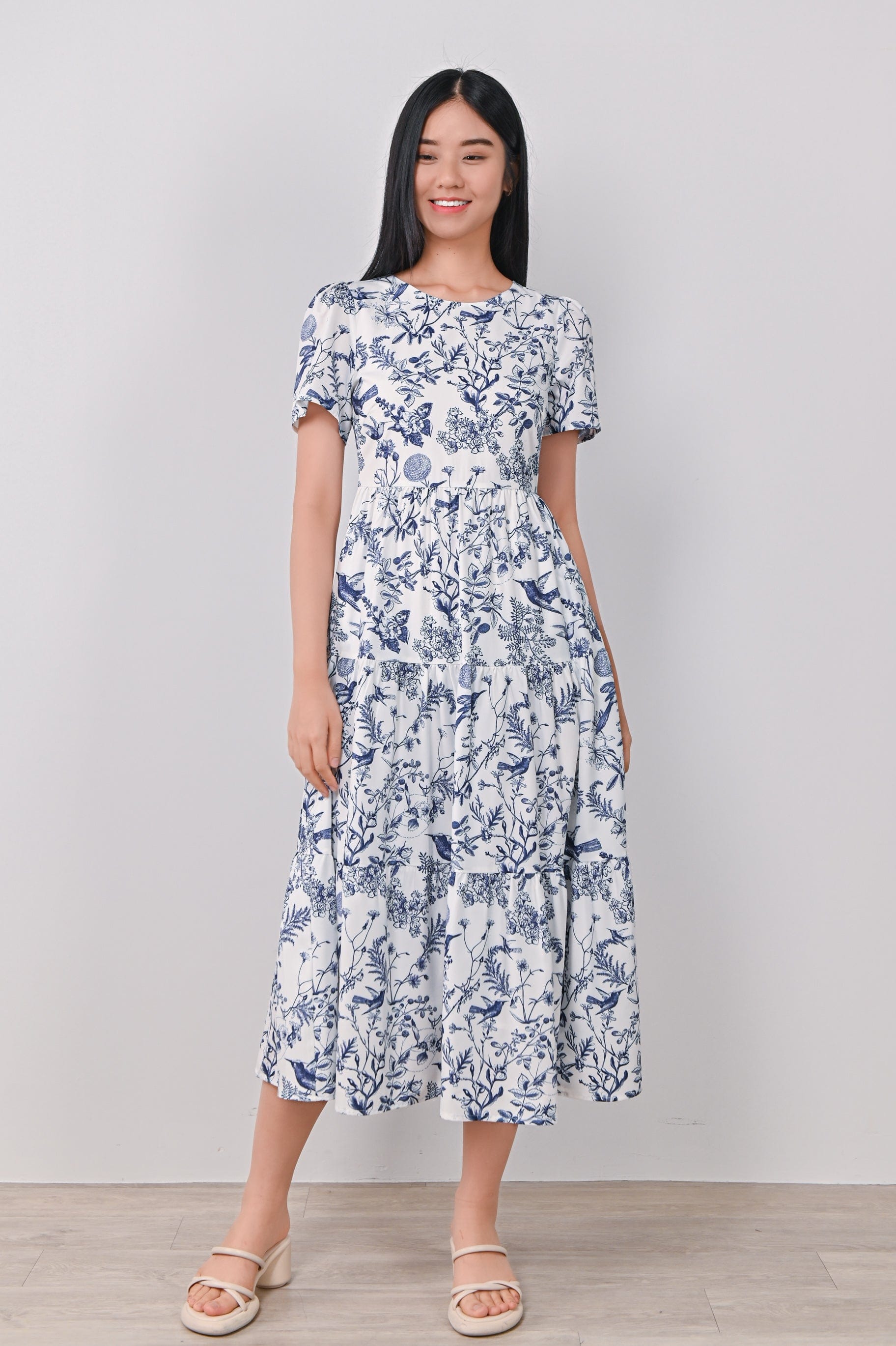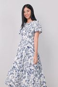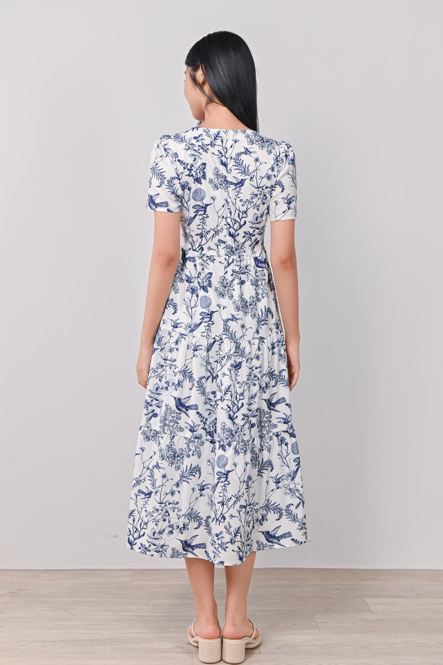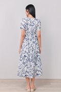 NAVY HUMMINGBIRD TIERED MIDAXI DRESS