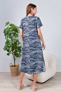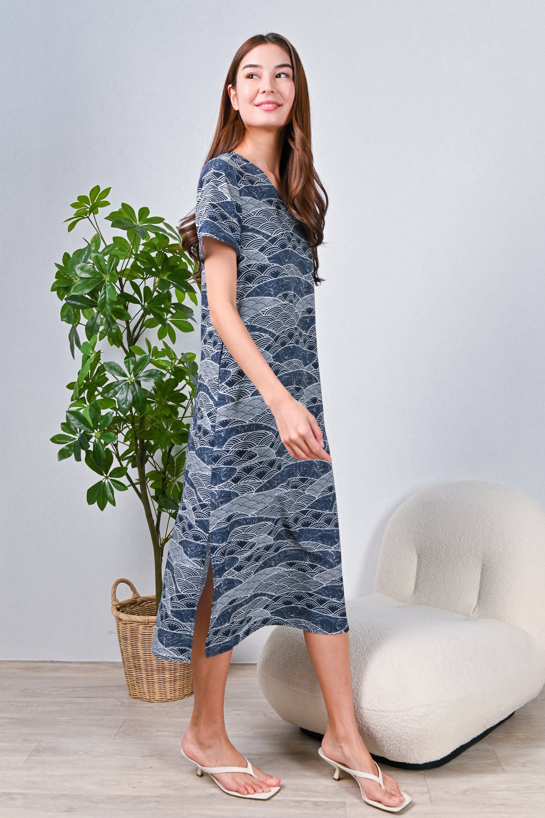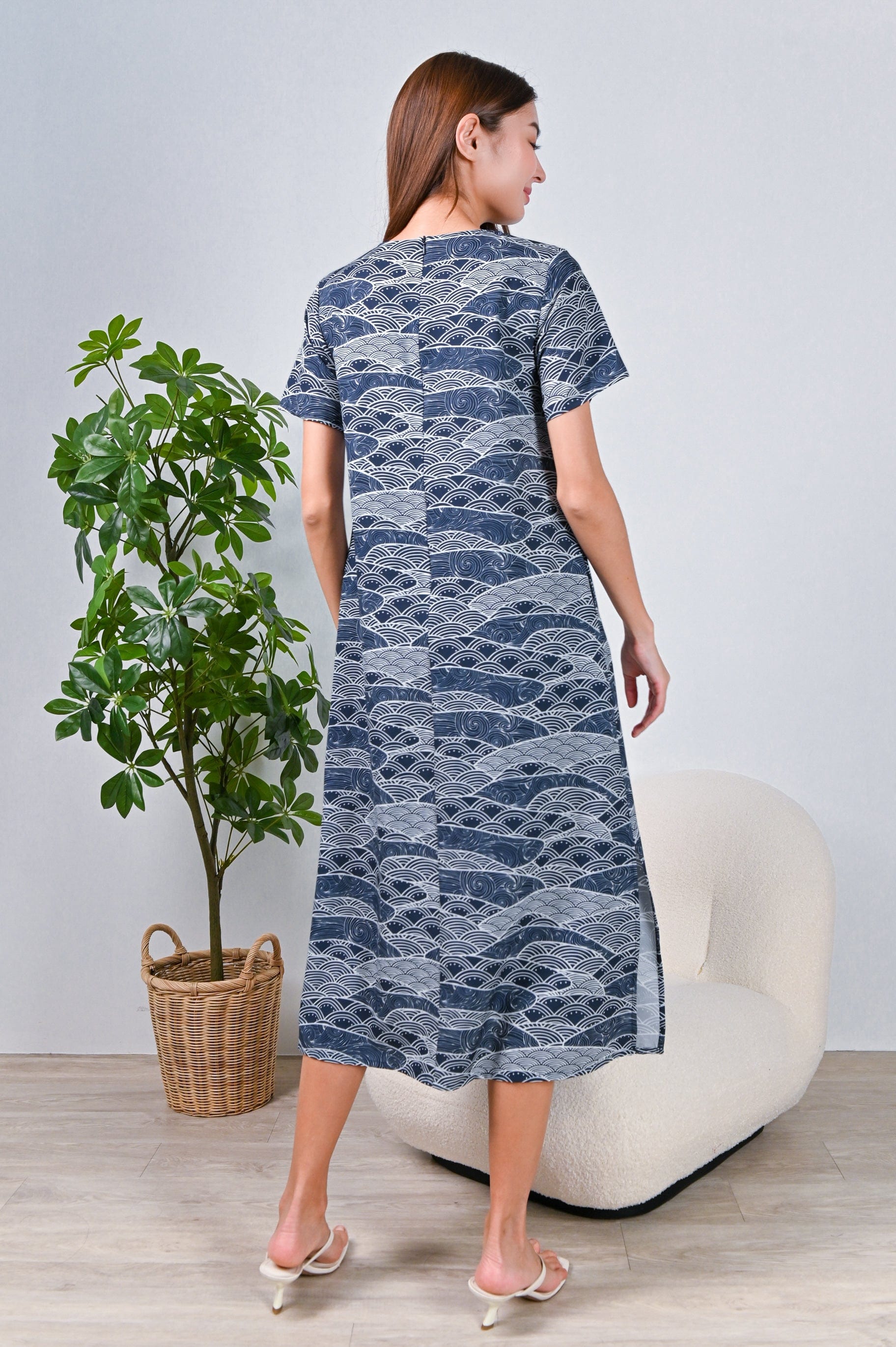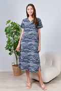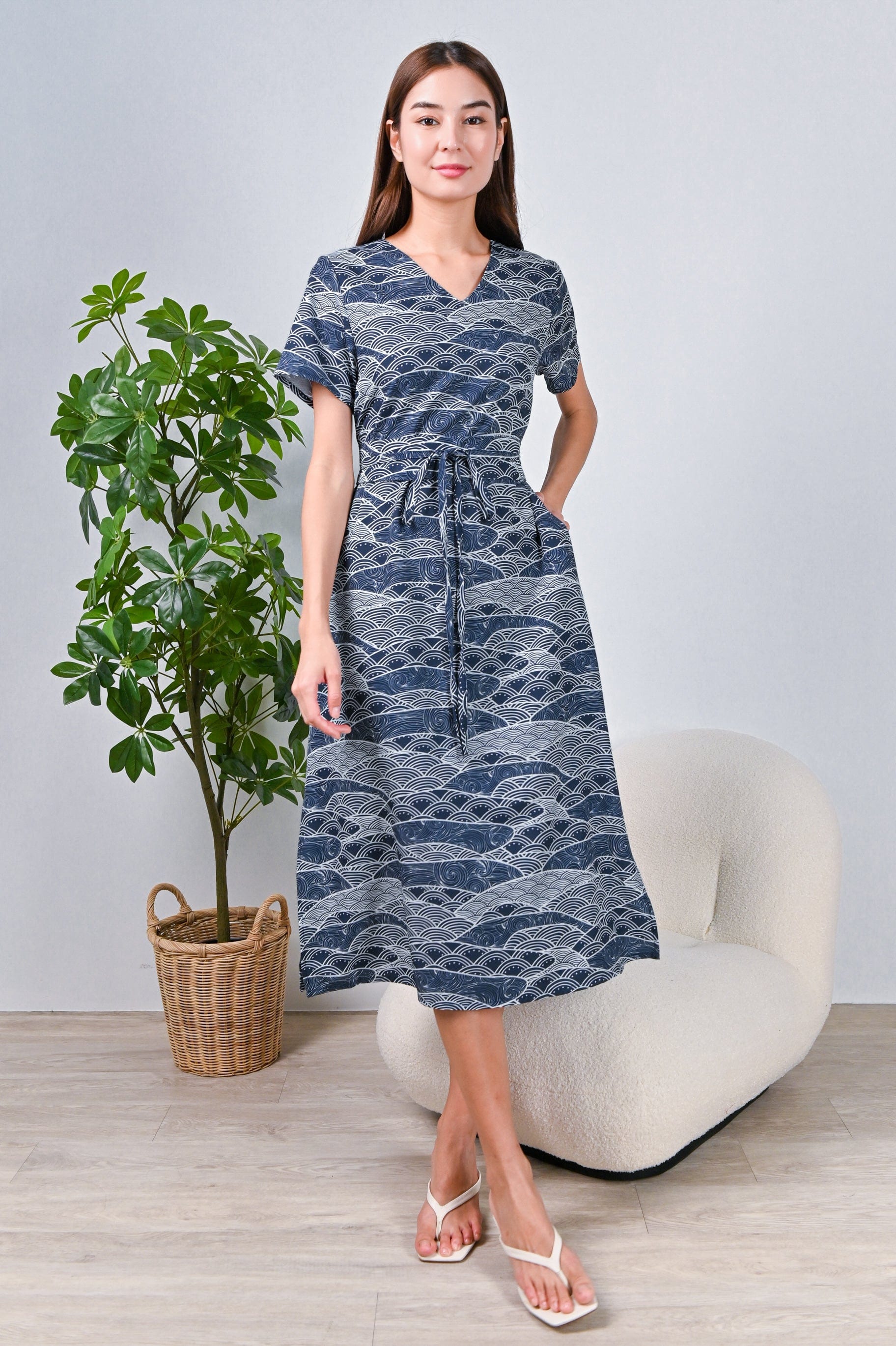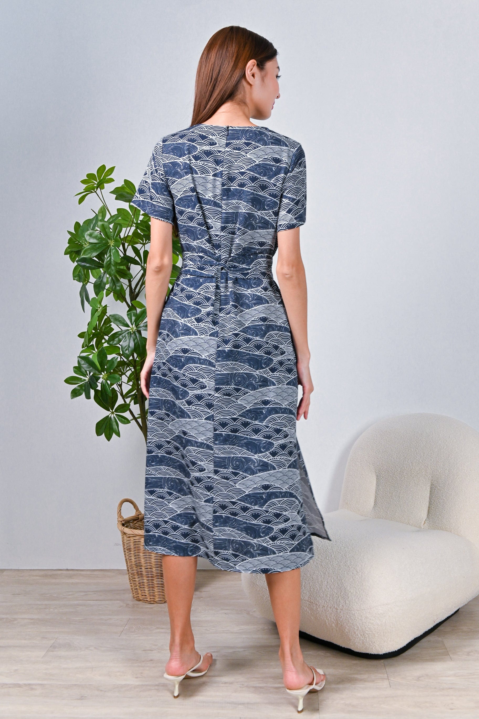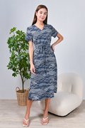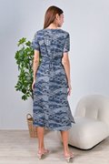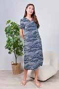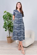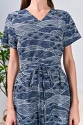 NAVY WAVE COLLAGE SLEEVED OBI-SASH DRESS