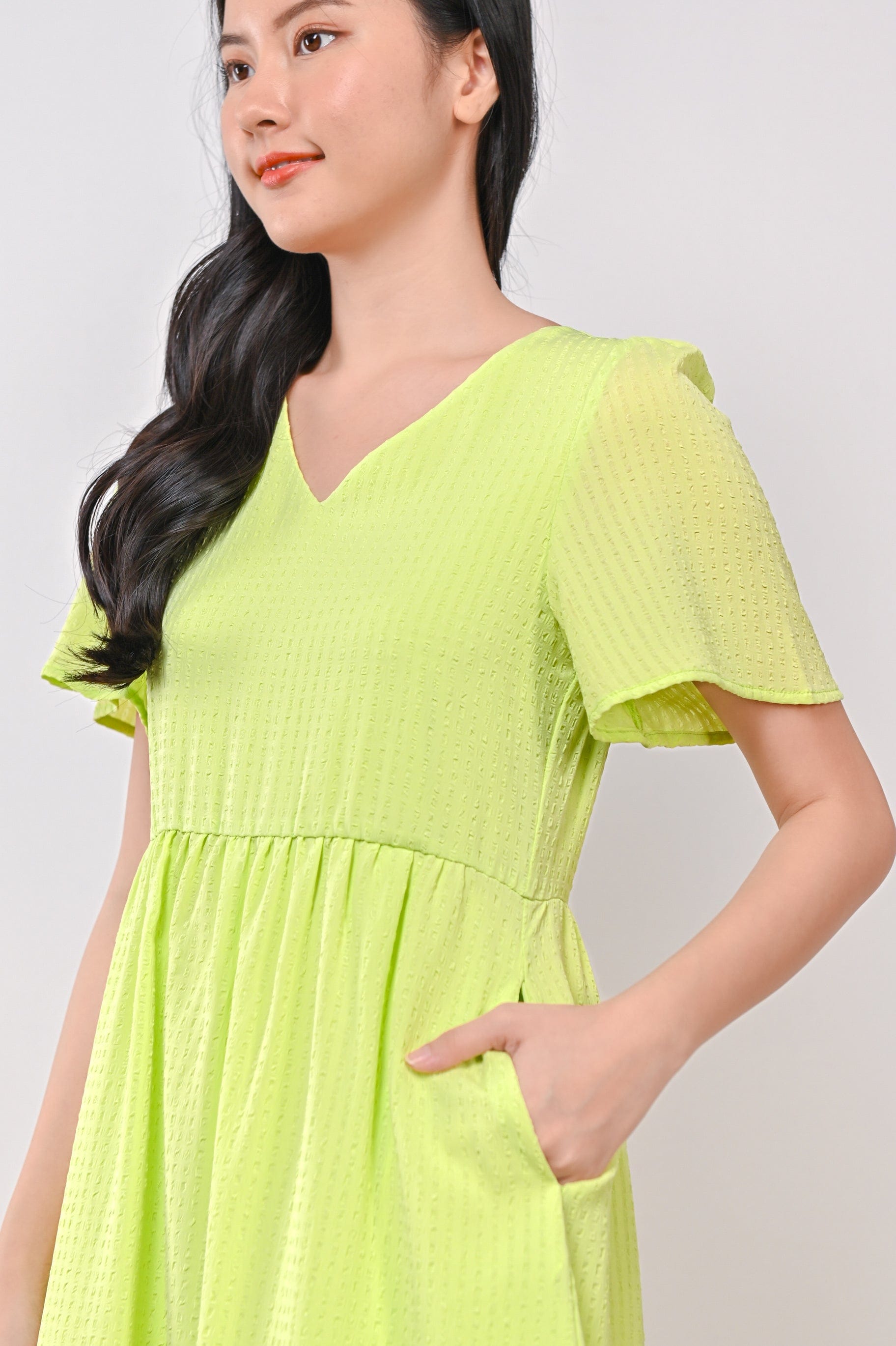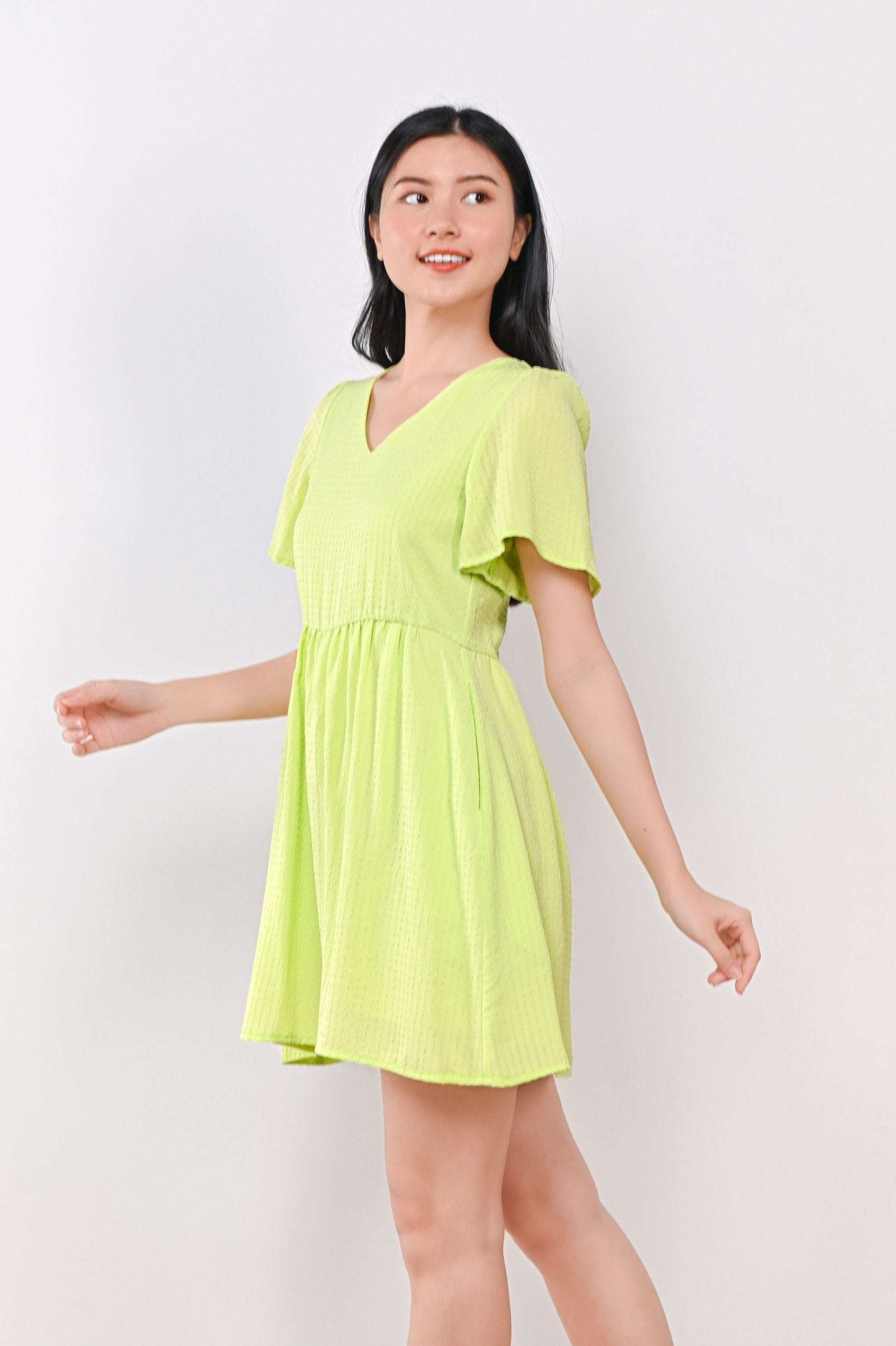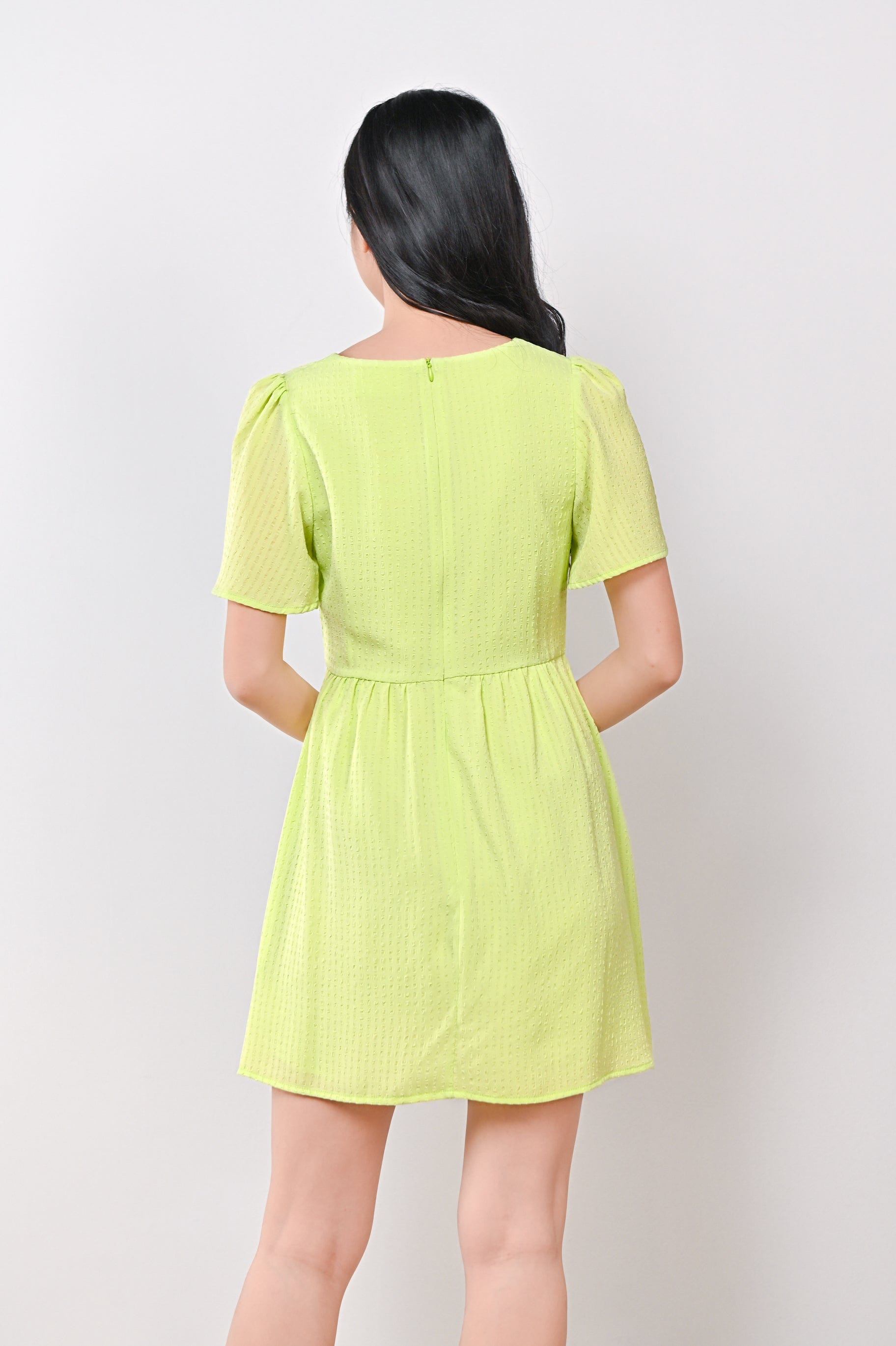 AMBER TEXTURED DRESS-ROMPER IN LIME GREEN