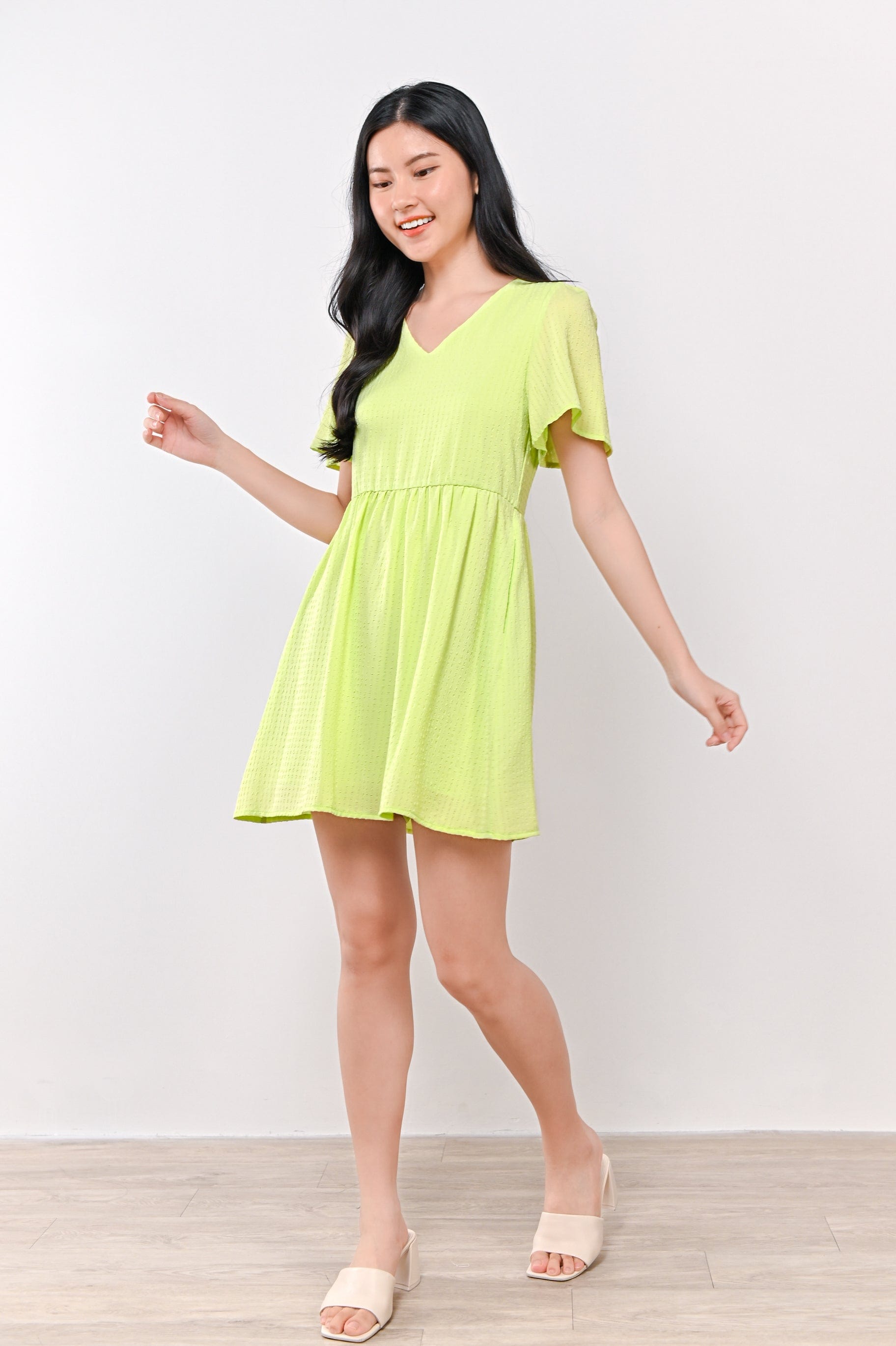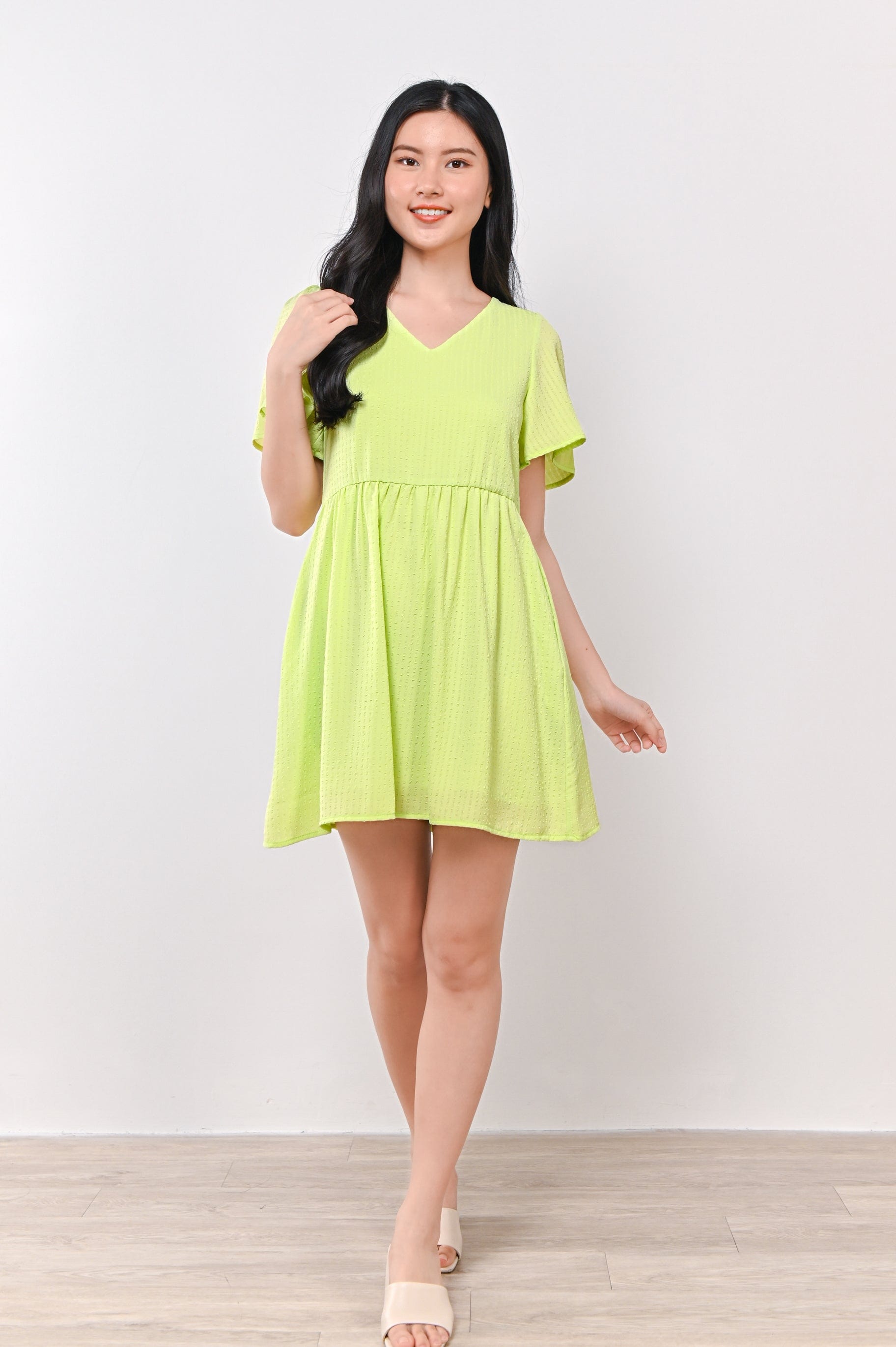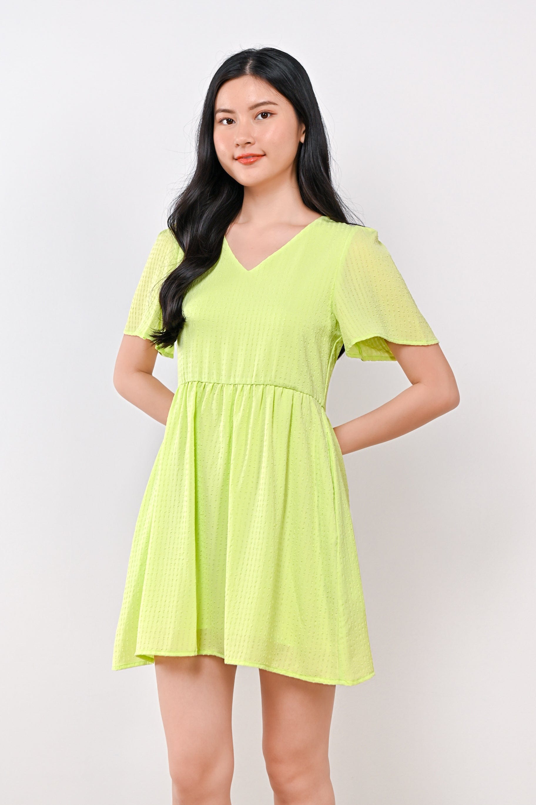 AMBER TEXTURED DRESS-ROMPER IN LIME GREEN