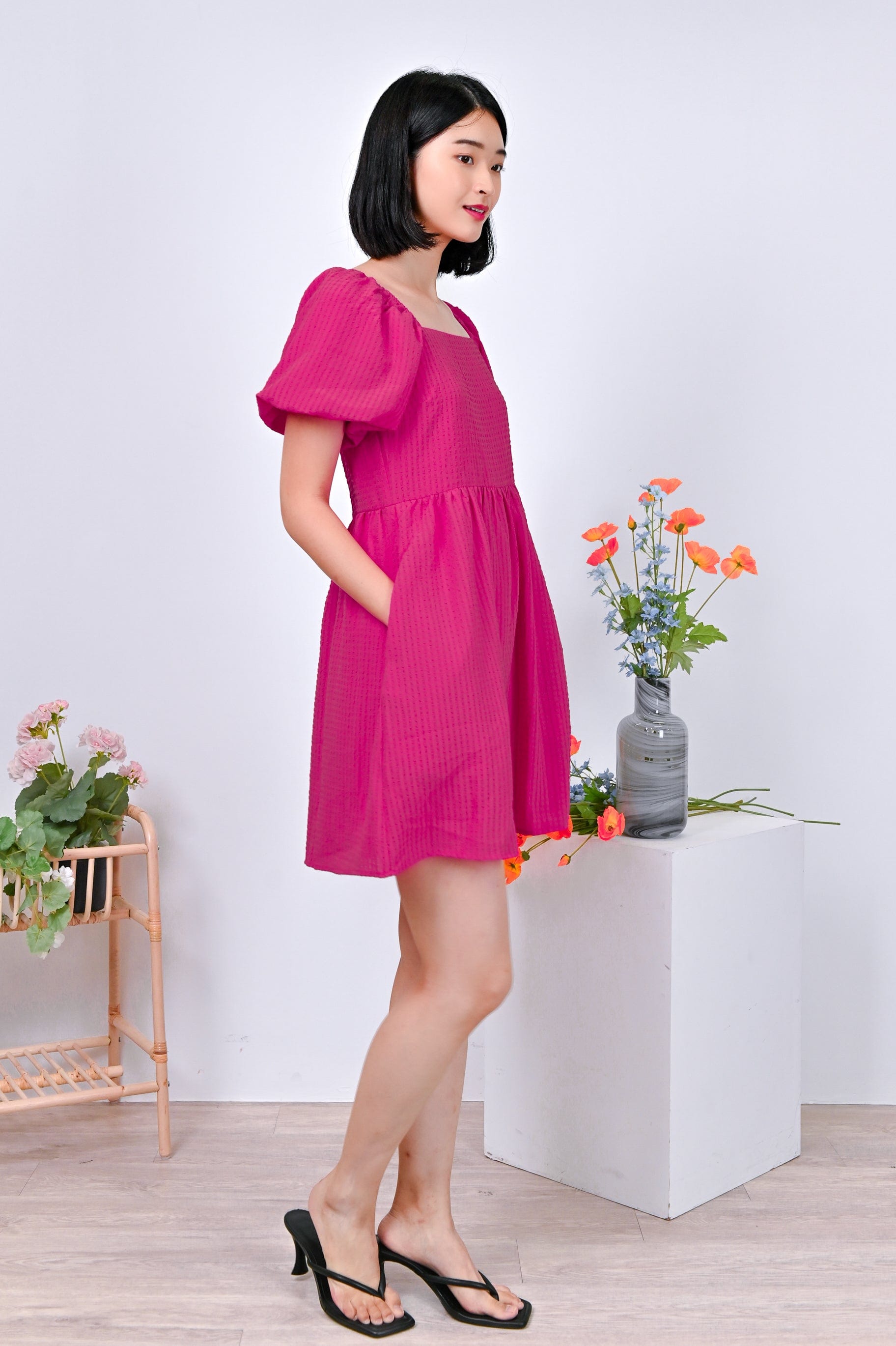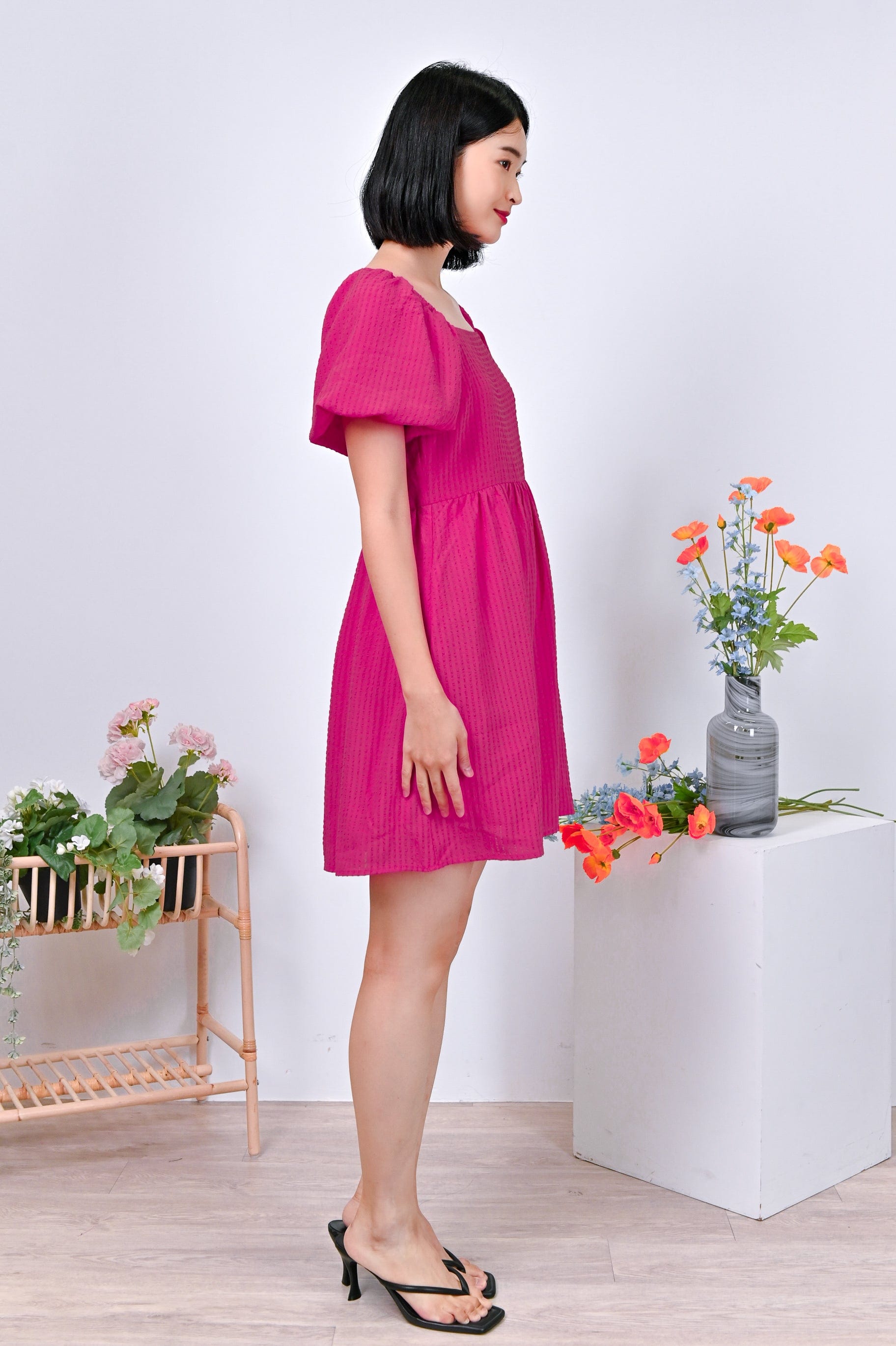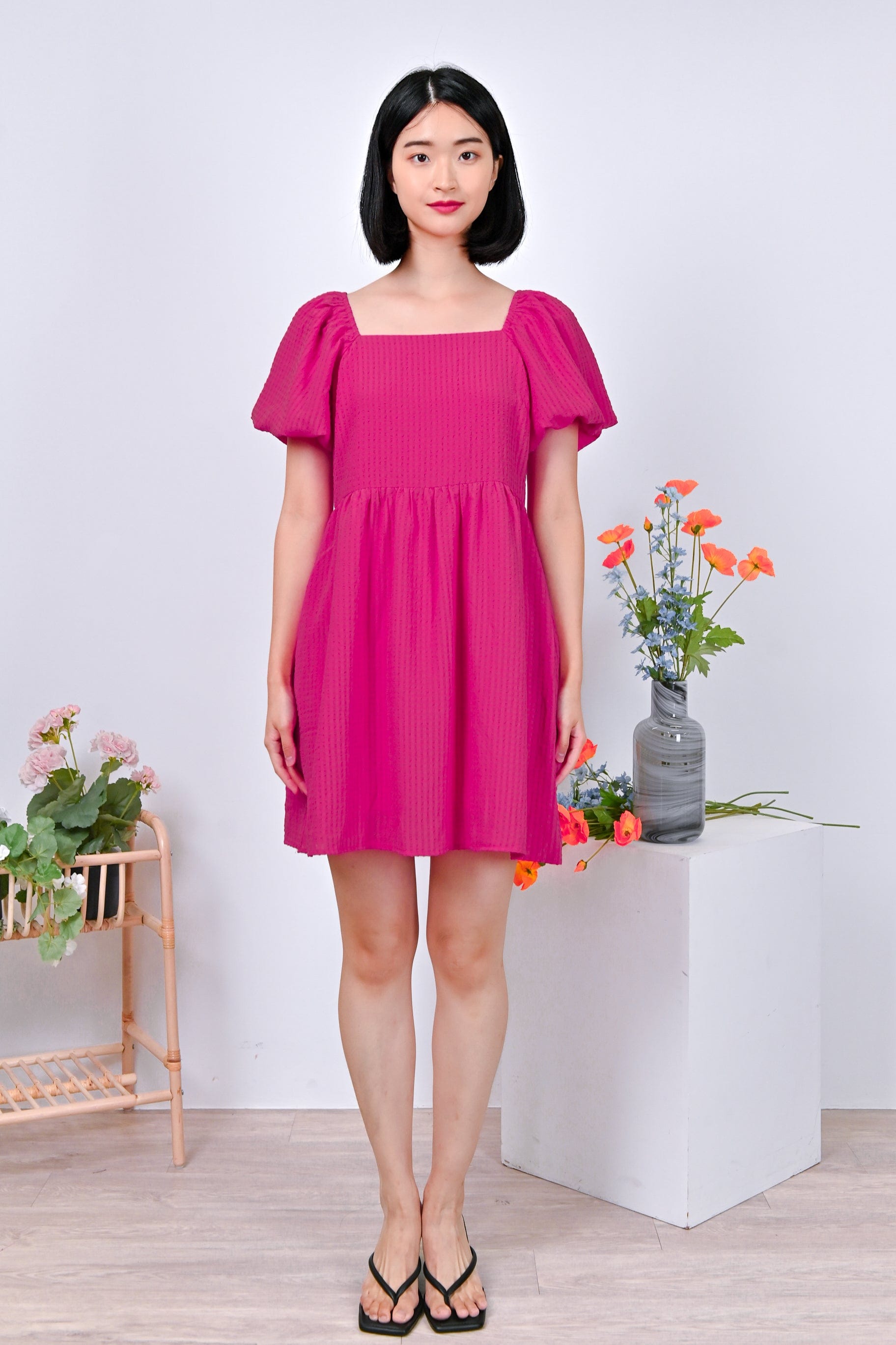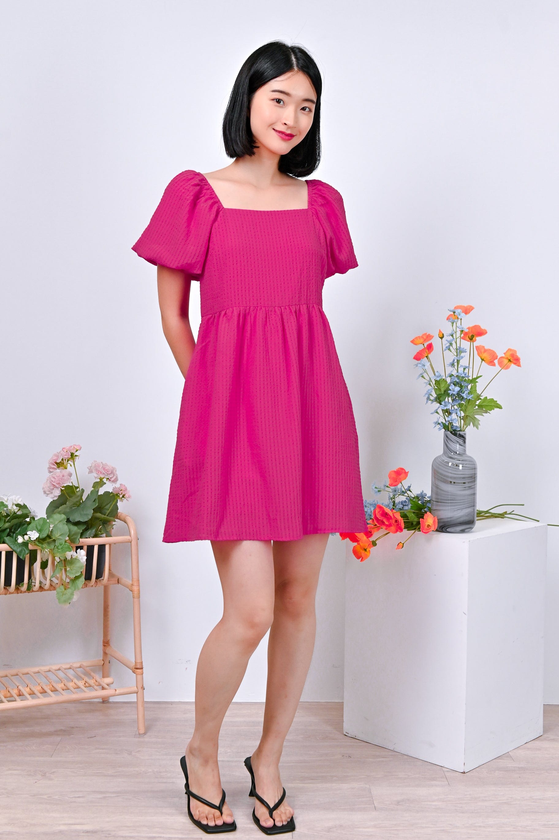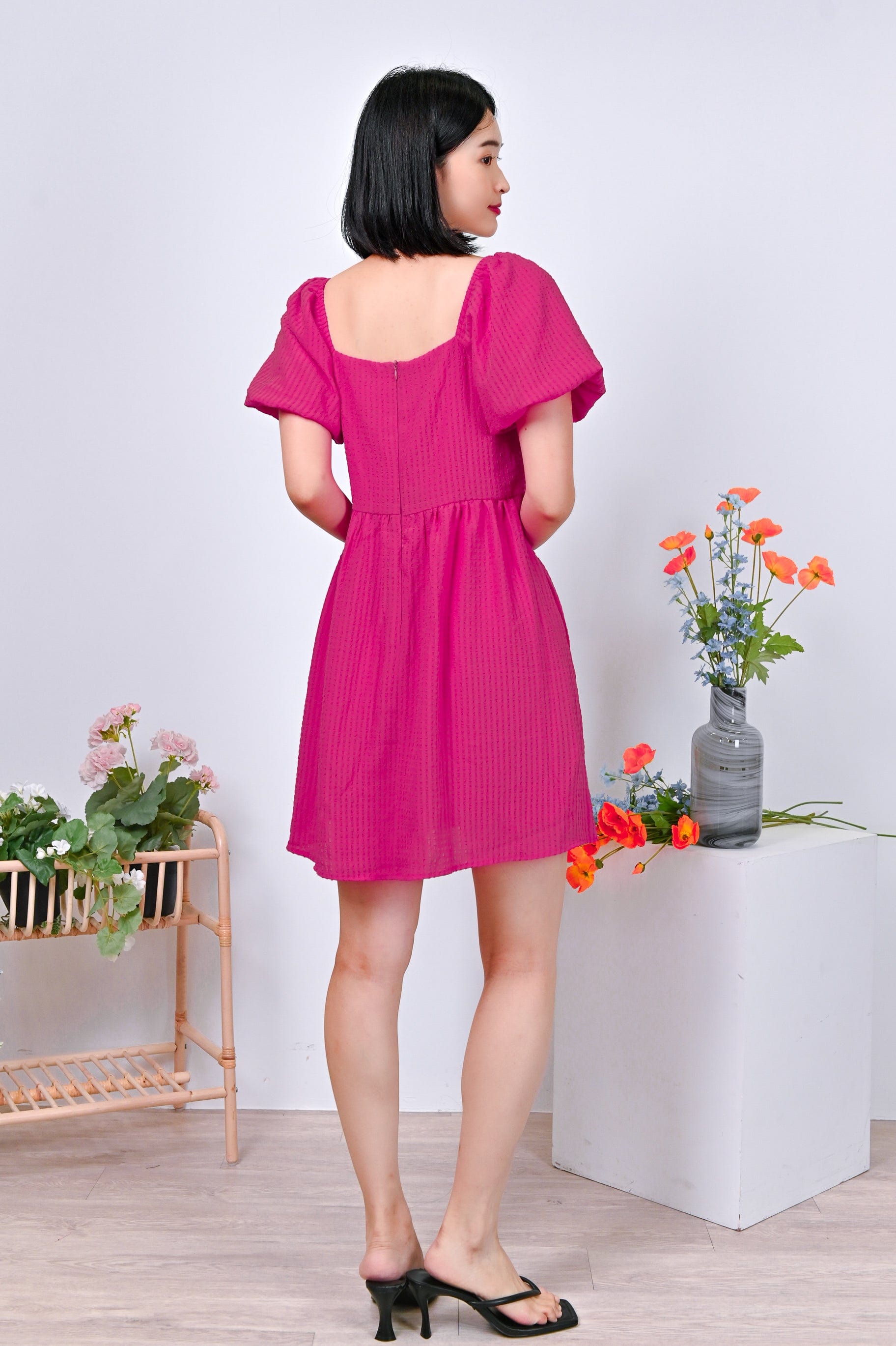 Actual stocks may varyPuff-sleeves on a dress-romper cut in the prettiest textured fabric? Sold to the lady with the most exquisite taste! Get your hands on our Estrella Dress-Romper before its gone! 🤪