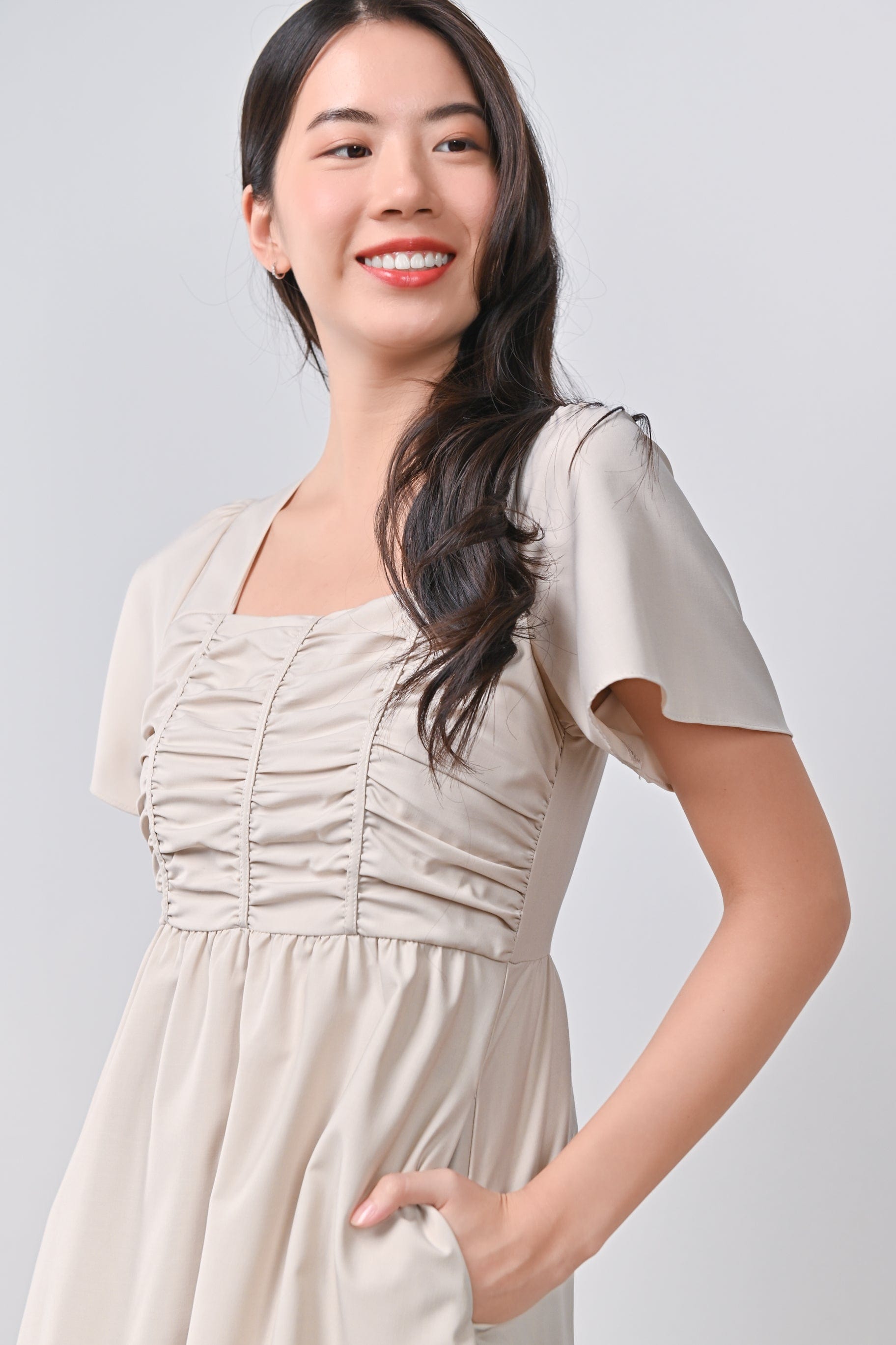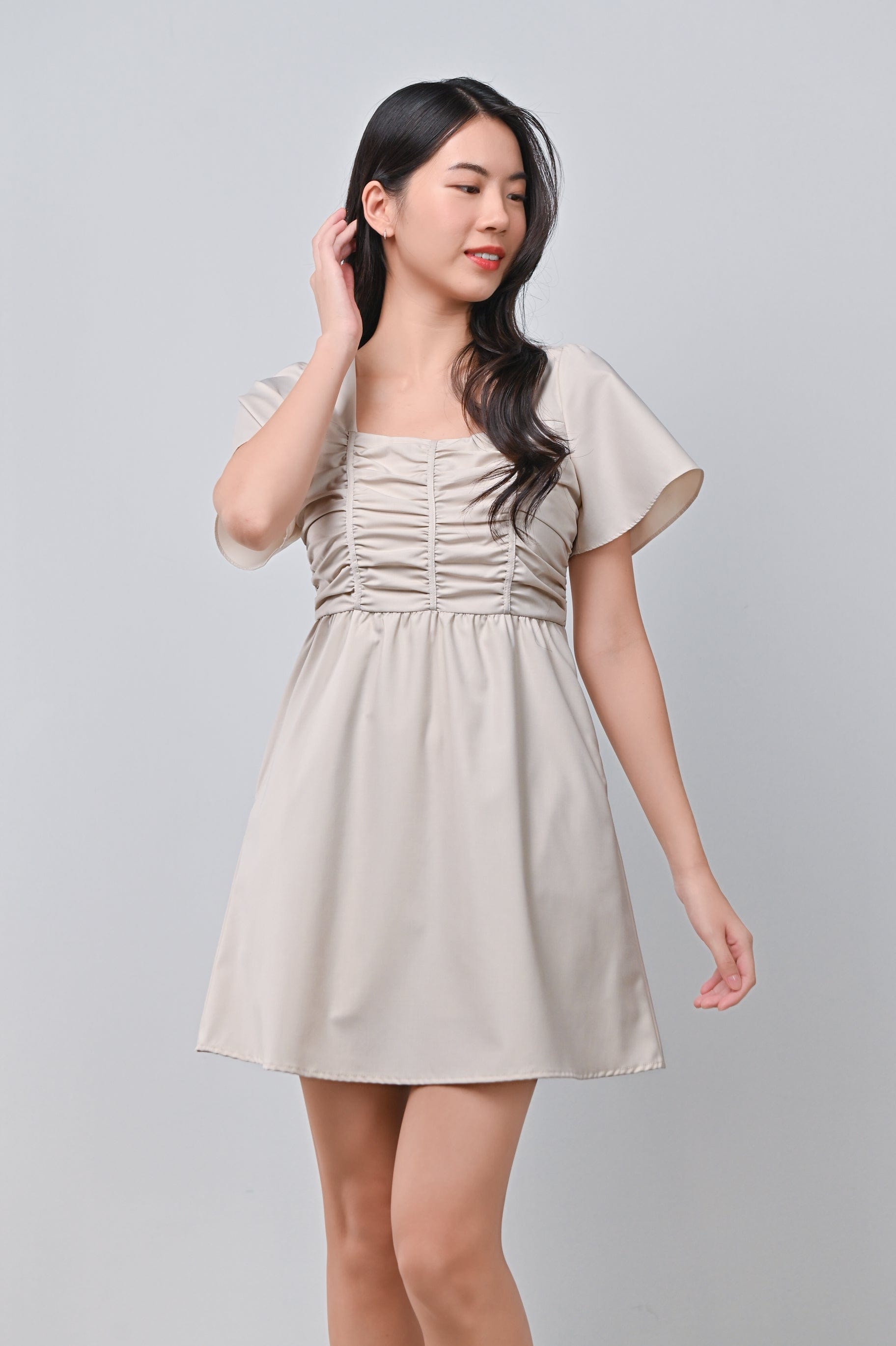 JISOO RUCHED DRESS-ROMPER IN SAND