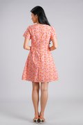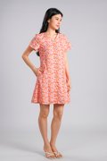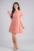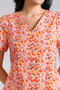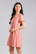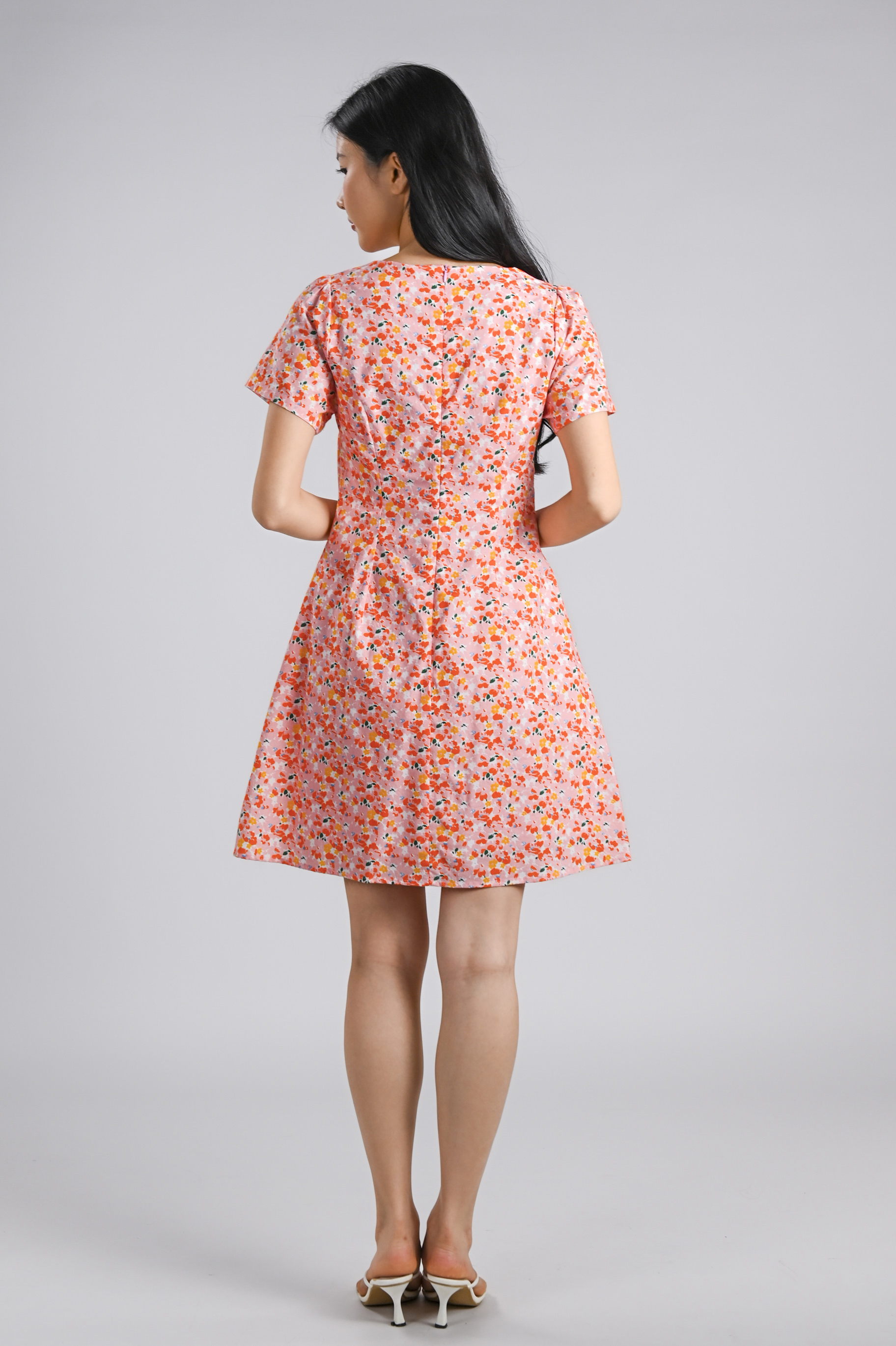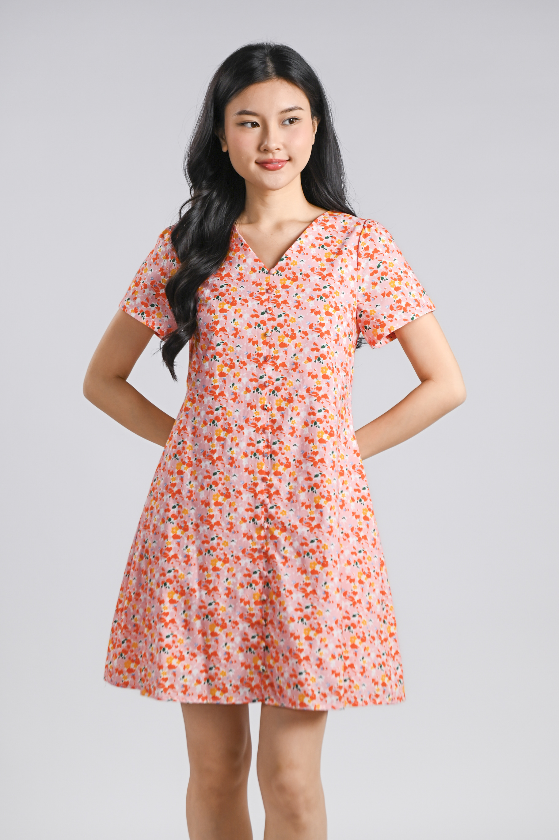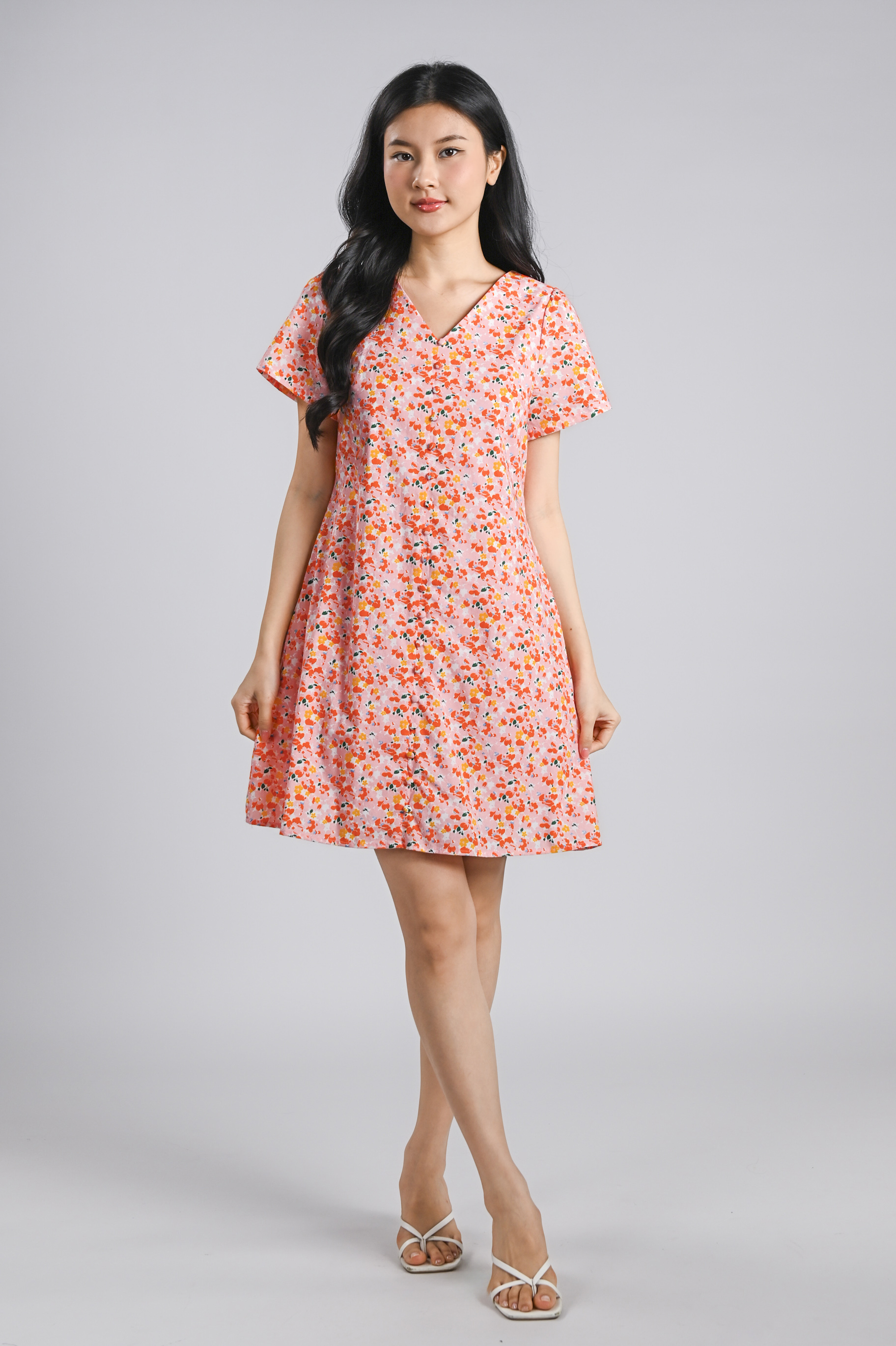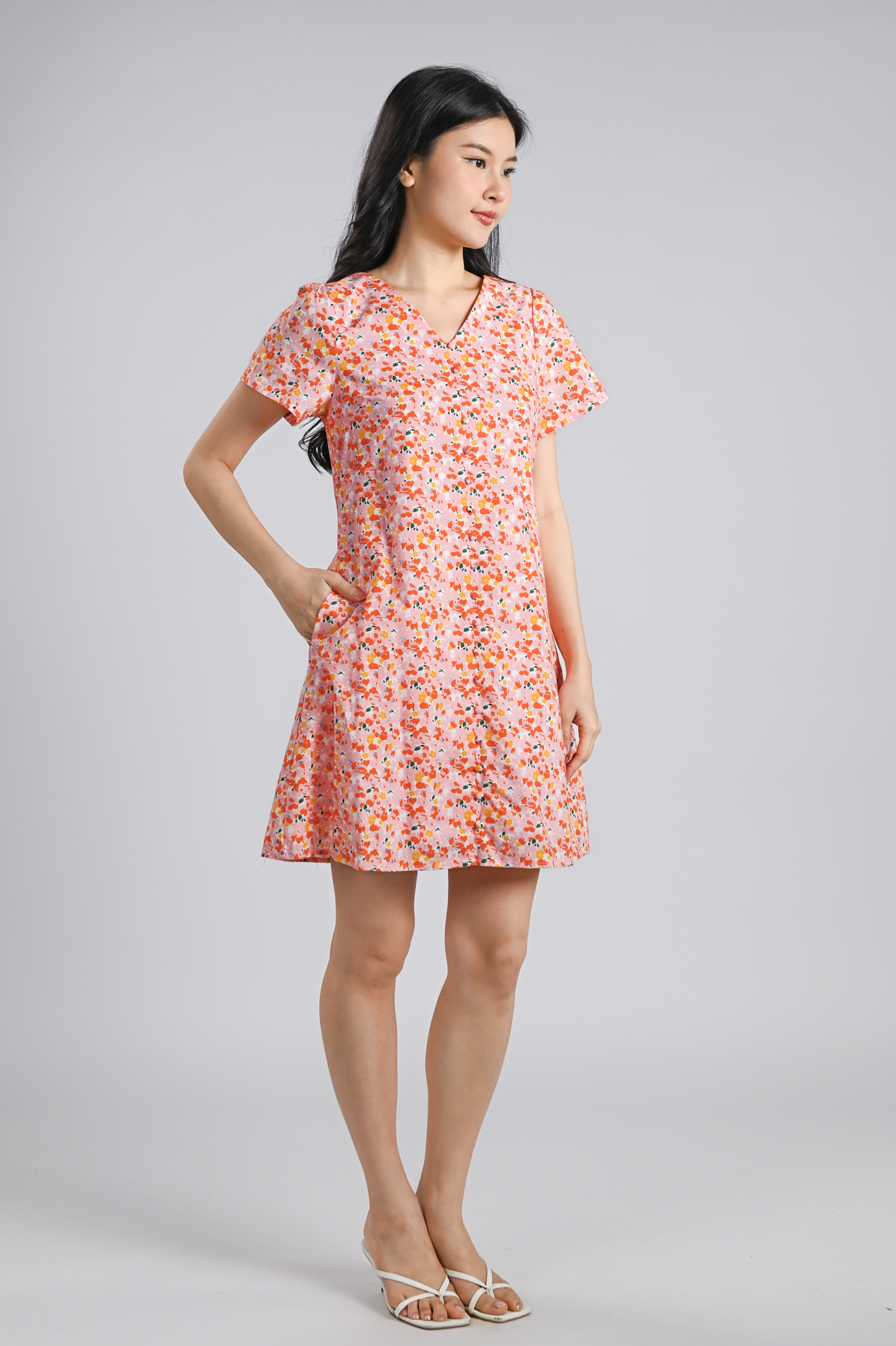 CORALIEA V-NECK SLEEVED BUTTON DRESS IN PINK/ORANGE FLORAL