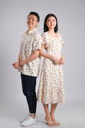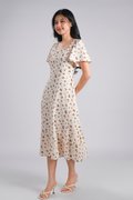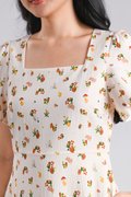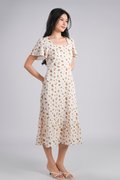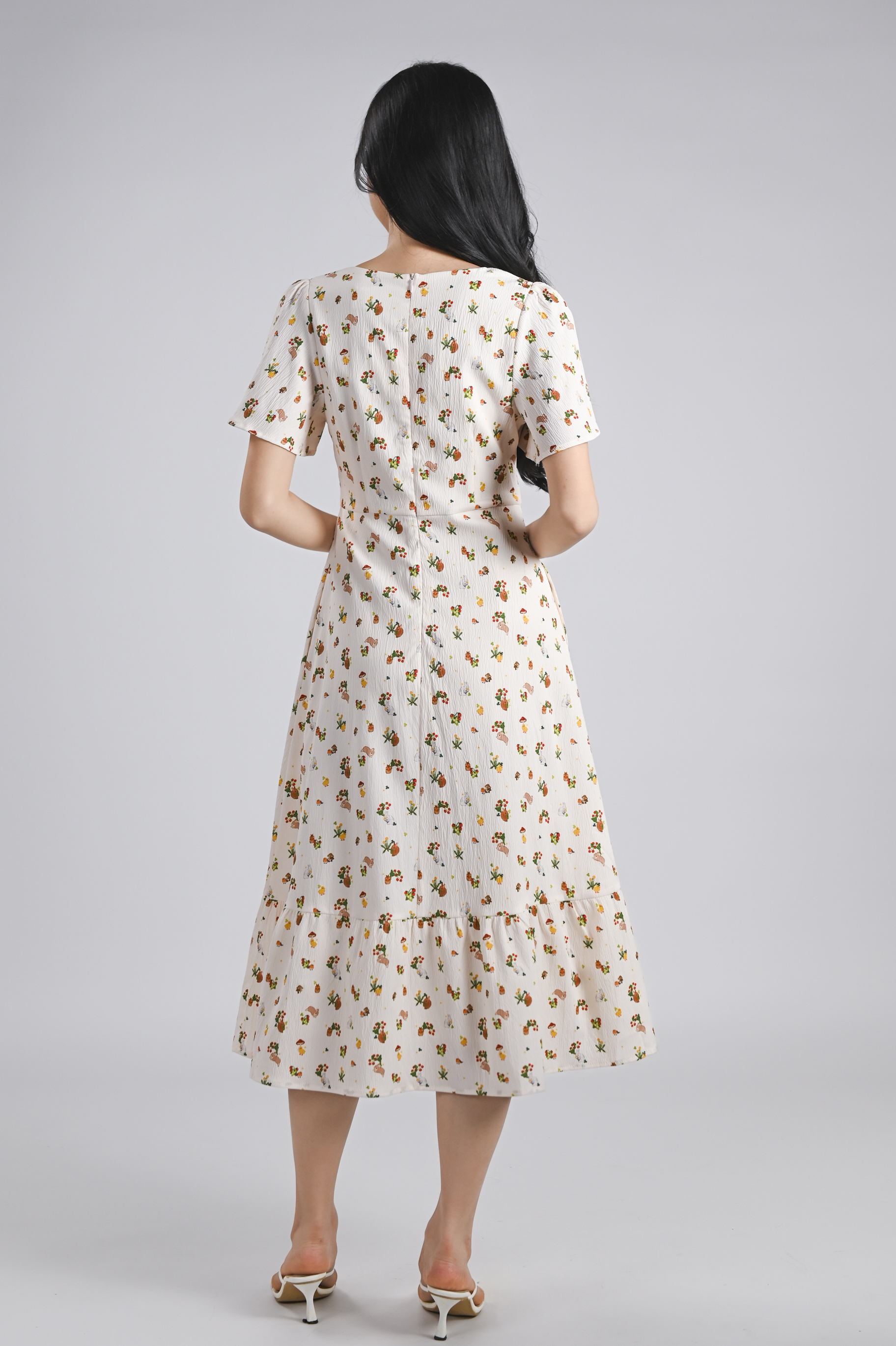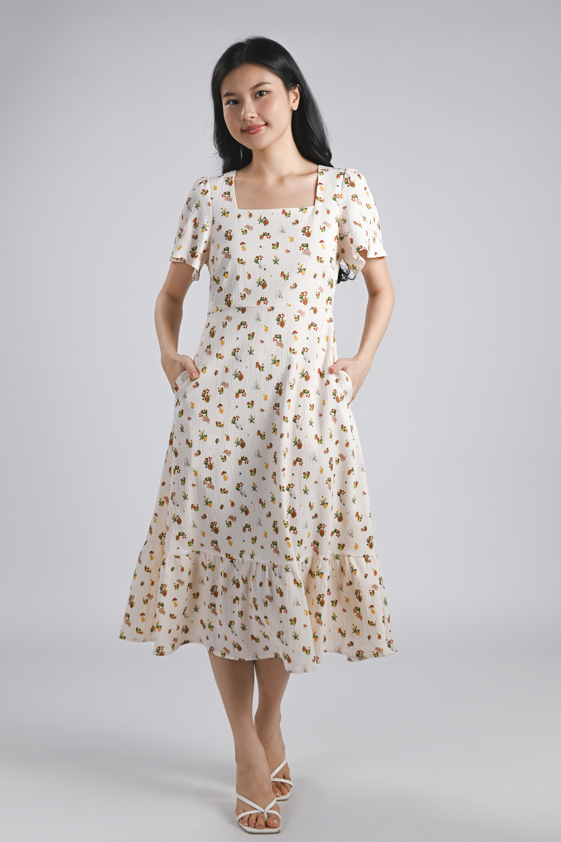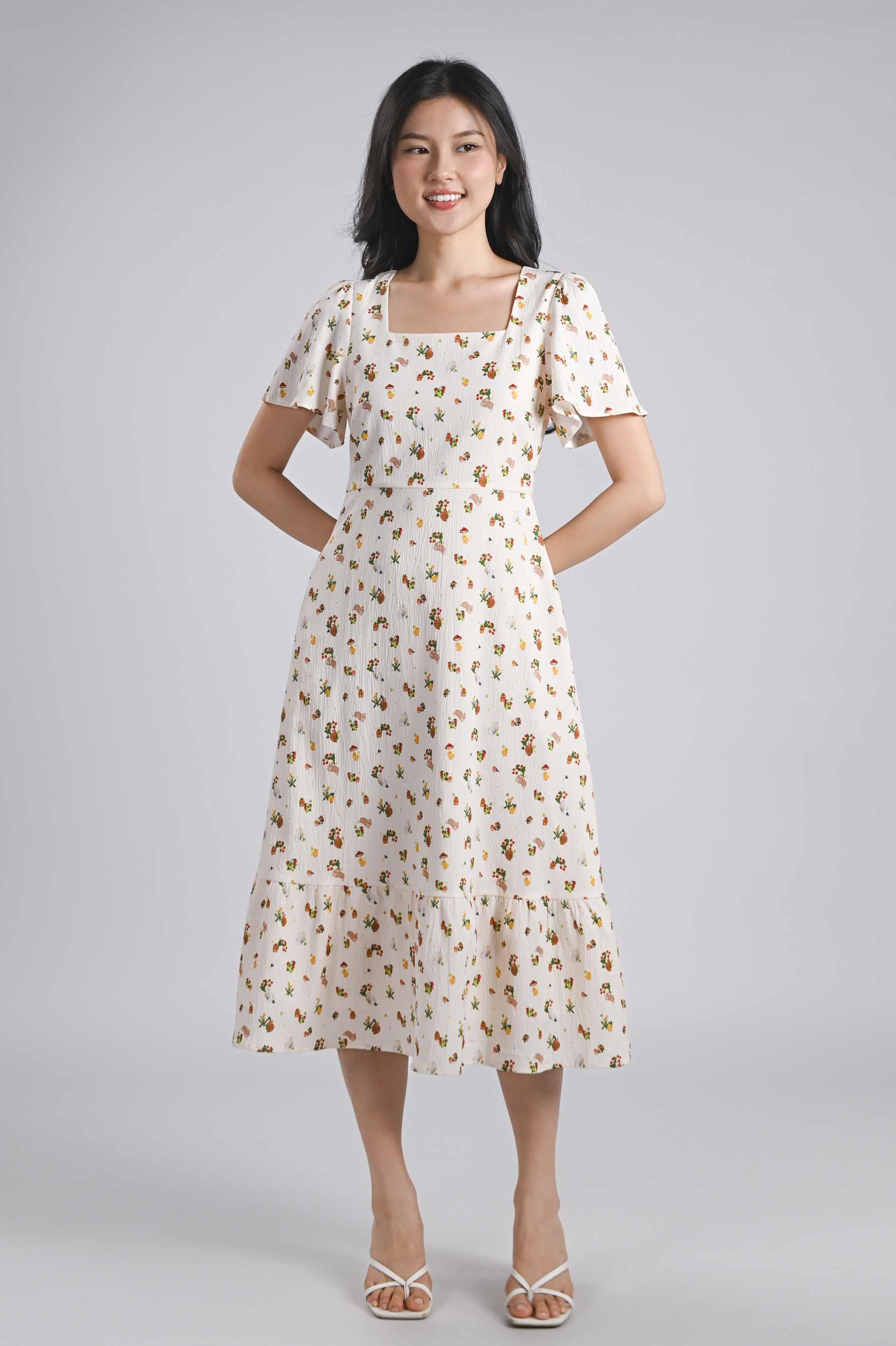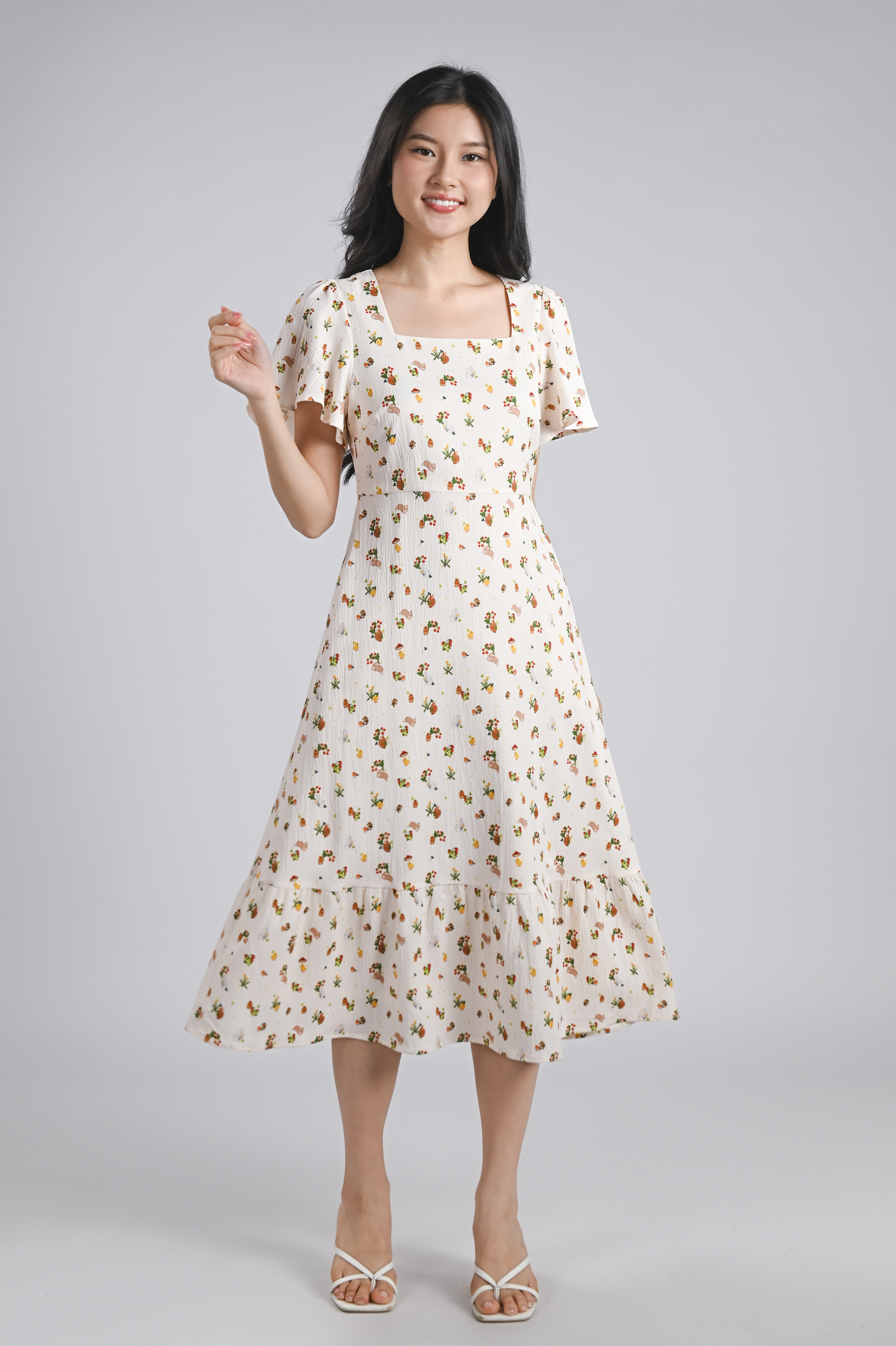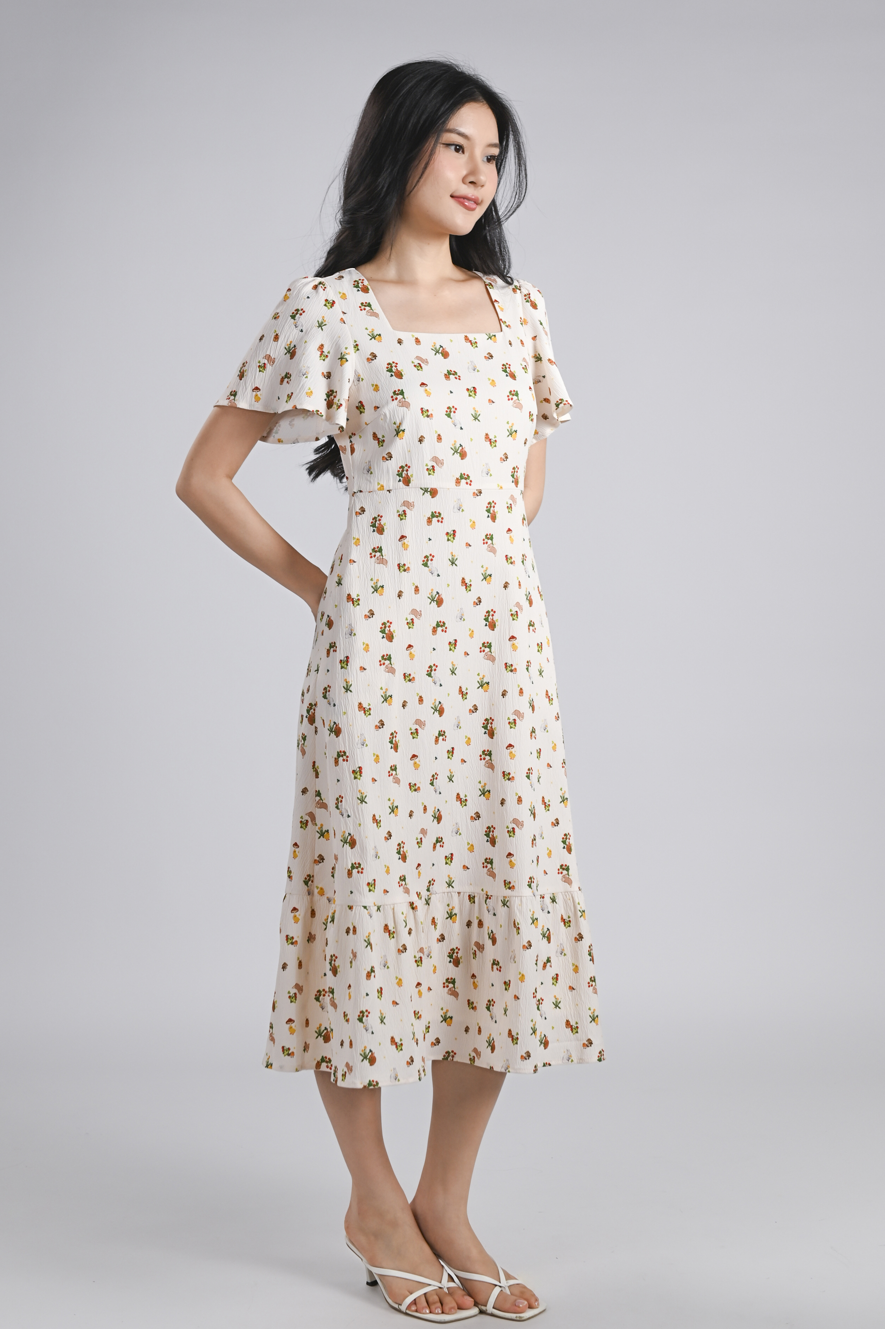 CREAM GENTLE GARDENS SQUARE-NECK SLEEVED MIDI DRESS