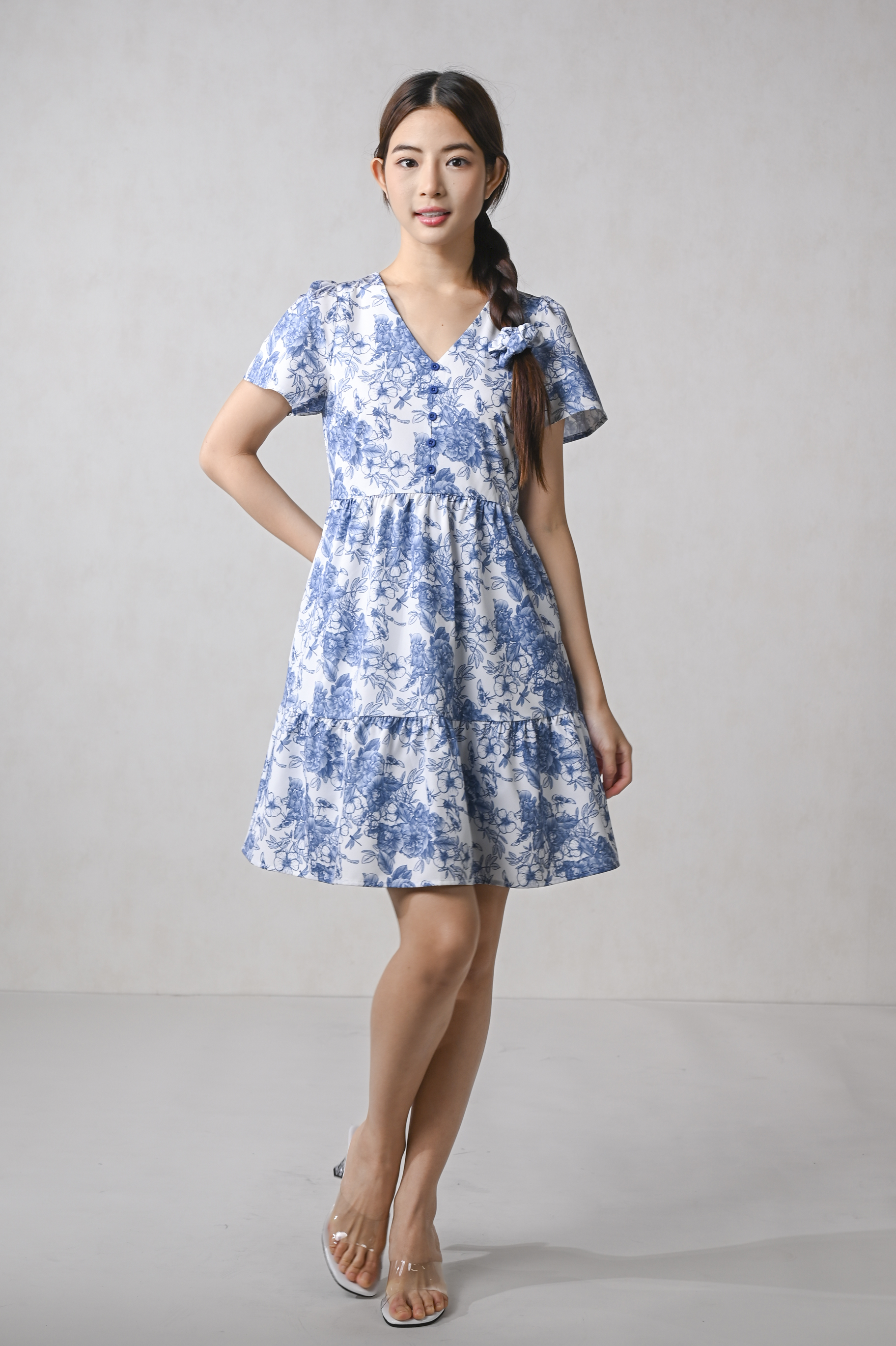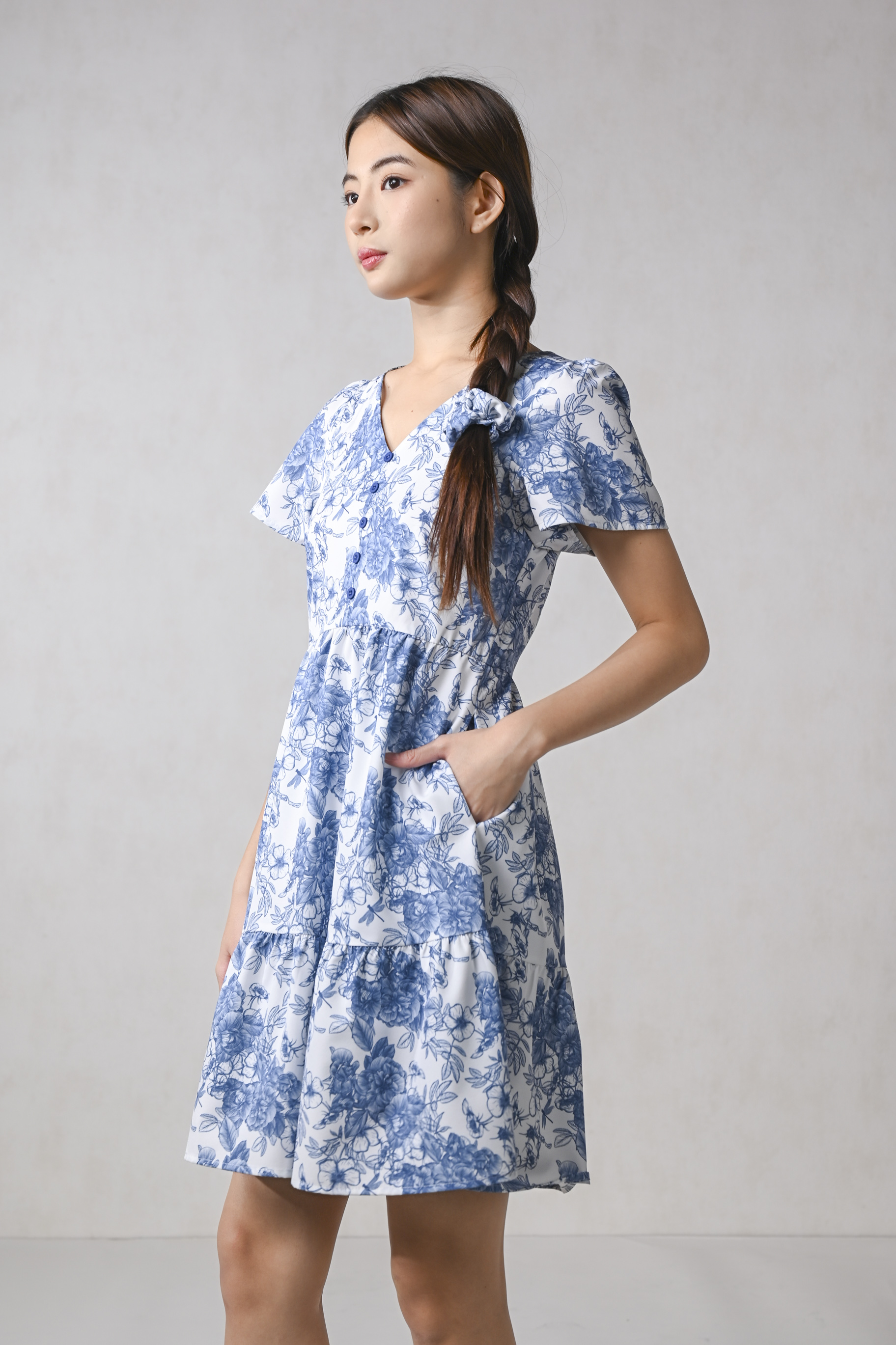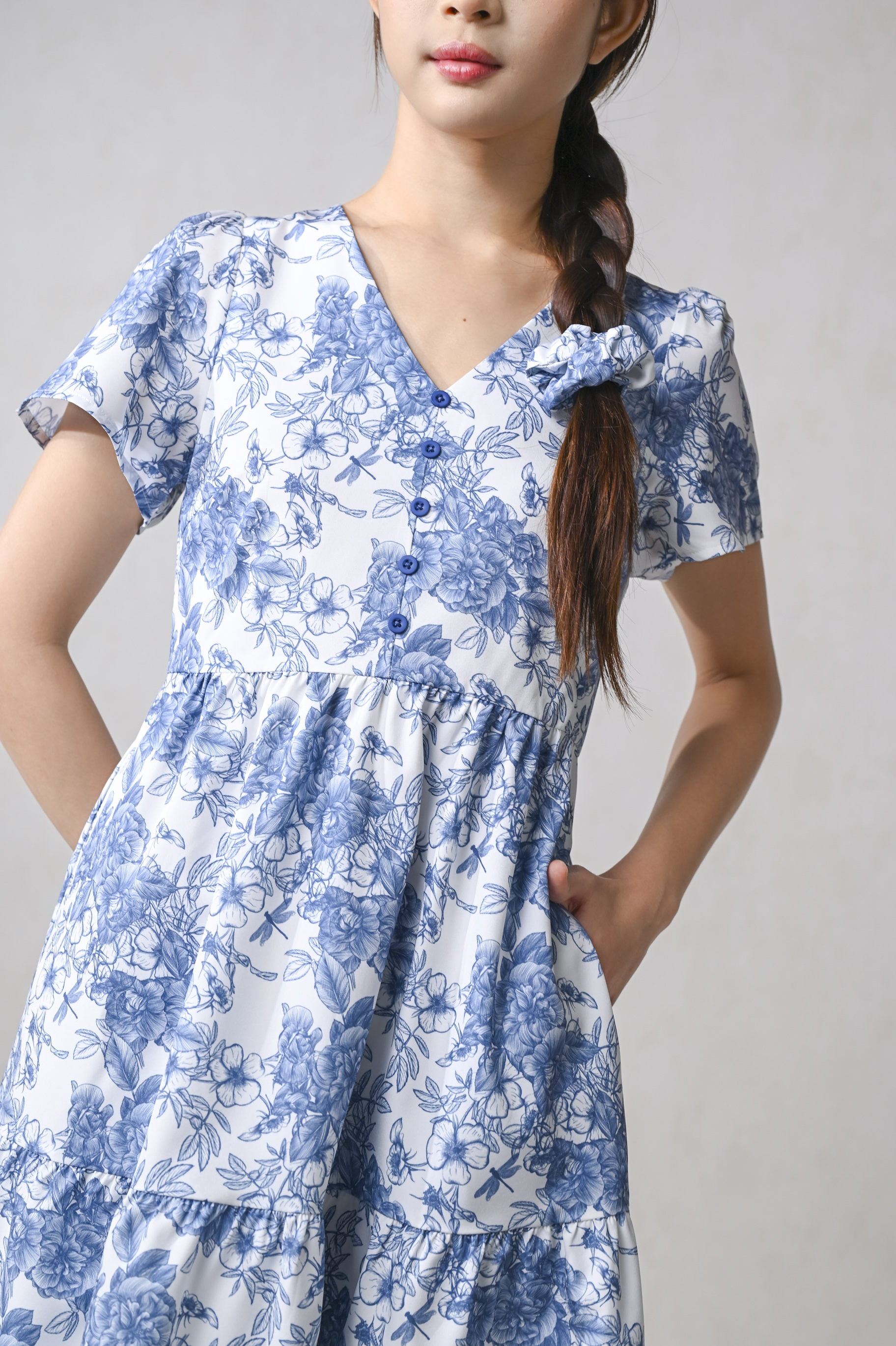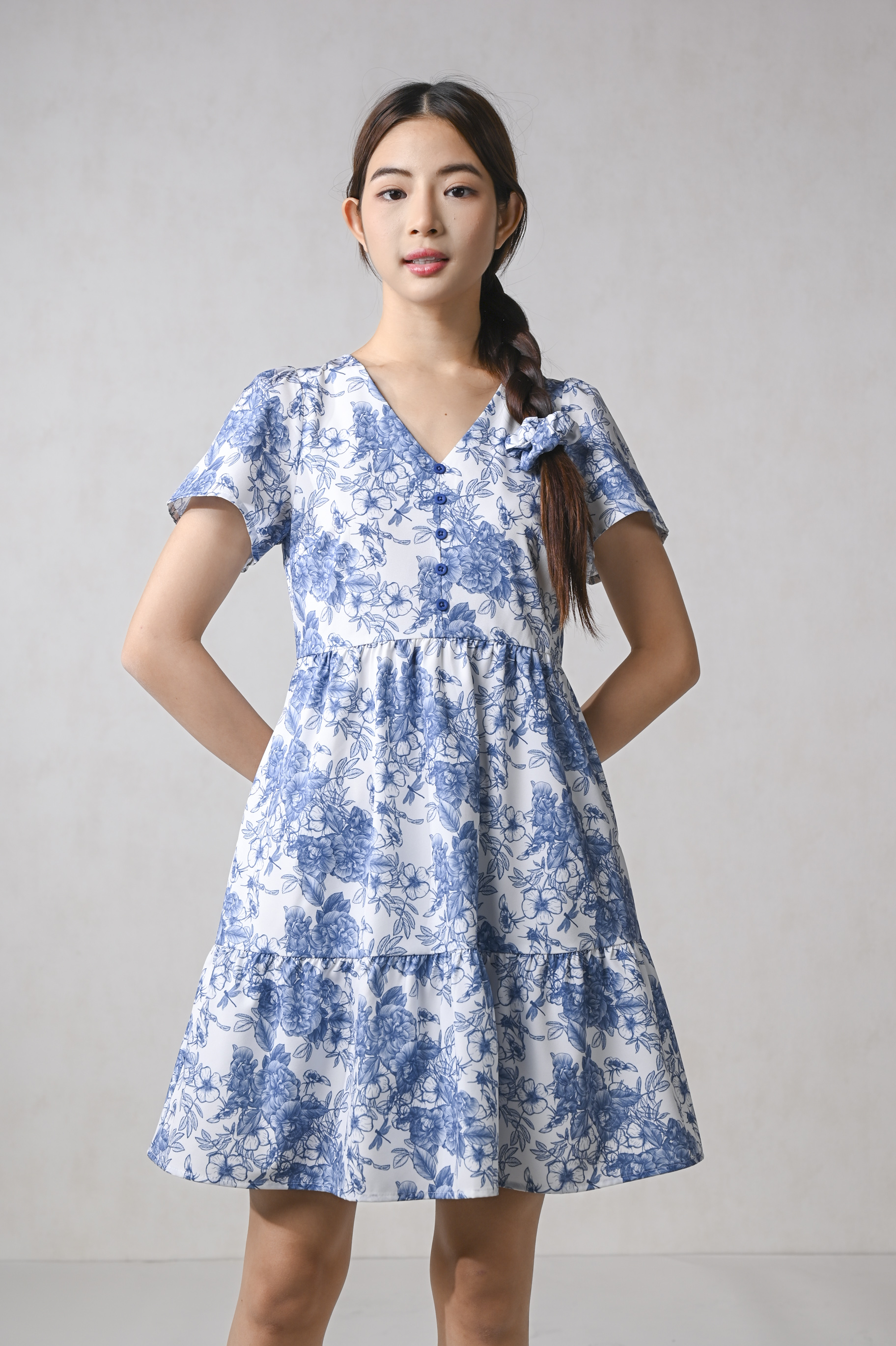 DRAGONFLY GARDEN V-NECK BUTTON FLOUNCE DRESS
