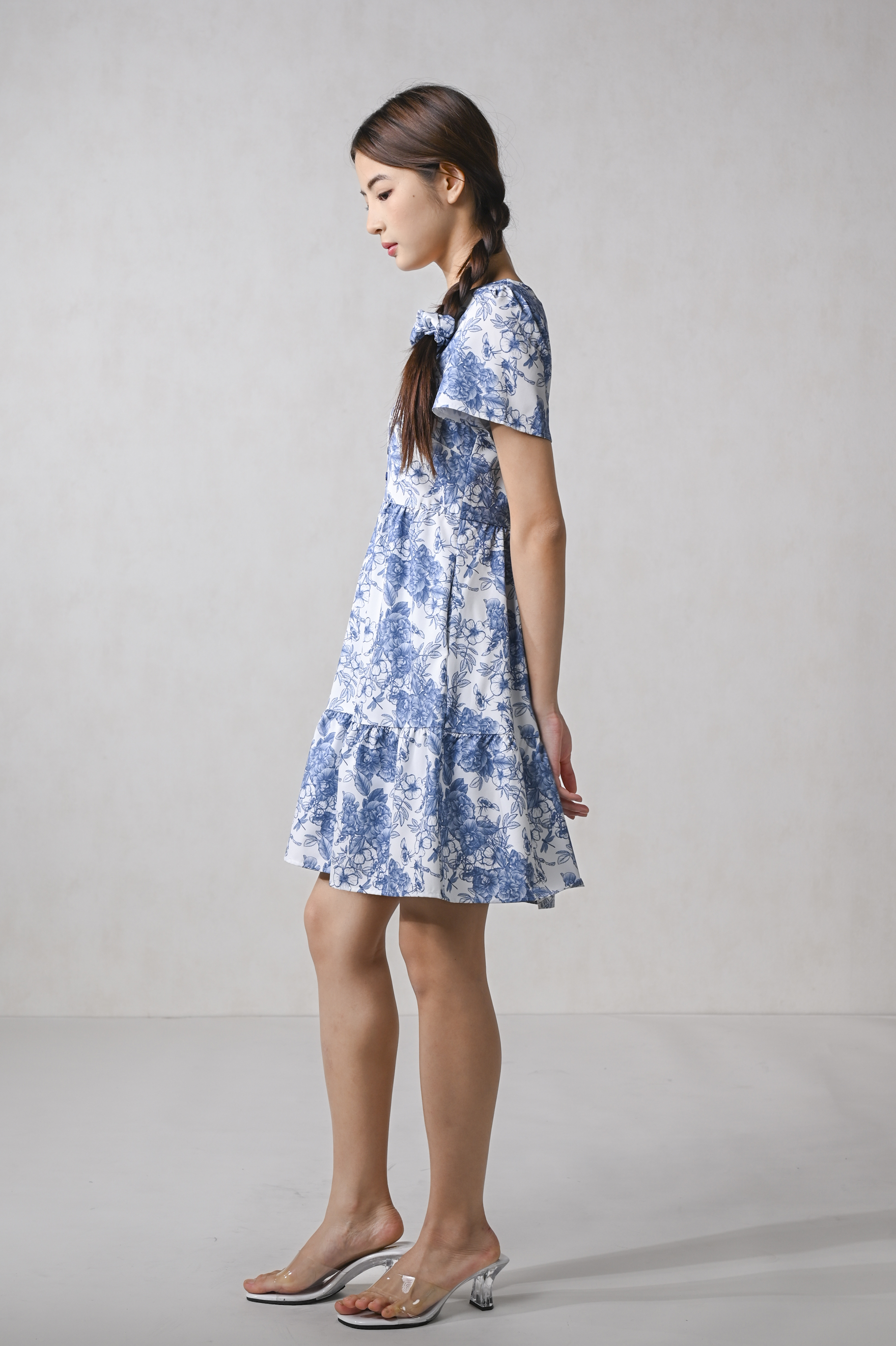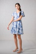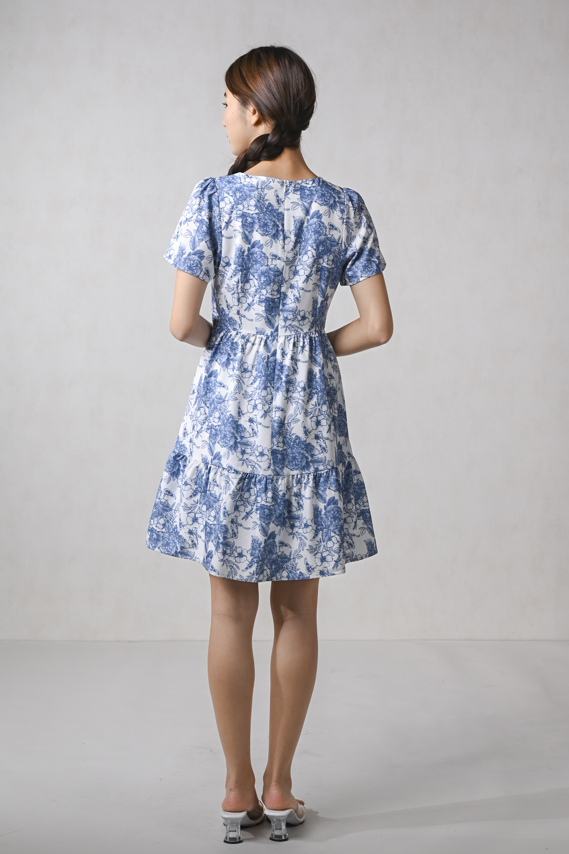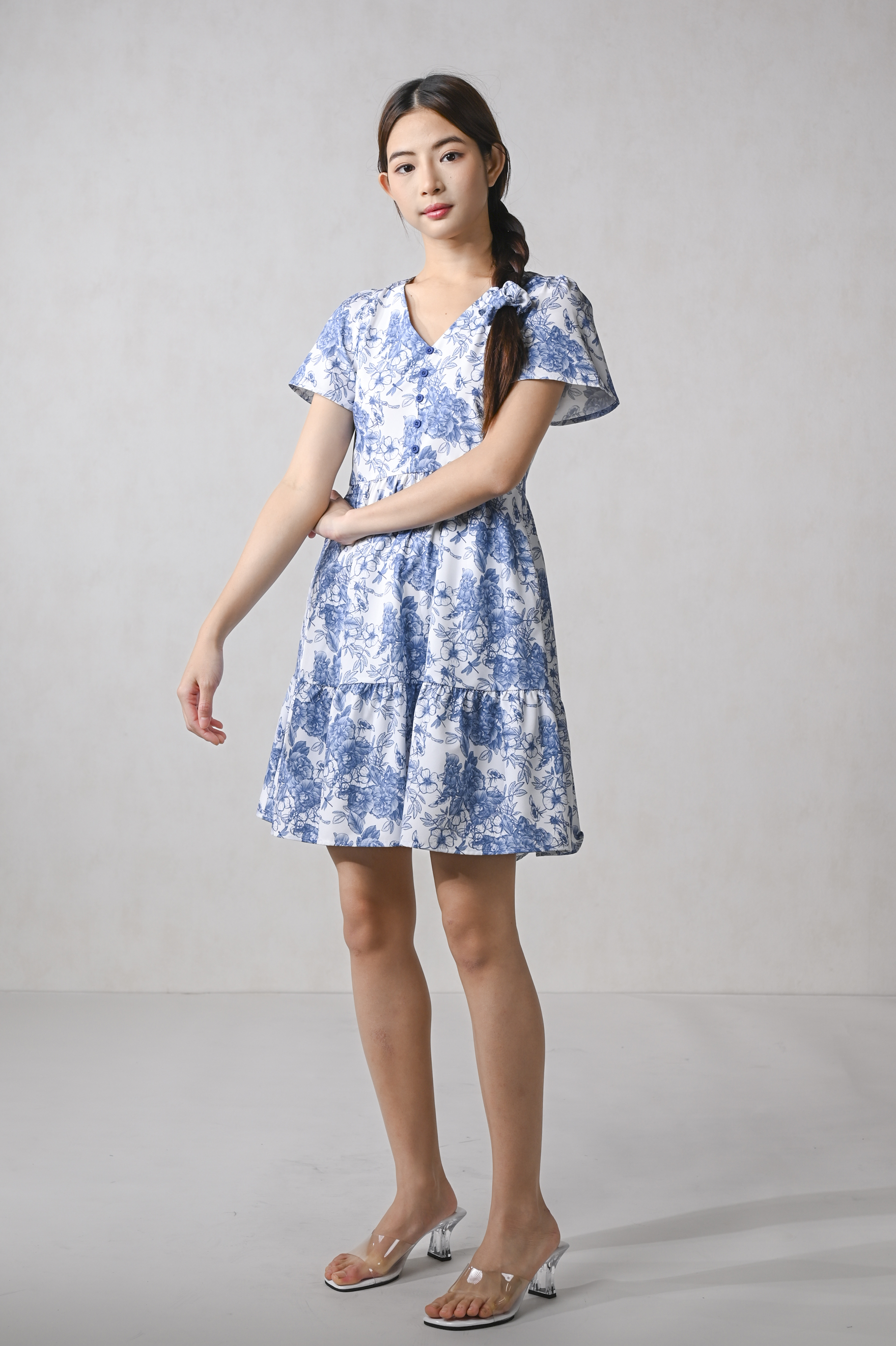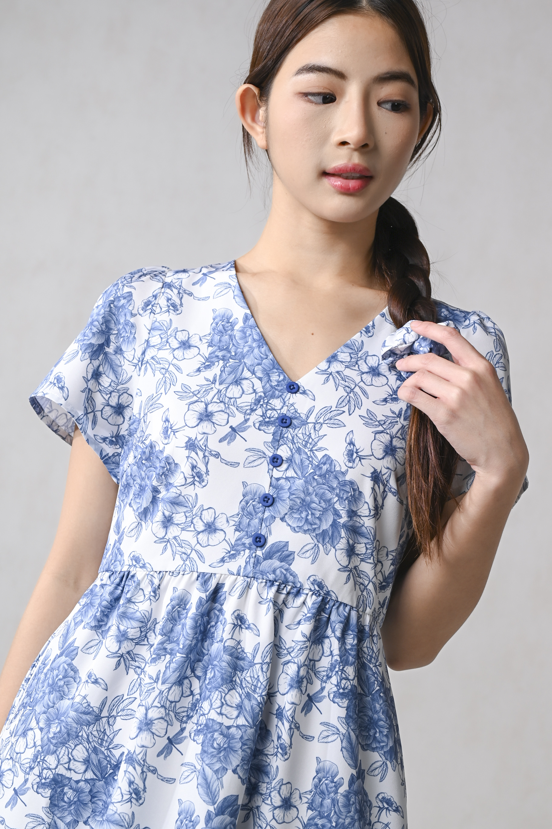DRAGONFLY GARDEN V-NECK BUTTON FLOUNCE DRESS