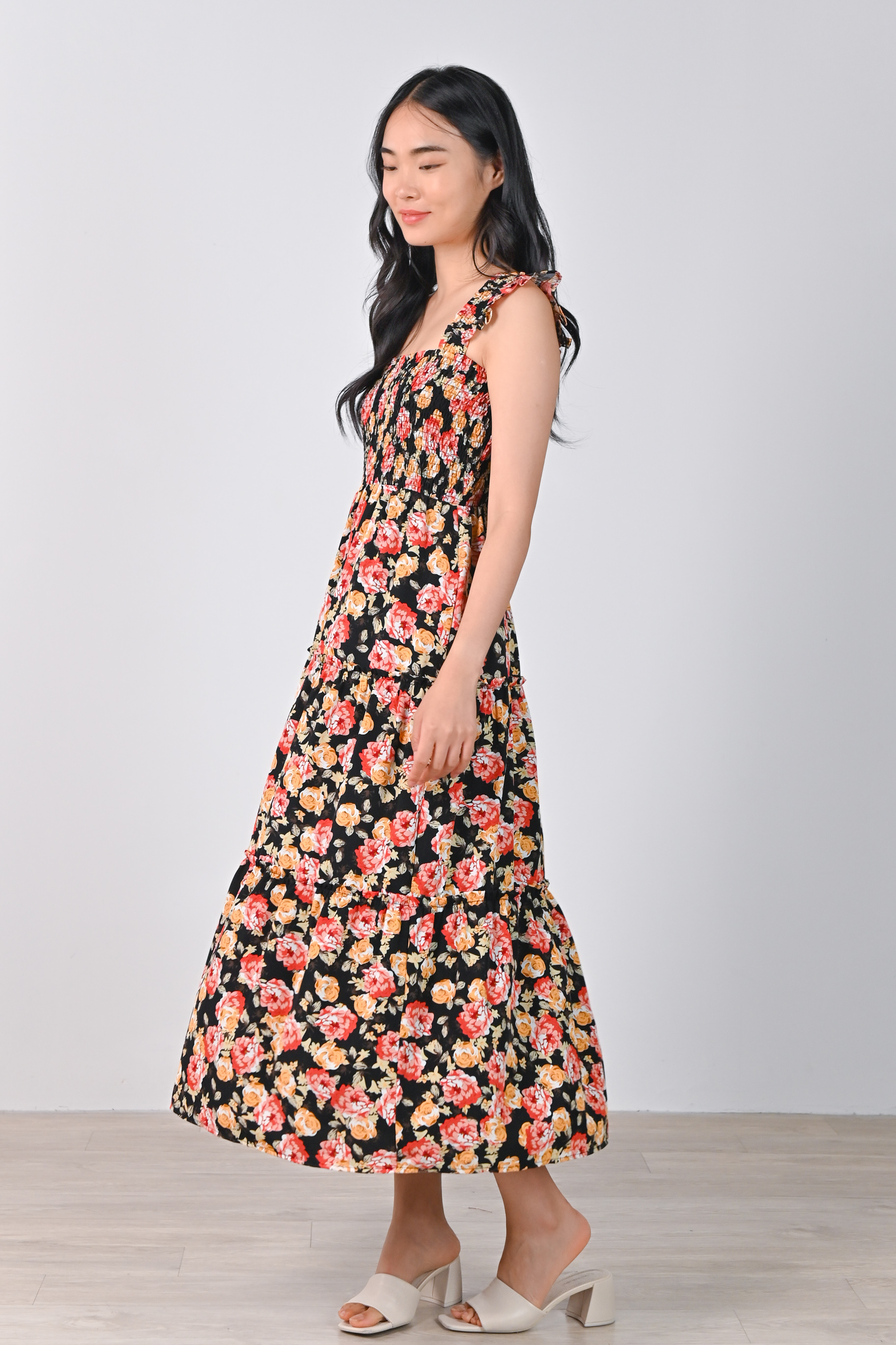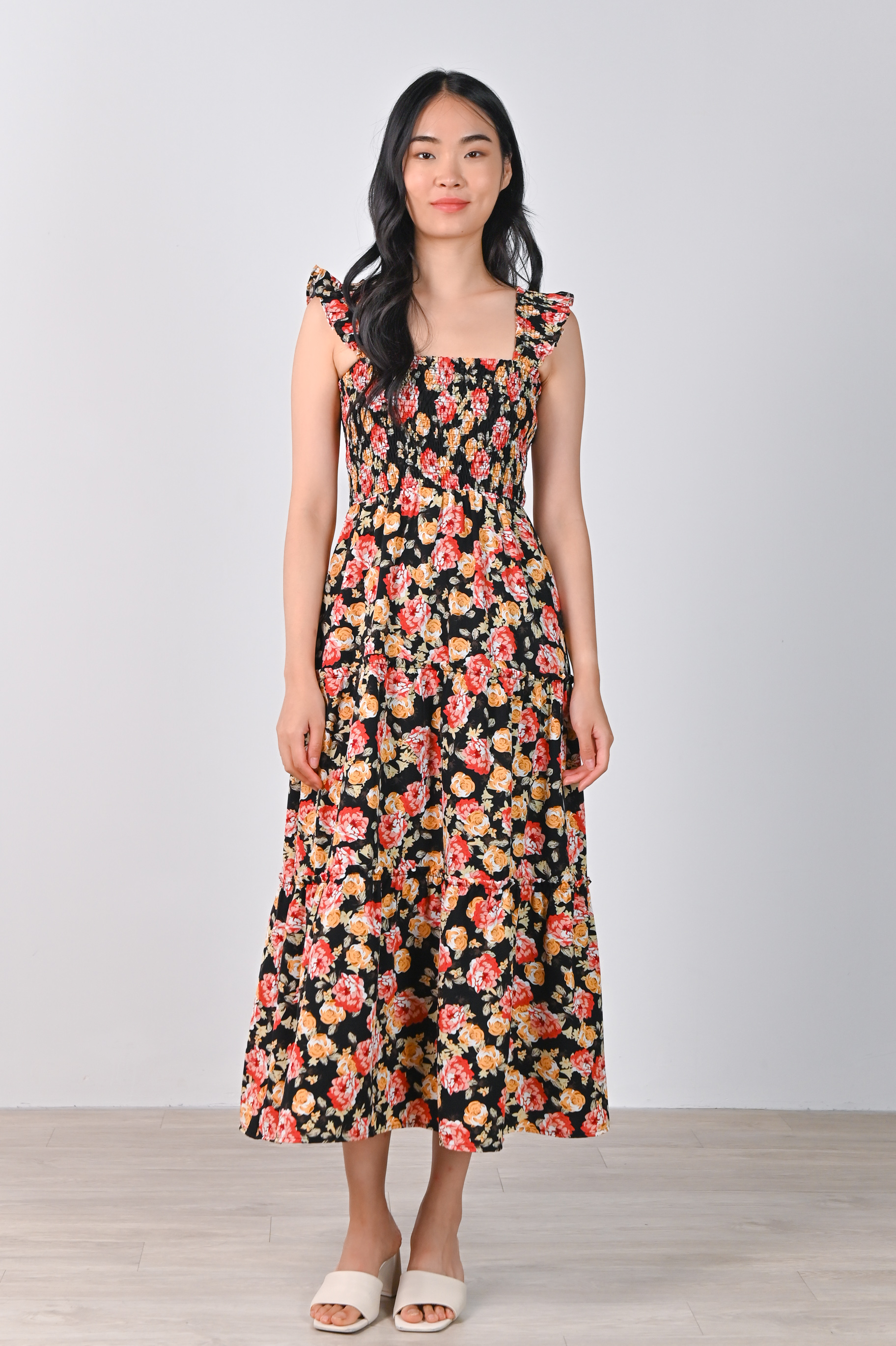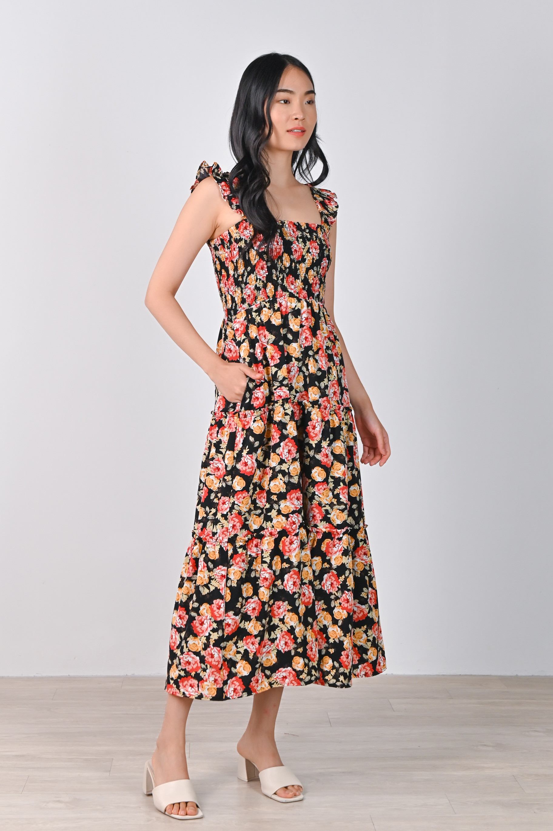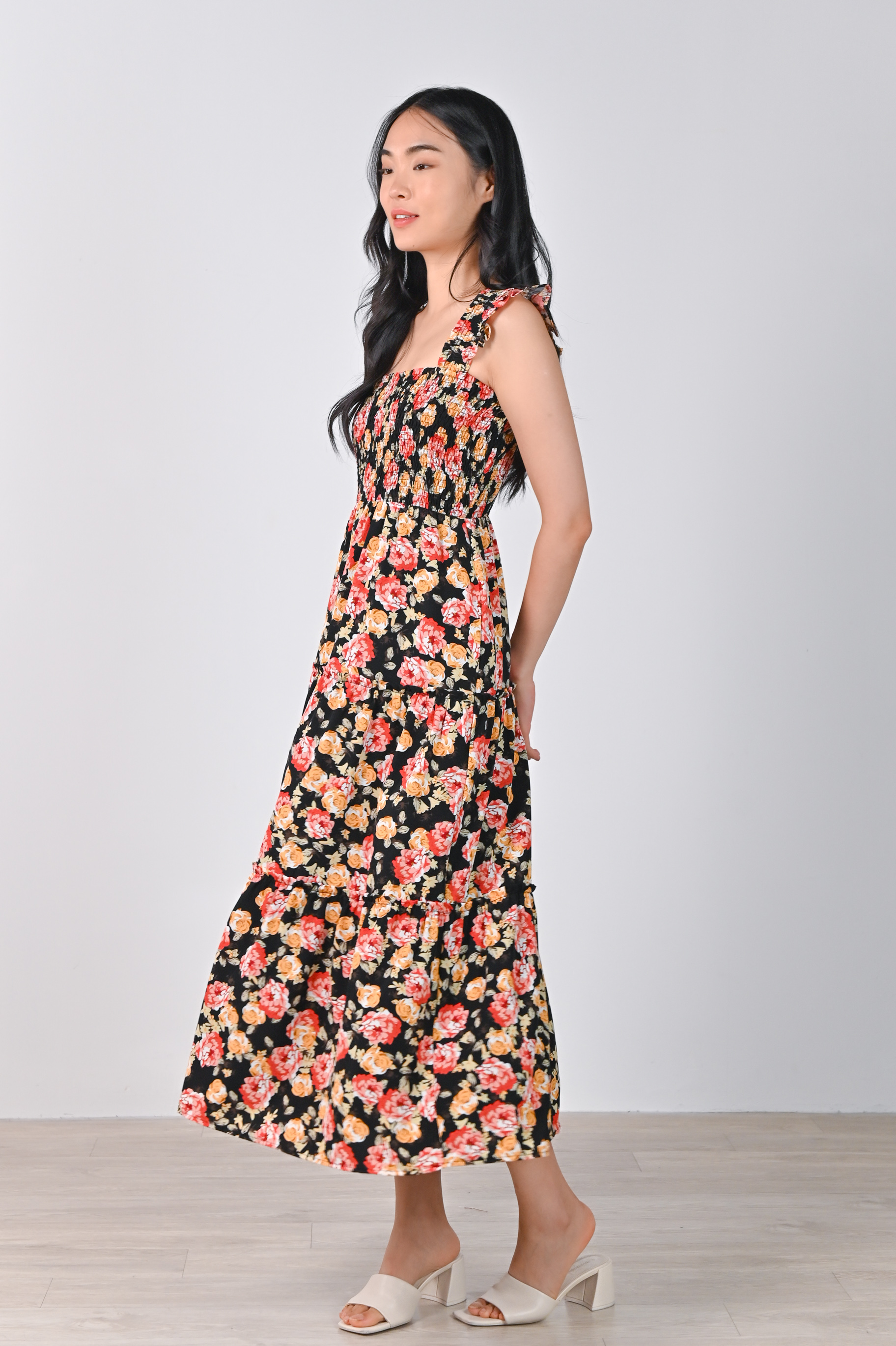 EILEEN FLORAL SMOCKED DRESS IN BLACK