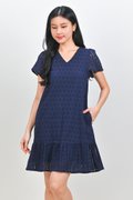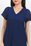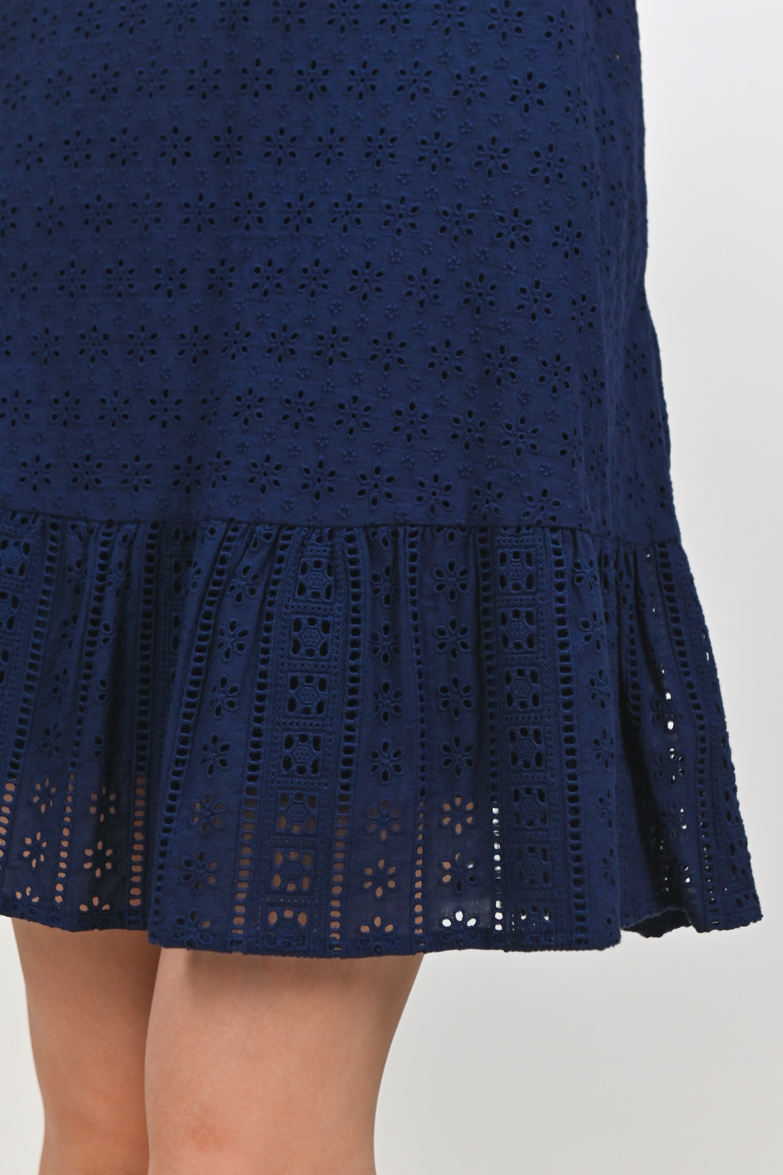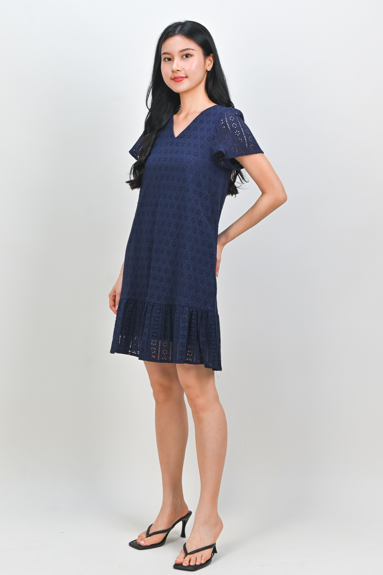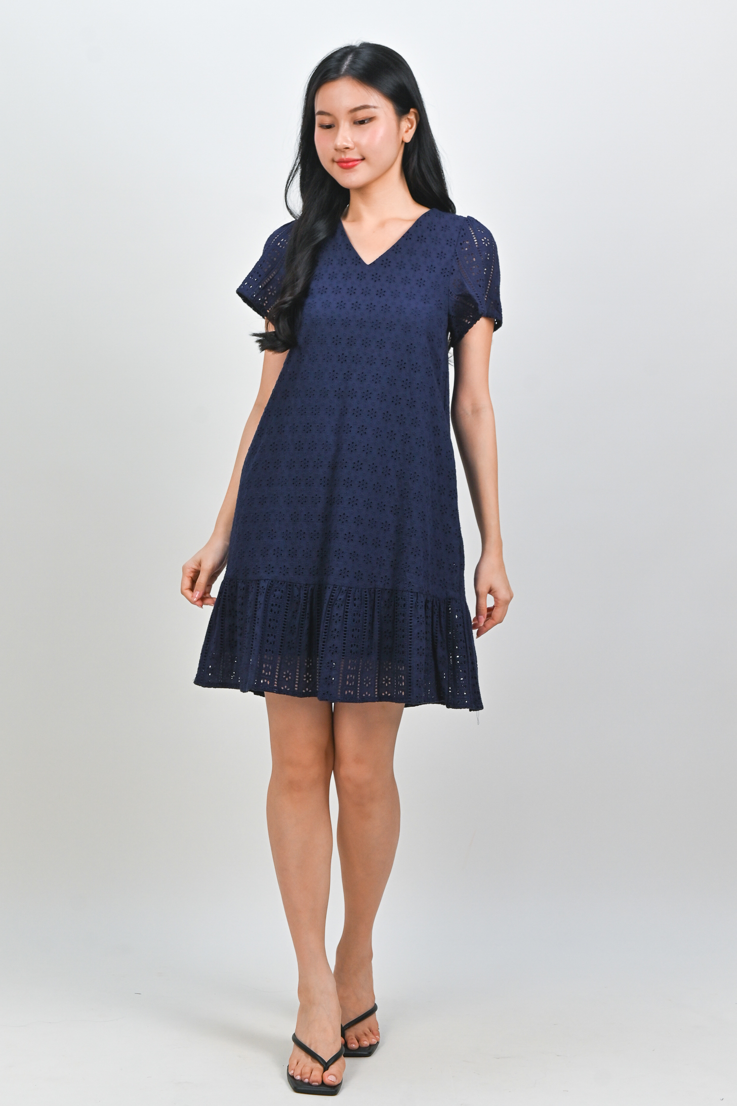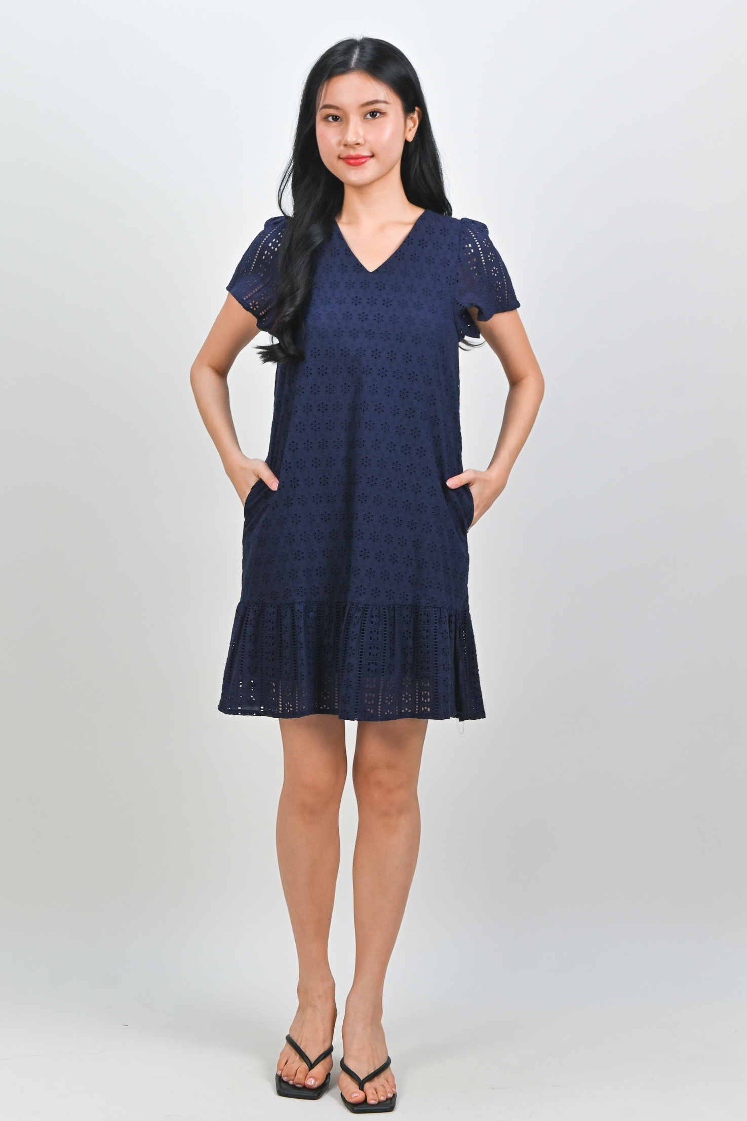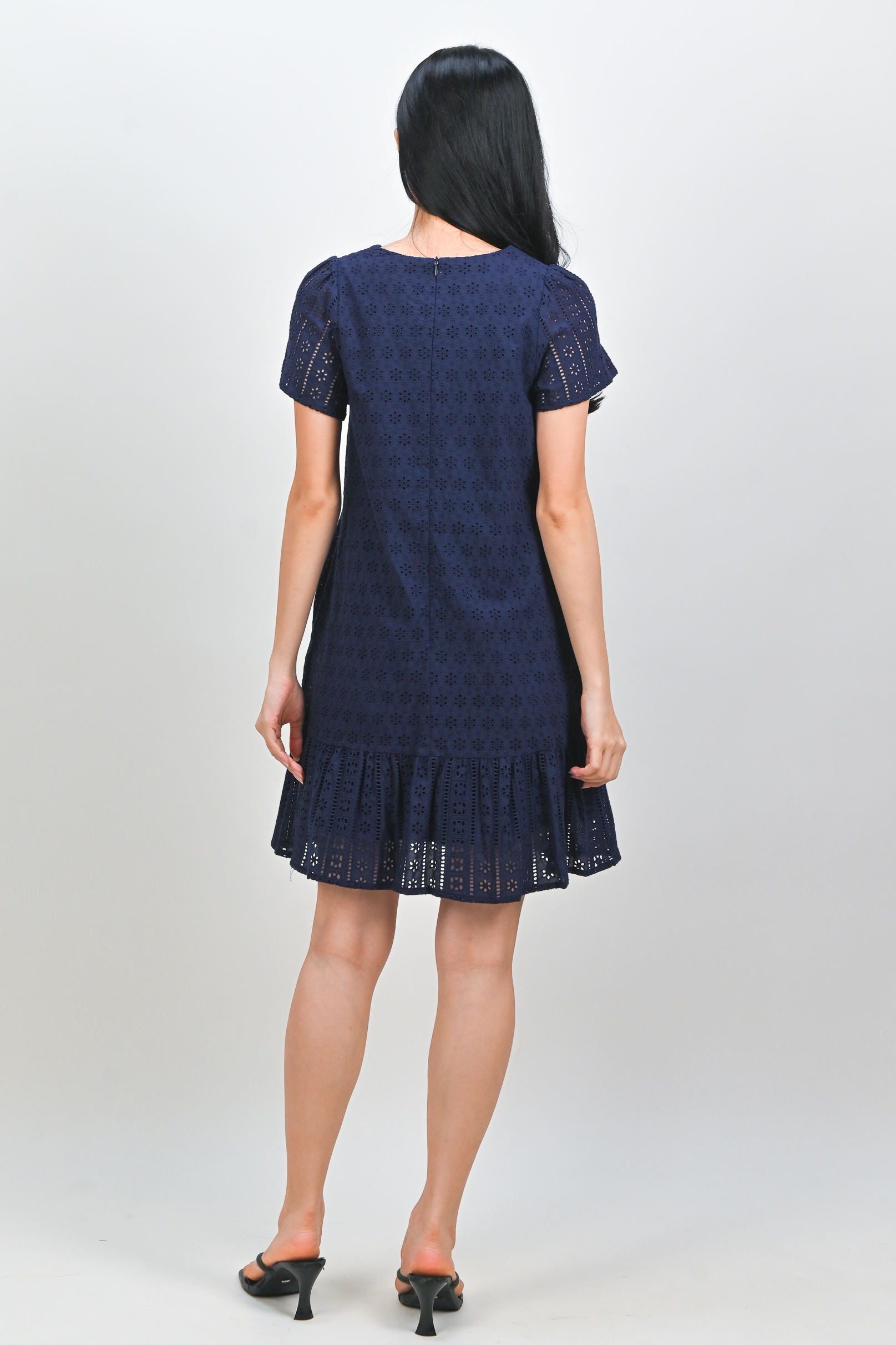 ELETTRA EYELET SLEEVED DROPWAIST DRESS IN NAVY