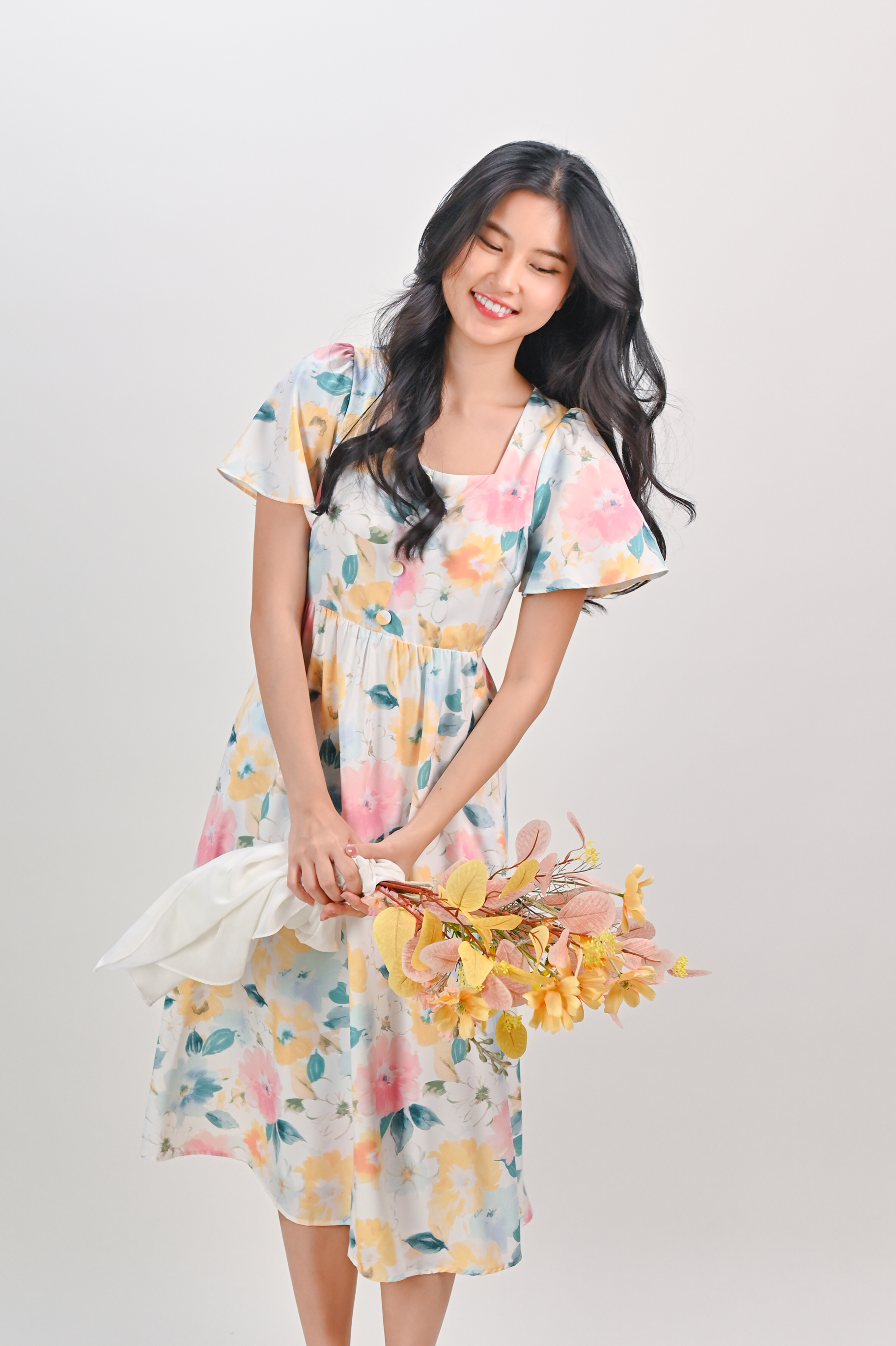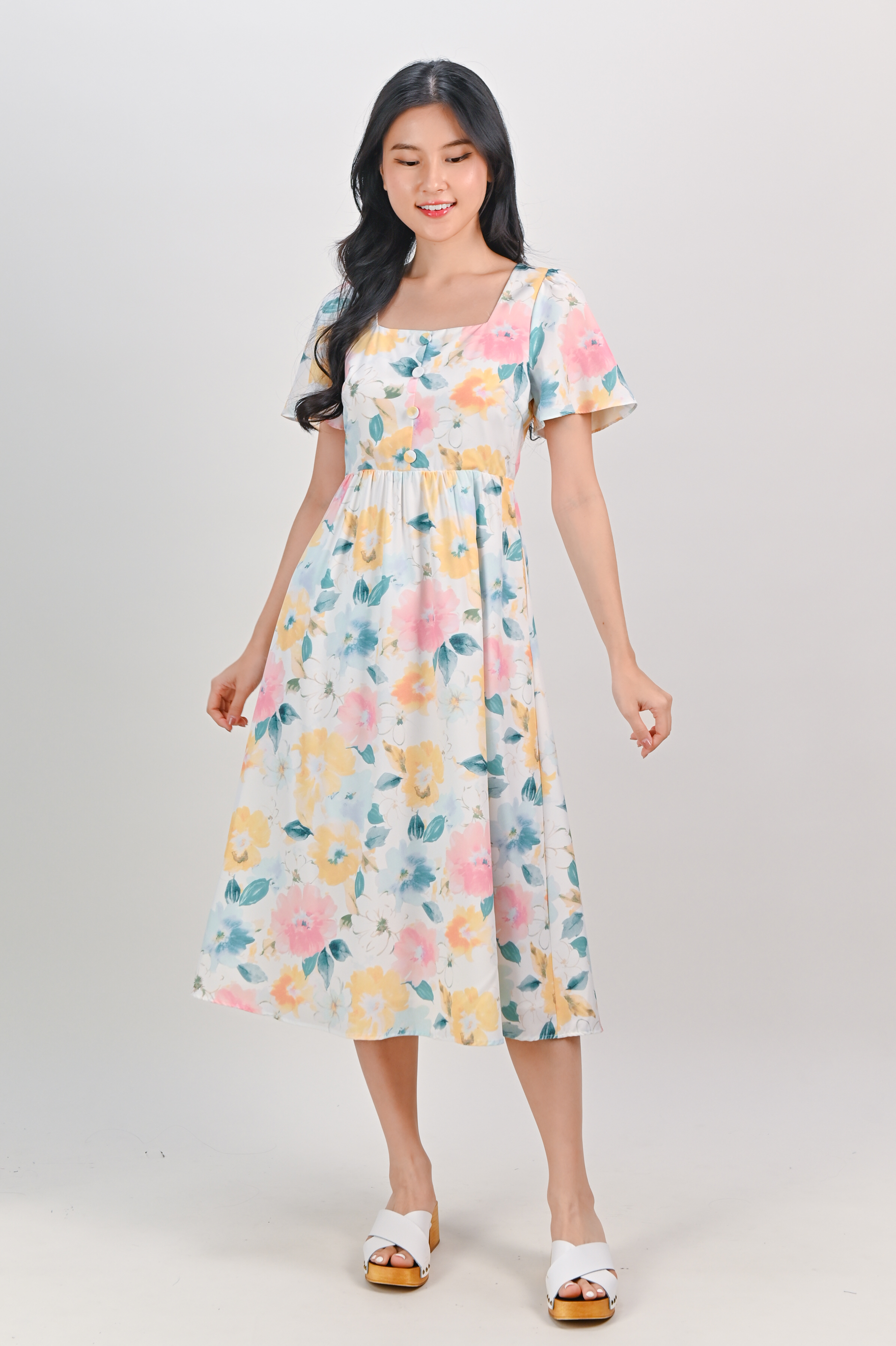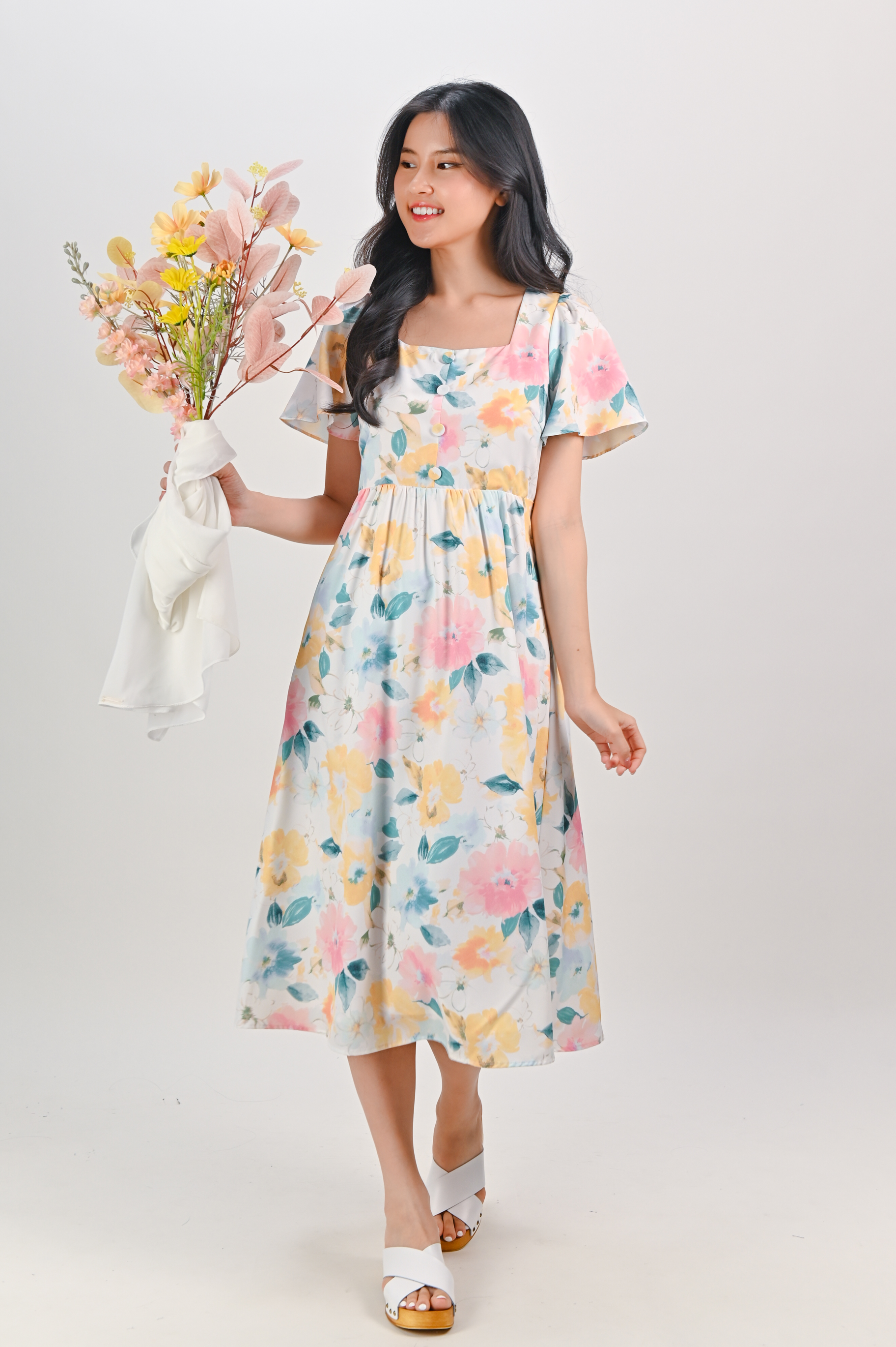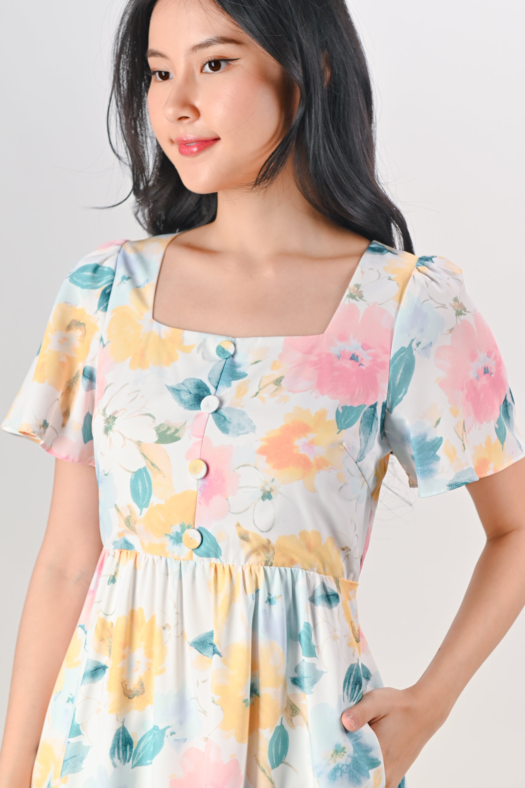 ELODIE FLORAL SQUARE-NECK BUTTON SLEEVED DRESS