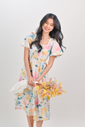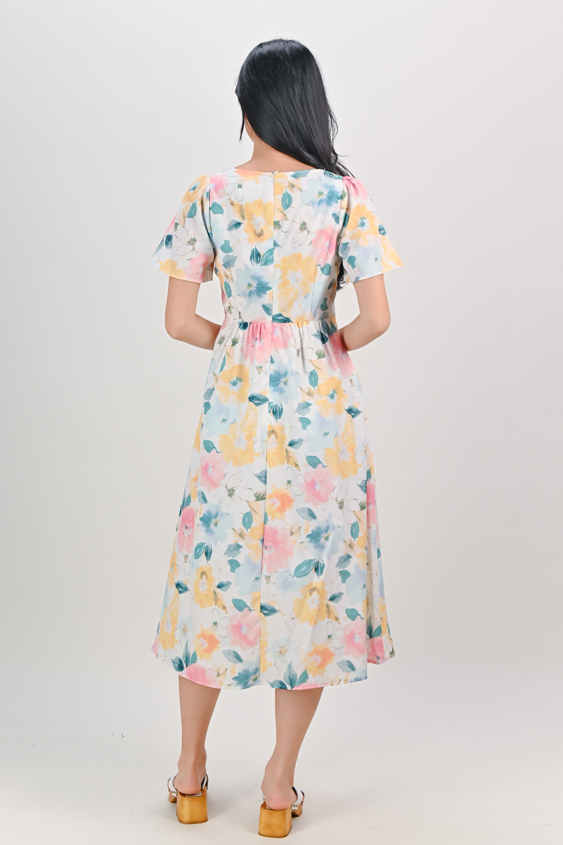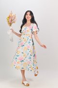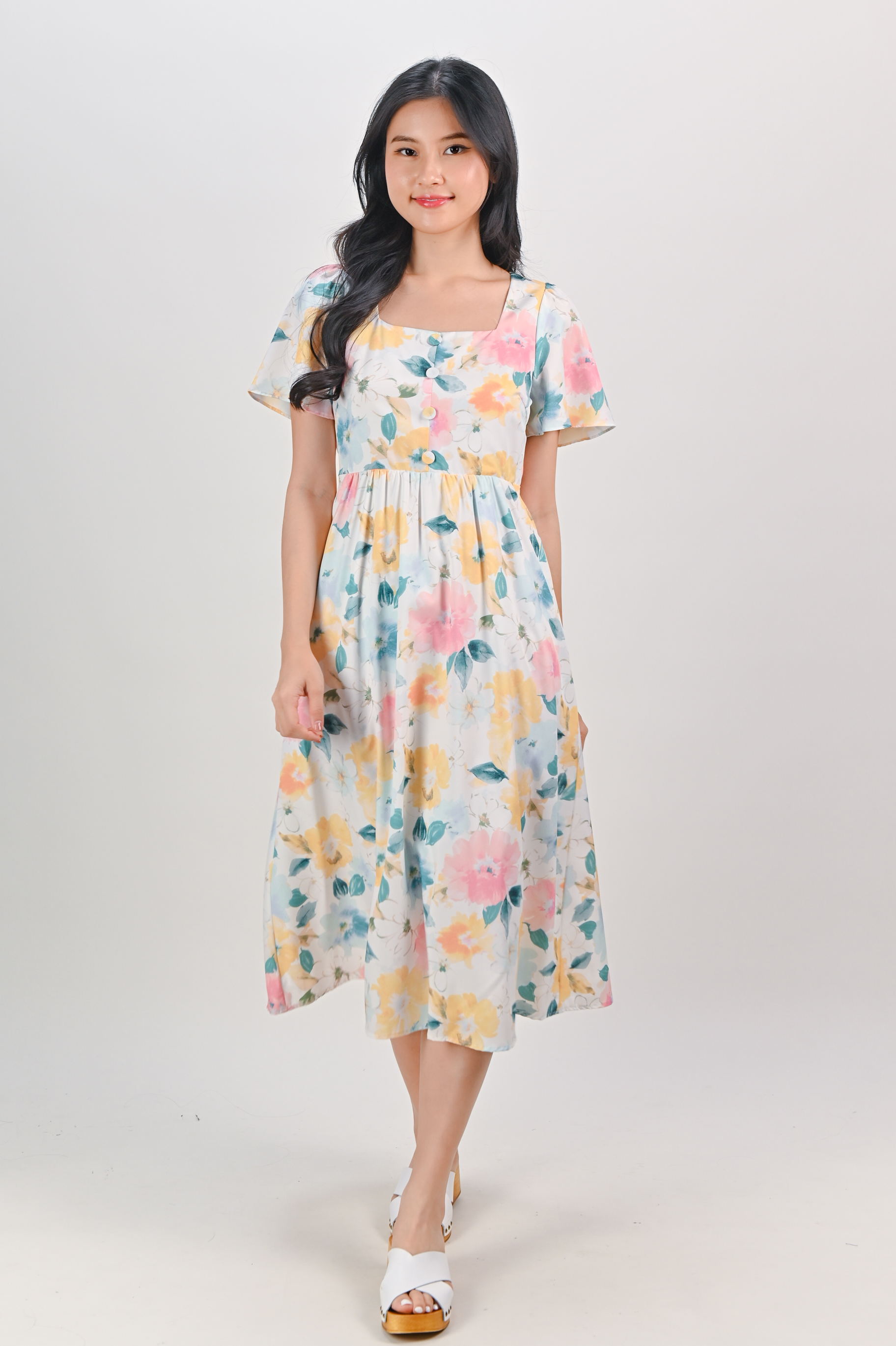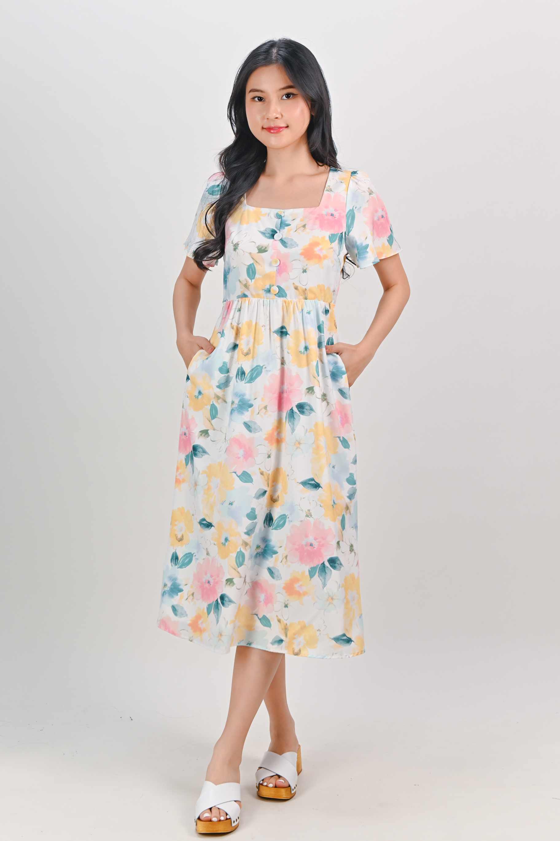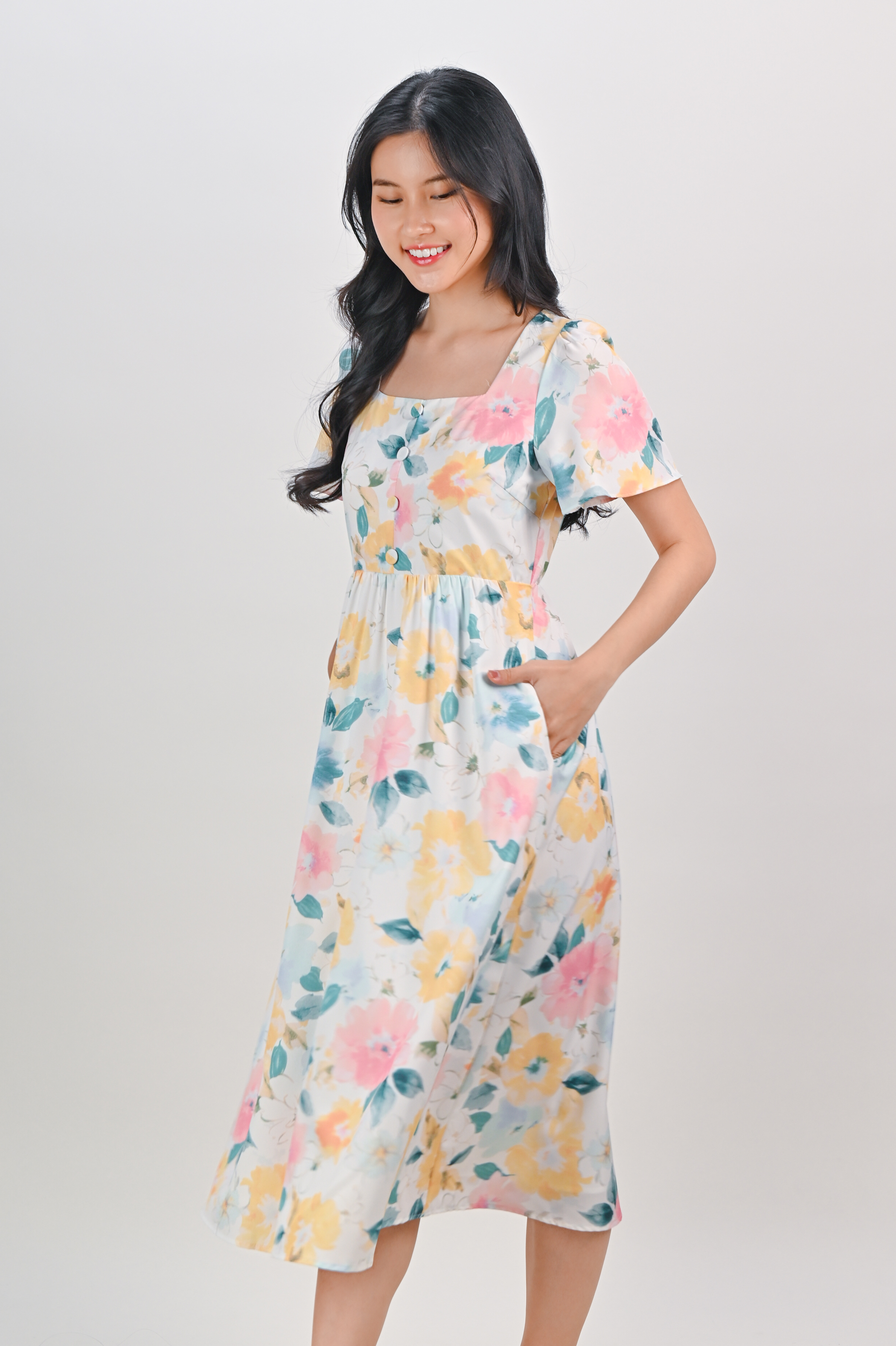 ELODIE FLORAL SQUARE-NECK BUTTON SLEEVED DRESS