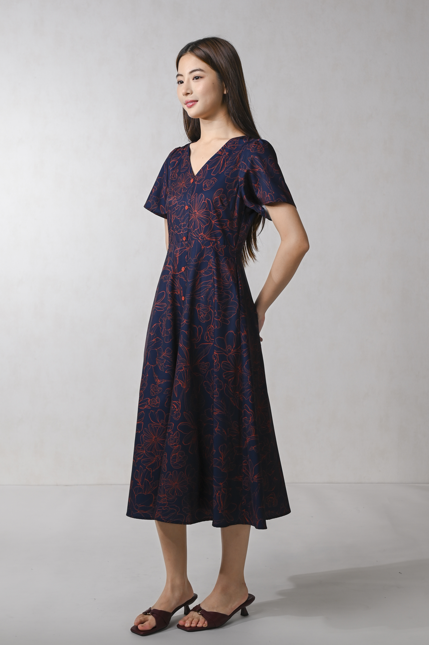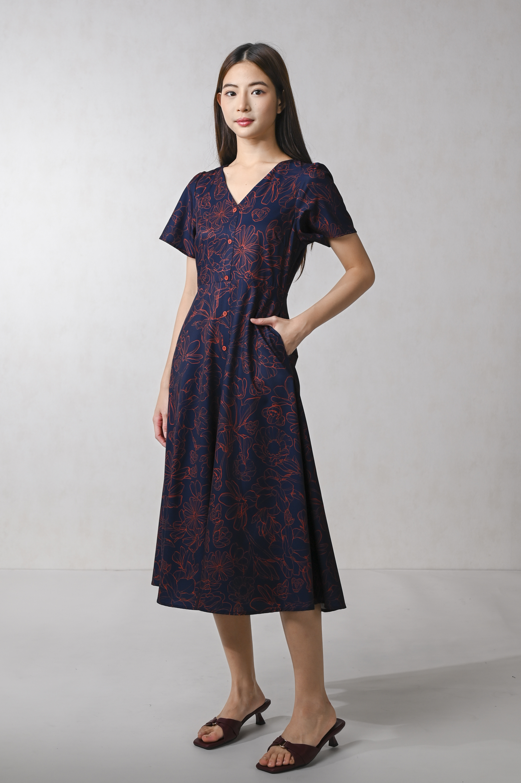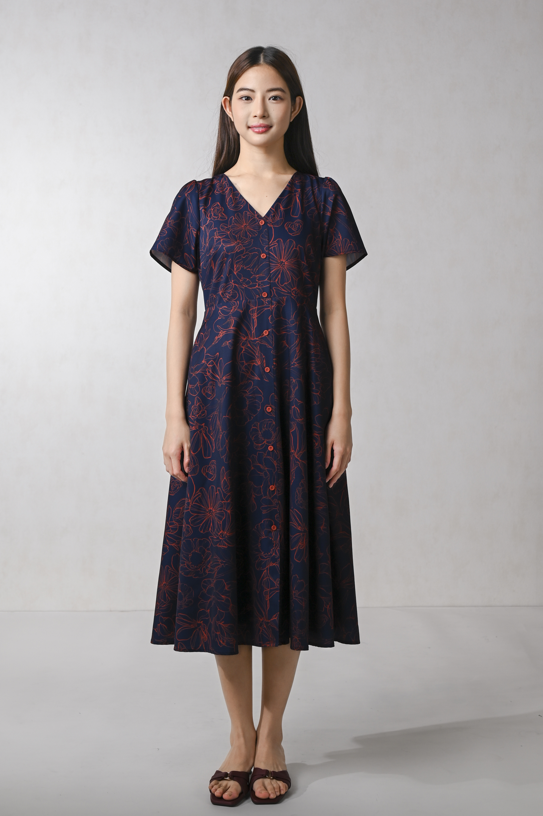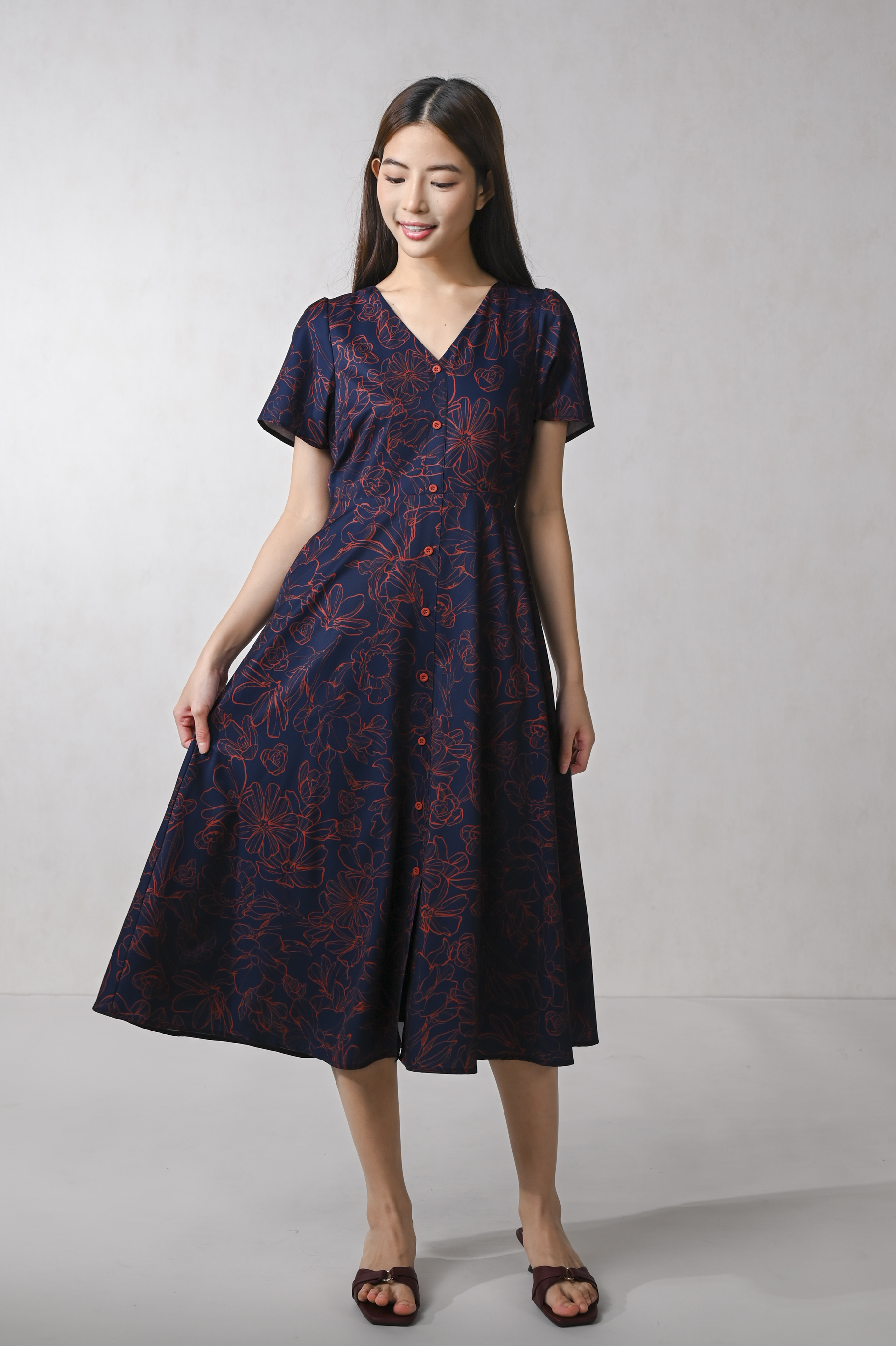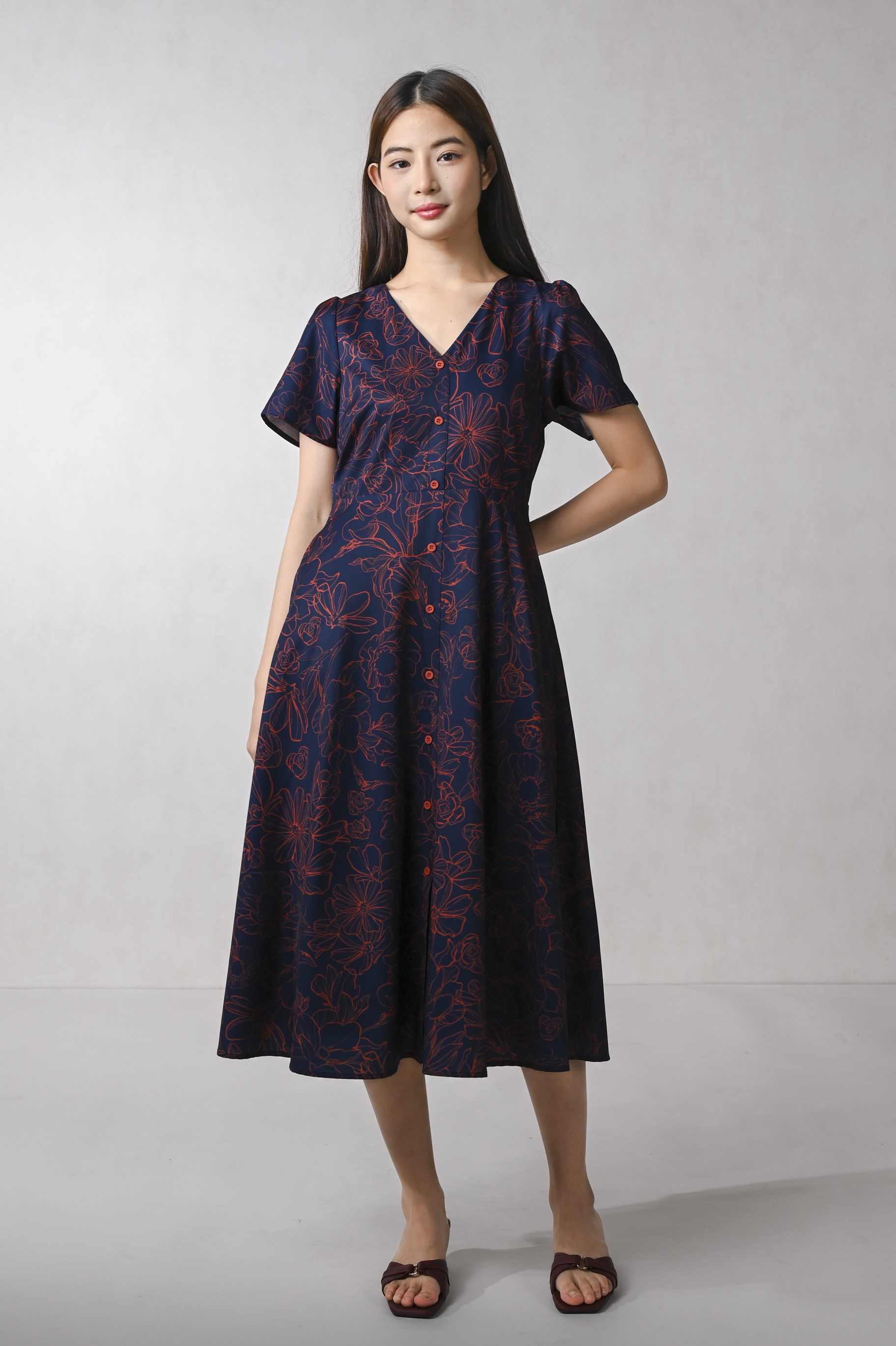 EMBER GLOW SLEEVED BUTTON MIDI DRESS