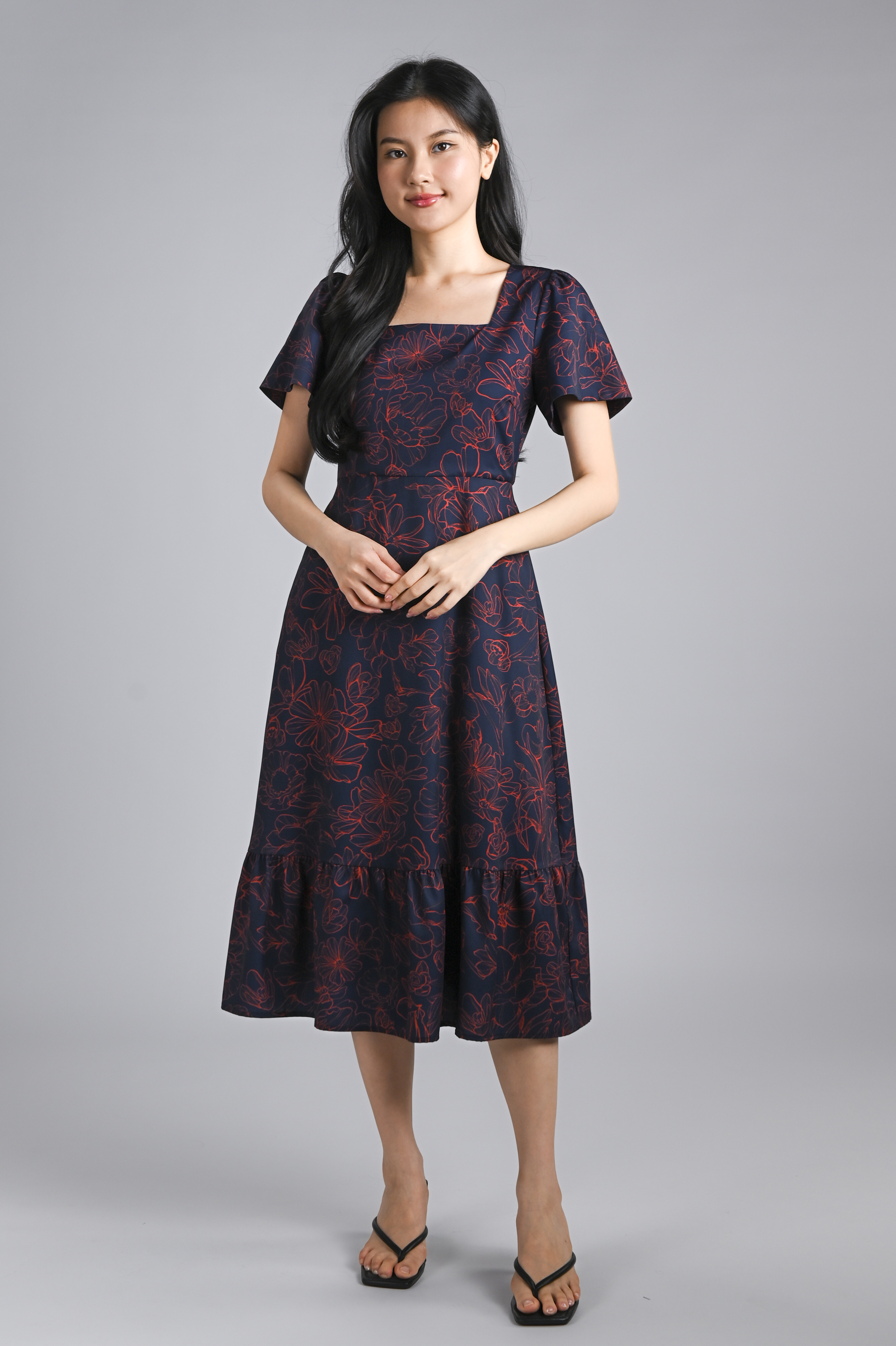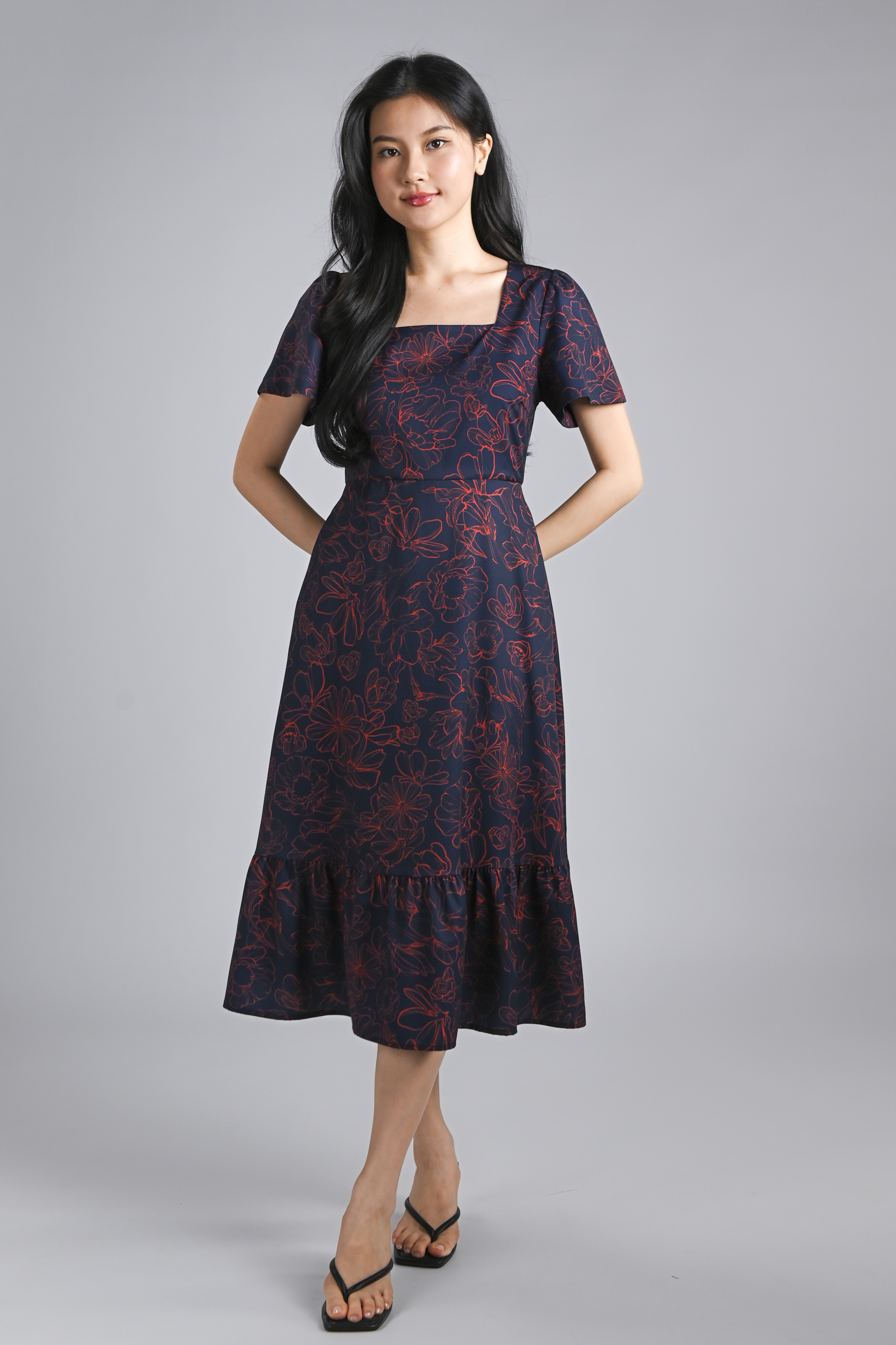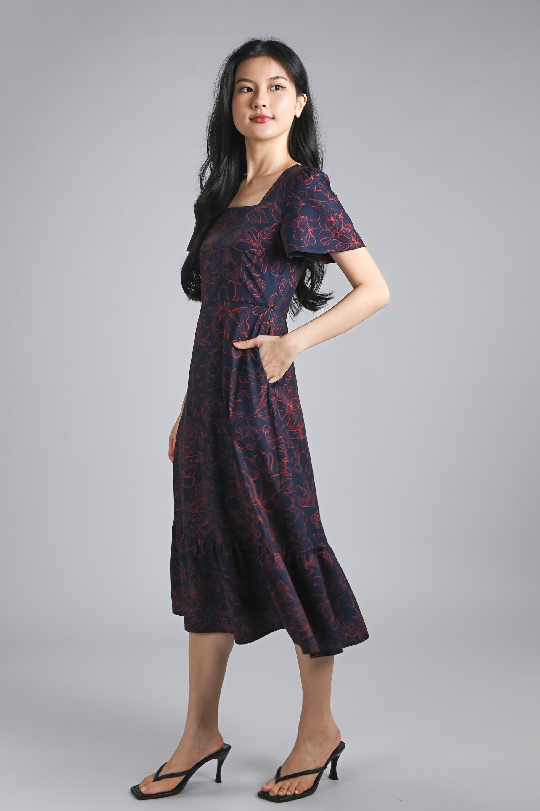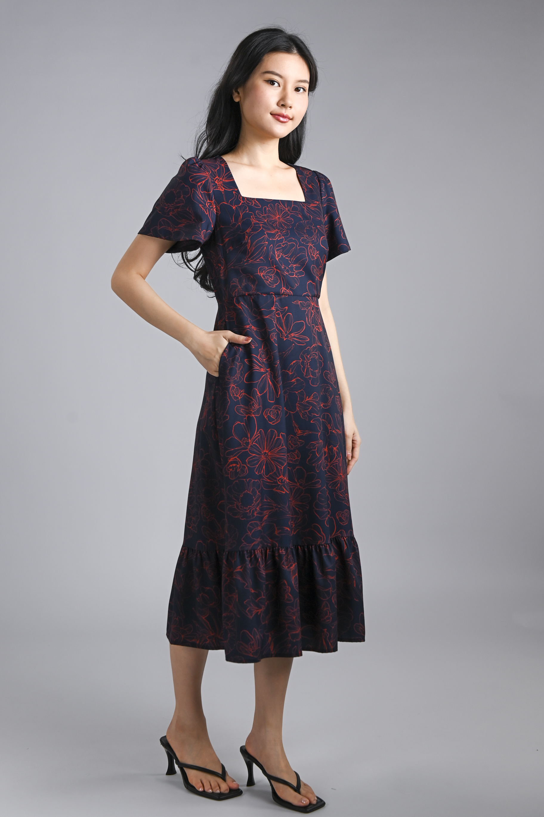 EMBER GLOW SQUARE-NECK SLEEVED MIDI DRESS