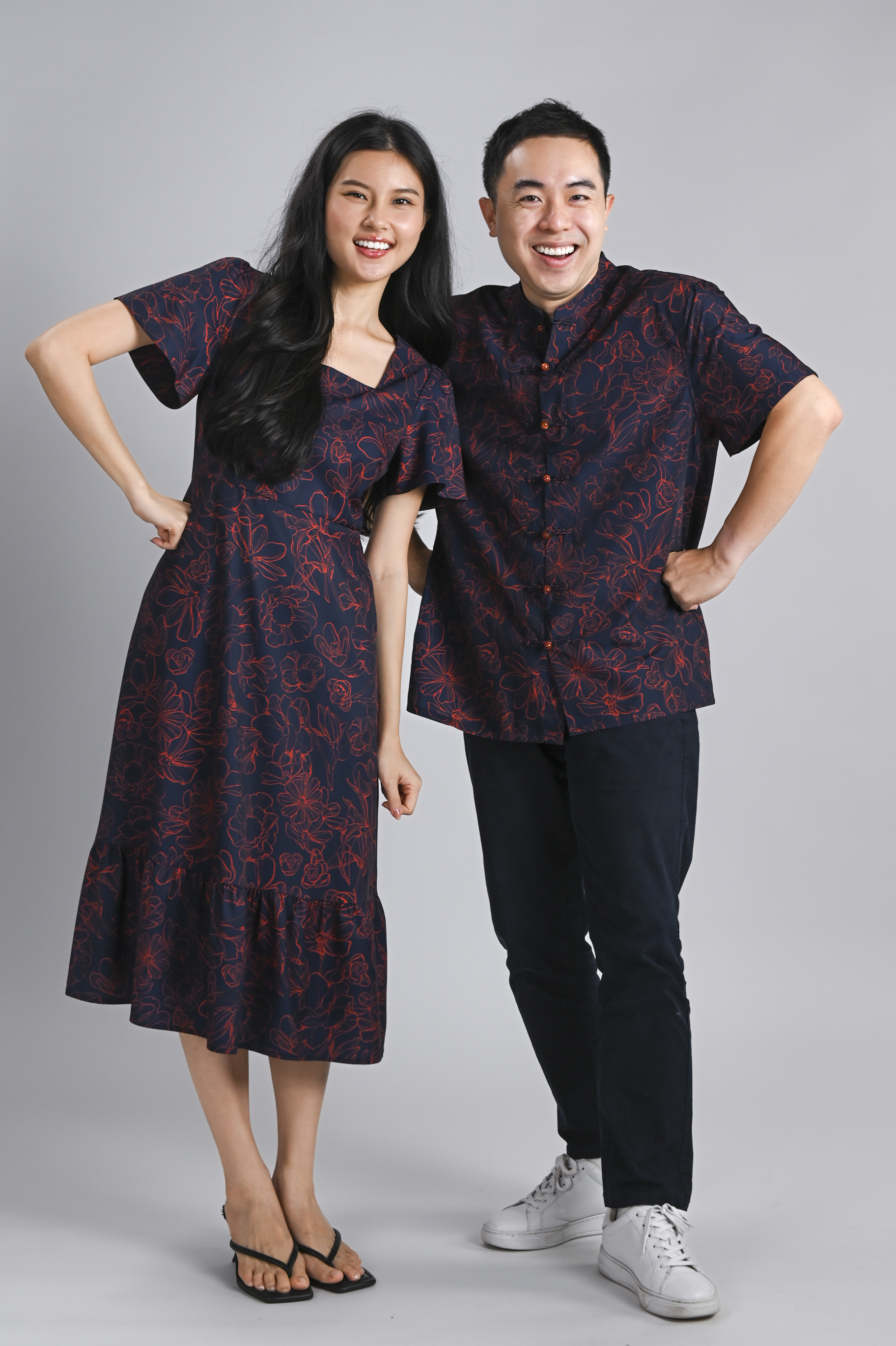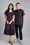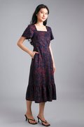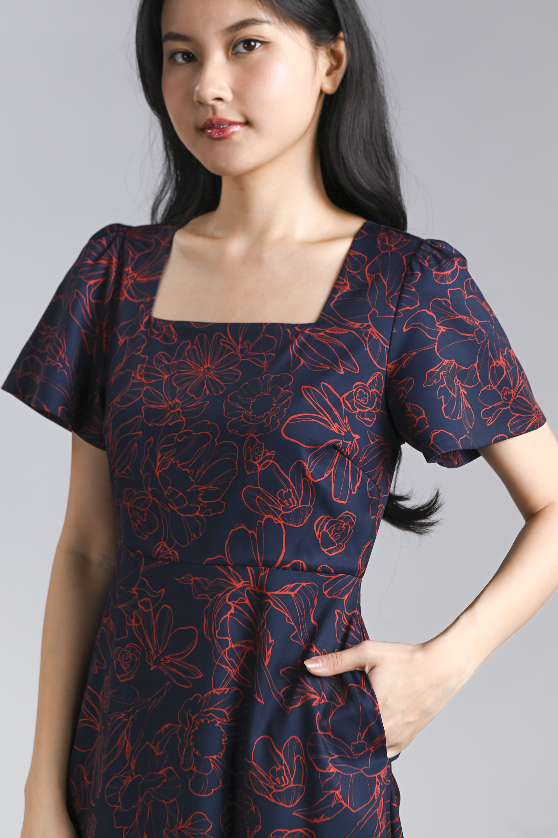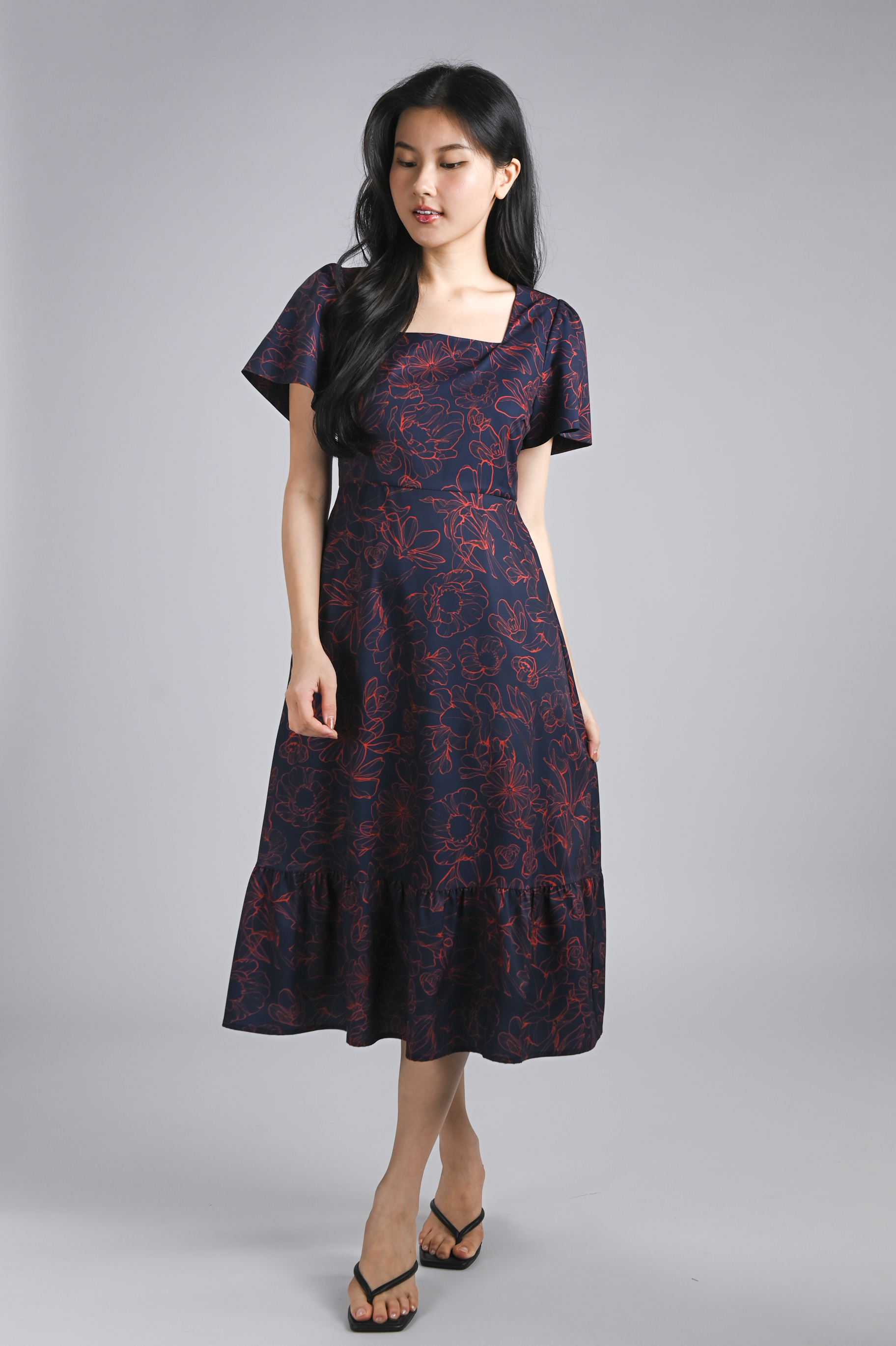 EMBER GLOW SQUARE-NECK SLEEVED MIDI DRESS