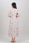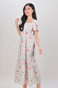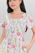 ENYA FLORAL SQUARE-NECK SLEEVED DRESS IN WHITE