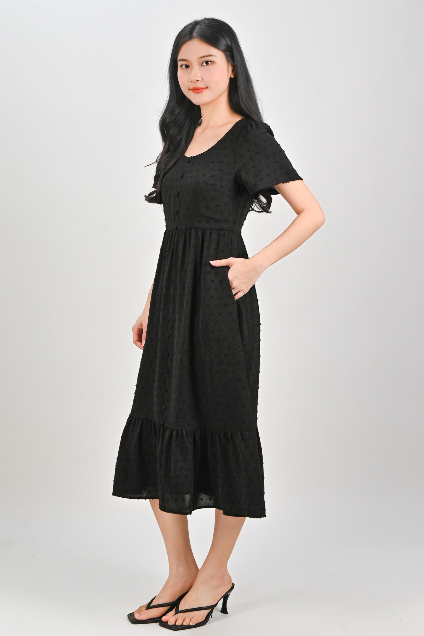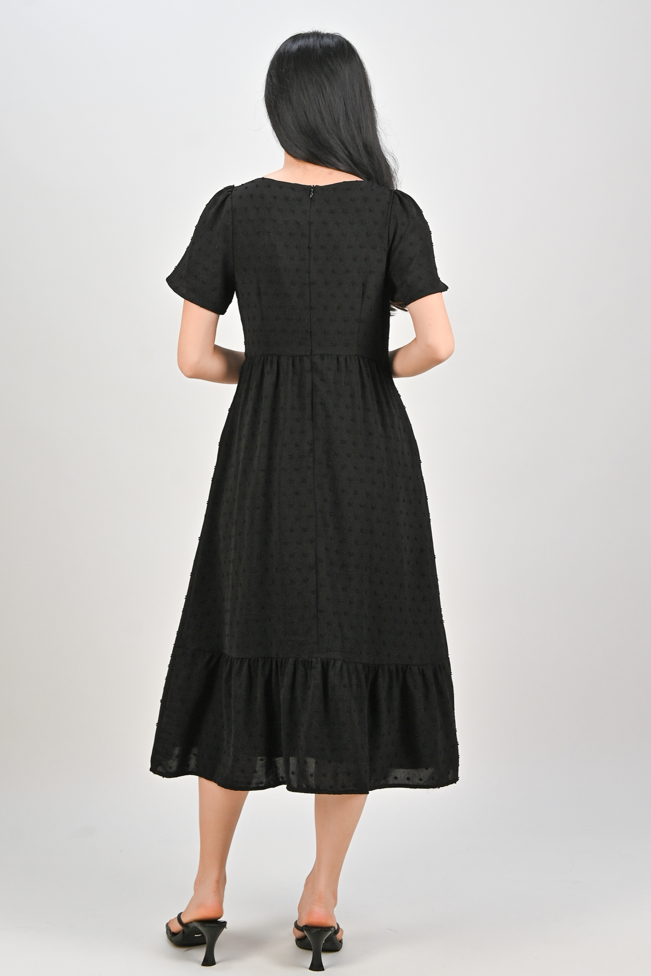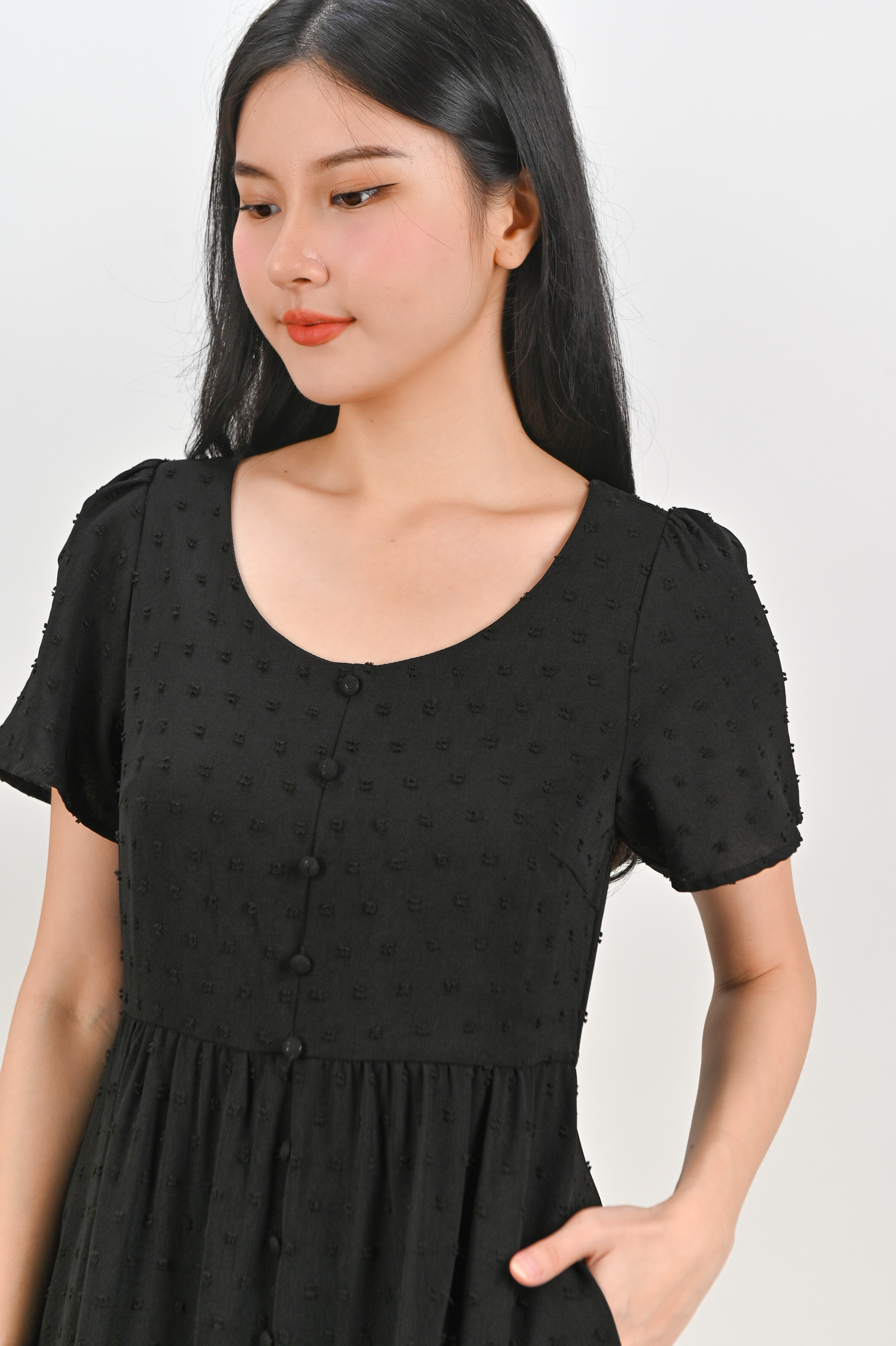 EVIENNE DOTTY SCOOP-NECK SLEEVED DRESS IN BLACK