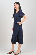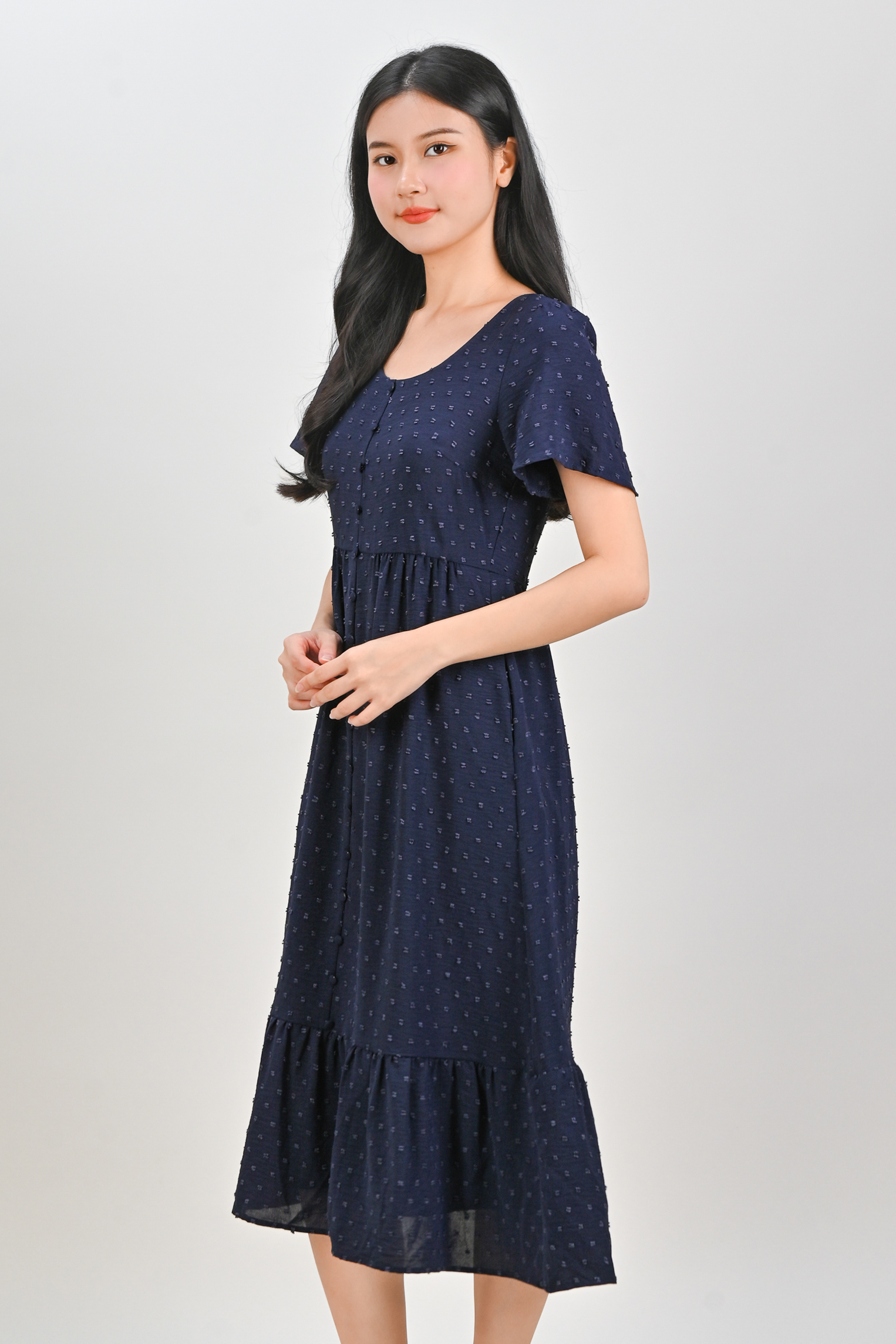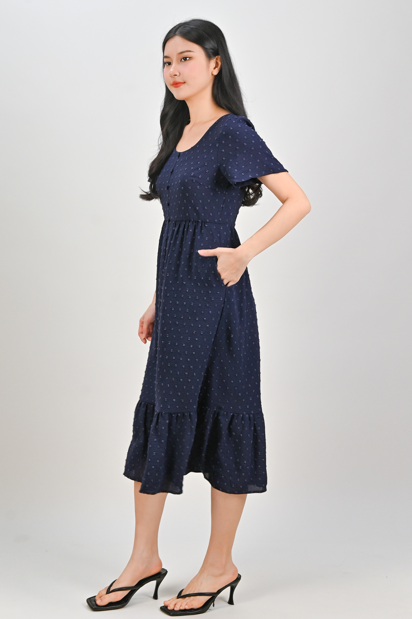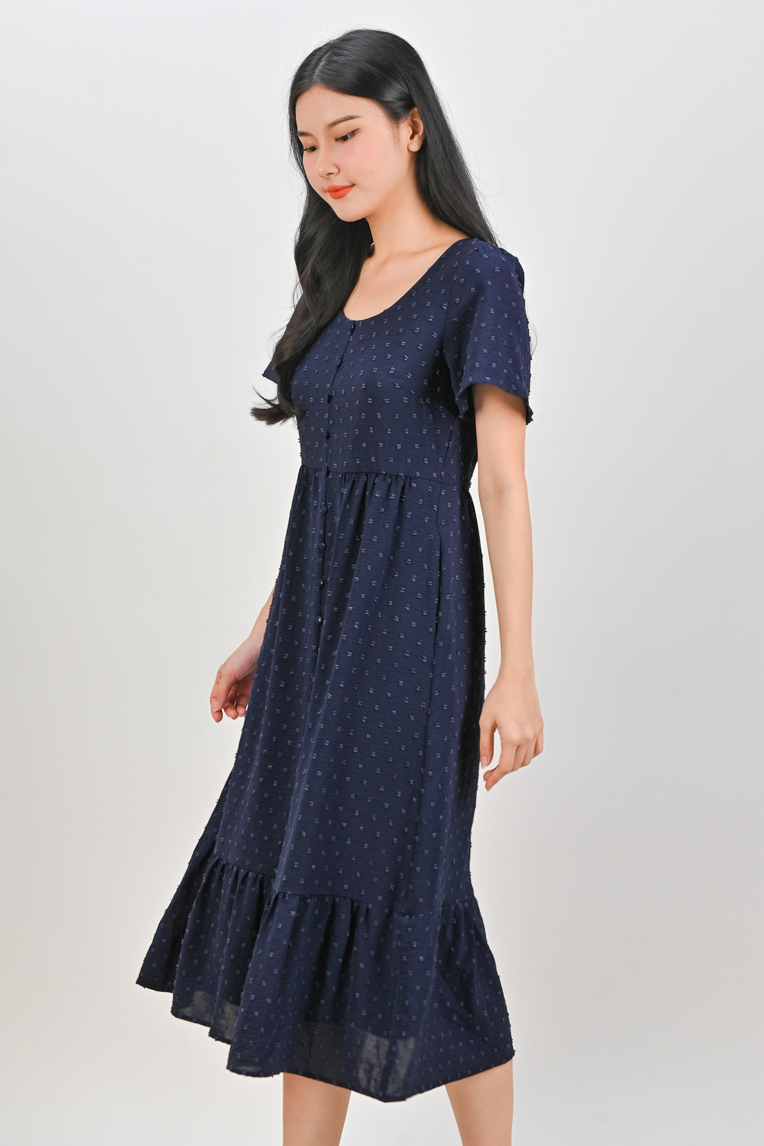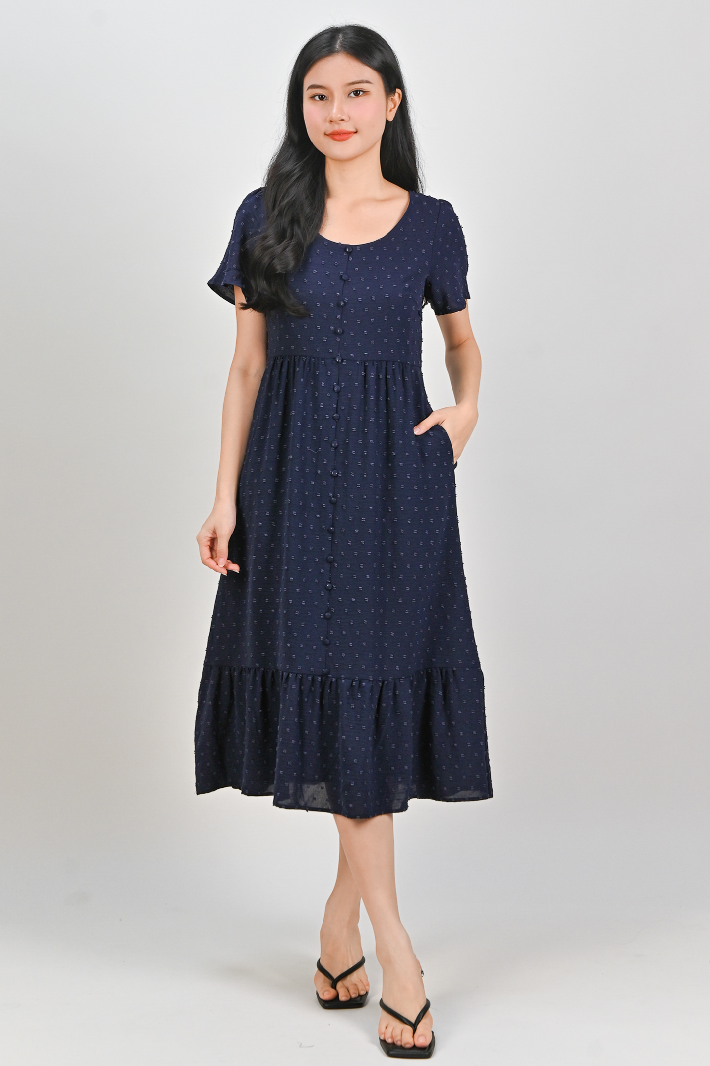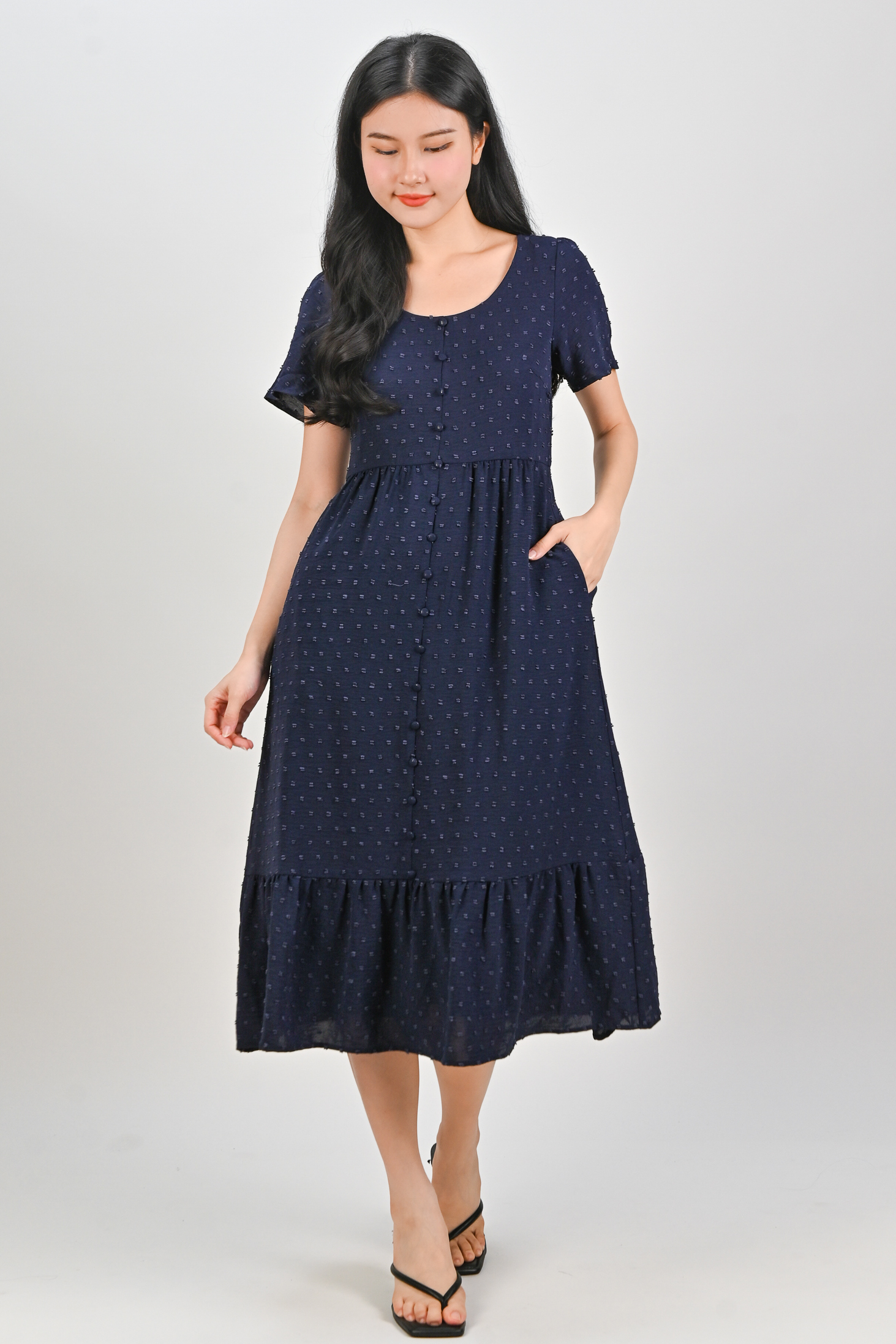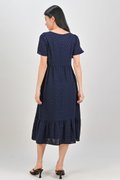 EVIENNE DOTTY SCOOP-NECK SLEEVED DRESS IN NAVY