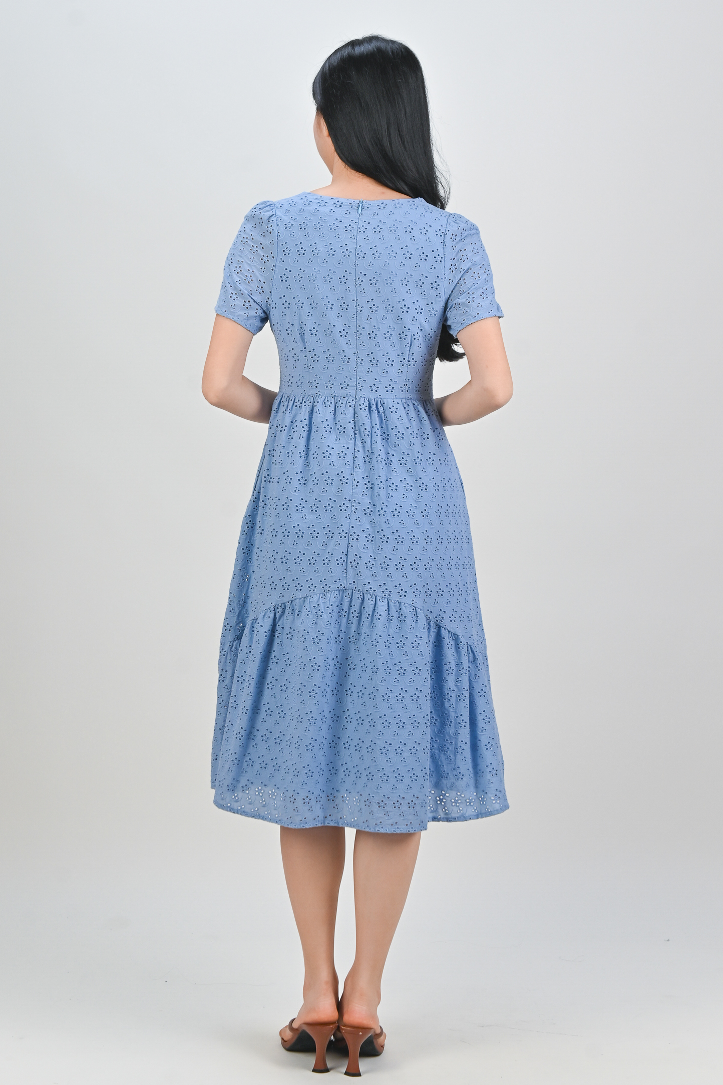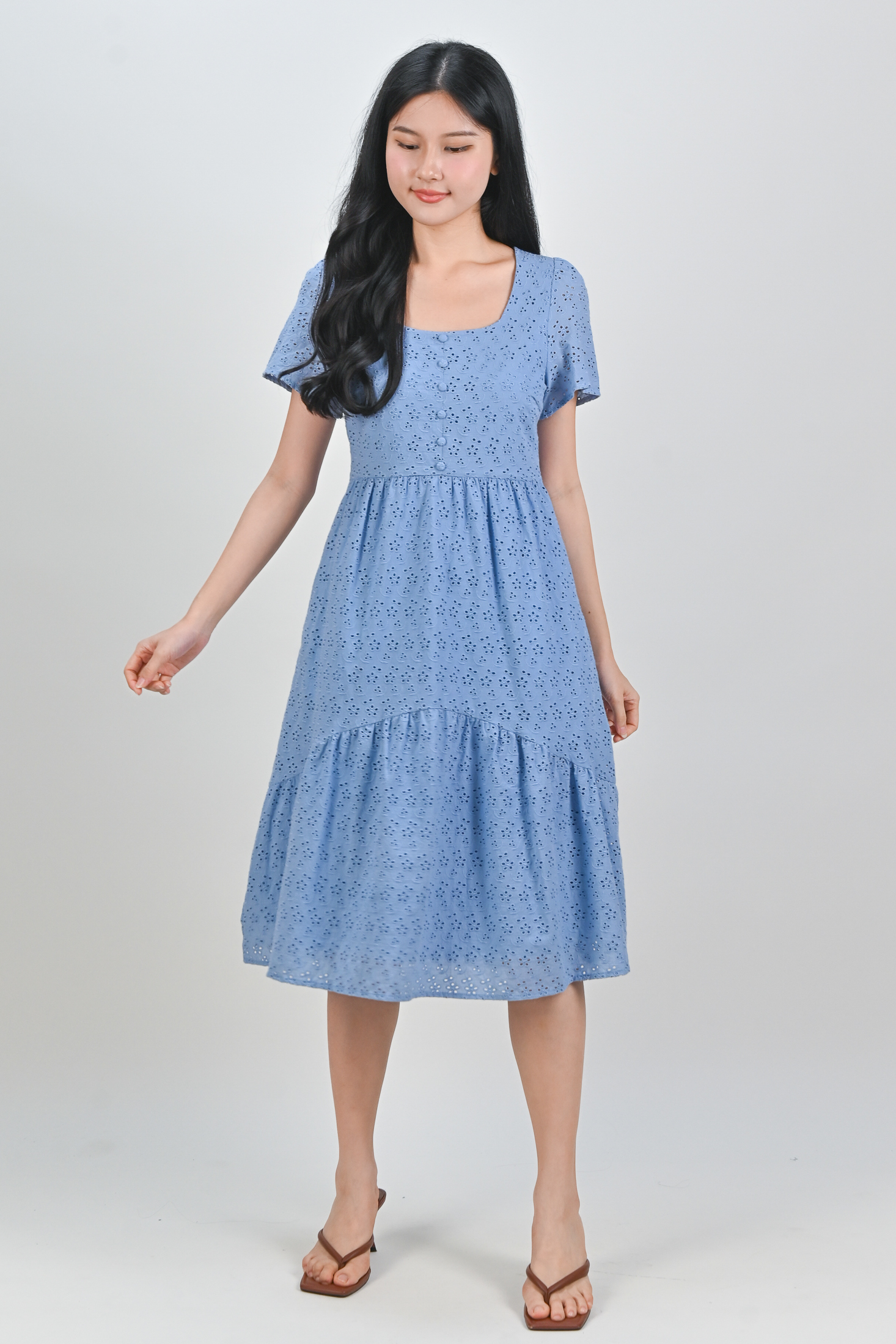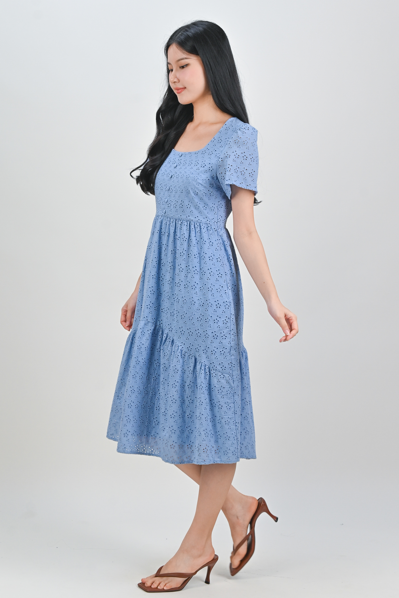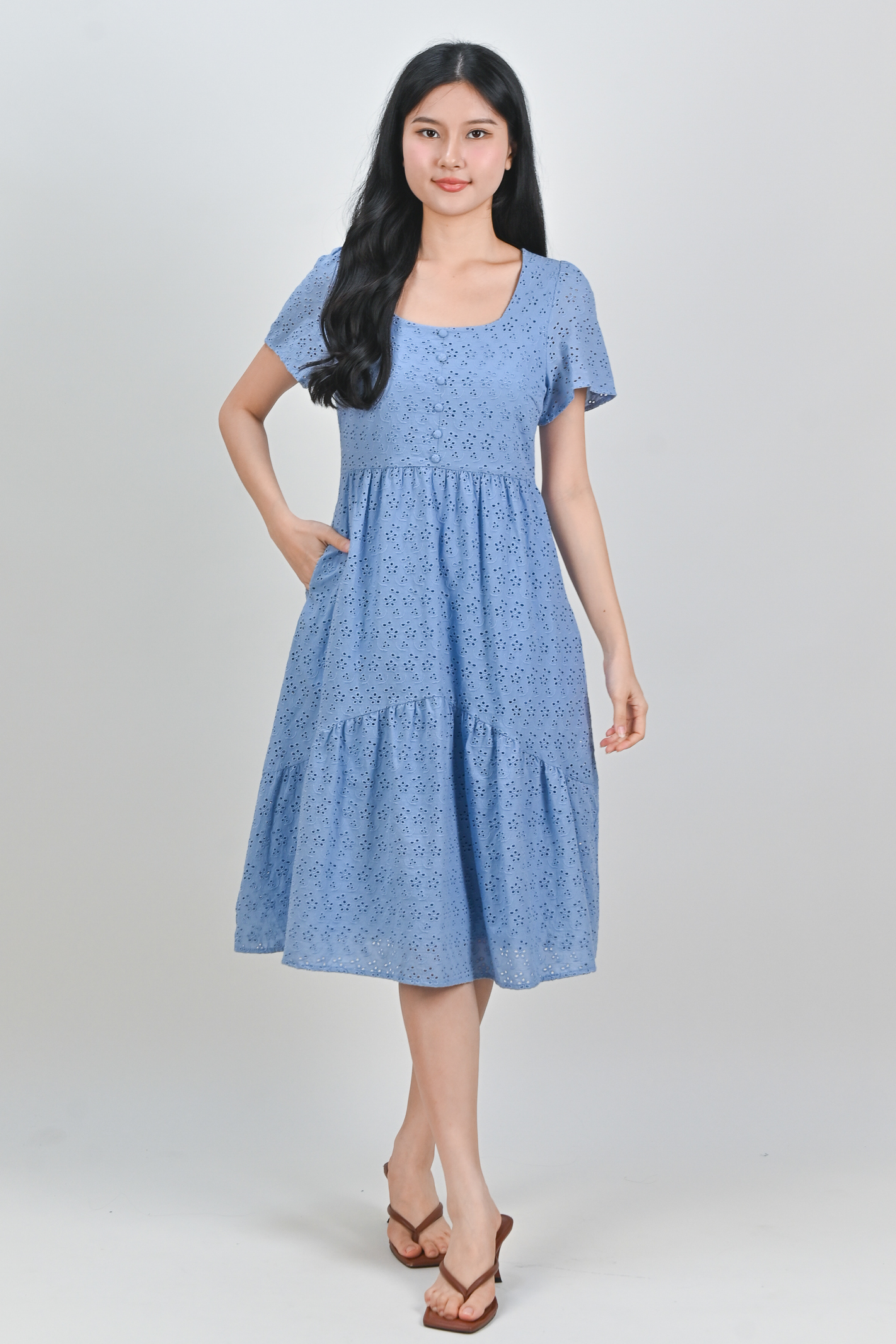 EZURYN EYELET SCOOP-NECK SLEEVED DRESS IN BLUE