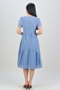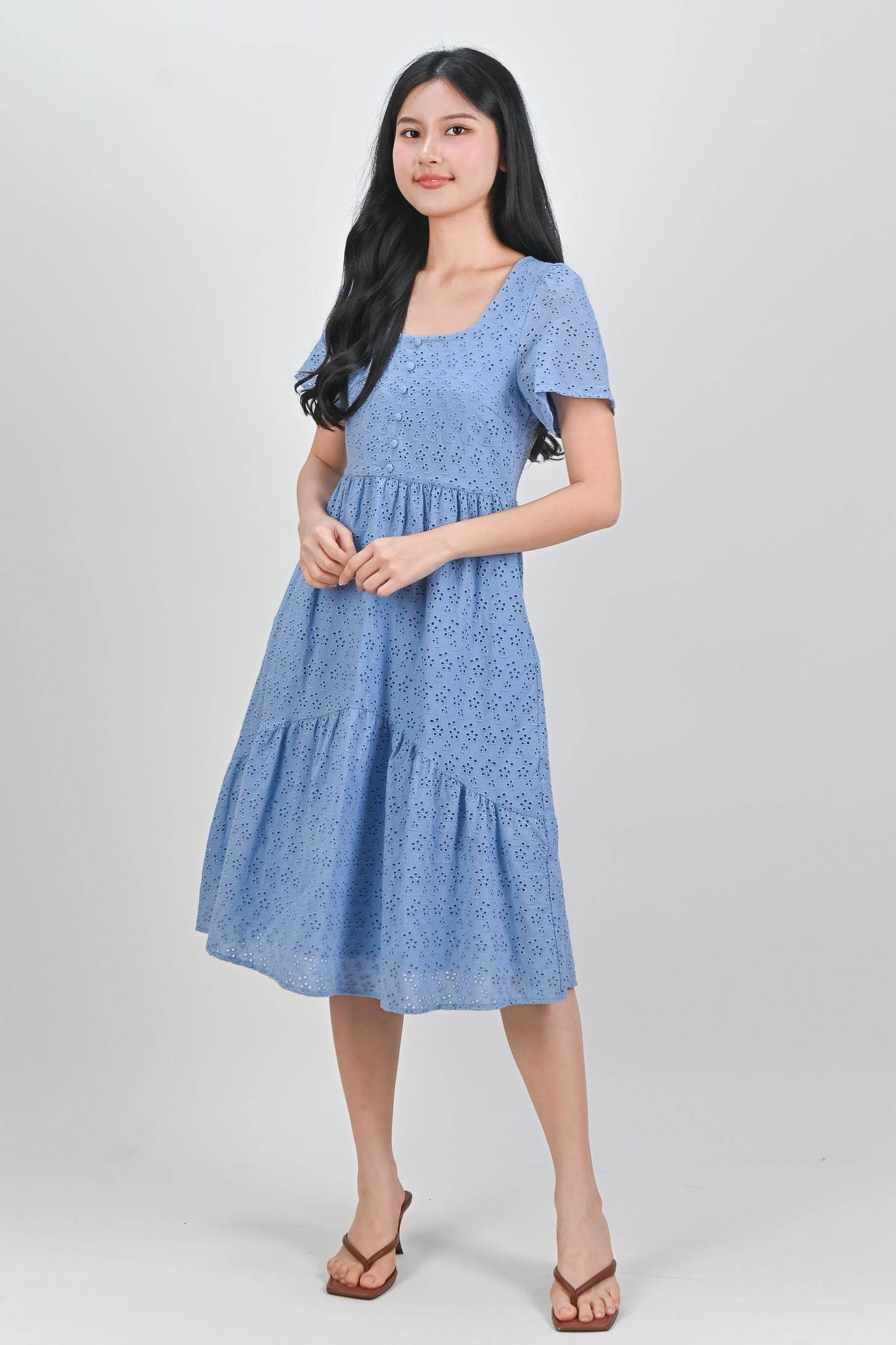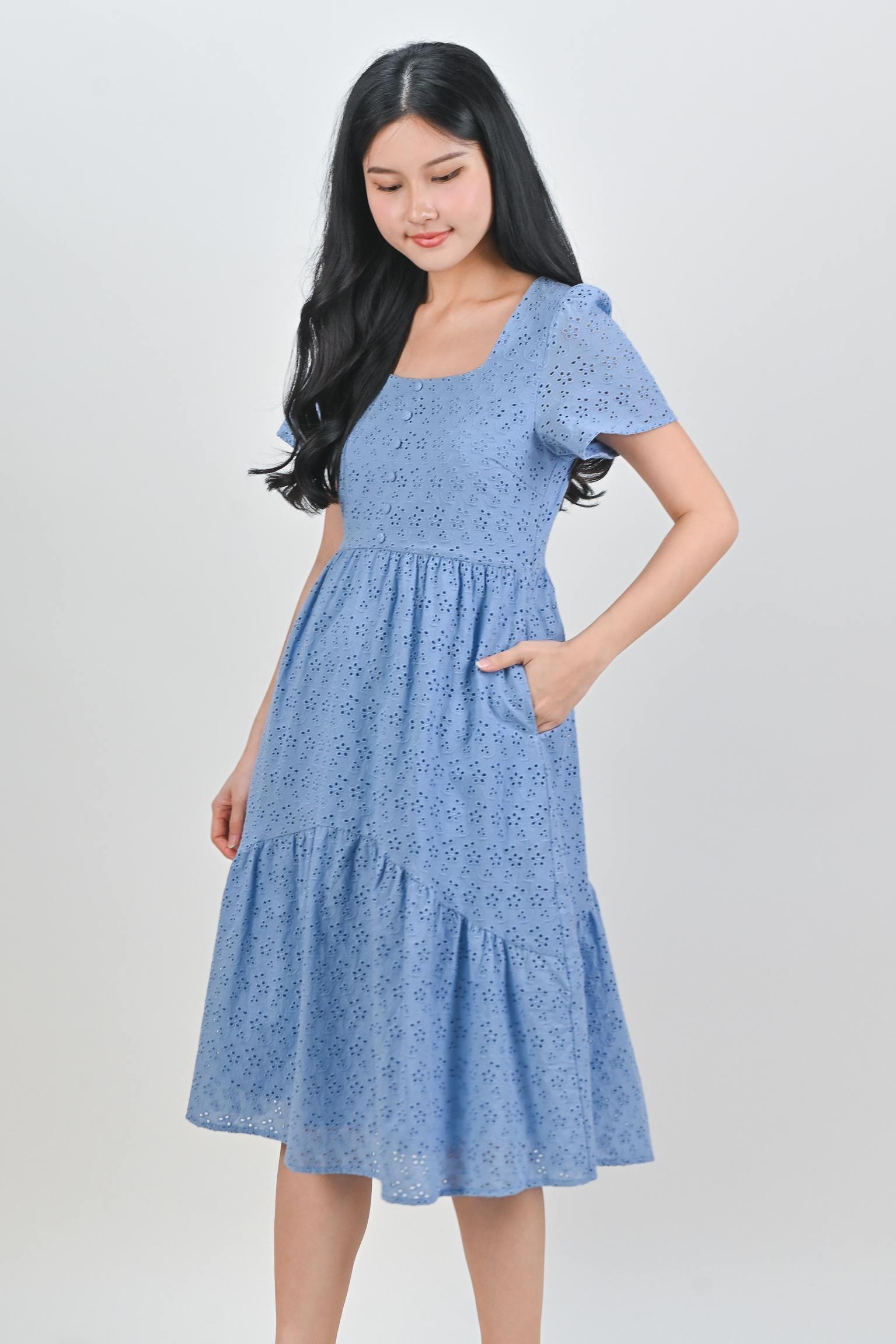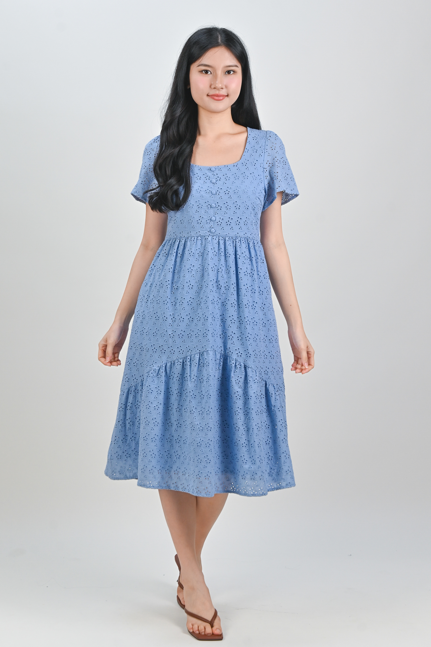 EZURYN EYELET SCOOP-NECK SLEEVED DRESS IN BLUE