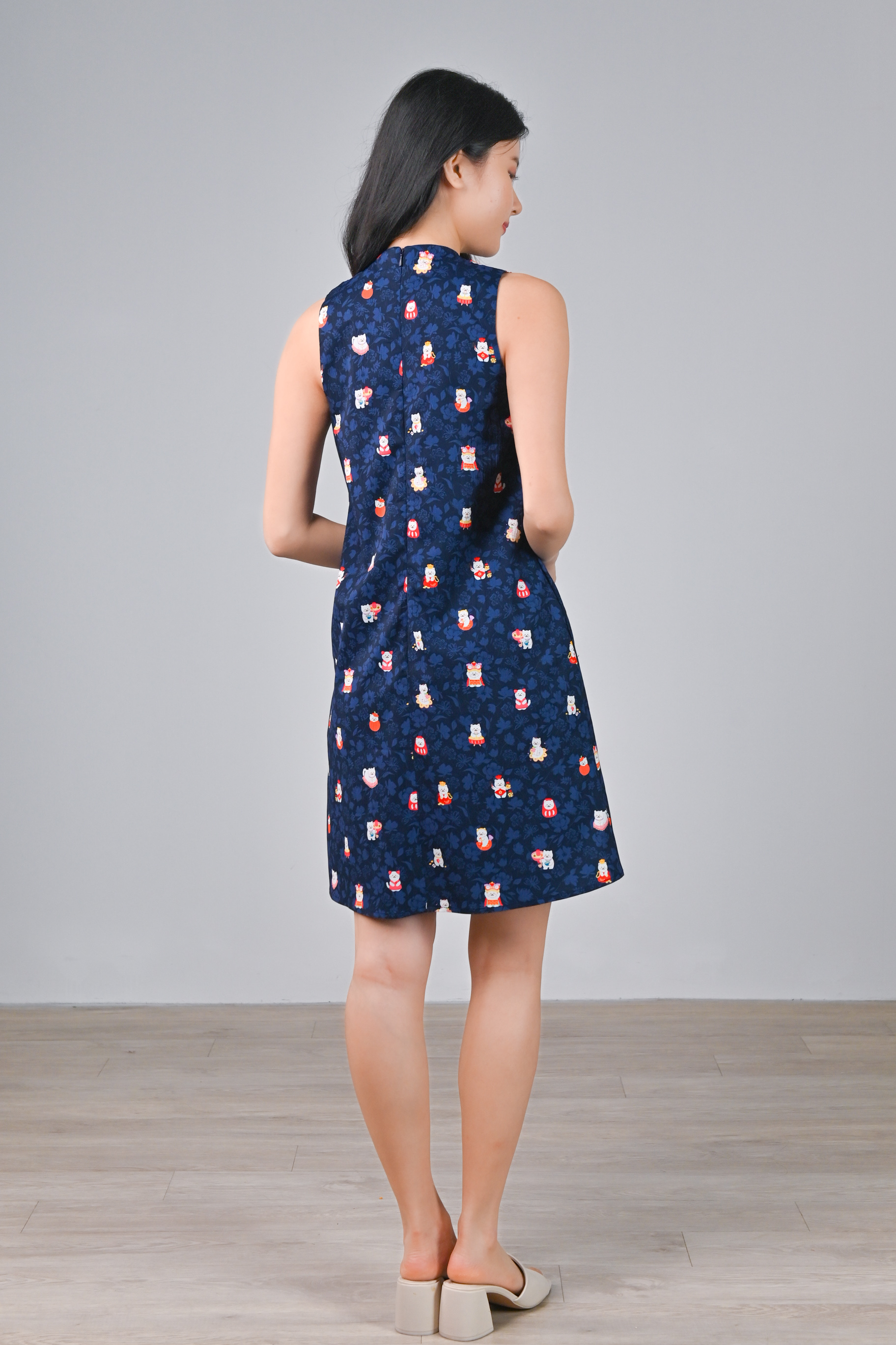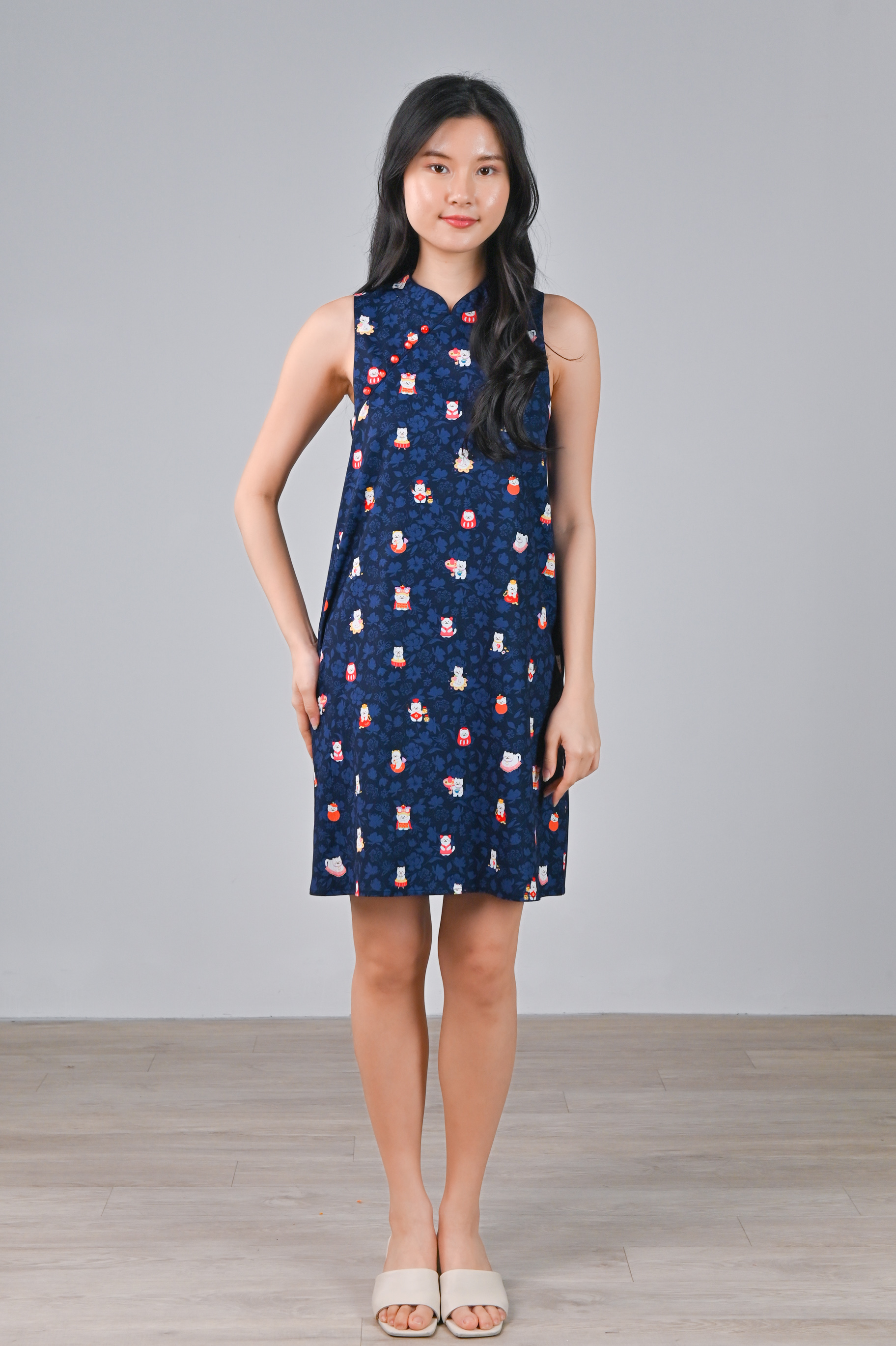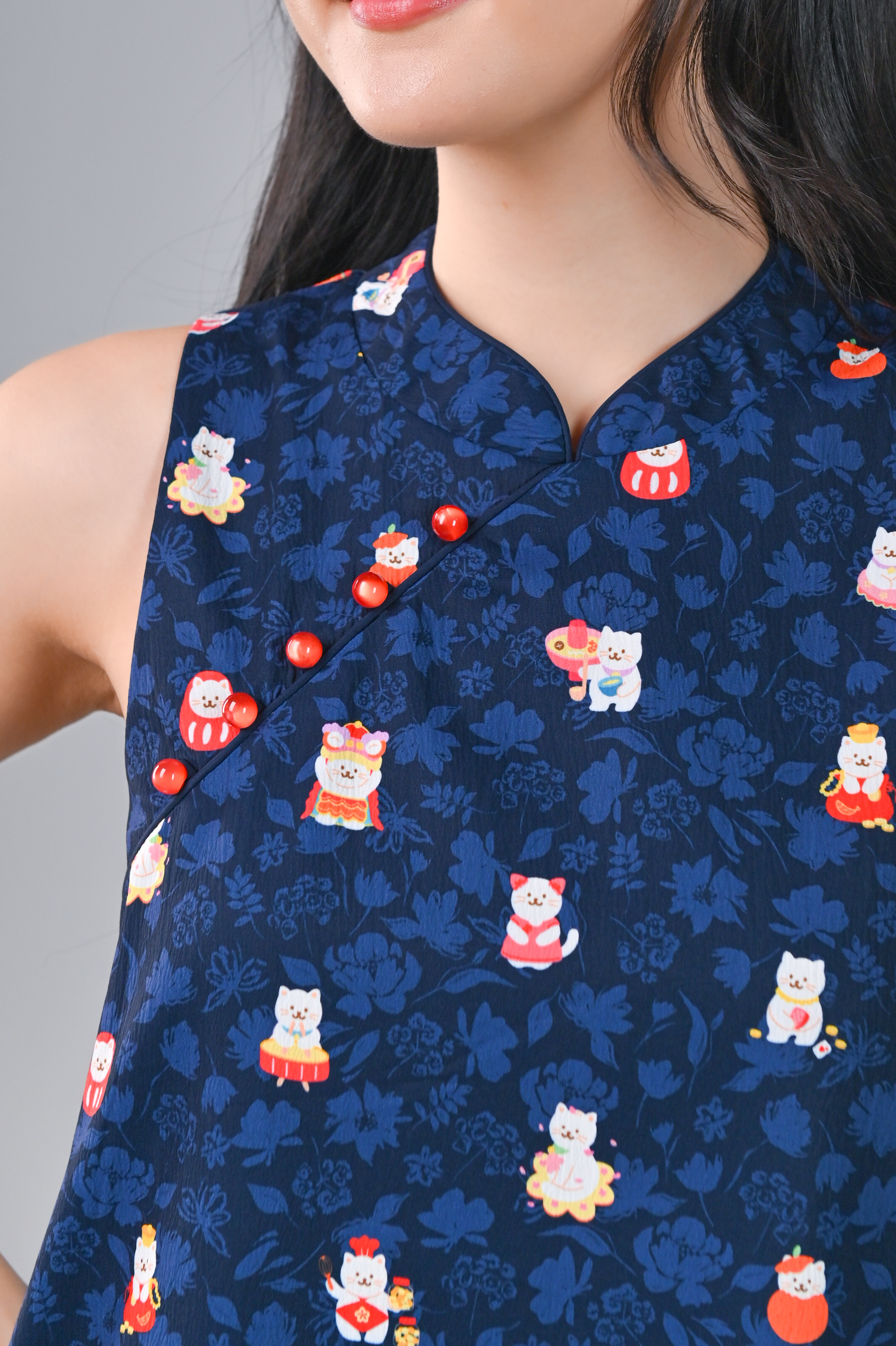 FORTUNE FLORAL CAT NAVY SLEEVELESS CHEONGSAM