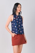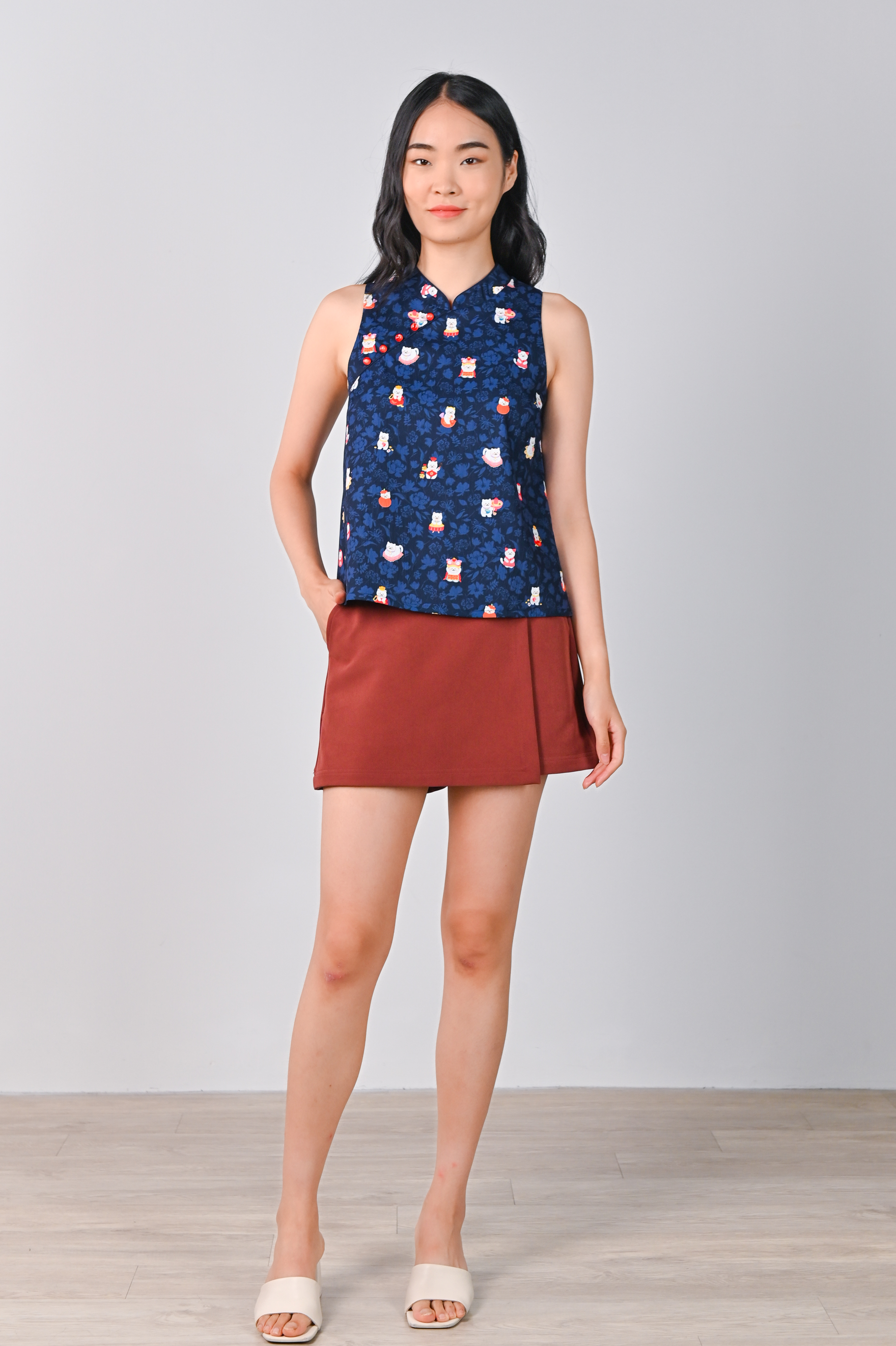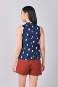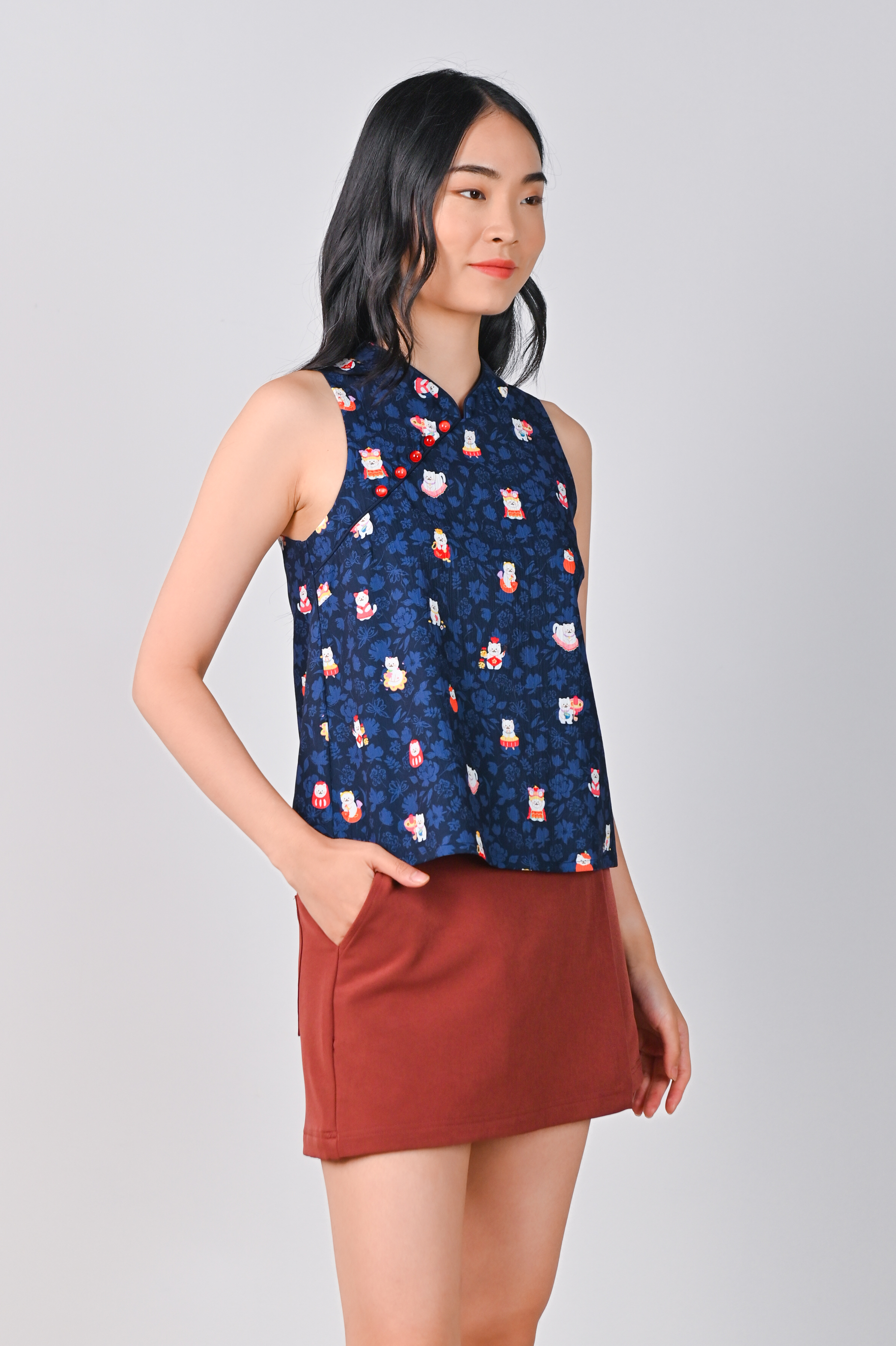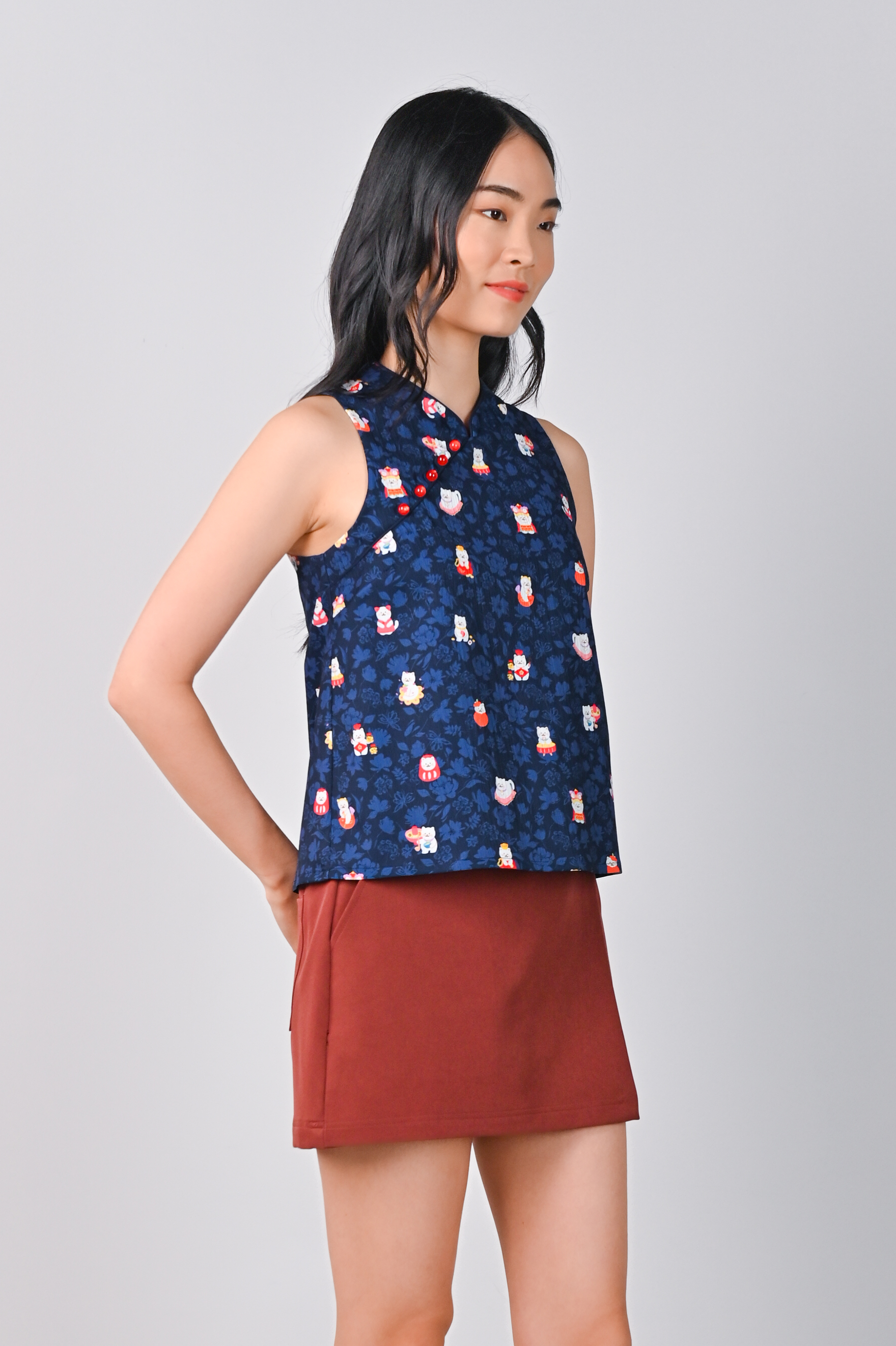 FORTUNE FLORAL CAT NAVY SLEEVELESS CHEONGSAM TOP