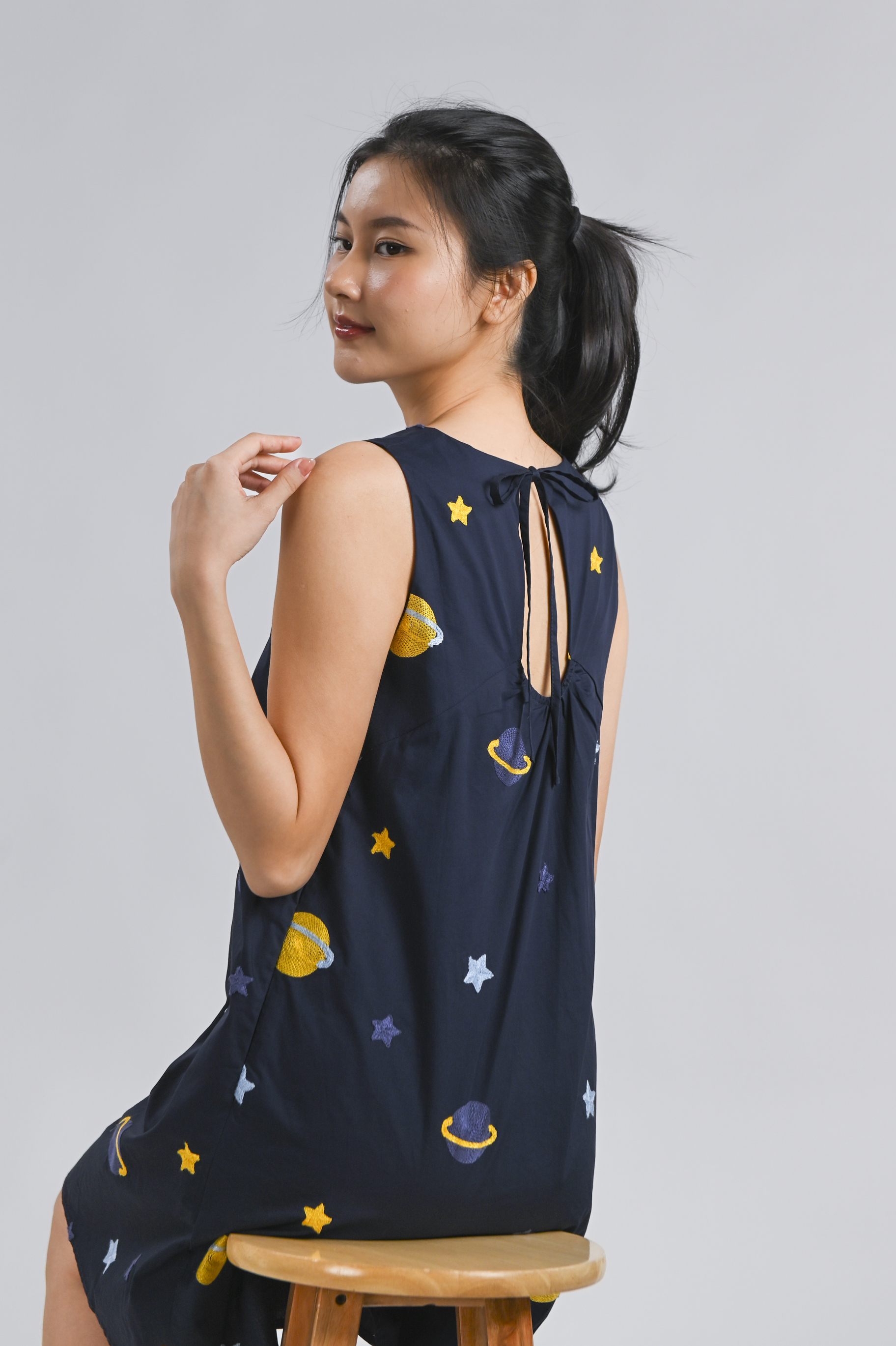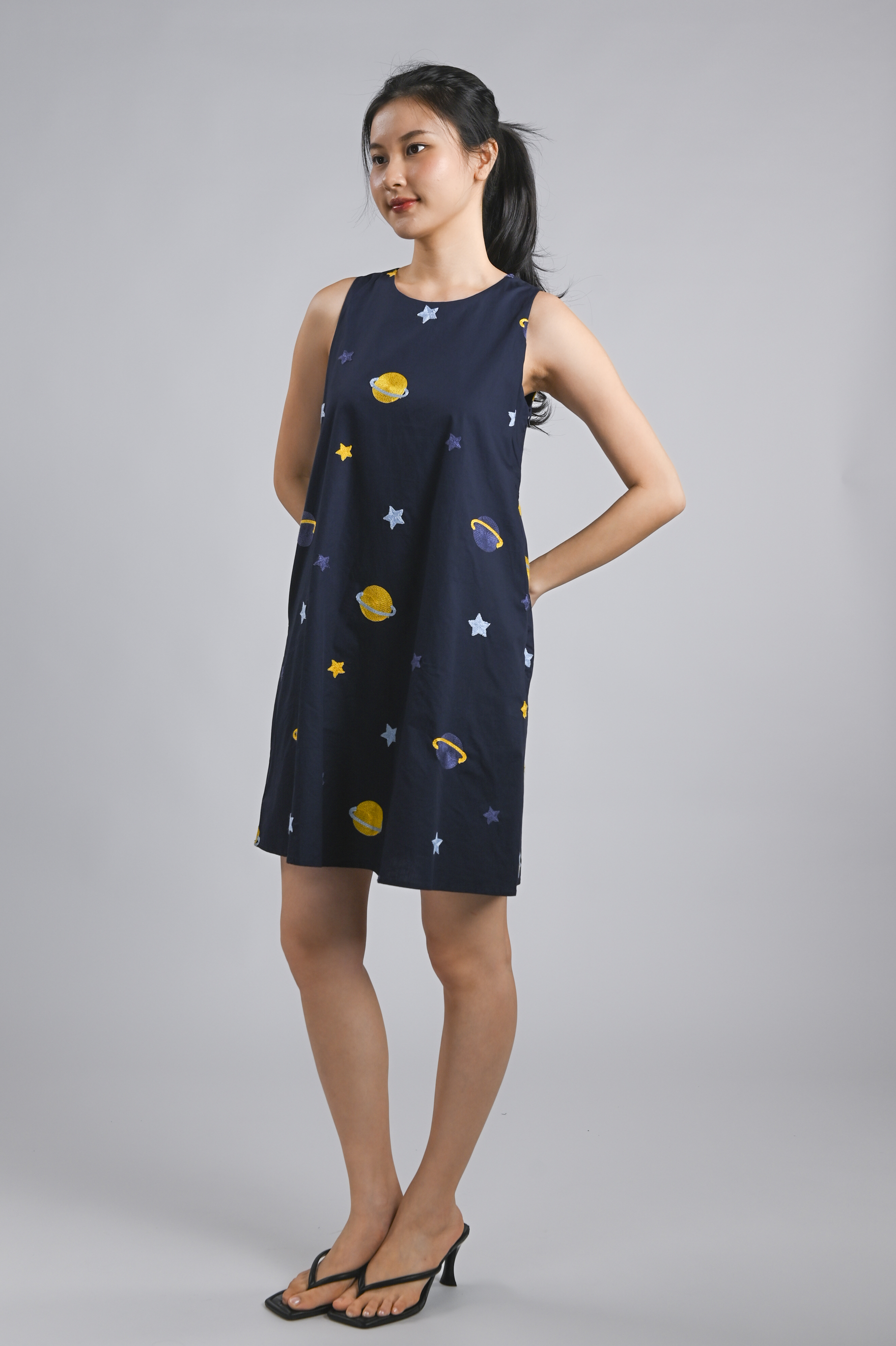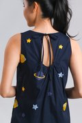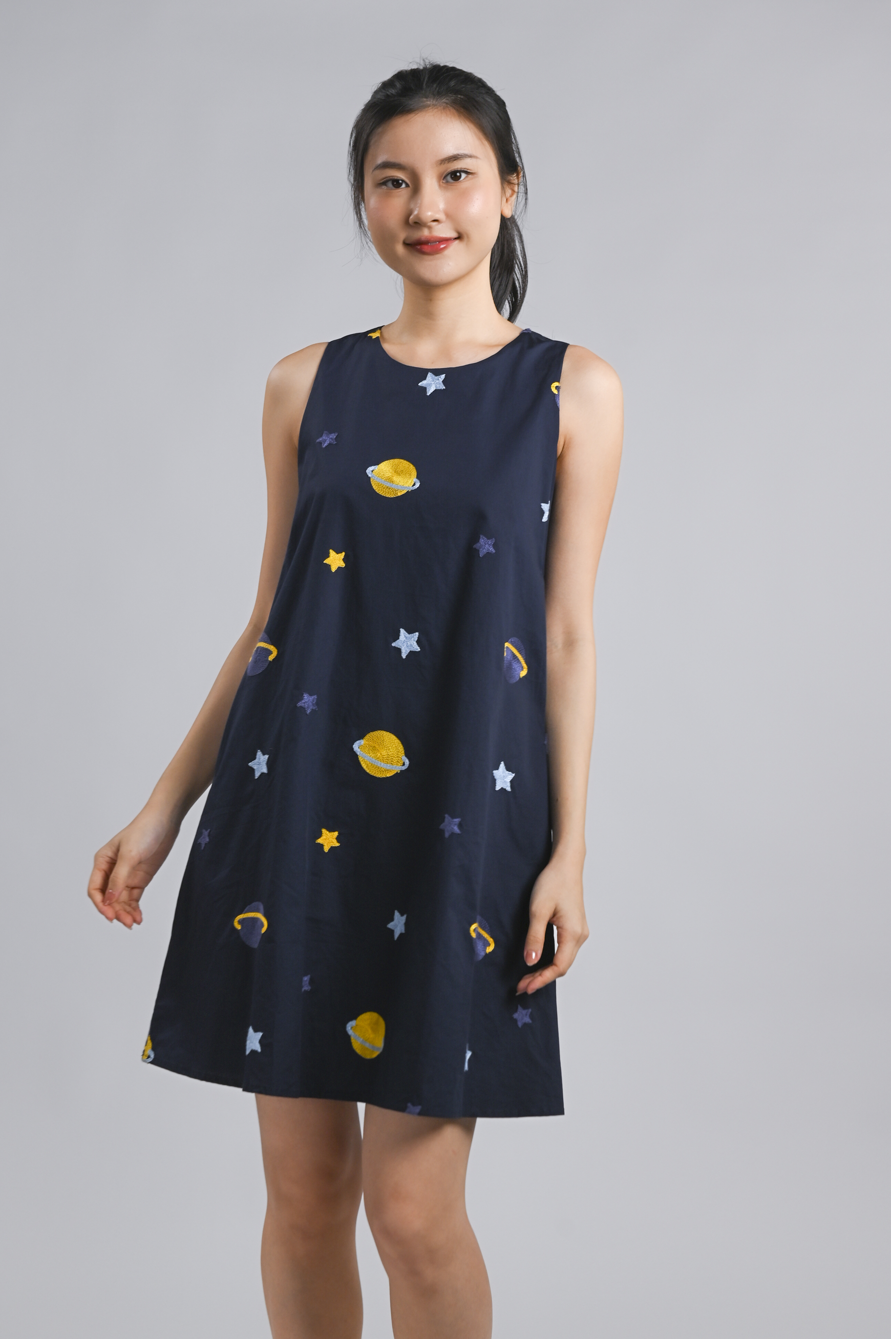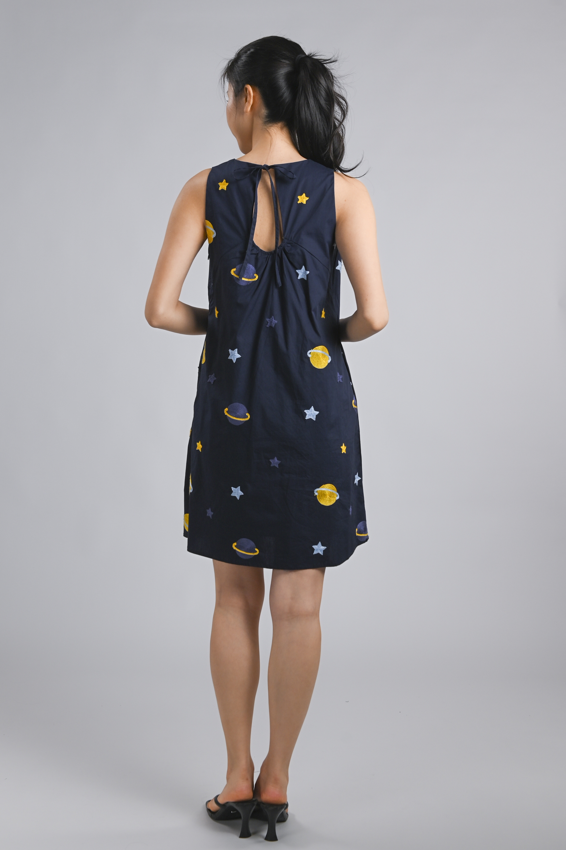 GALAXY EMB. CUT-OUT BACK A-LINE DRESS IN NAVY