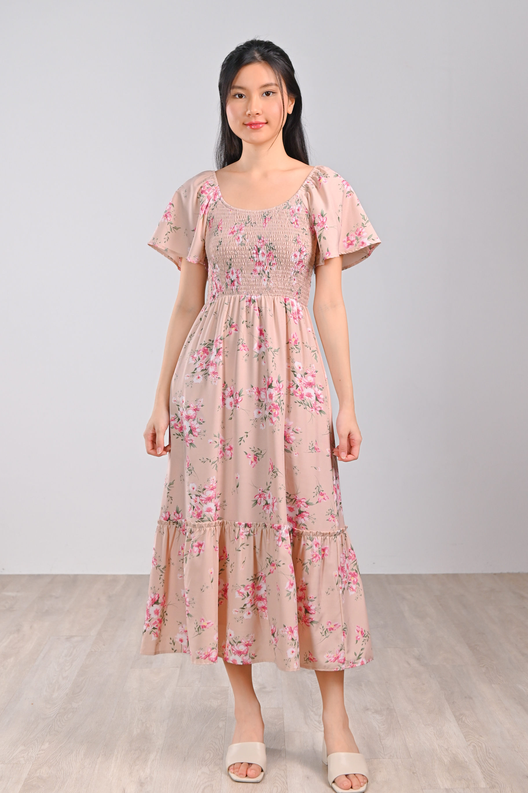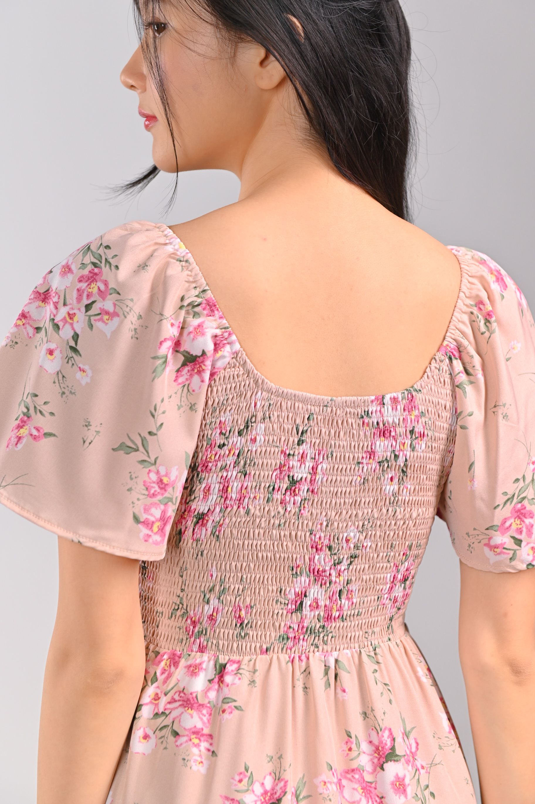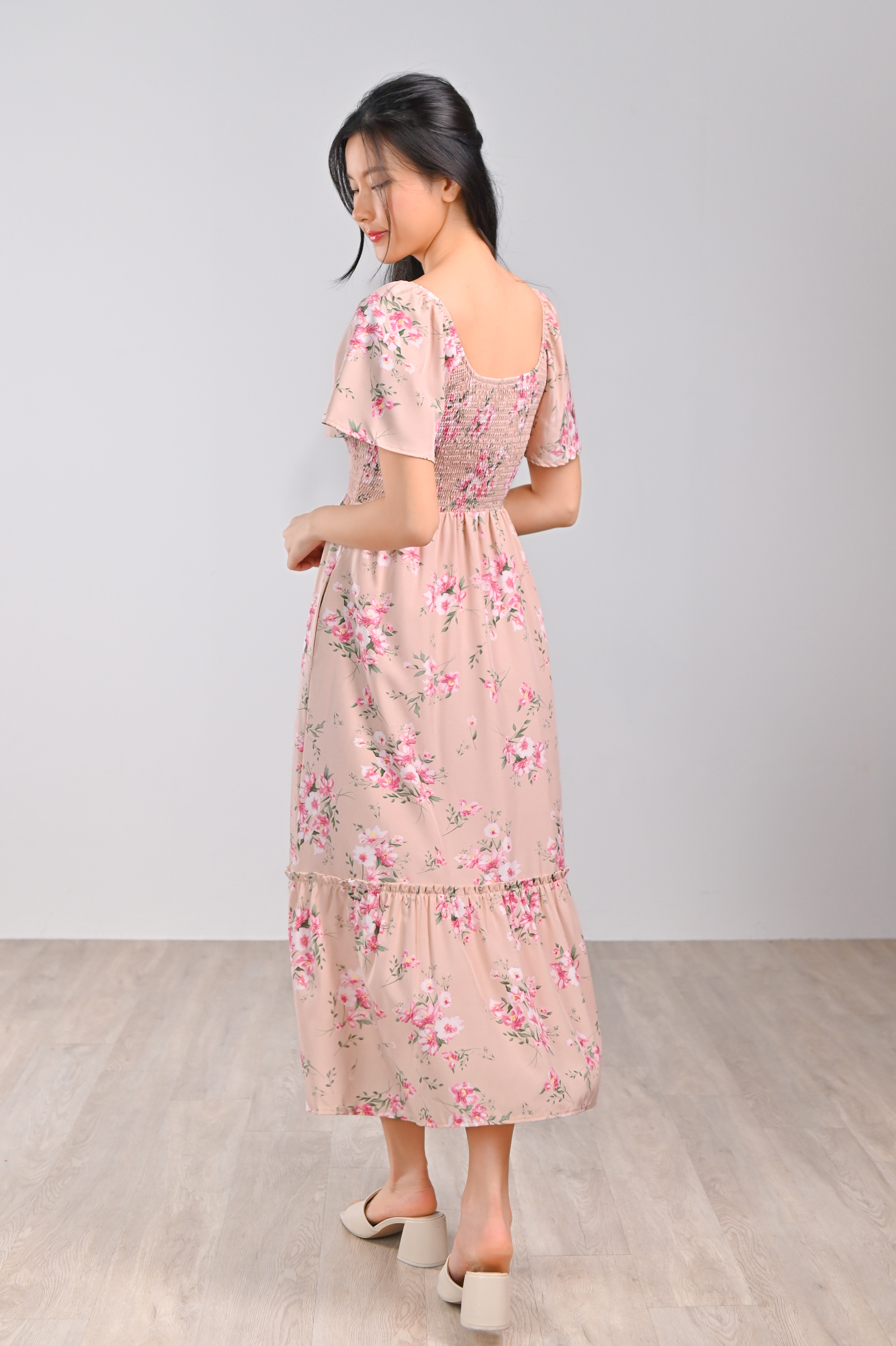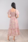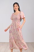 GLINDA PINK FLORAL SMOCKED MIDI DRESS